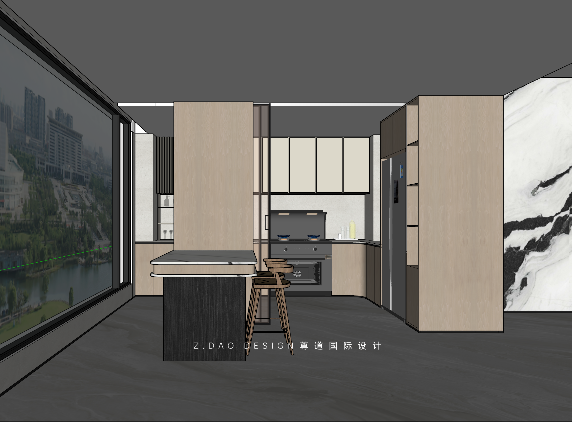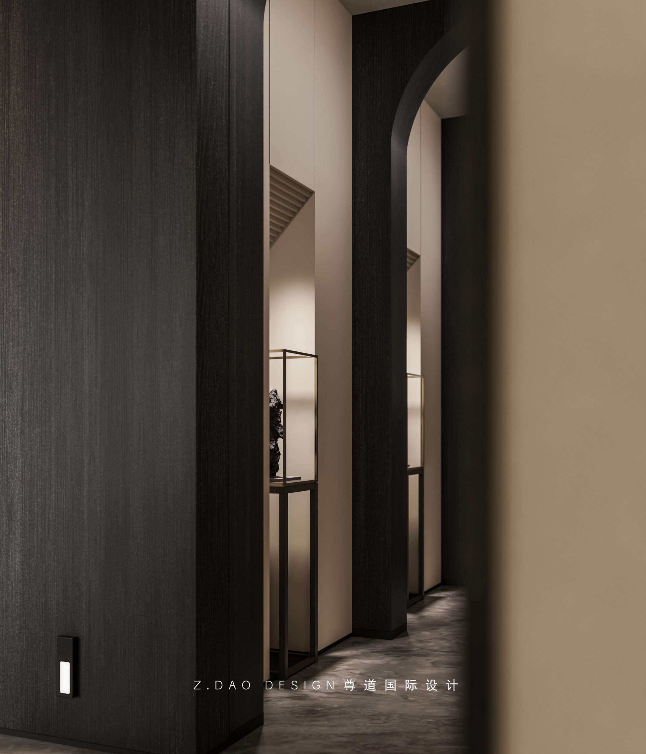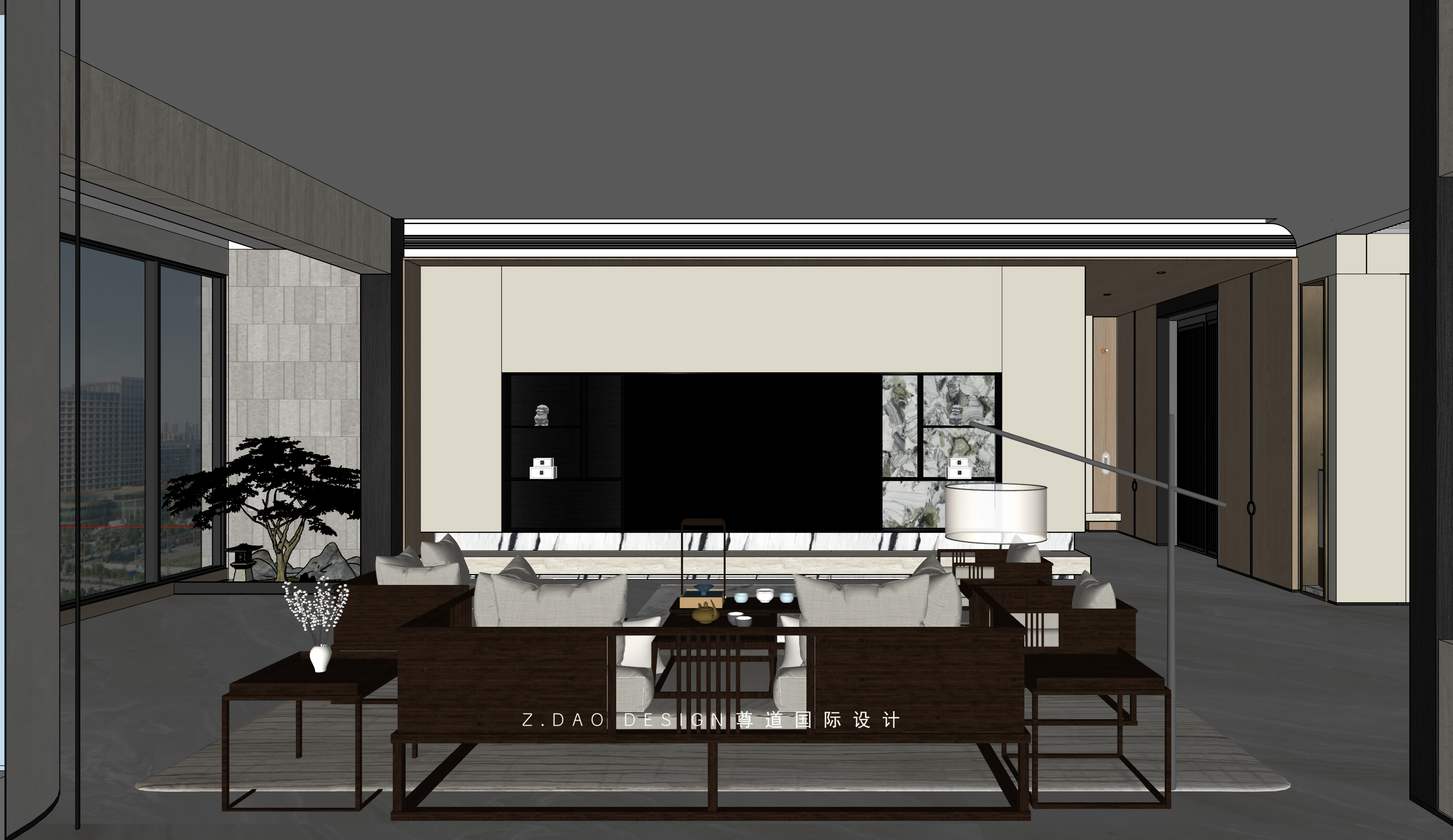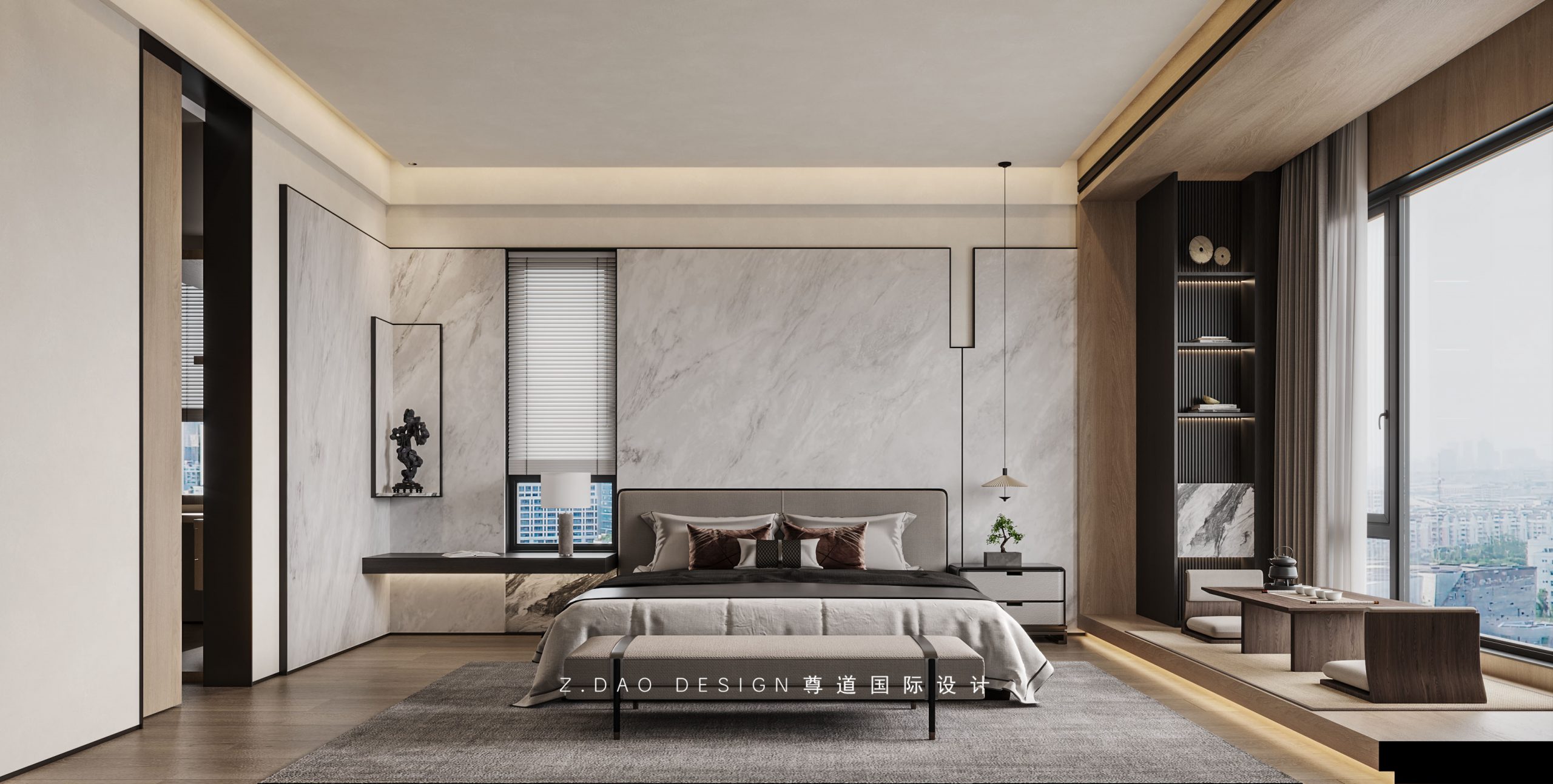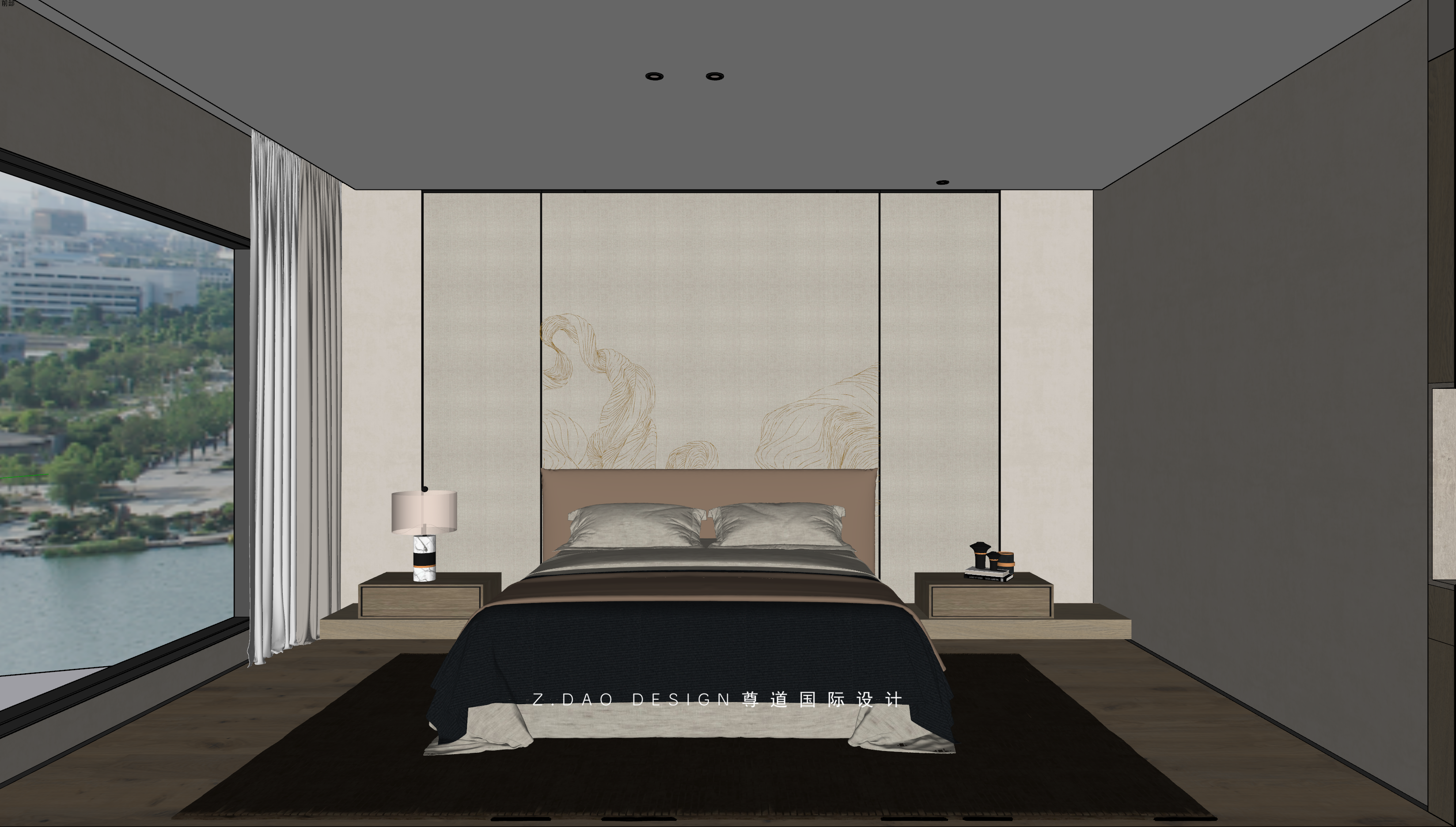 内探装饰吊柜下方做叠级,置入灯光与艺术展示品相得益彰,让空间不单调,深色木饰面弧形包柱打破素色的空间,融入一丝活力。透·主卧• SU立面设计图