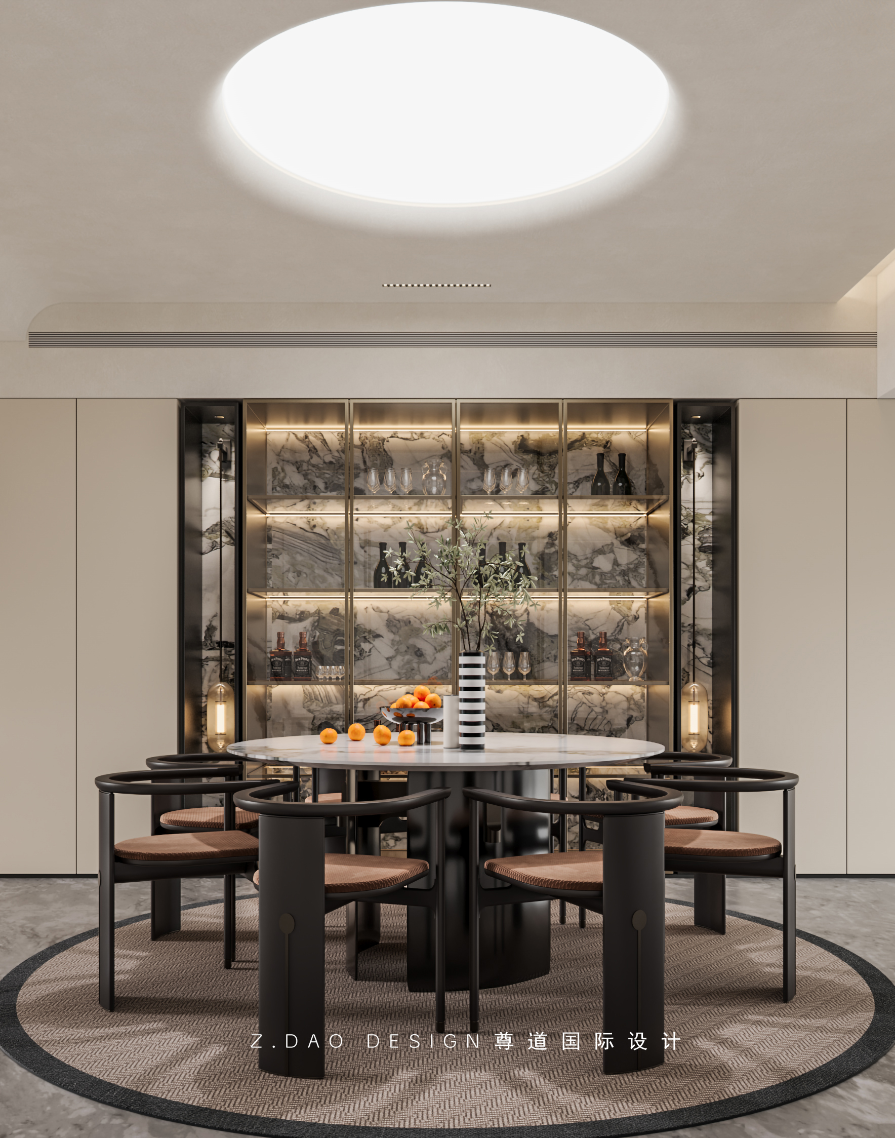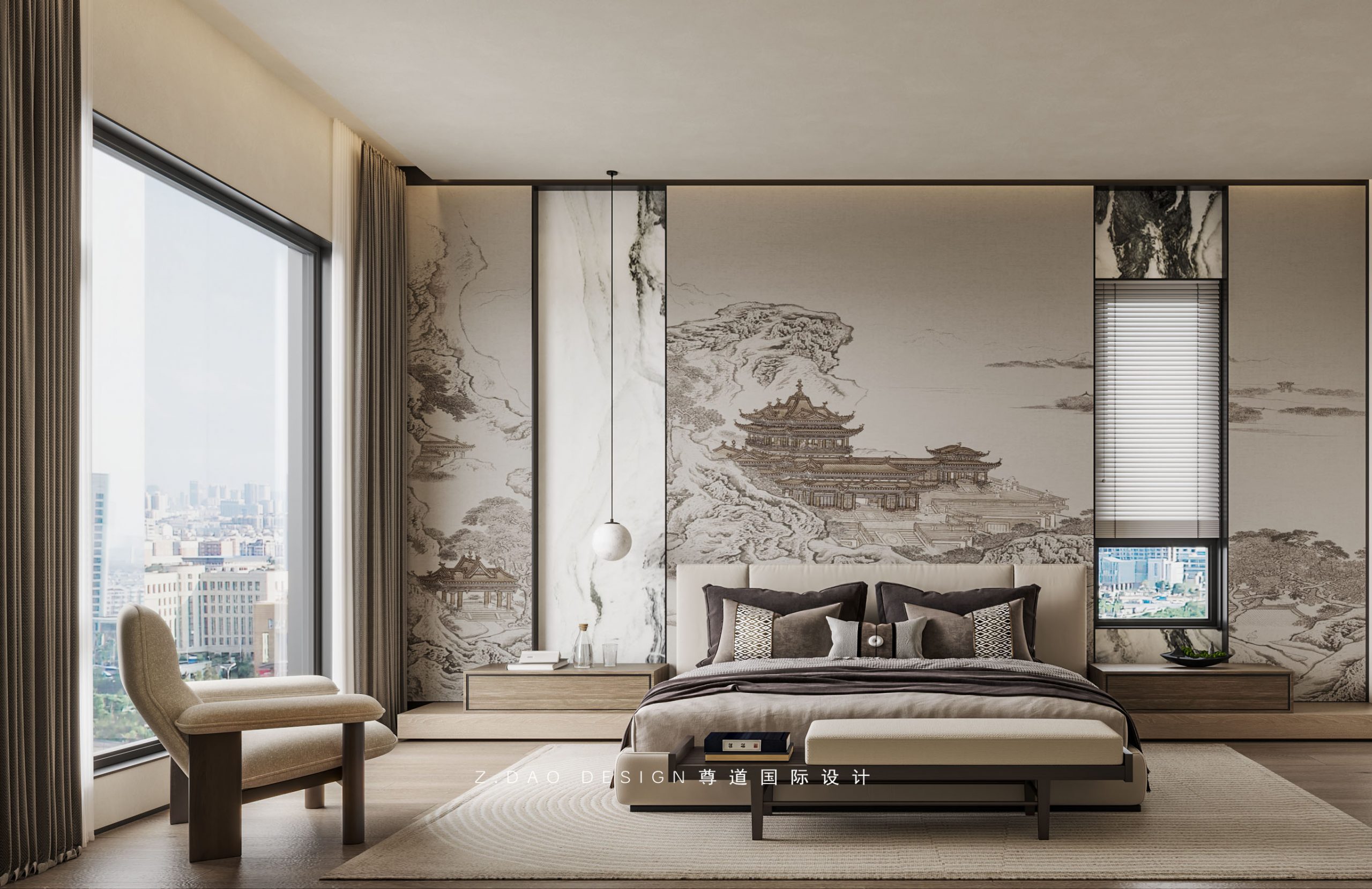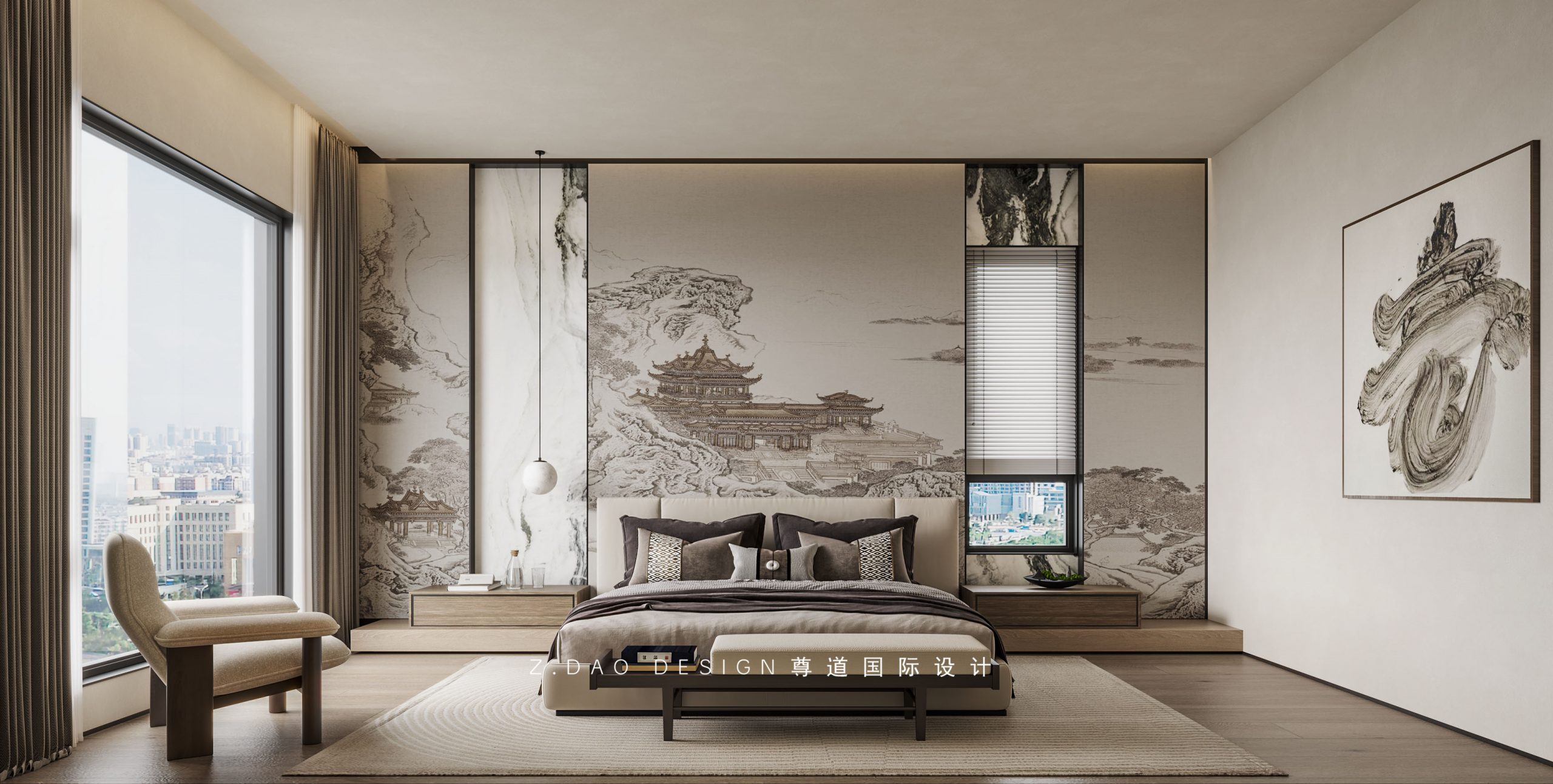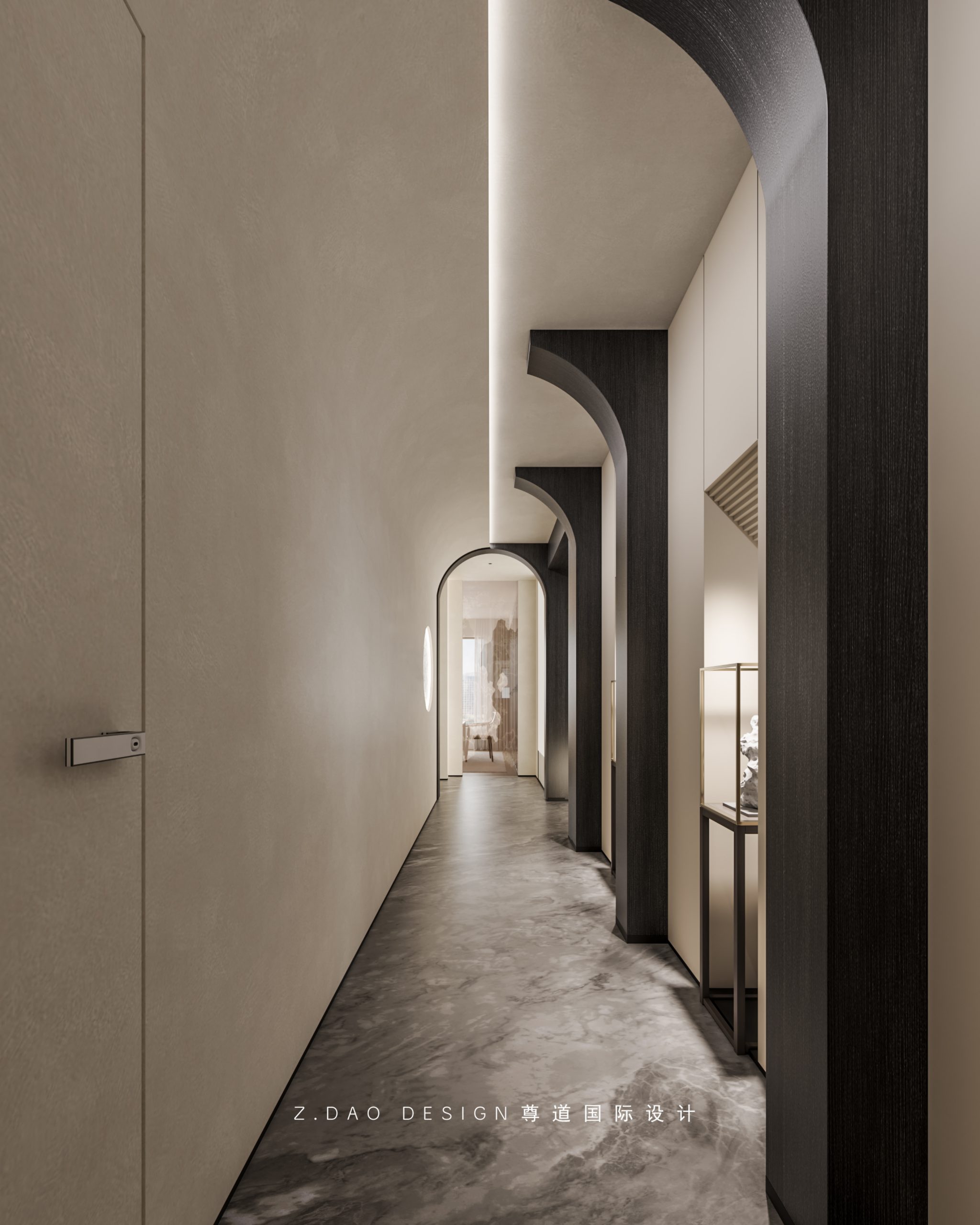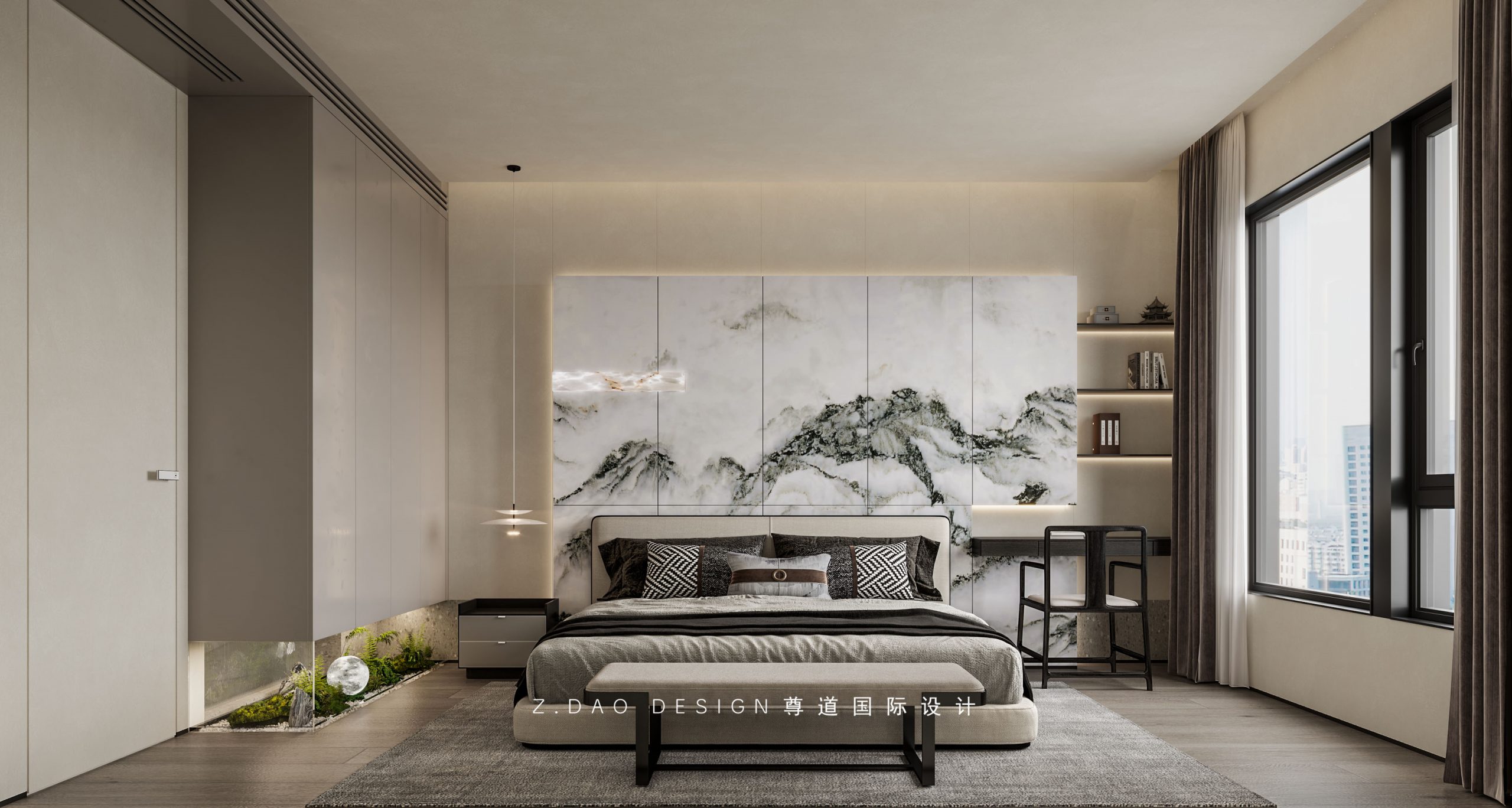 内探装饰吊柜下方做叠级,置入灯光与艺术展示品相得益彰,让空间不单调,深色木饰面弧形包柱打破素色的空间,融入一丝活力。透·主卧• SU立面设计图