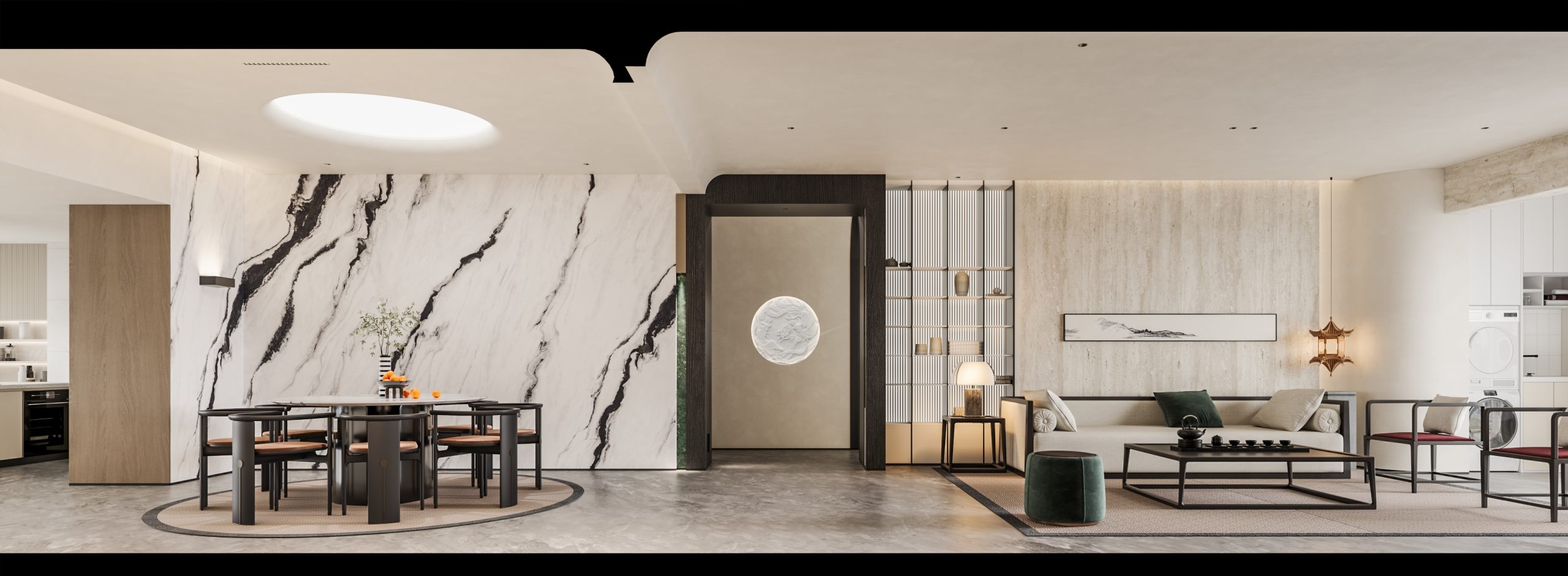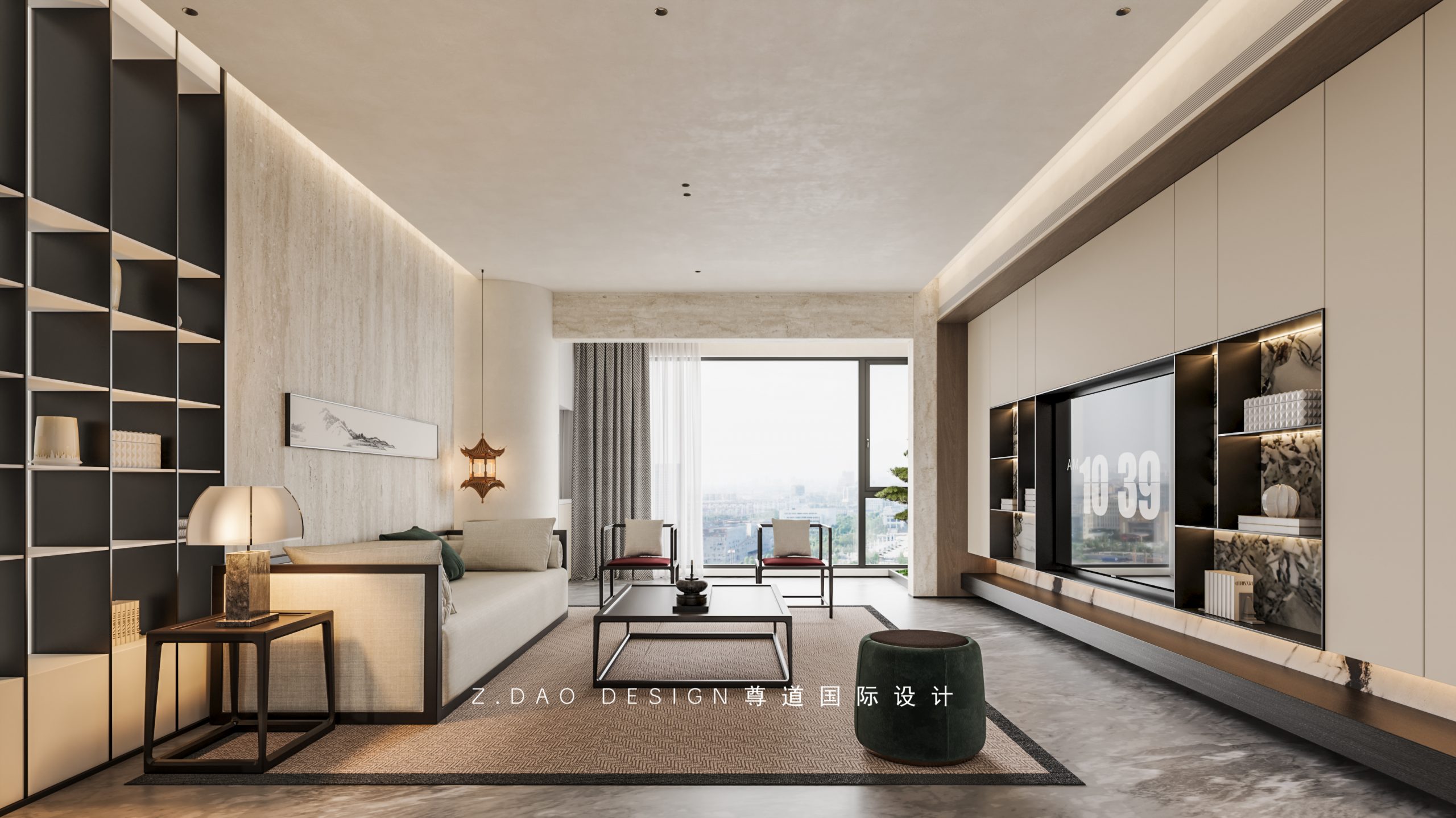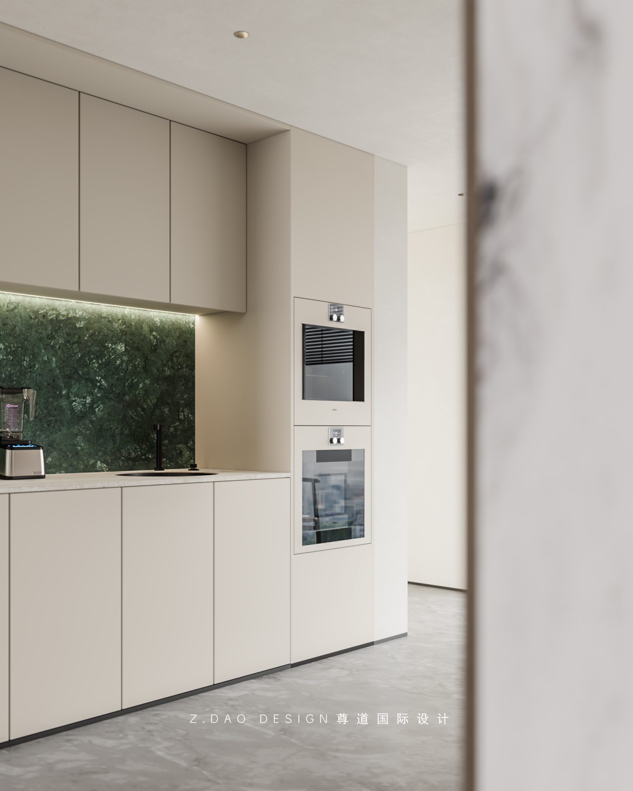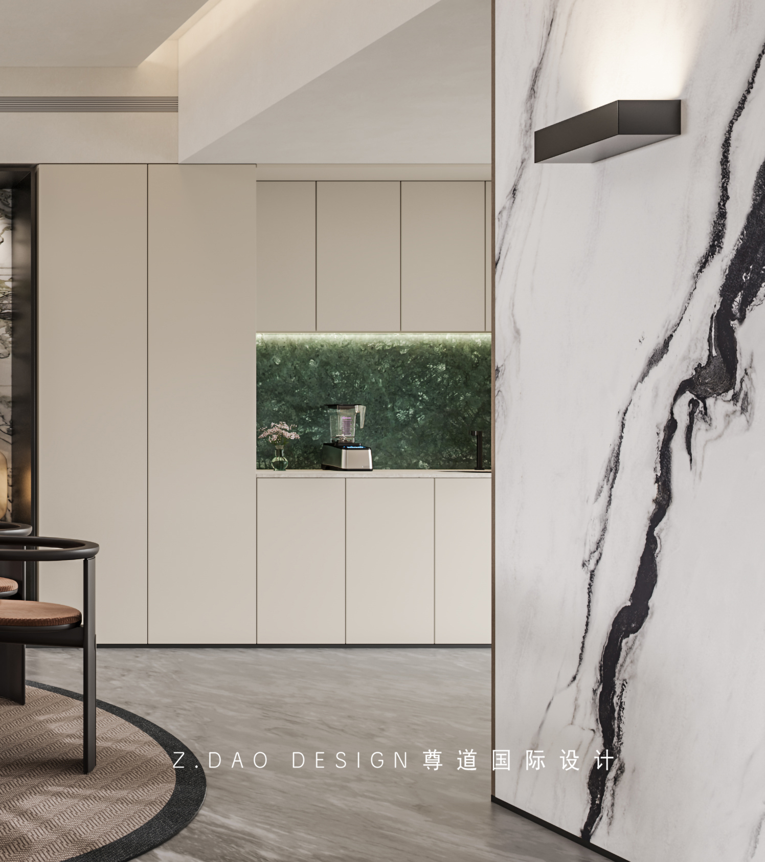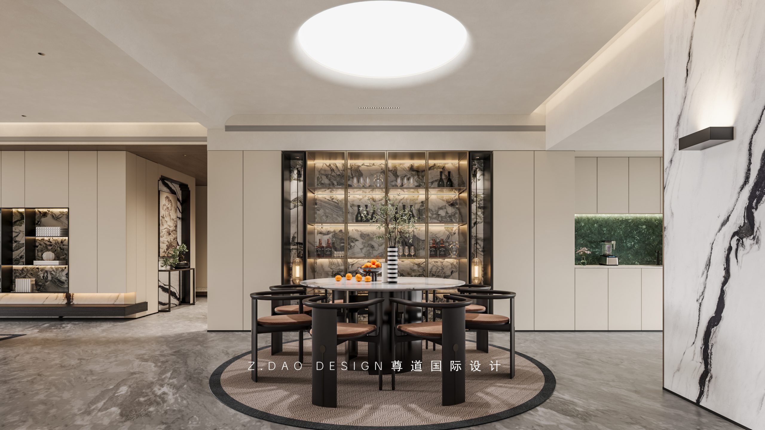 内探装饰吊柜下方做叠级,置入灯光与艺术展示品相得益彰,让空间不单调,深色木饰面弧形包柱打破素色的空间,融入一丝活力。透·主卧• SU立面设计图