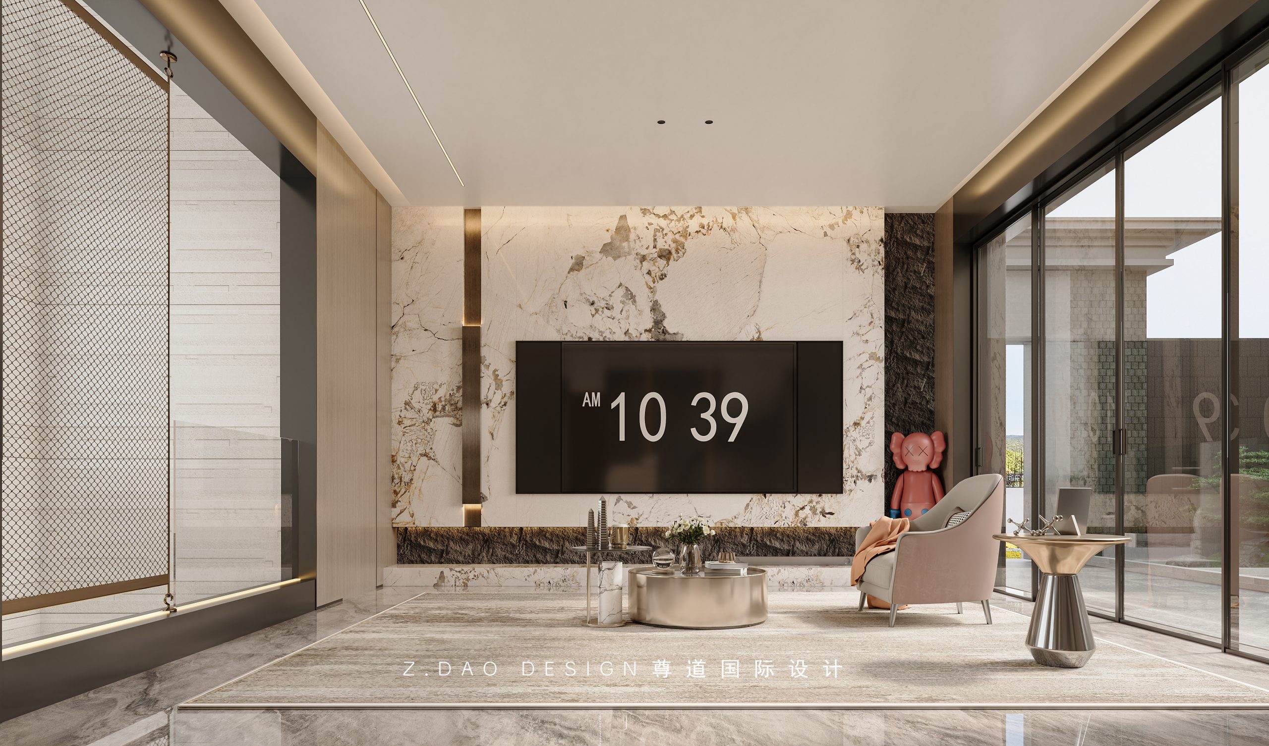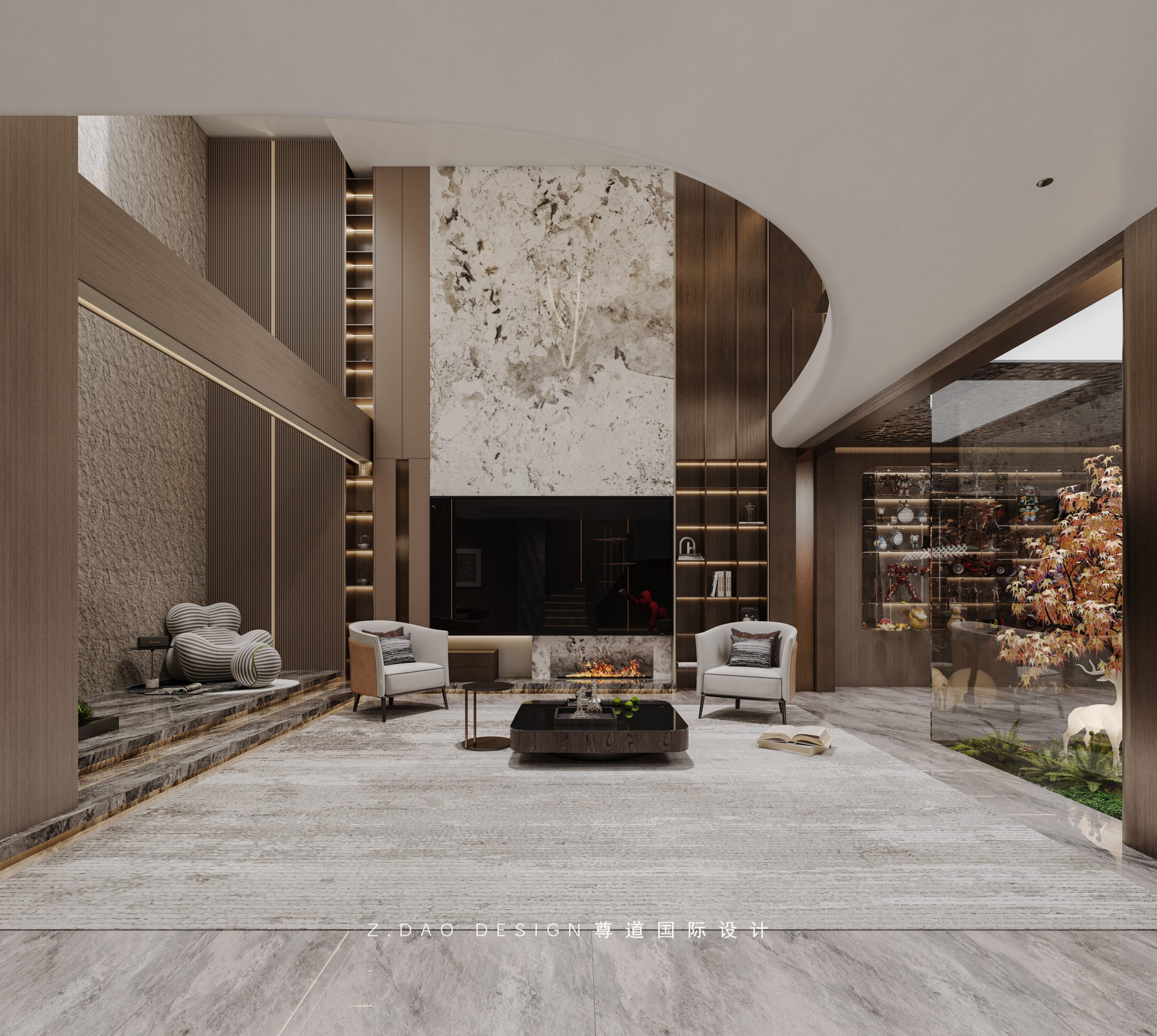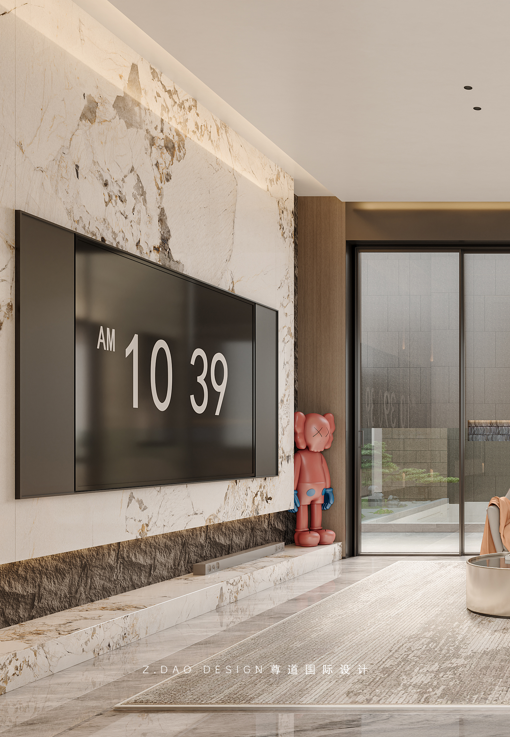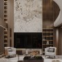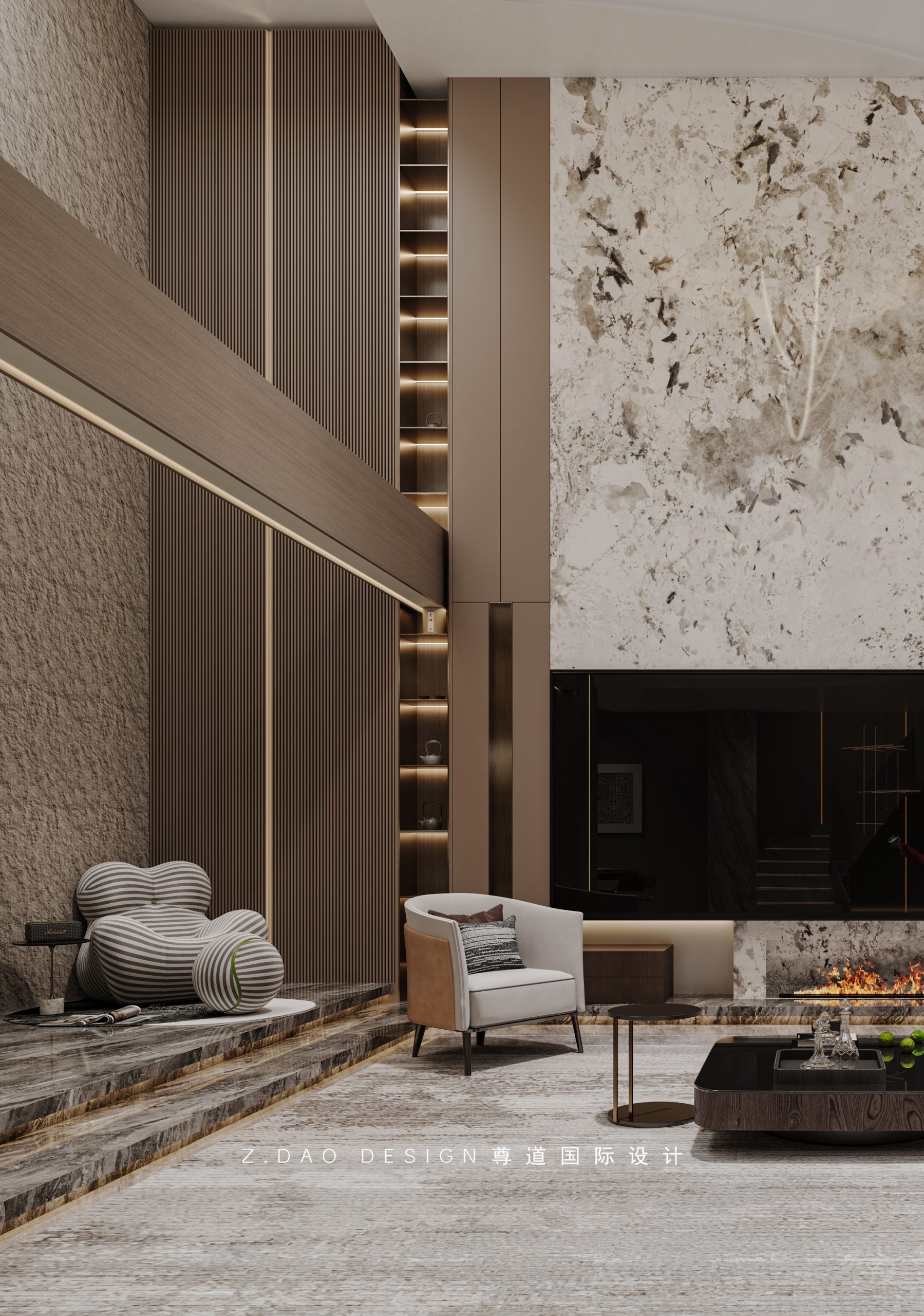 左侧采光井地台大理石通铺到电视背景墙下,与潘多拉岩板背景墙搭配,呼应了整体风格,加上内嵌壁炉,更显层次,营造出温馨的生活氛围。