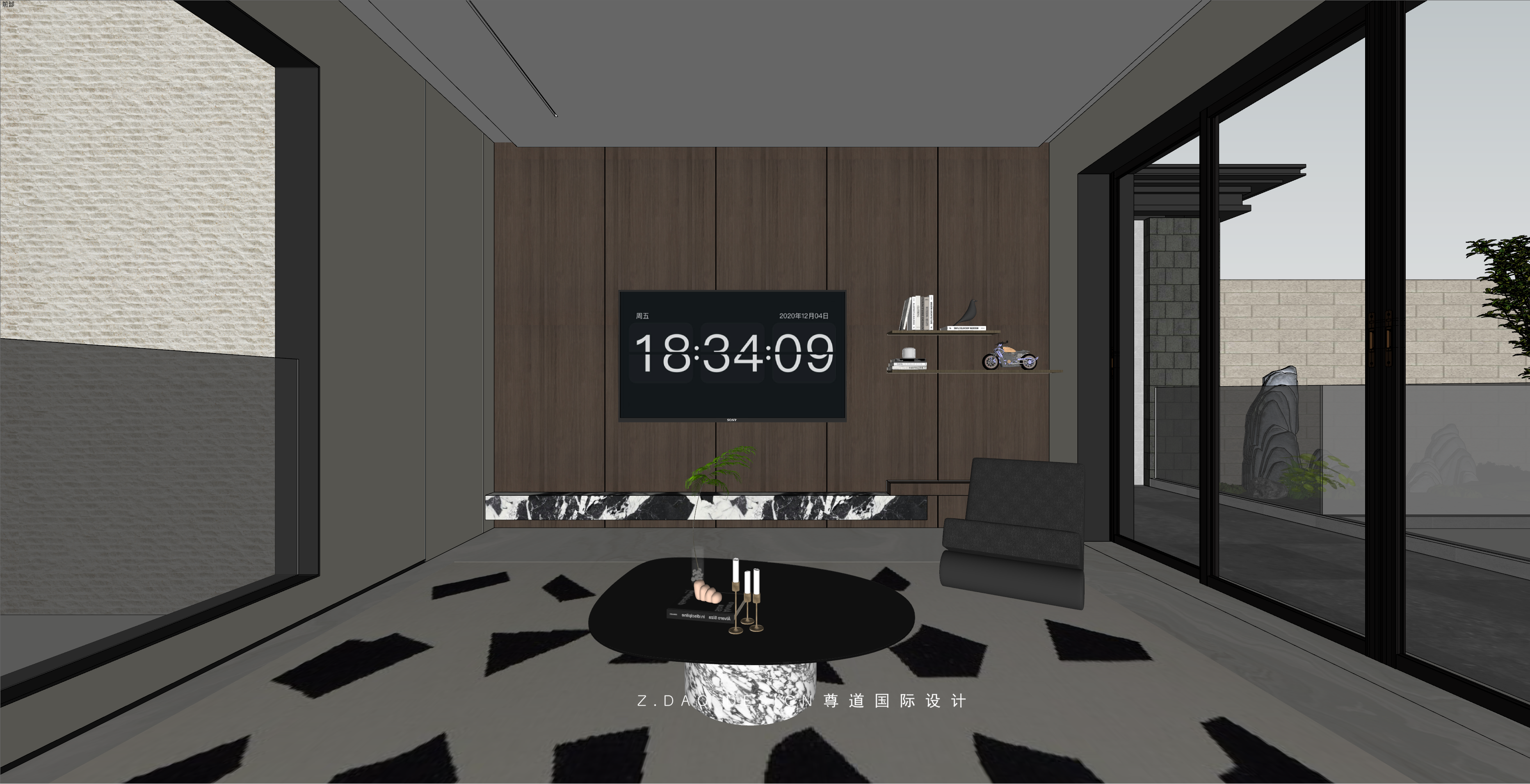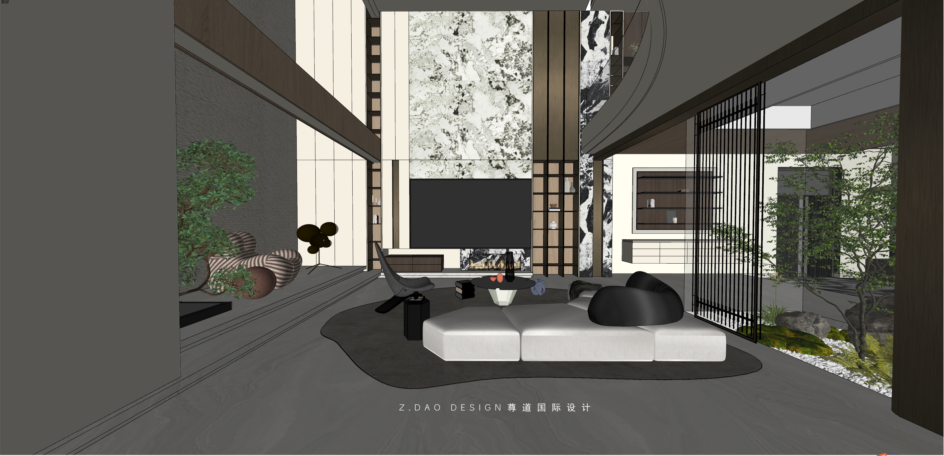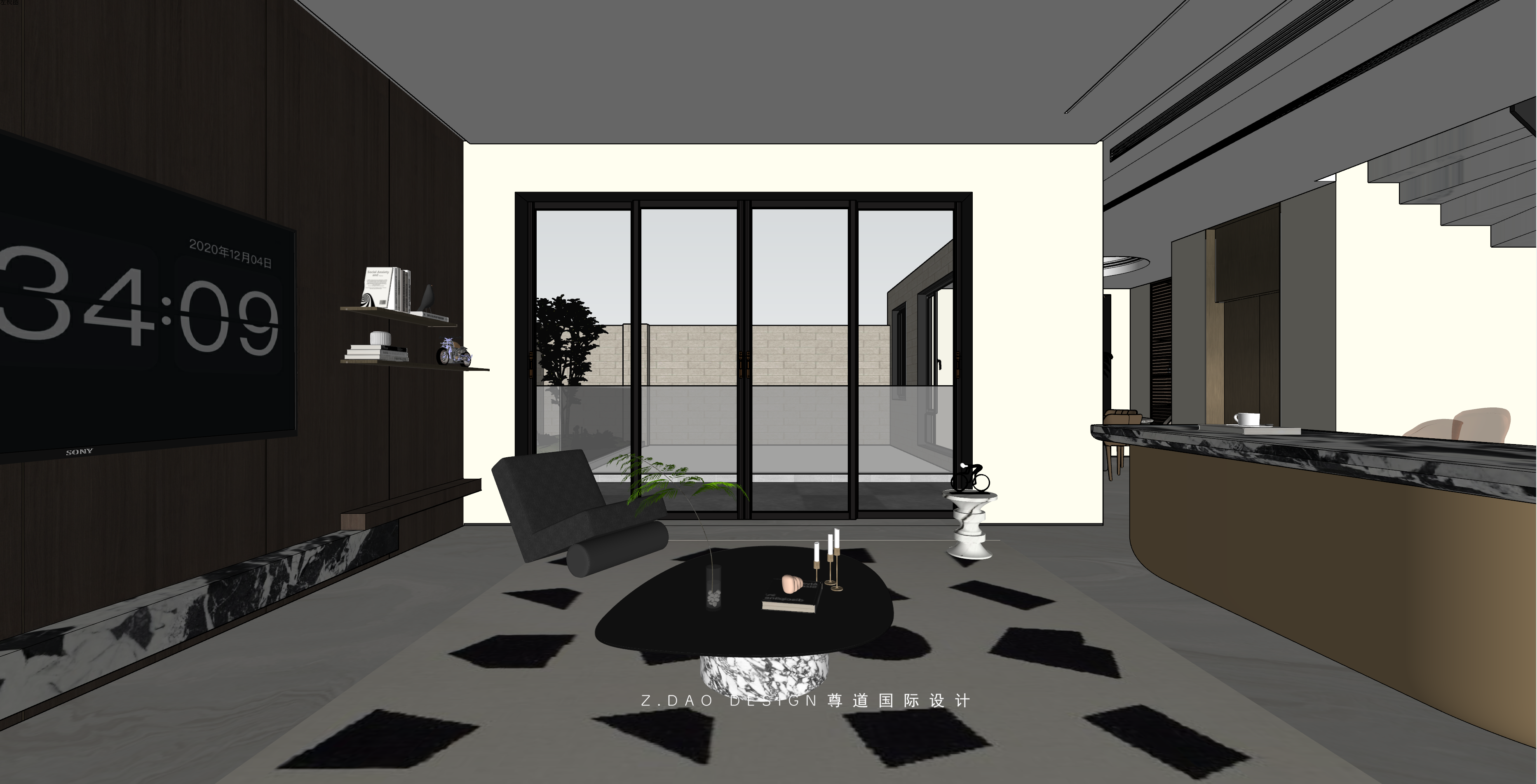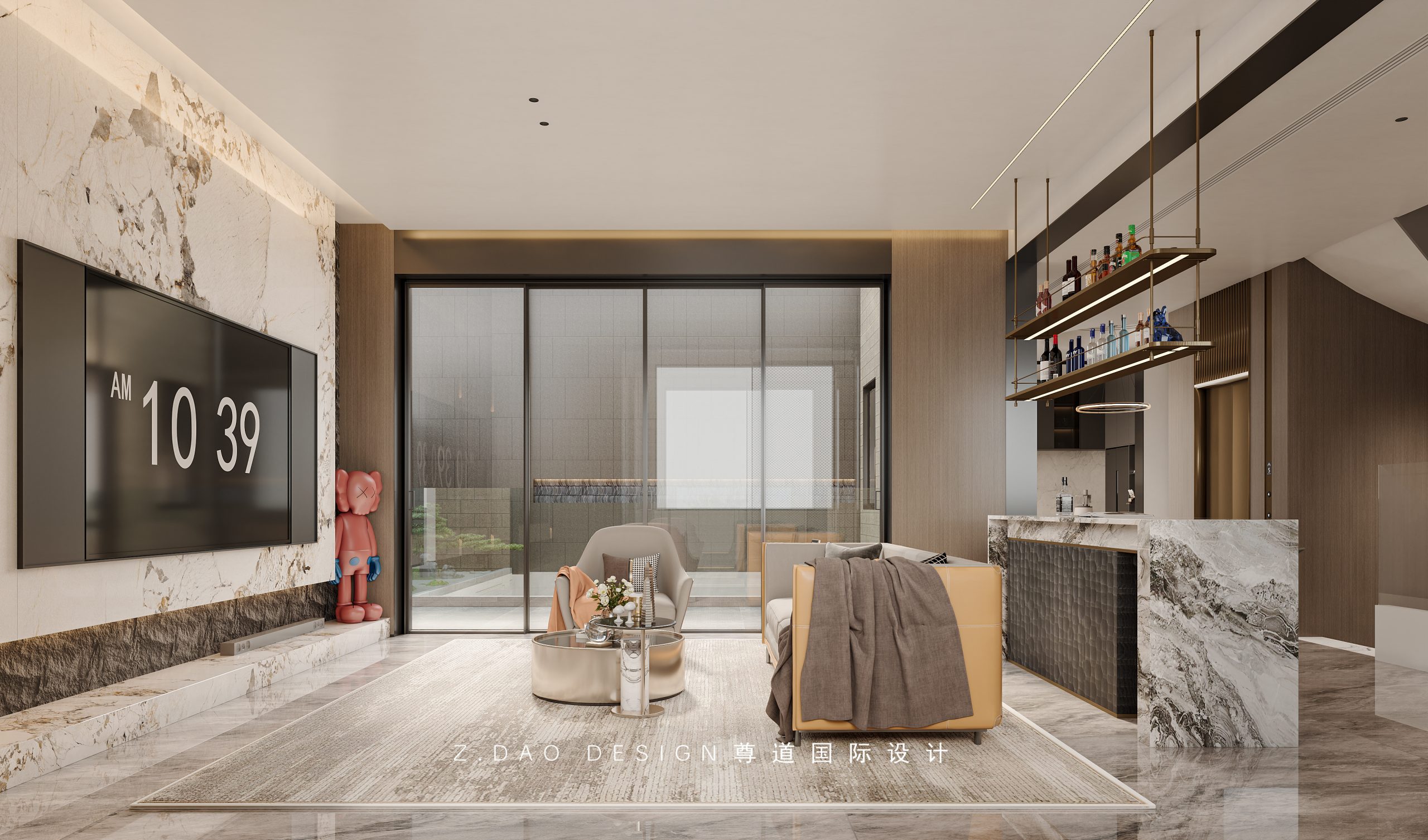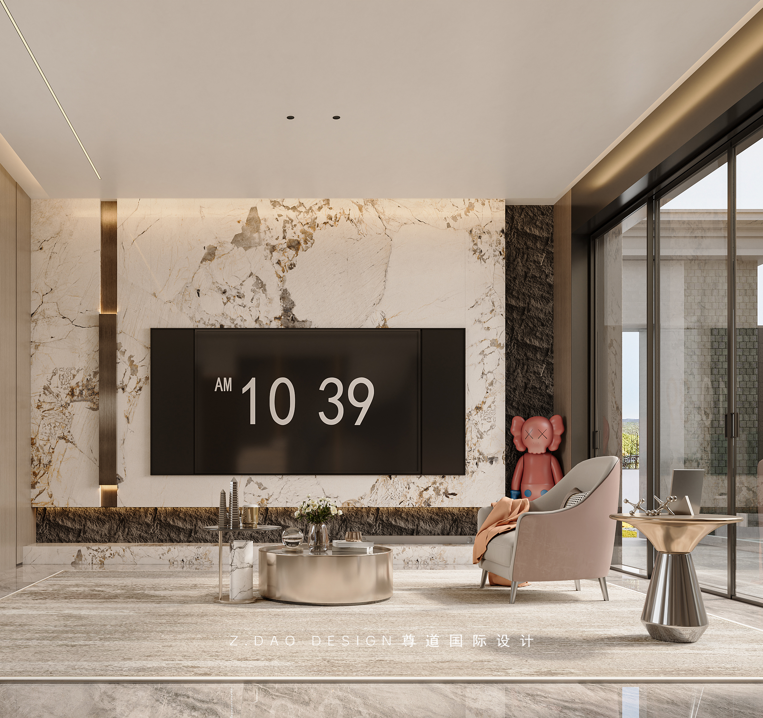 左侧采光井地台大理石通铺到电视背景墙下,与潘多拉岩板背景墙搭配,呼应了整体风格,加上内嵌壁炉,更显层次,营造出温馨的生活氛围。
