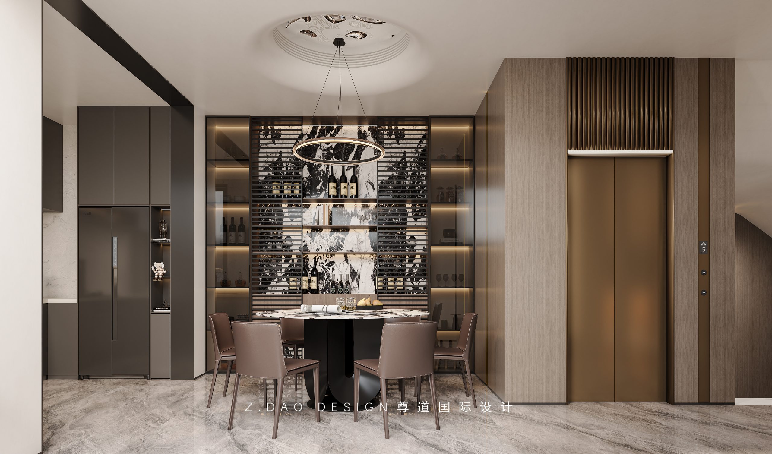 进家的大门采用了吊轨电动移门,既有防盗系数,又增加了采光。整个空间用了大量的木饰面与金属,沉稳有质感,木色的温润让家也变的更有温度。