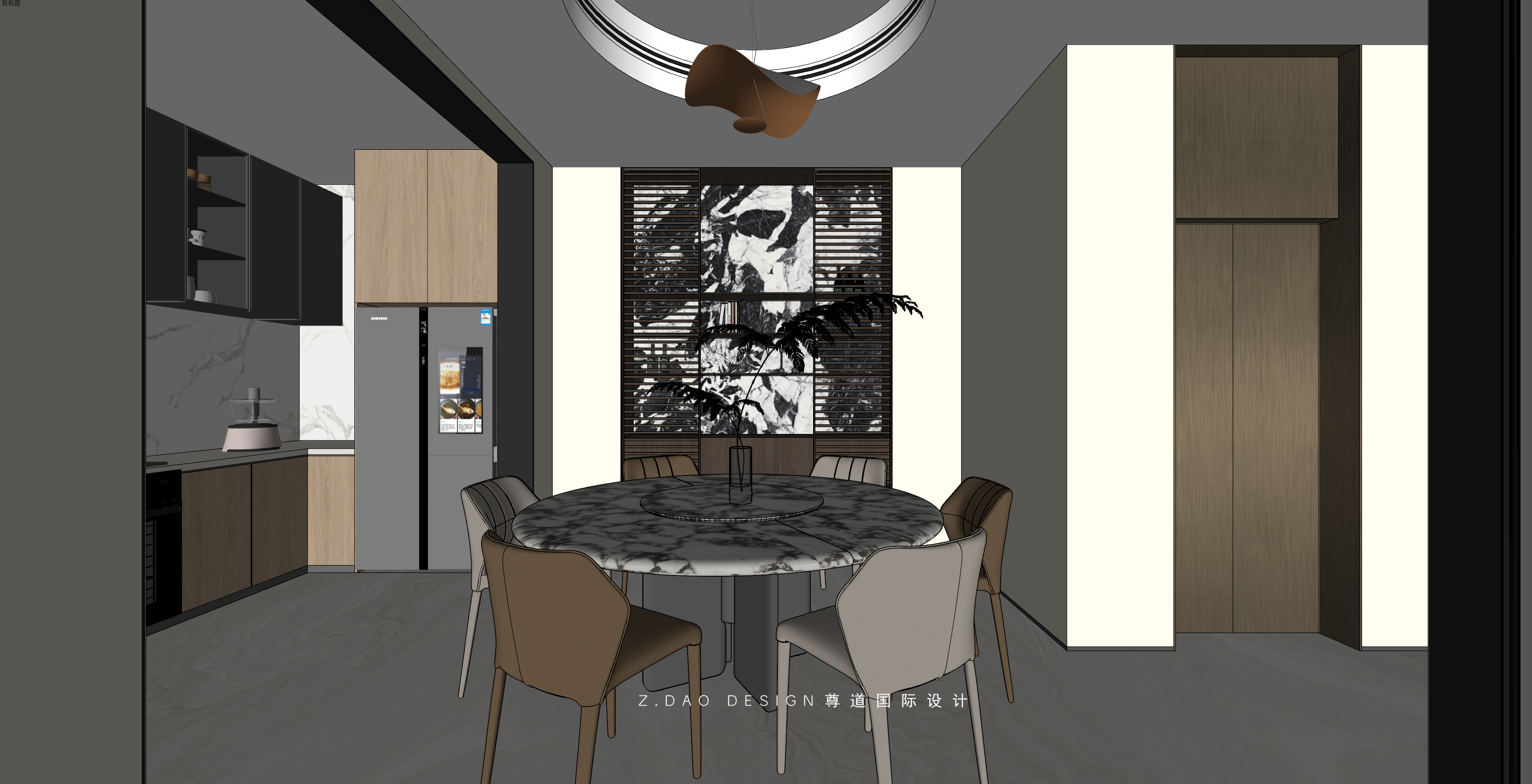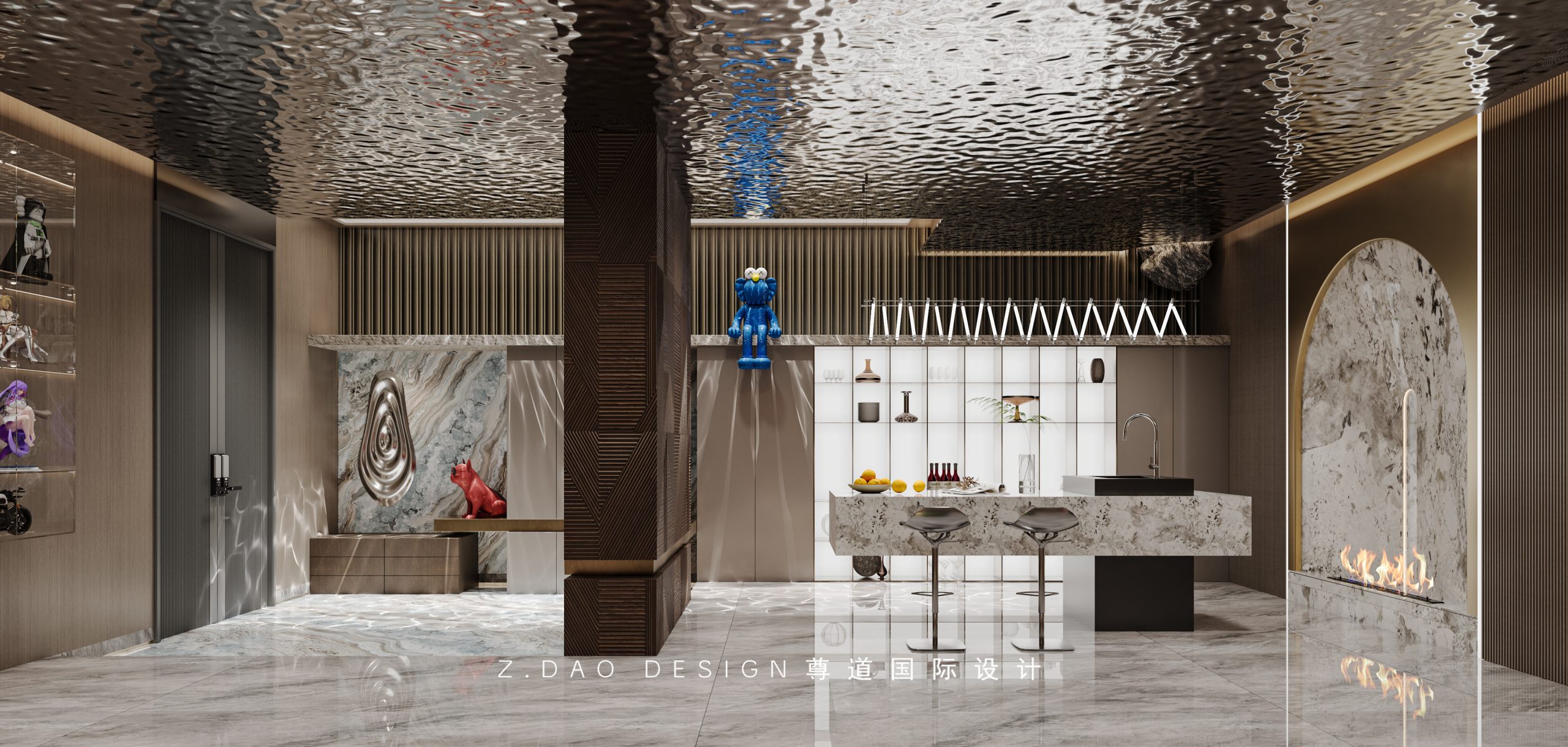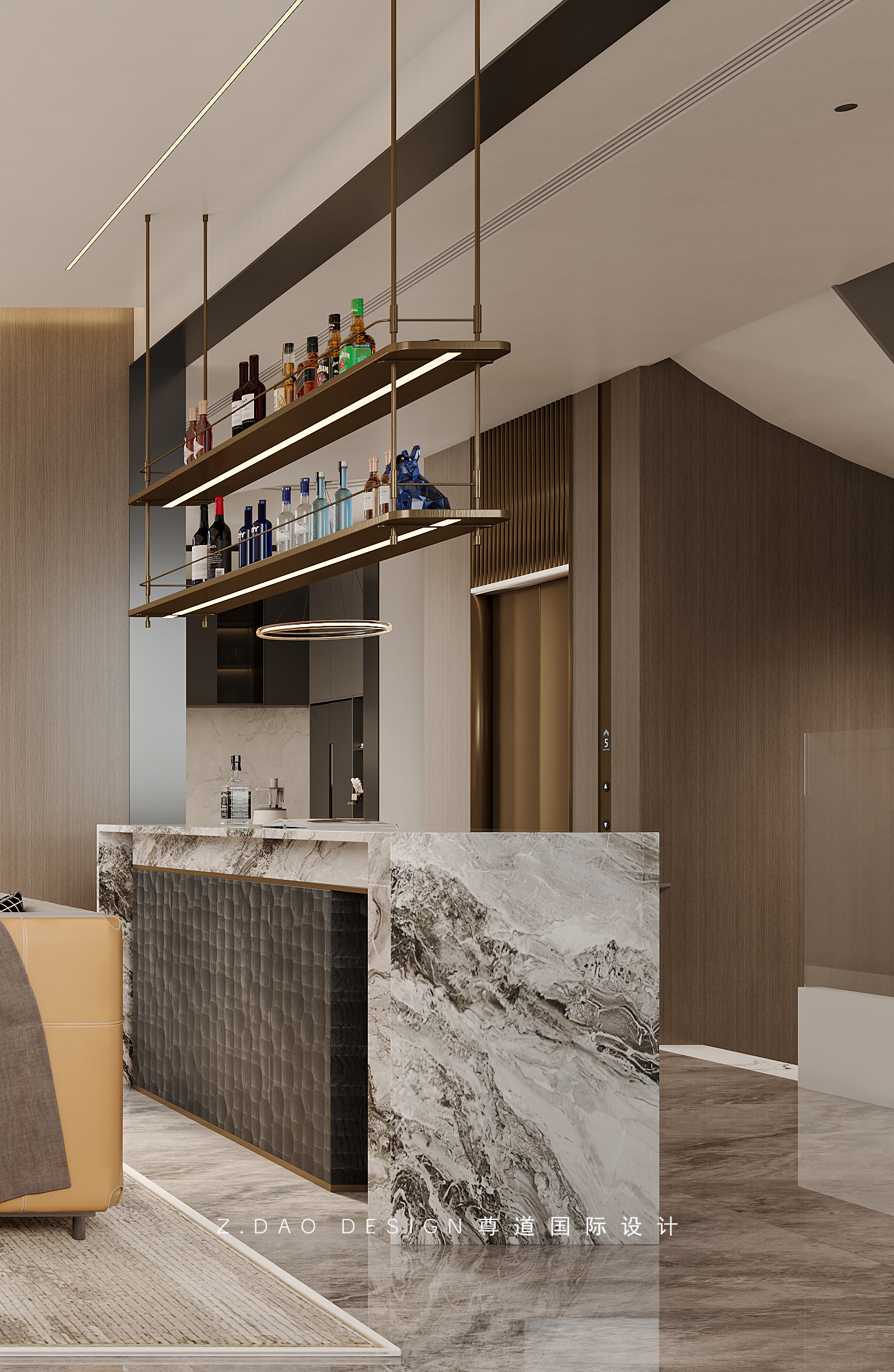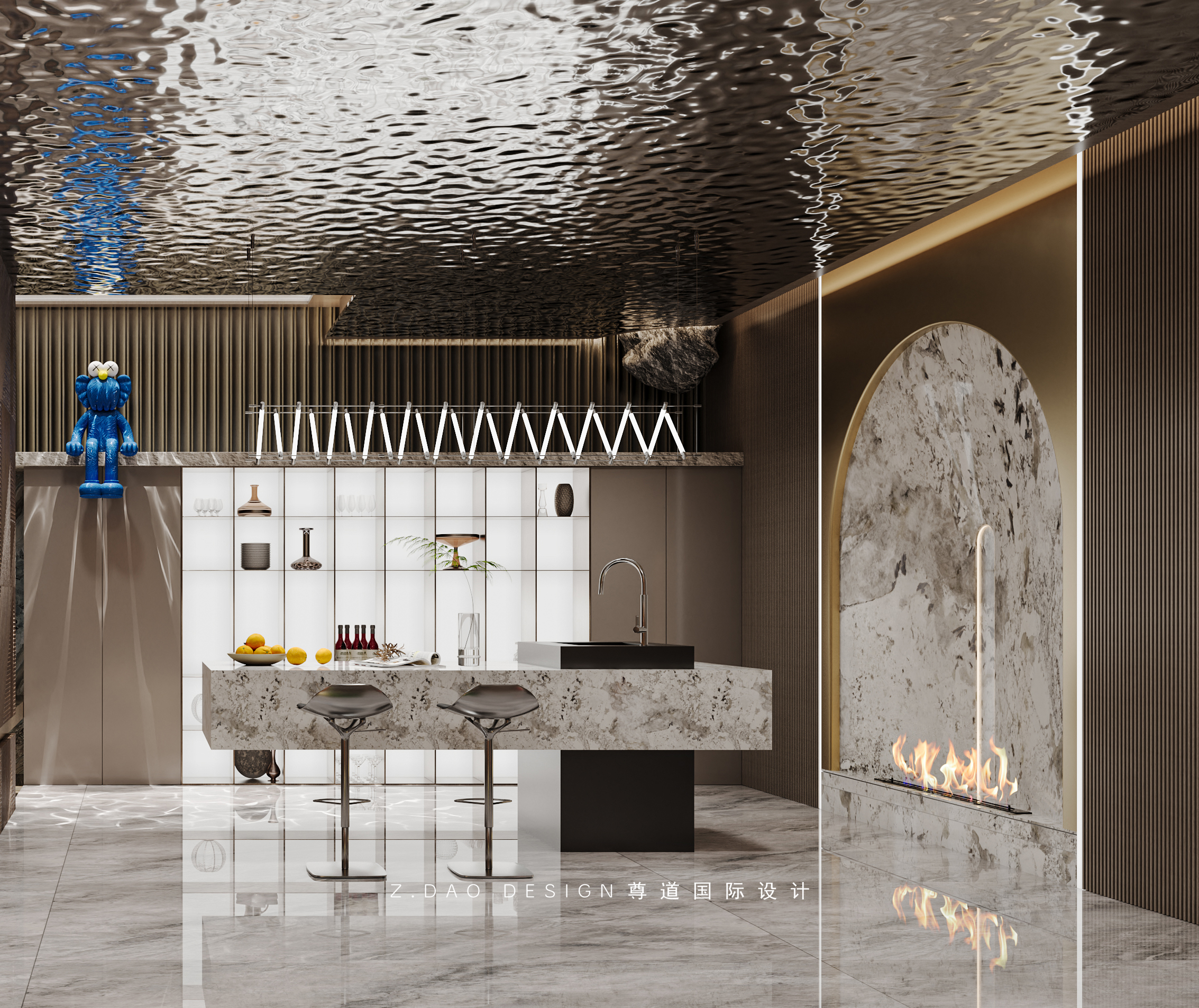 灯光的运用在岛台的实用性上增加了些浪漫色彩,顶部和底部的灯带使得岛台的悬浮感更强。