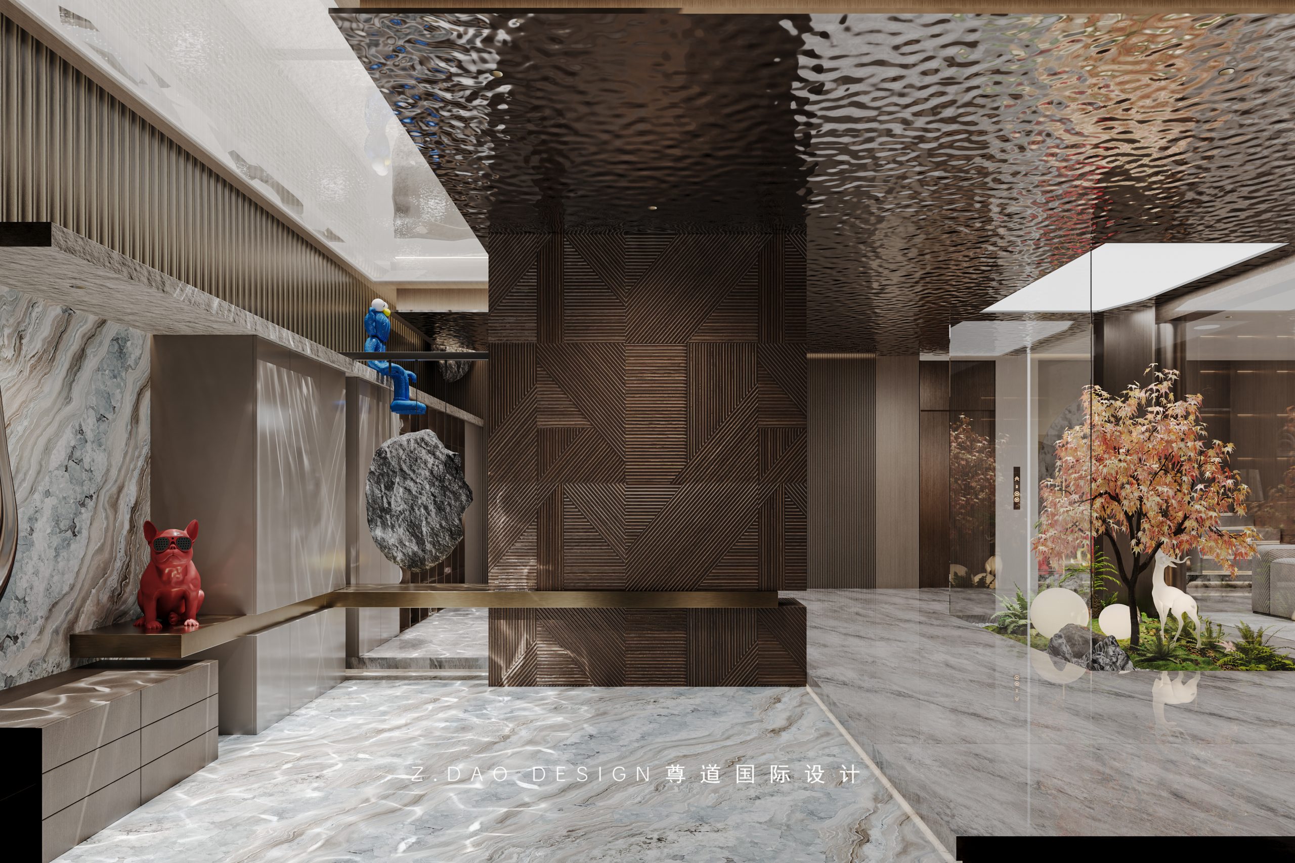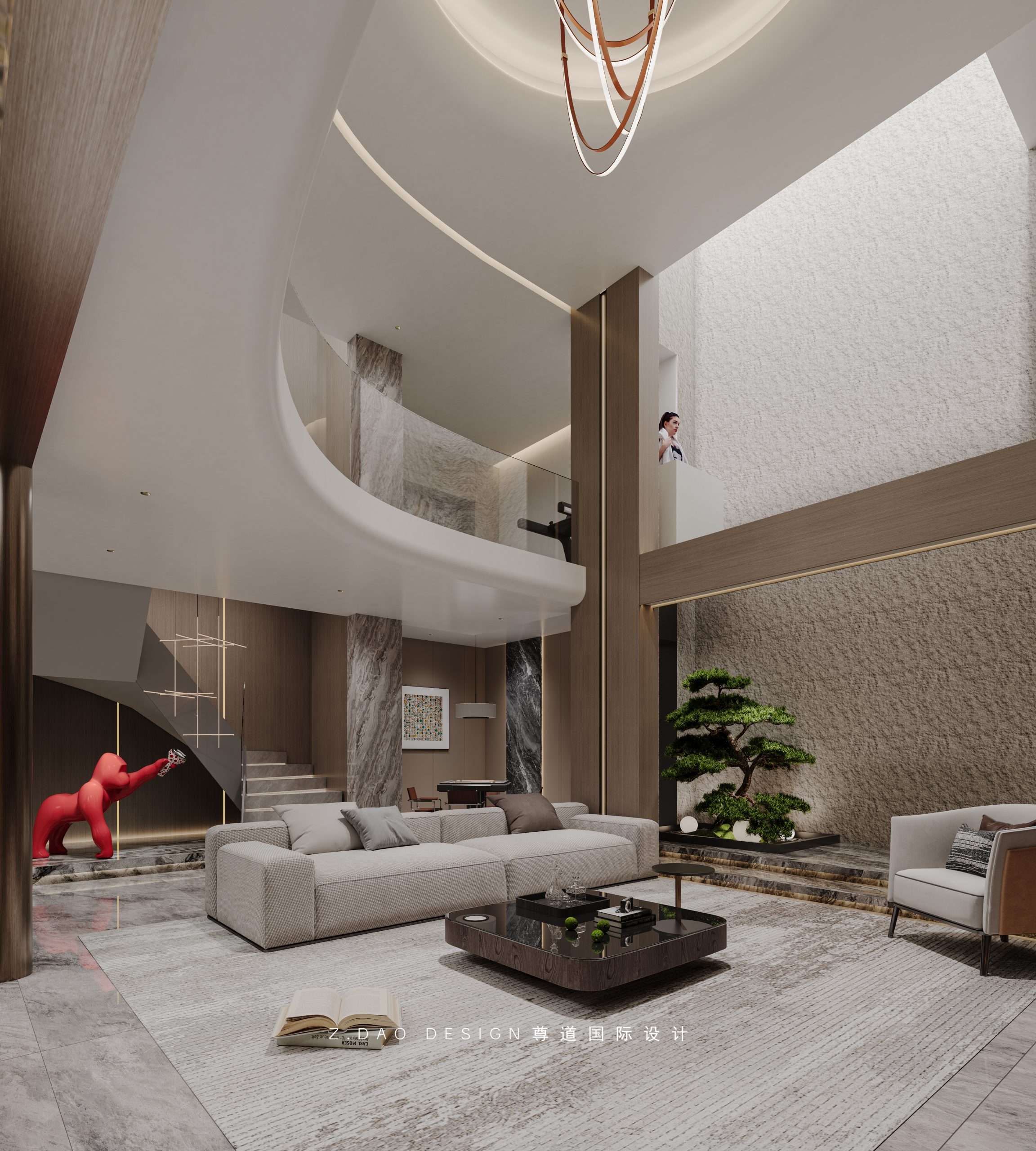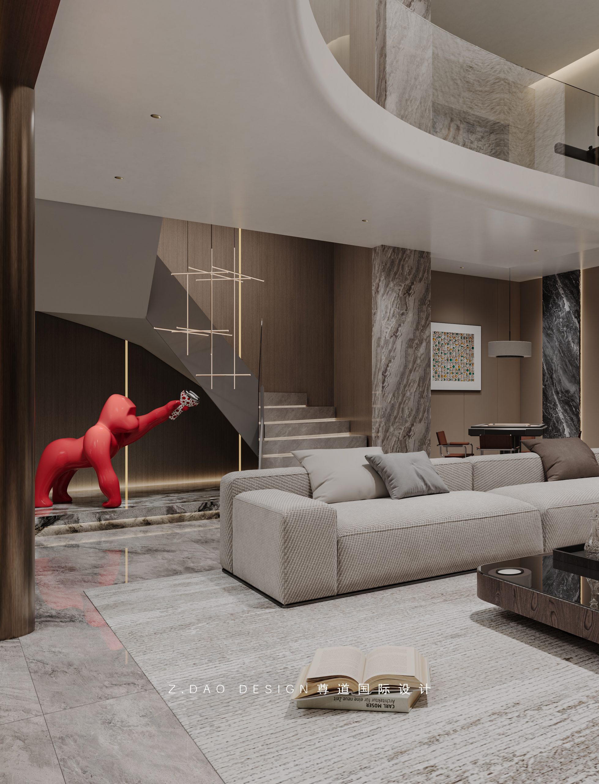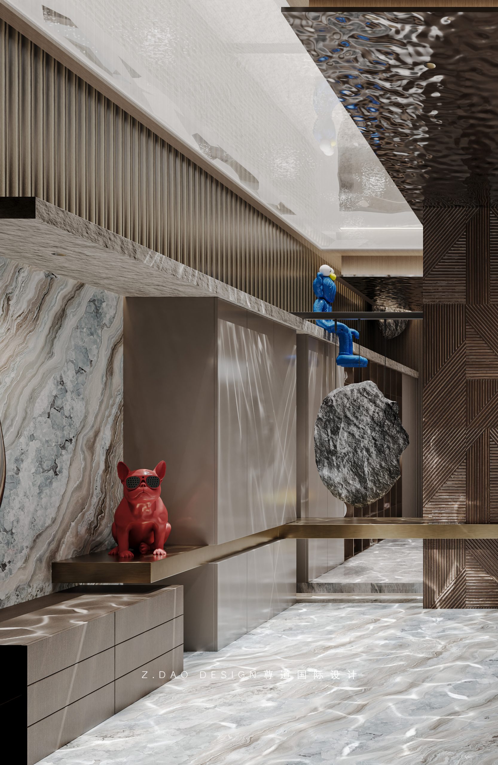楼梯做折角设计,搭配黑色的钢化玻璃,加上楼梯底部的潮玩摆件,为整个空间增添生命力和活力。