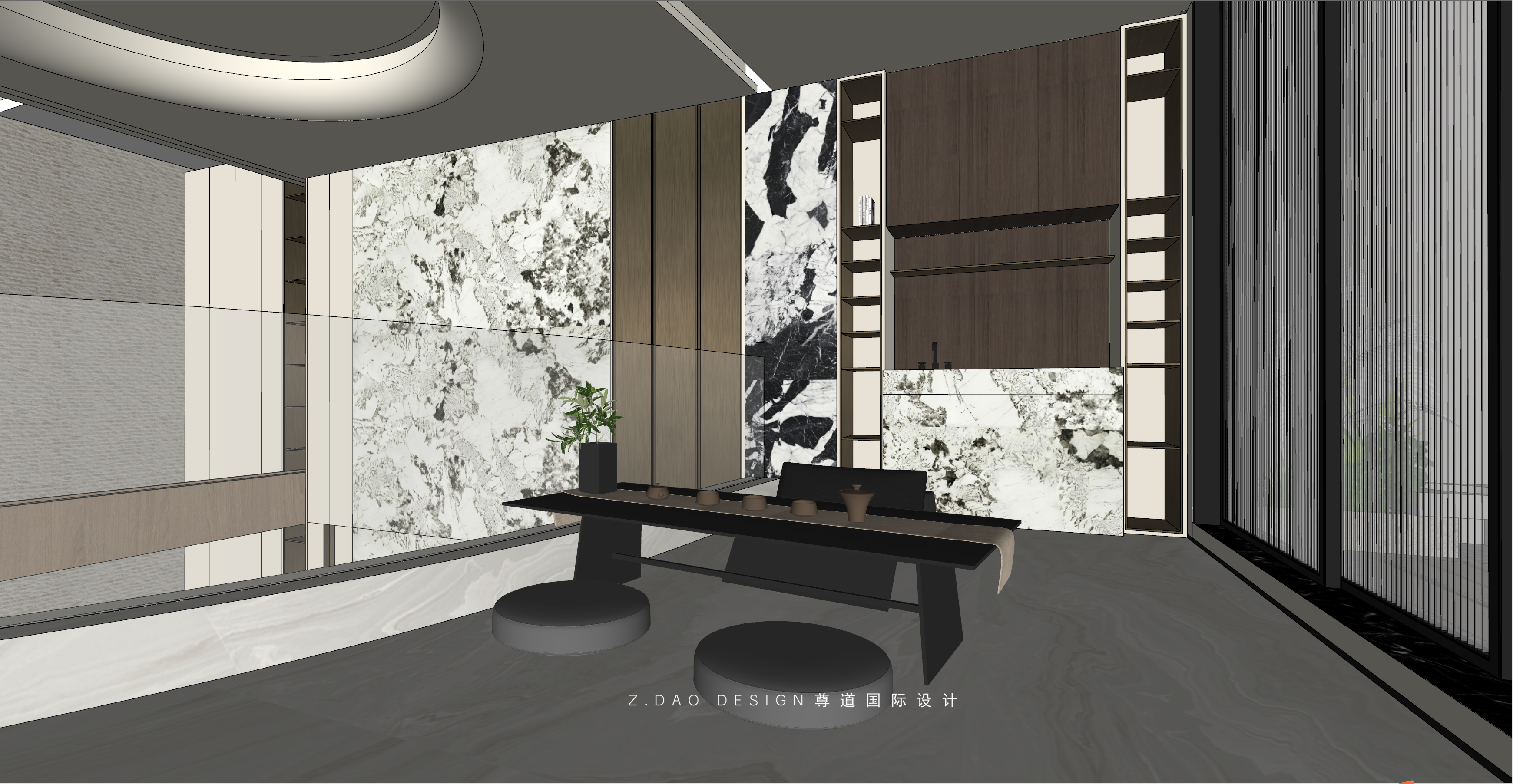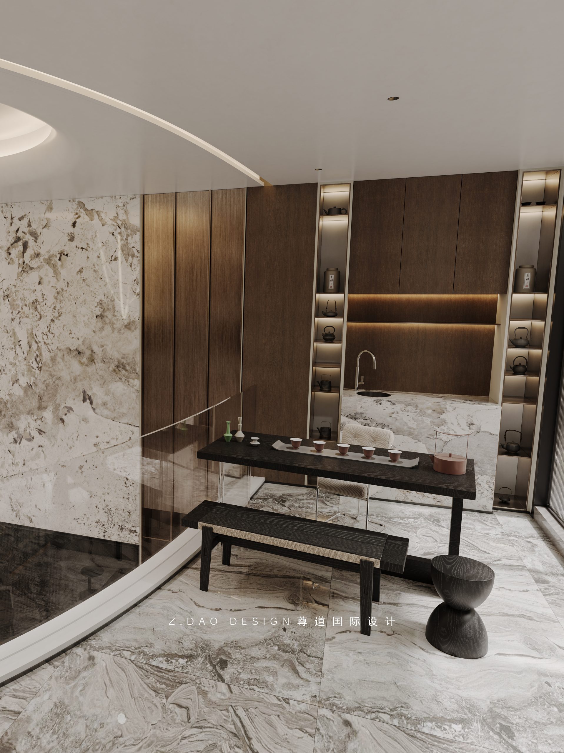 浅色半墙岩板+深色木饰面做撞色,预留出的缝隙让极简几何之美充分凸显,嵌入金属缝隙中的小块墨绿色大理石则让空间质感提升的点金之笔。