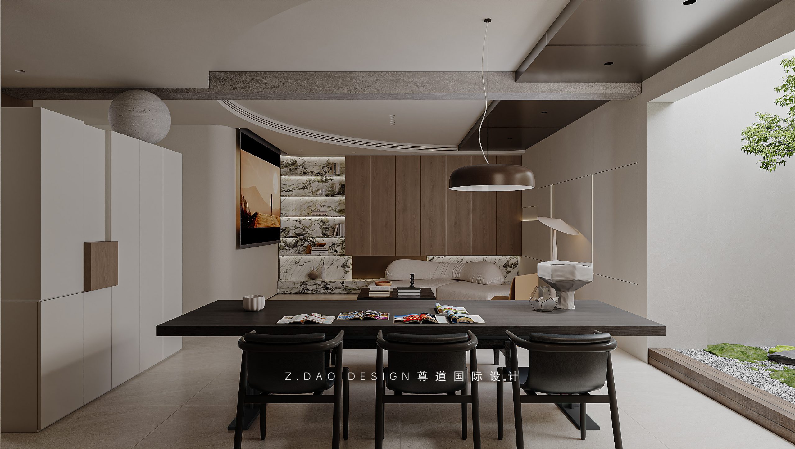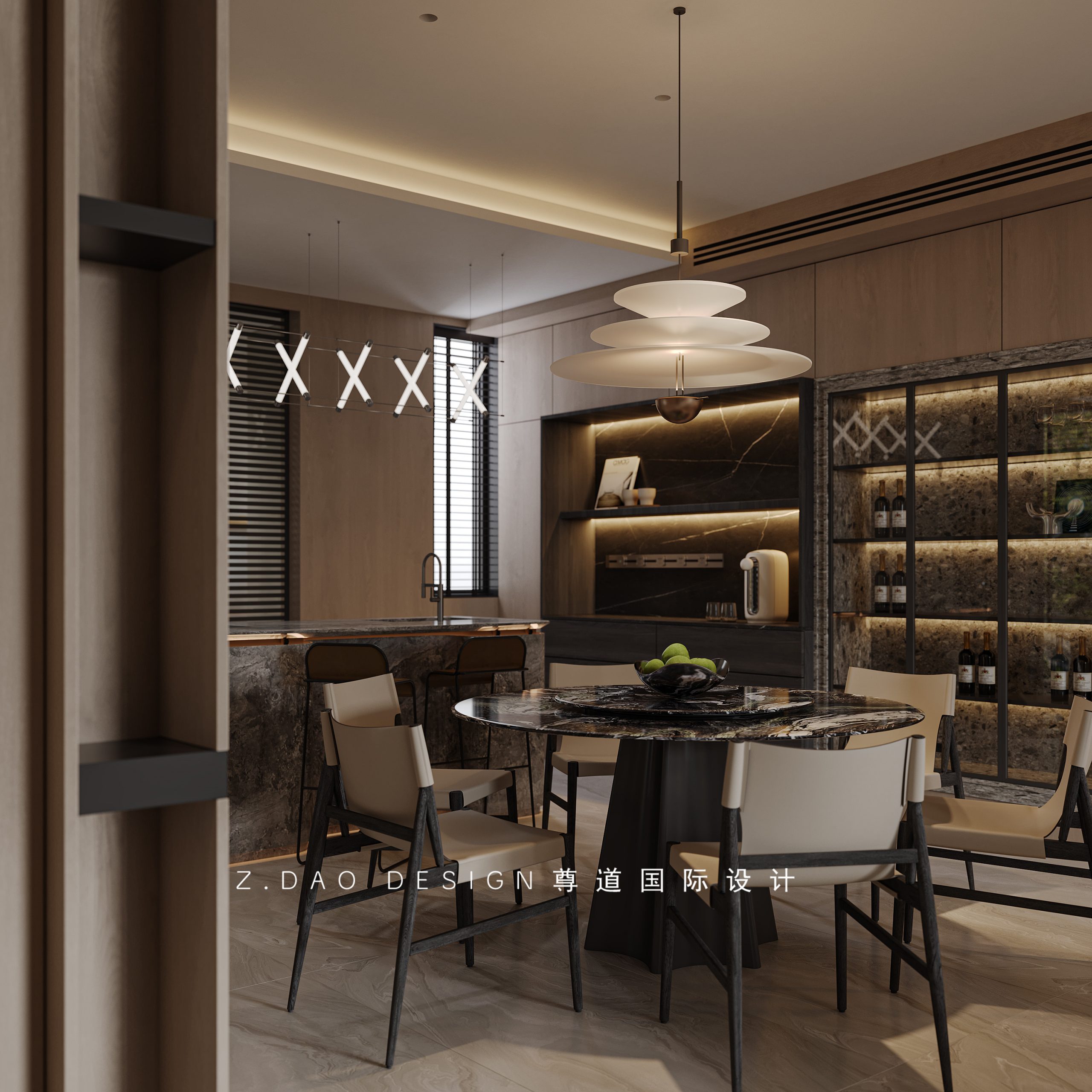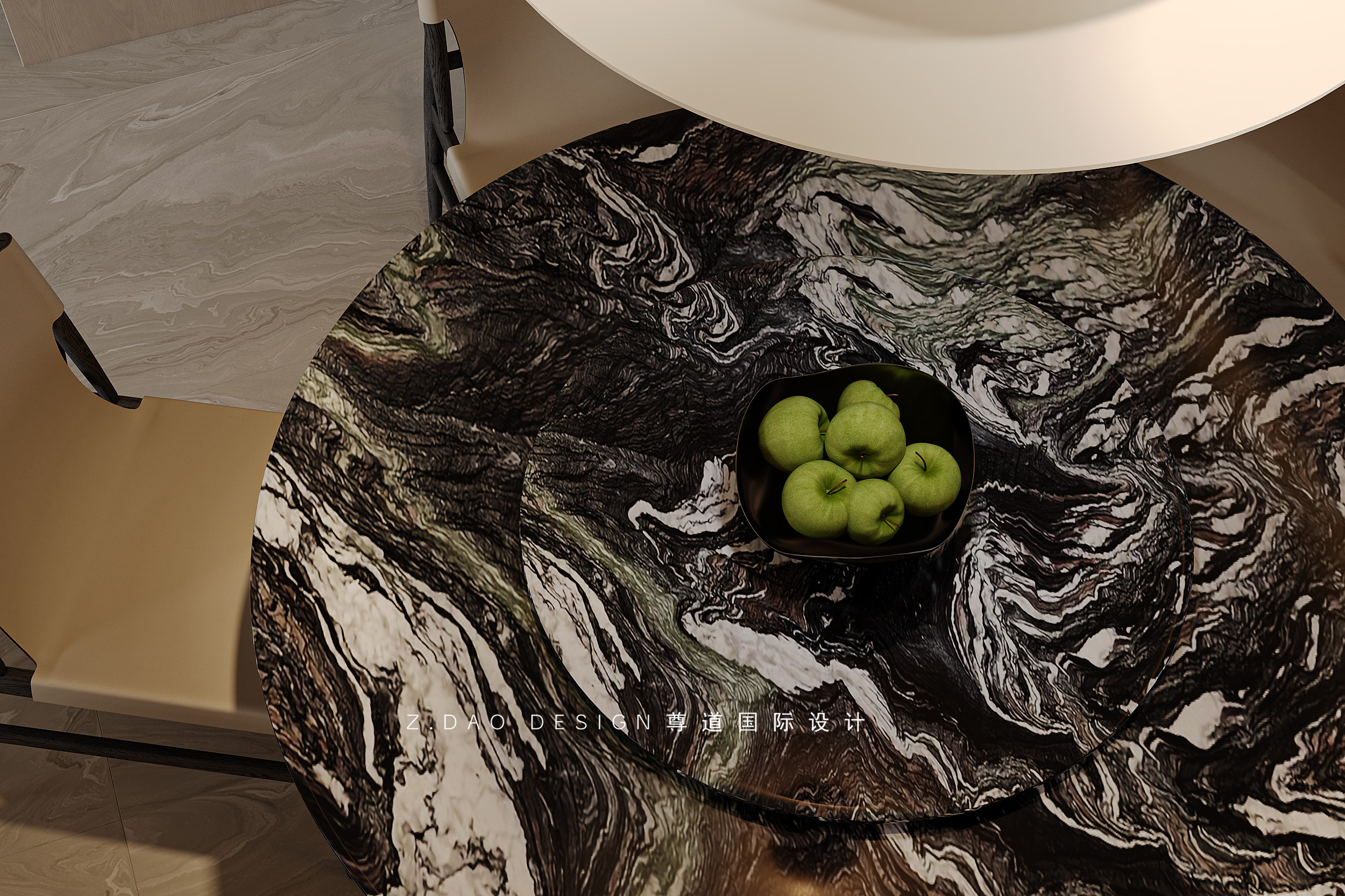 餐边柜同样以岩板+木饰面的组合出现,深色的木饰面以及岩板在灯光的作用下呈现出低调的黑金质感。