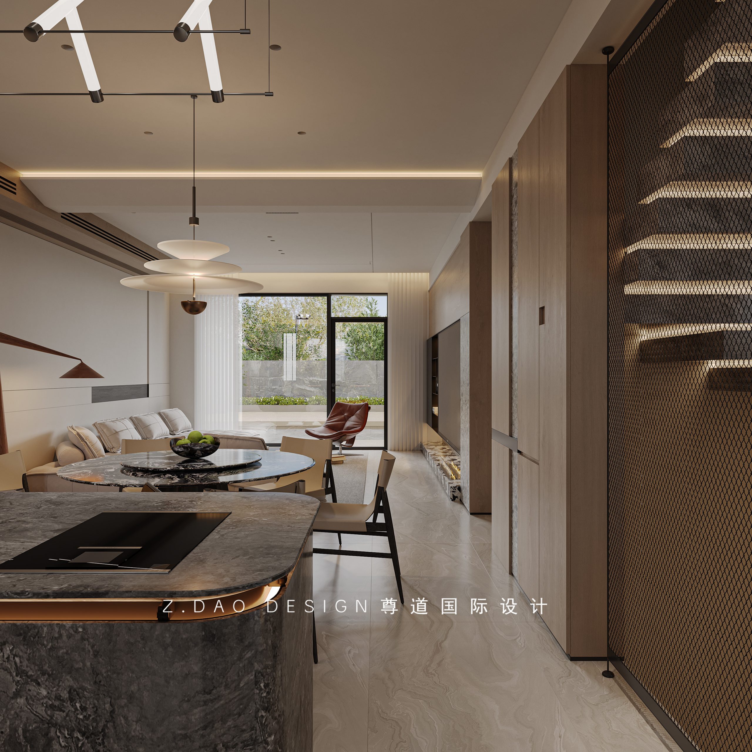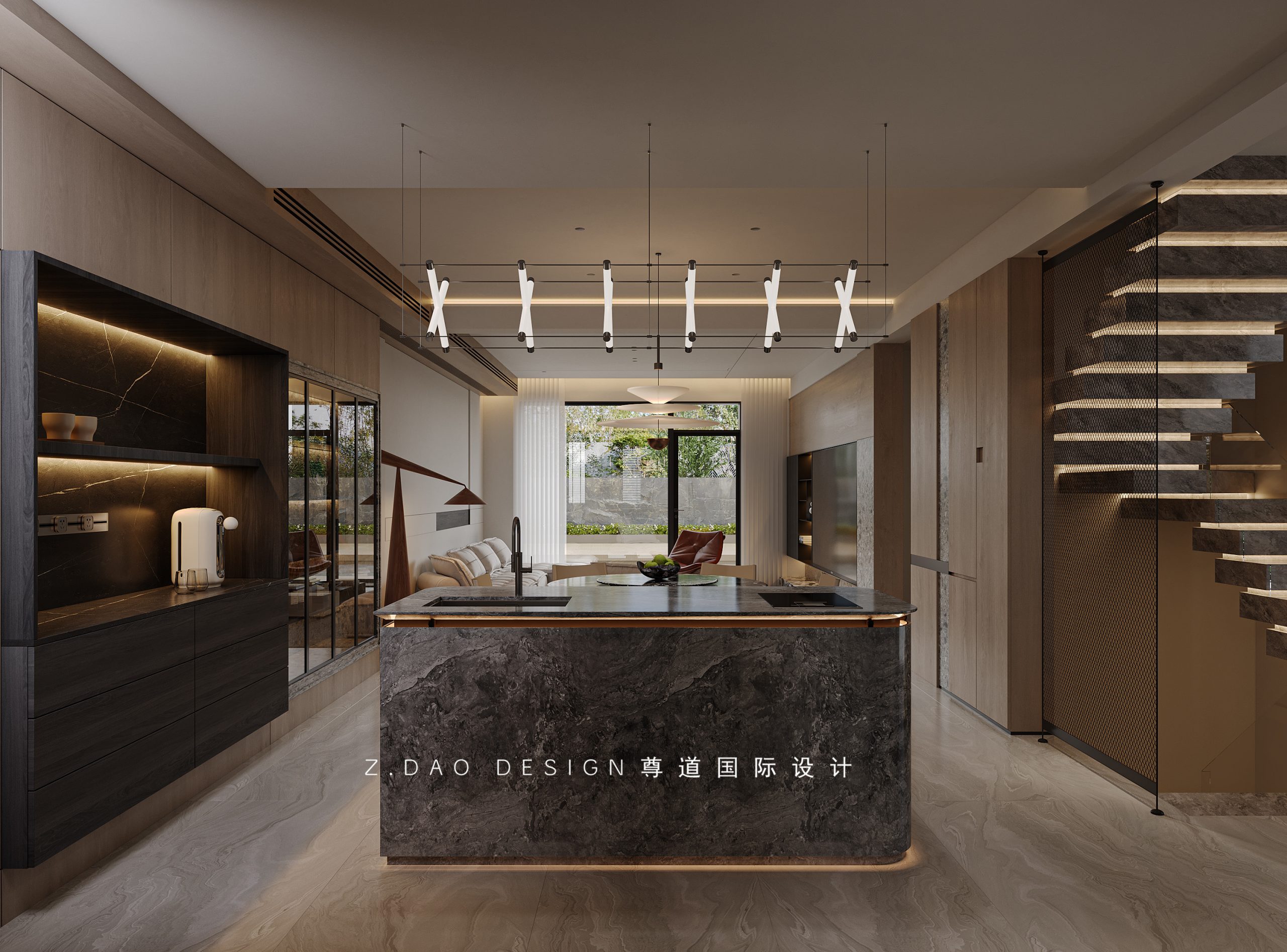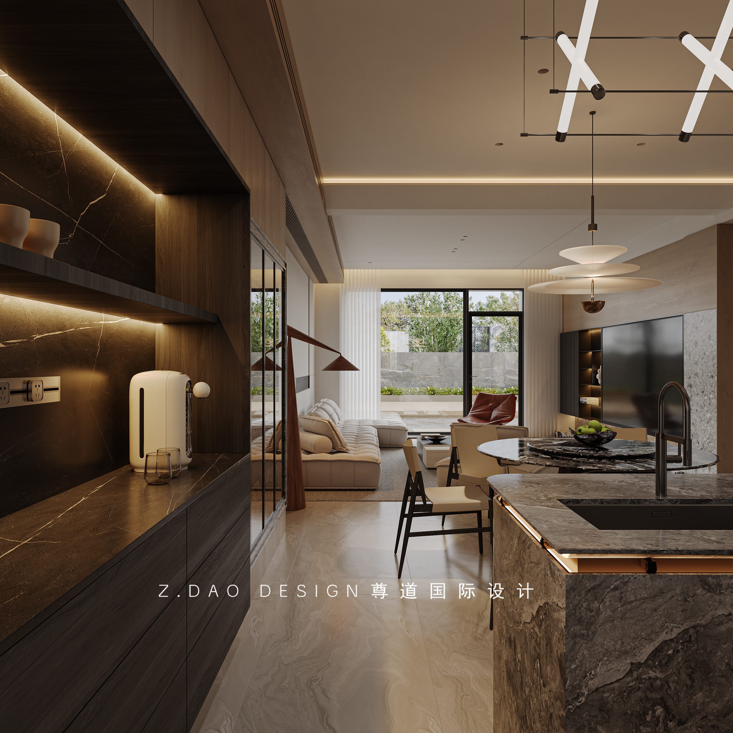 岛台让客厅与过道餐厅与中厨进行了空间分割,既让空间衔接的更流畅,又可以增加台面的使用空间和储物空间,更是西厨到餐厅的一个过渡。