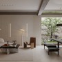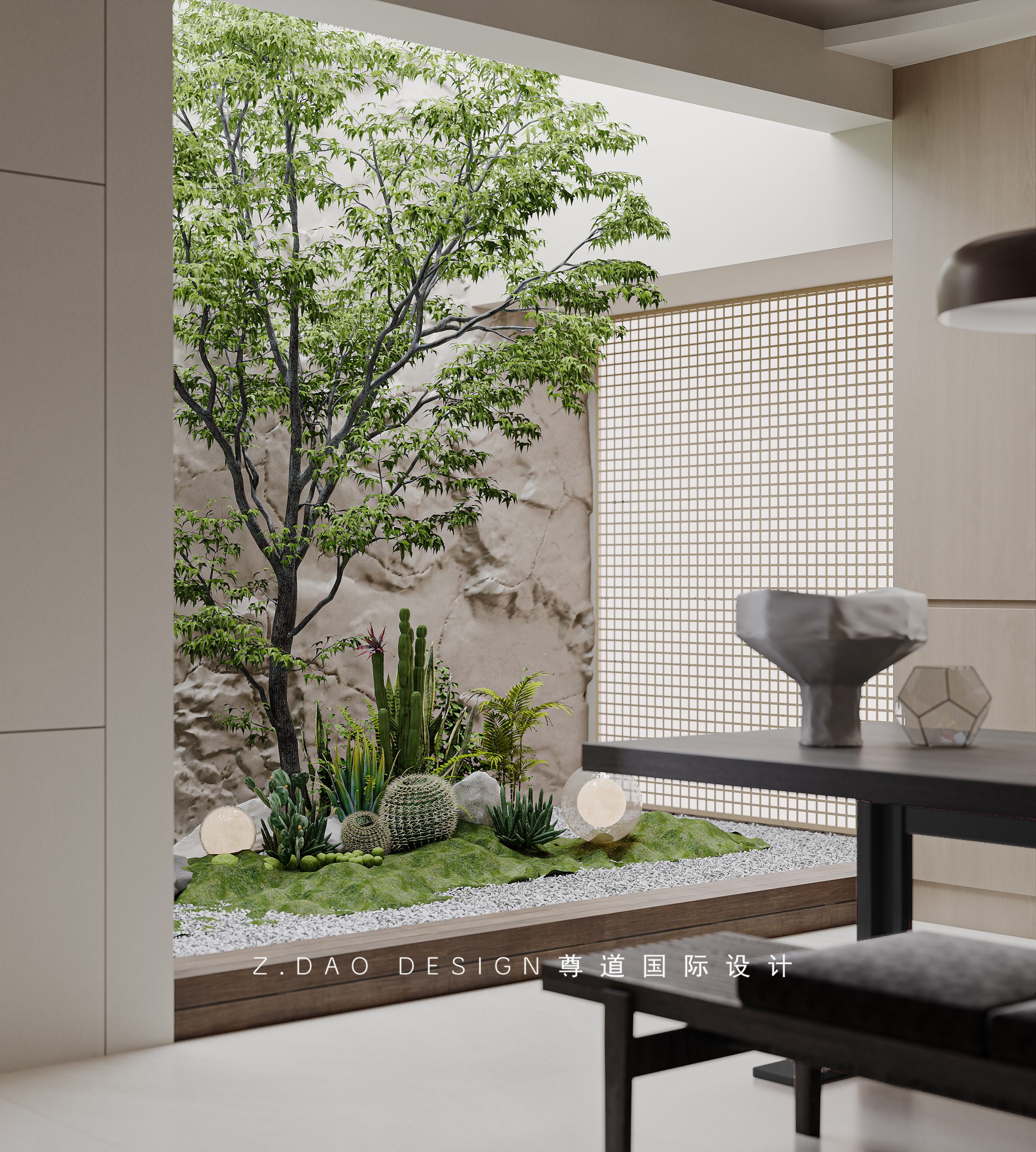 叠式楼梯踏步,采用白色花纹大理石,底部嵌入灯带,有种晶莹剔透的高级感;转角用玻璃围出绿植景观,与天井处造出的一方小景交相辉映,为空间增加了生命力。