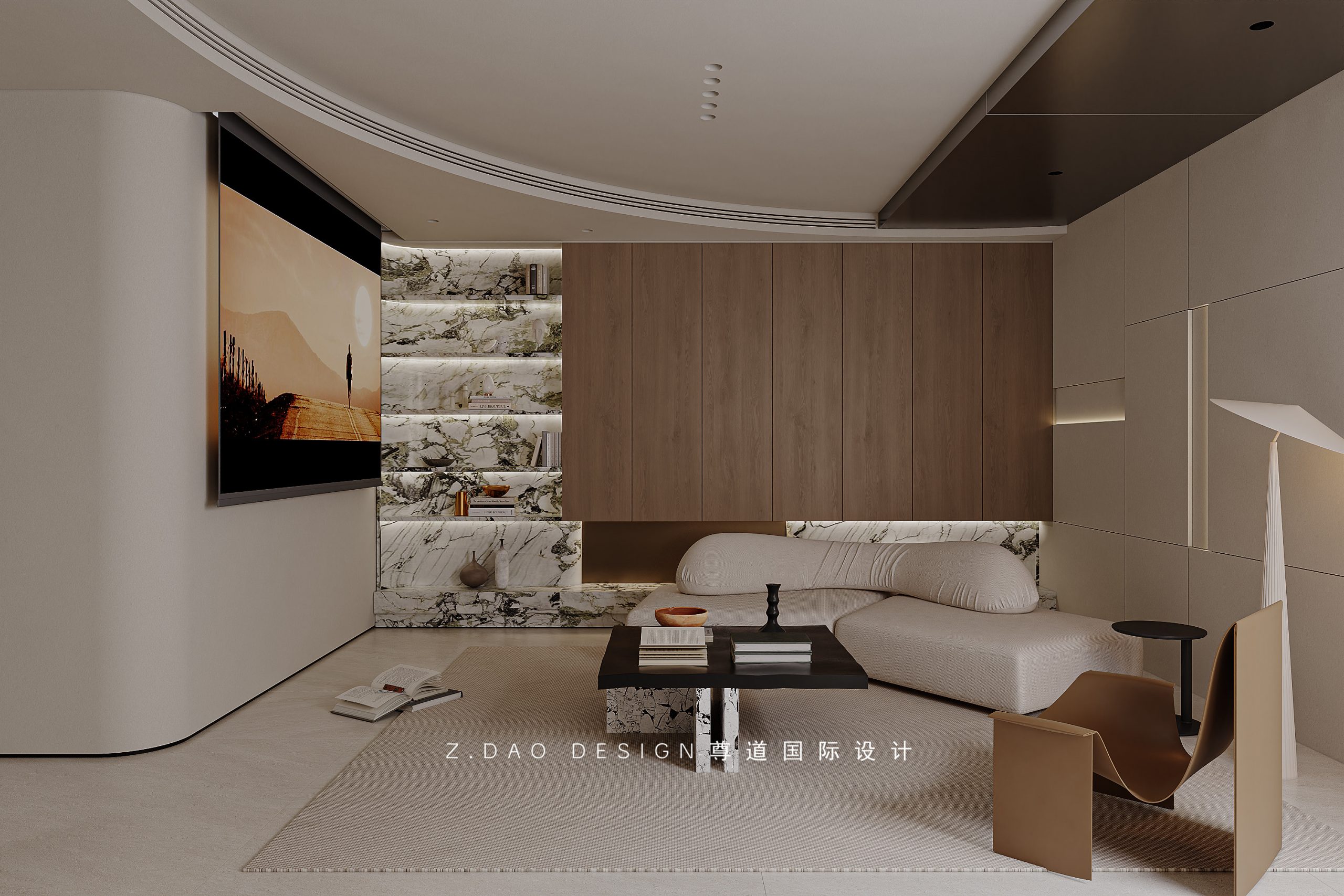 吊顶无主灯设计,弧形的随意性,结合灯带,见光不见灯,将多个点光源和线光源结合起来,营造温馨的舒适感。