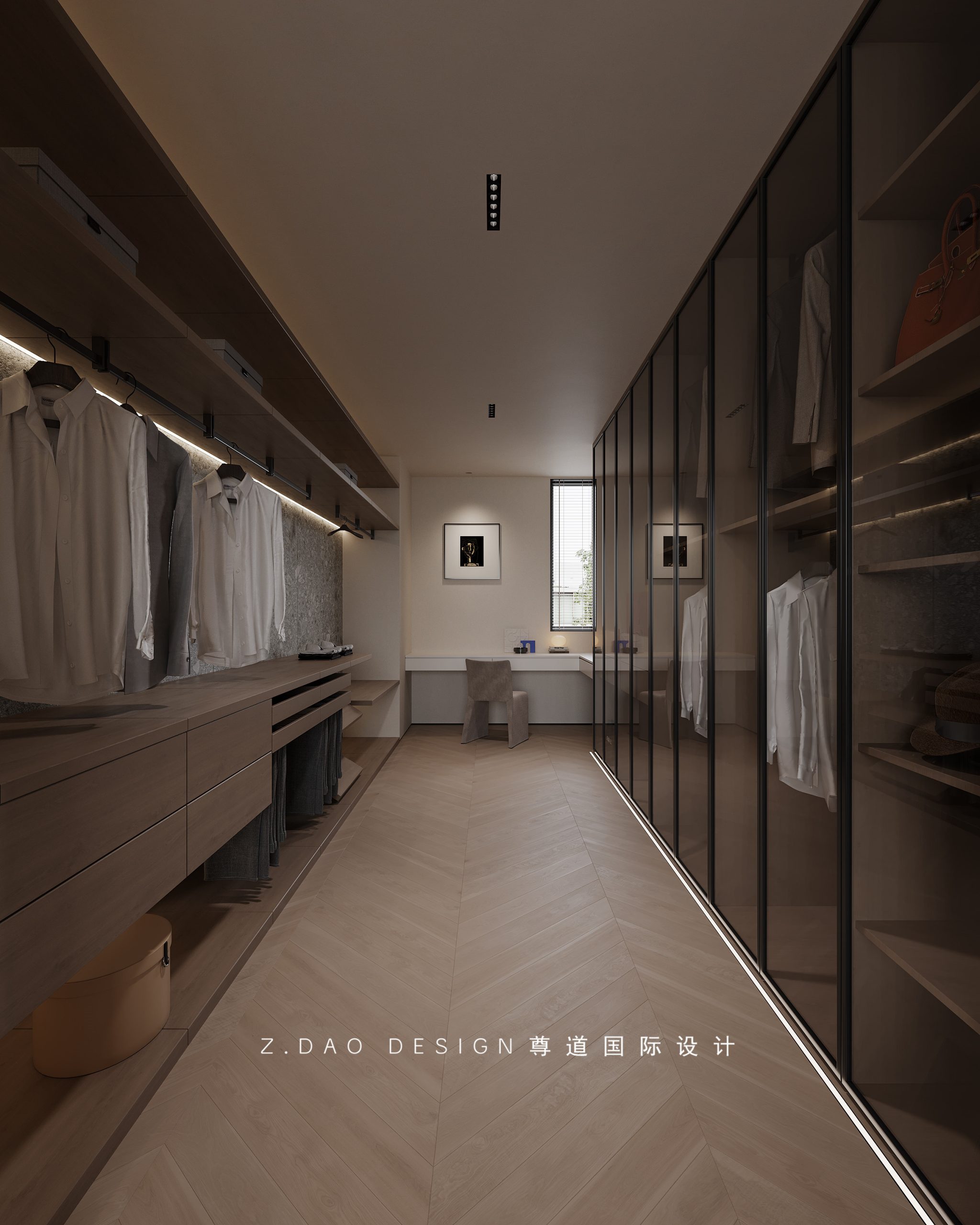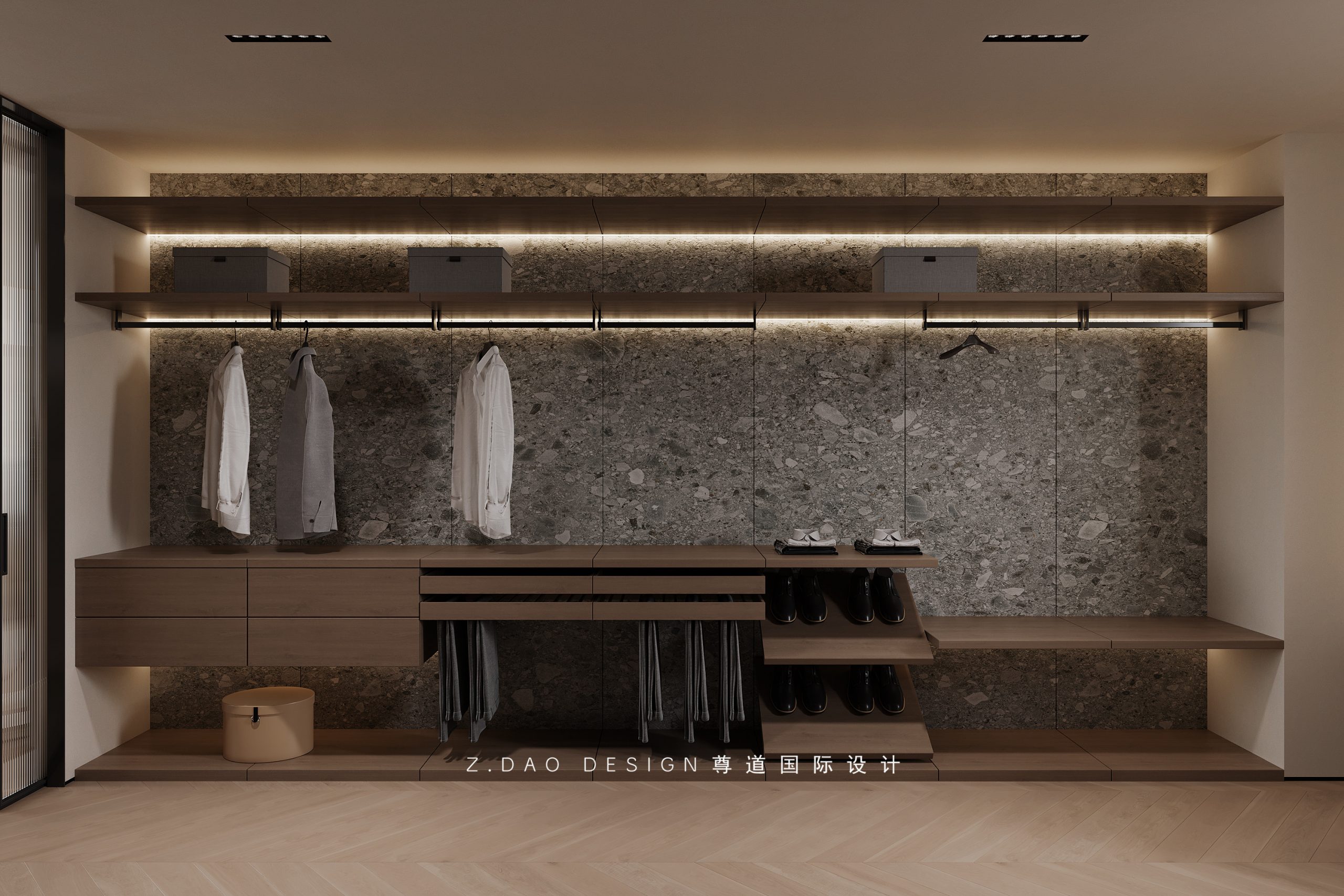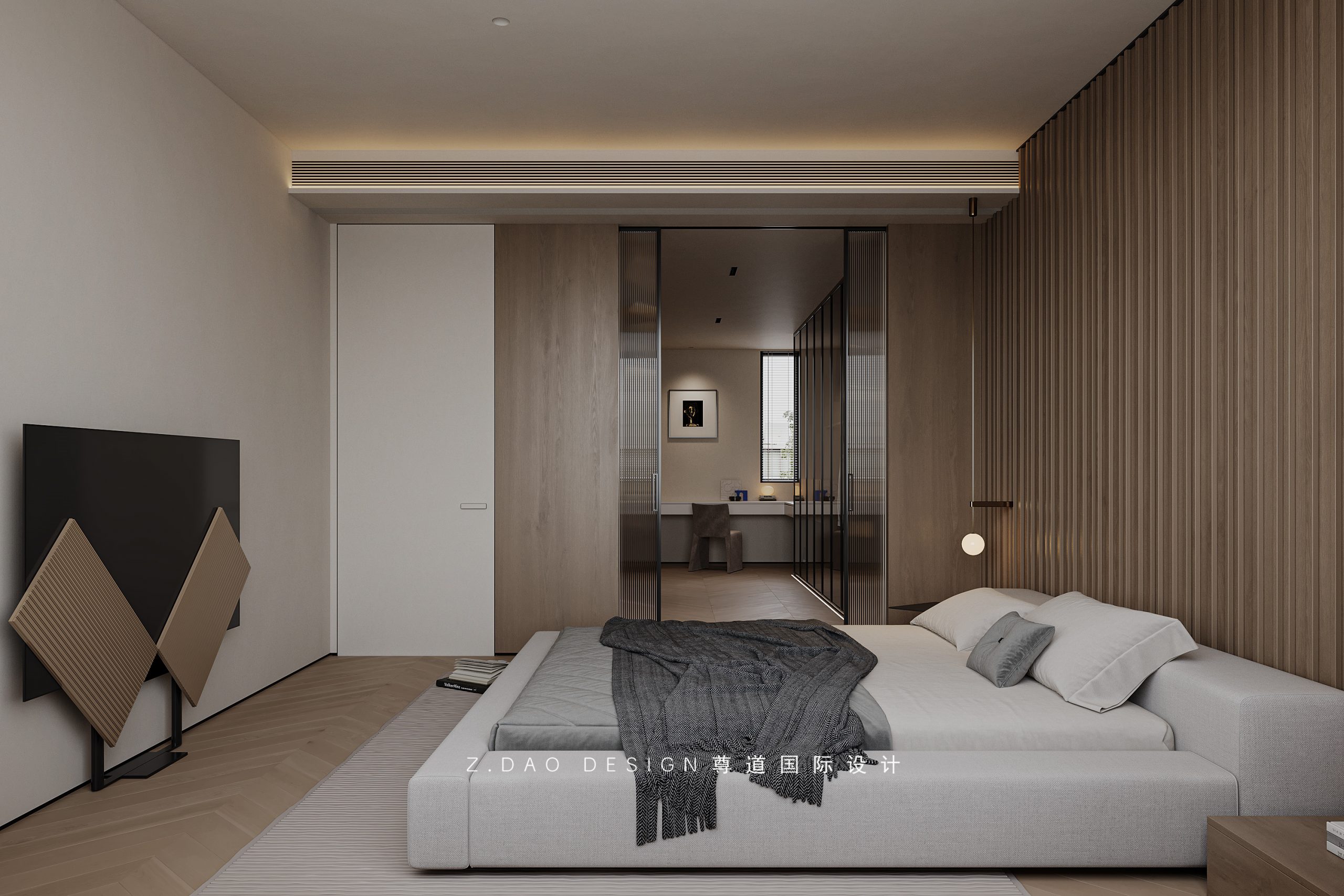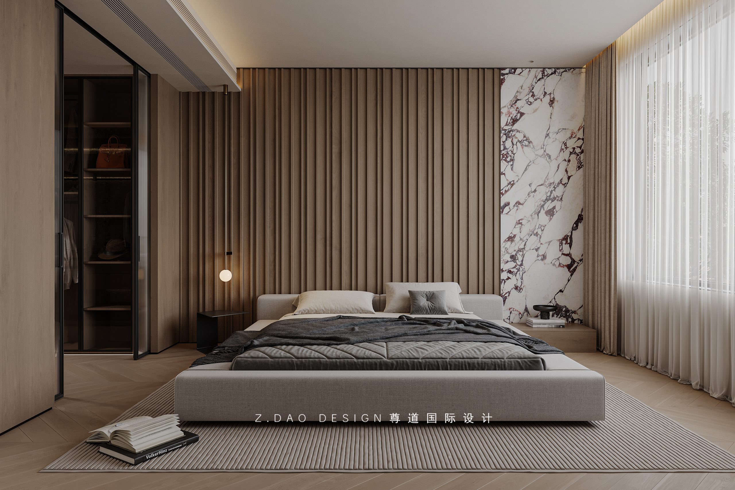 衣柜下方延伸出的柜板与木格栅设计和床头背景进行了联动,强化了整体材质的细节质感,让空间更具层次和艺术感。