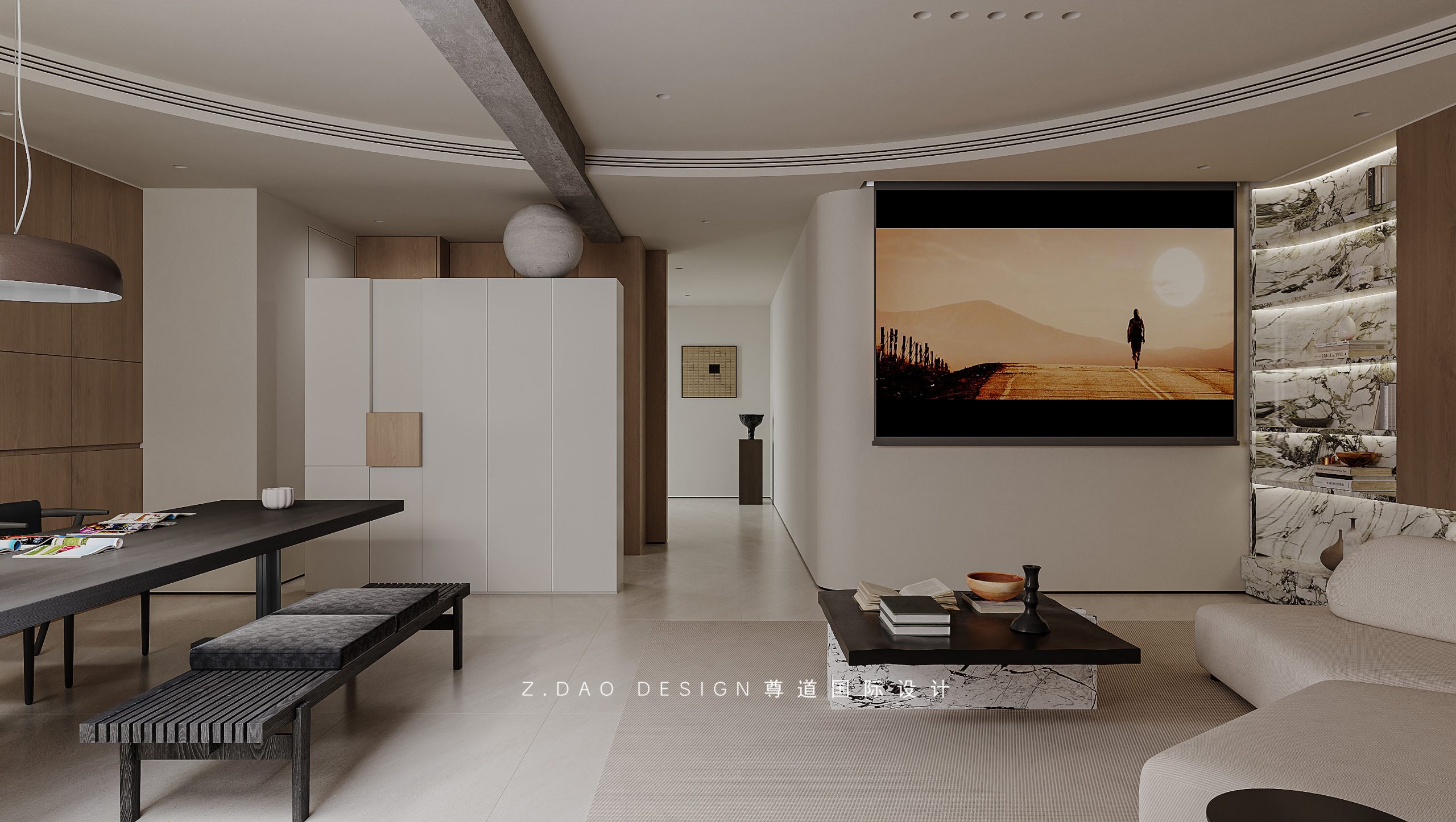 有藏有露的书柜设计,用内嵌灯带点缀其中,可用来收藏大量书籍也能用来展示收藏性的艺术品;超大幕布,在家实现观影自由。