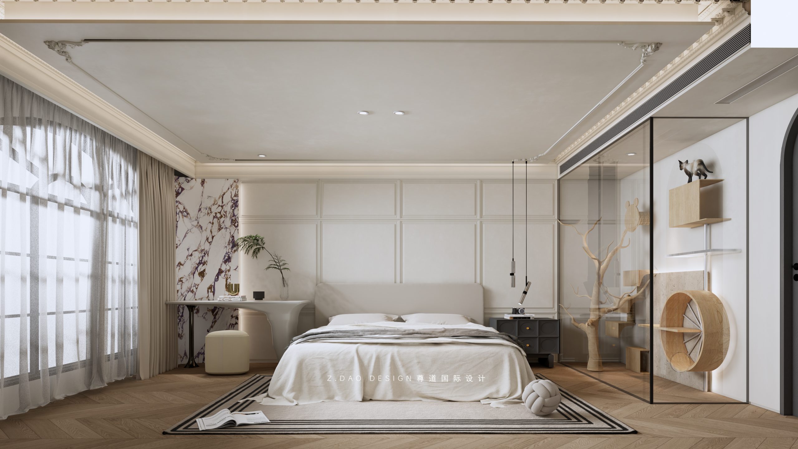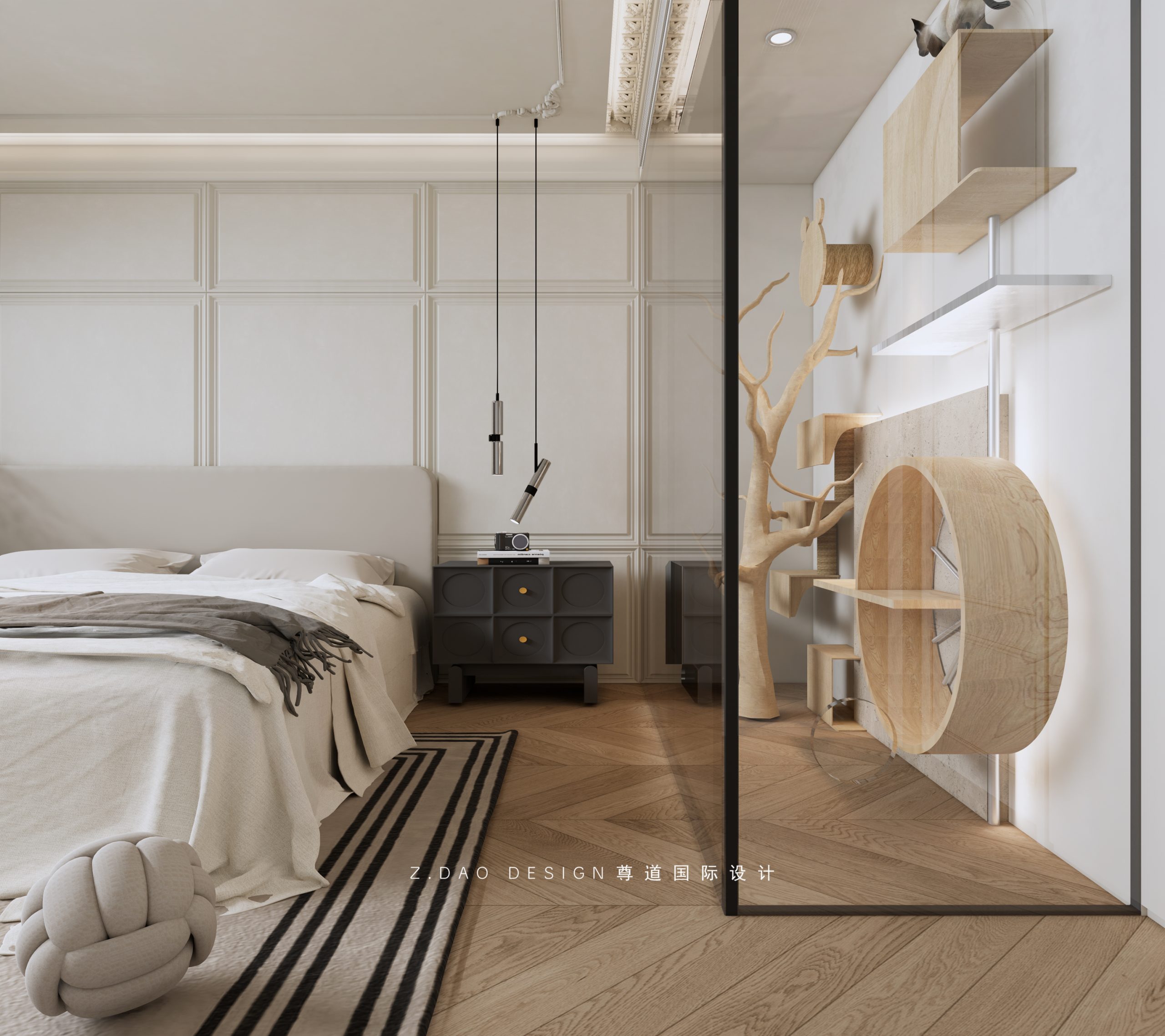 大女儿特别喜欢猫咪,为了增加陪伴和互动,就在房间设计了玻璃猫房;猫咪喜欢攀爬和跳跃,猫墙可以充分发挥他们的潜能,满足它们玩耍的需求。