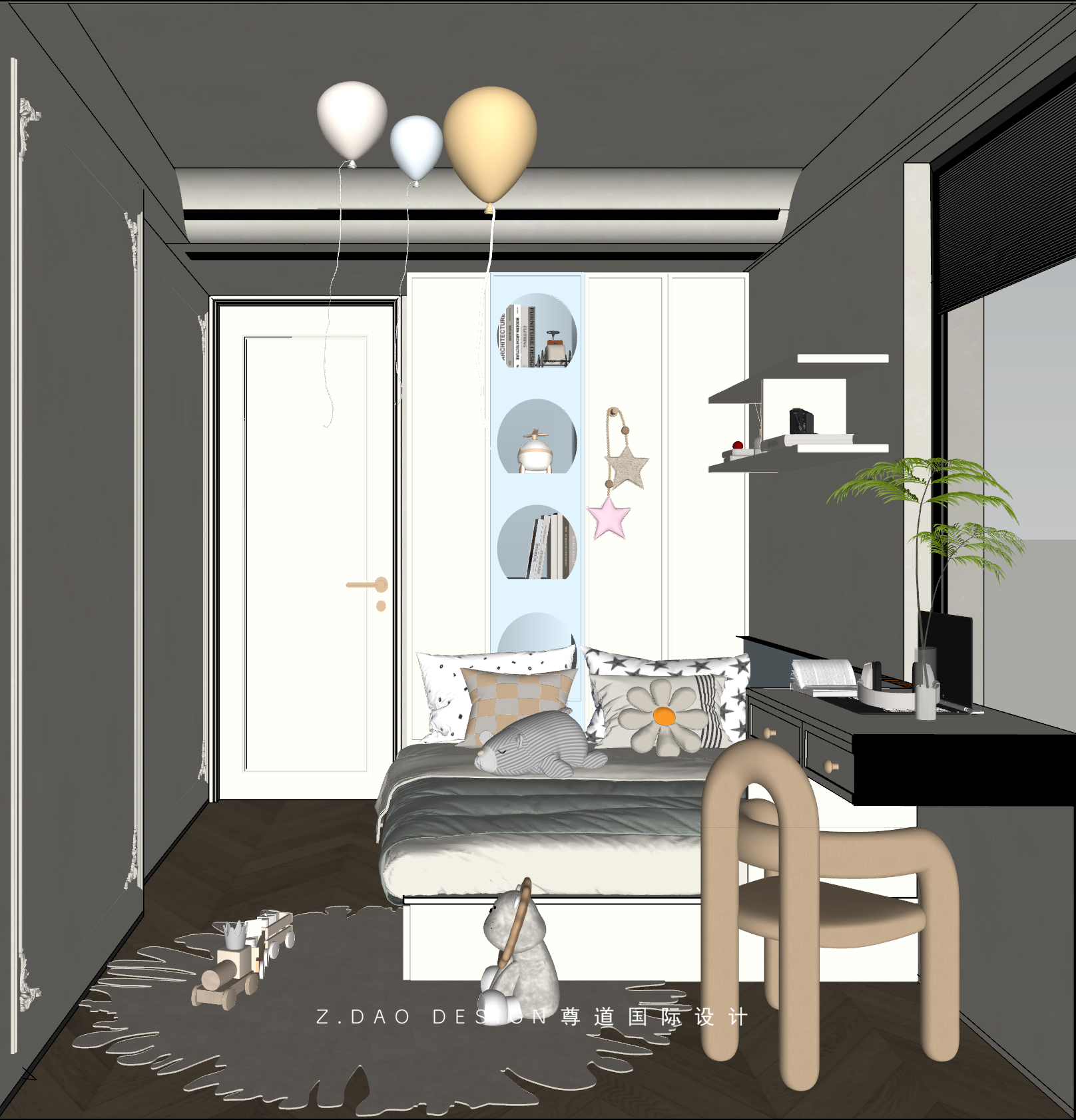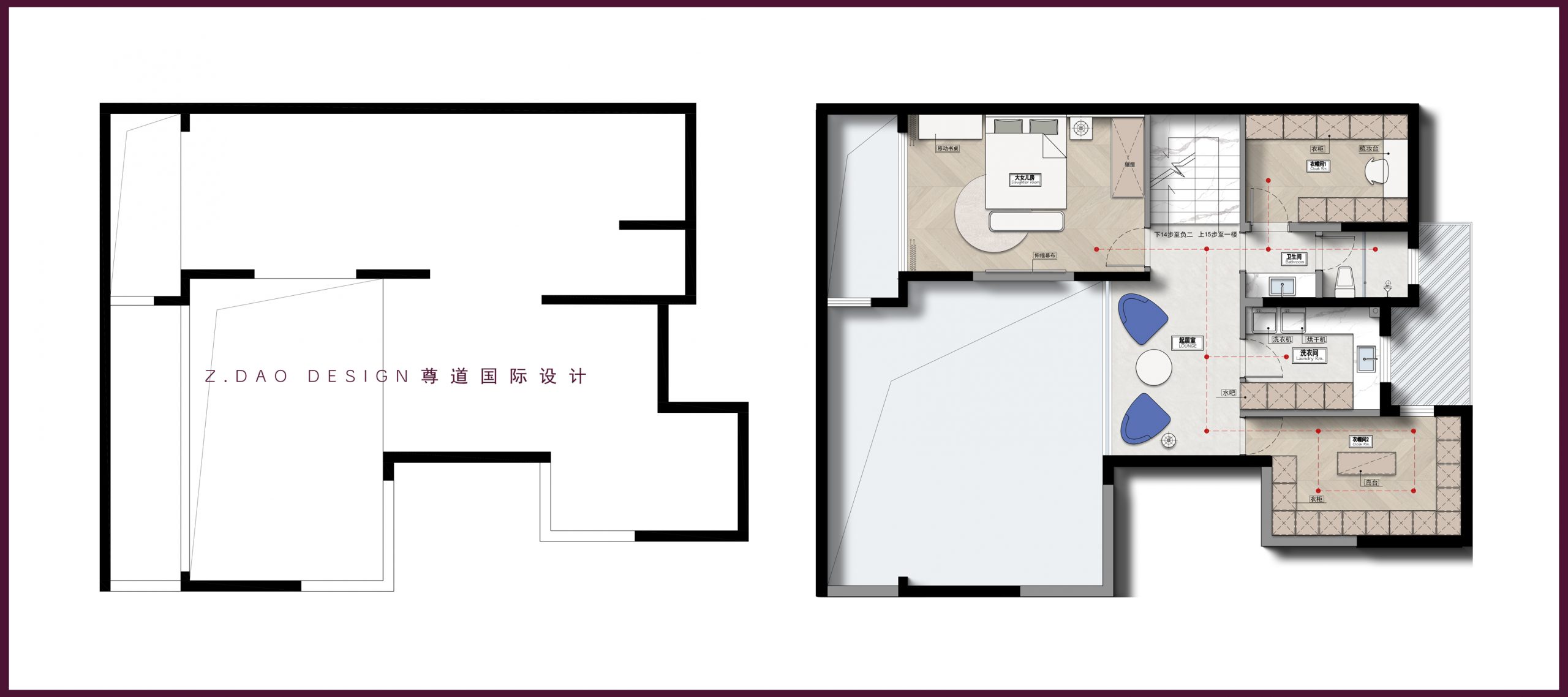 2、为女儿房设计独立卫生间衣帽间。