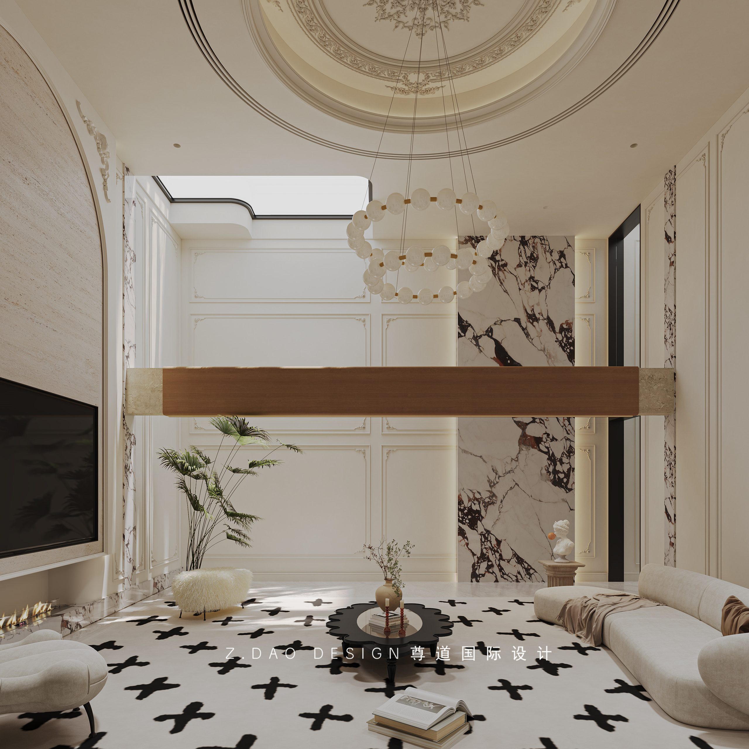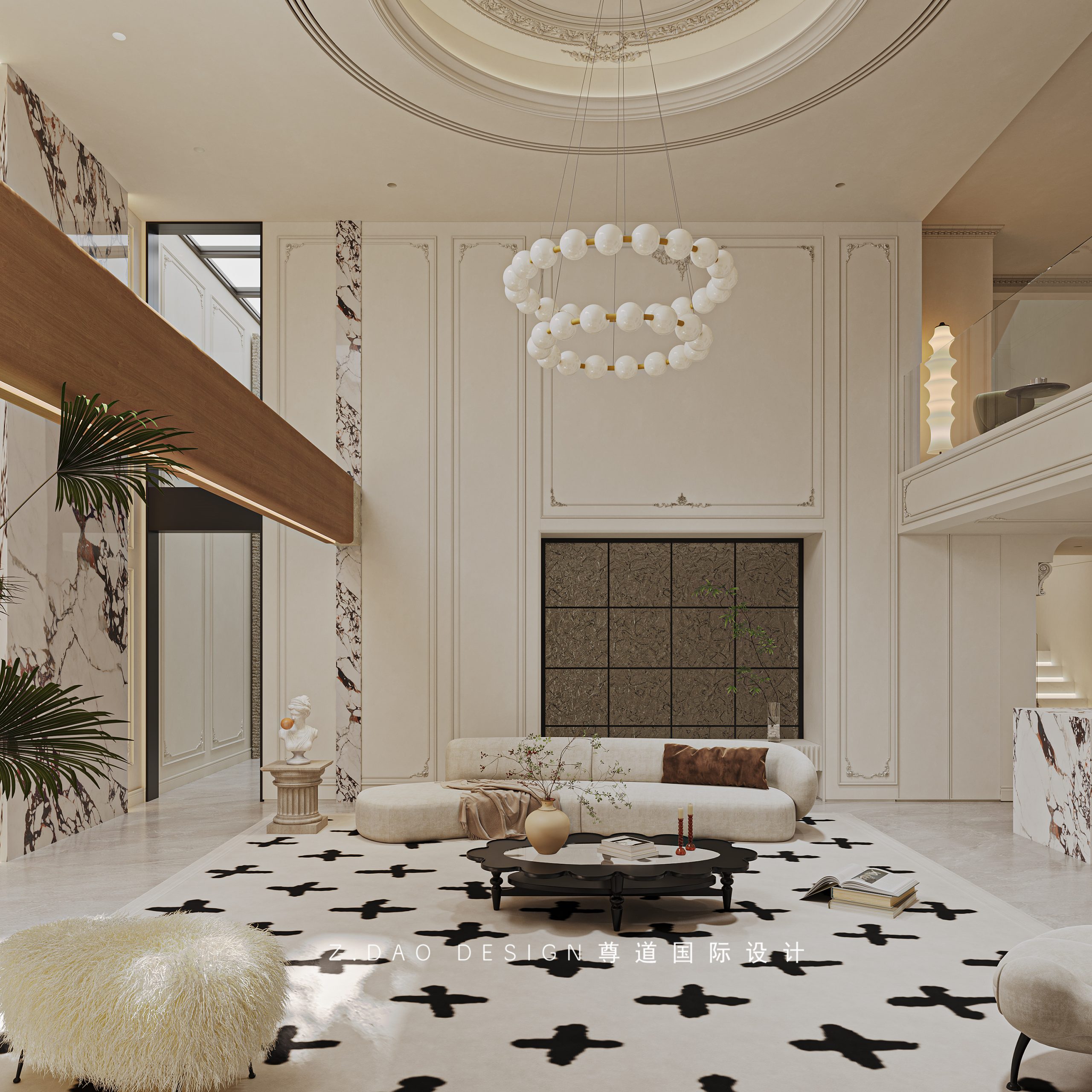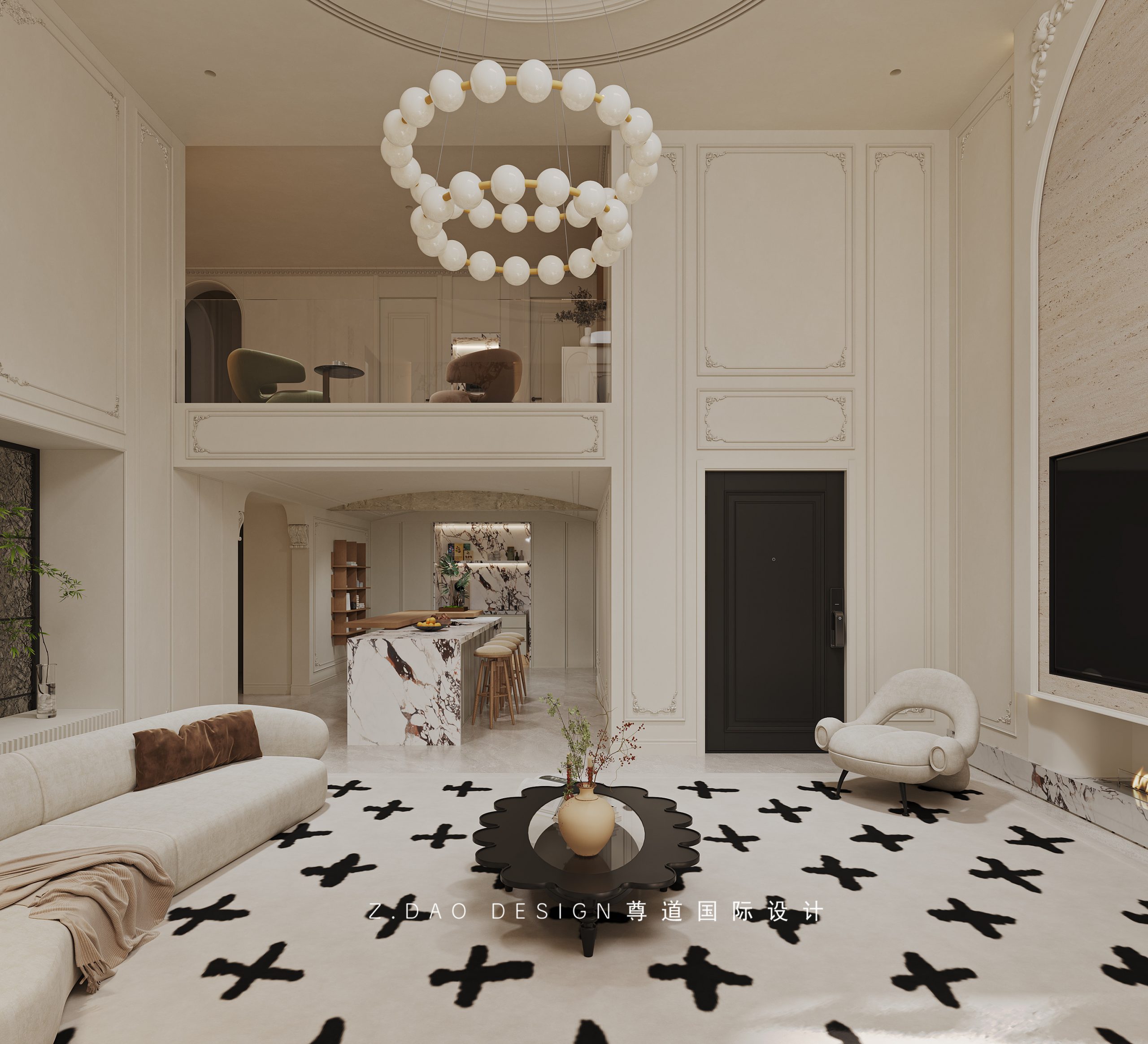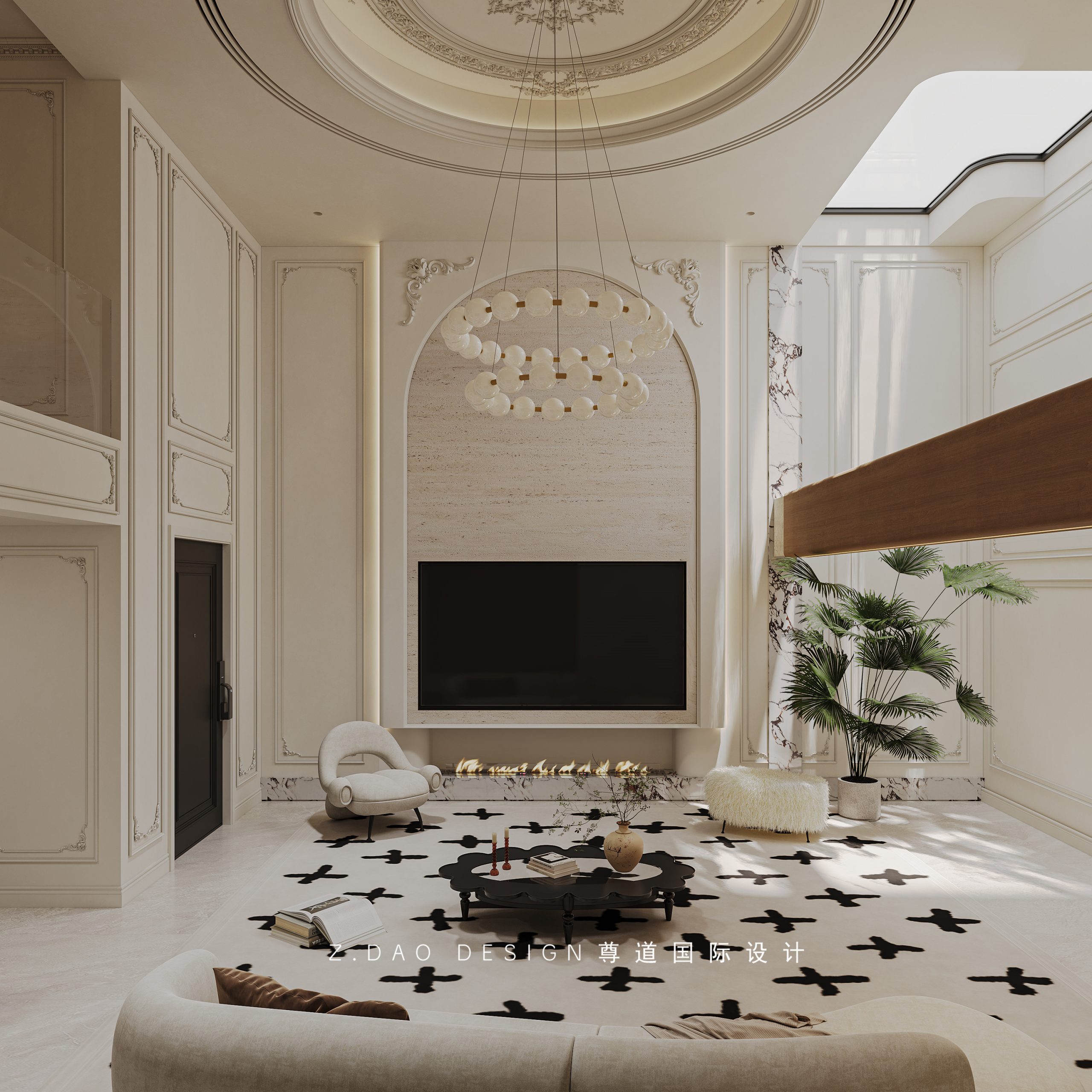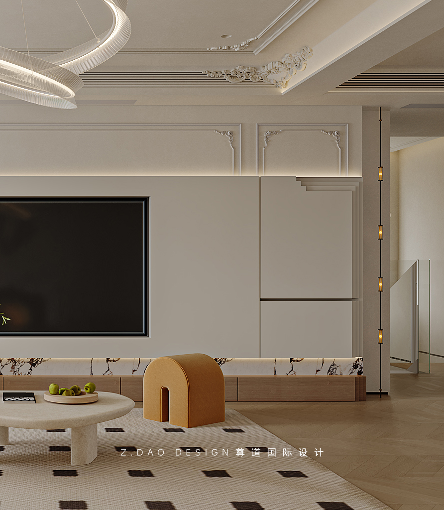 挑空区选用圆形吊顶,搭配精致优雅的雕花灯盘,将法式风格的大气展现的淋漓尽致。