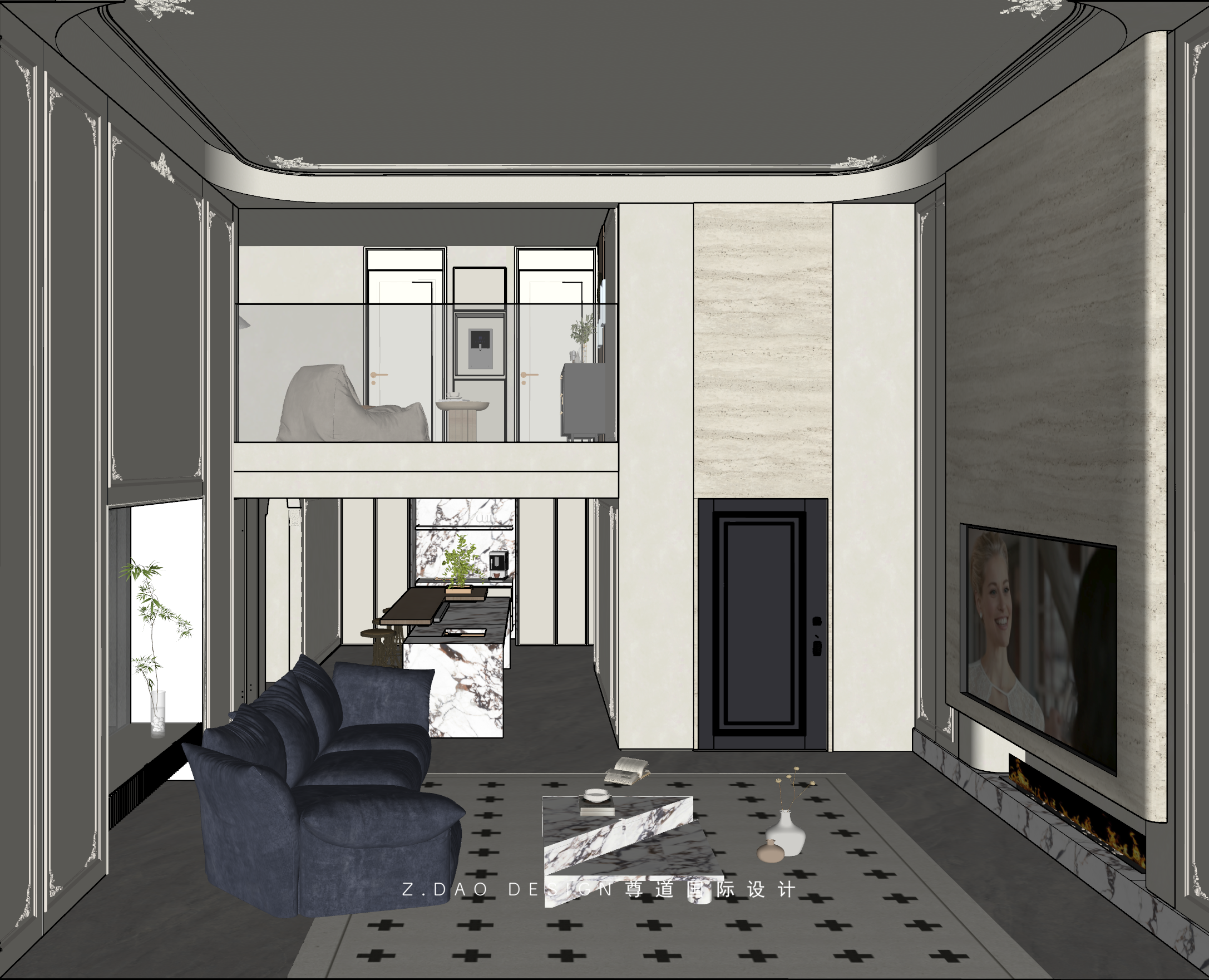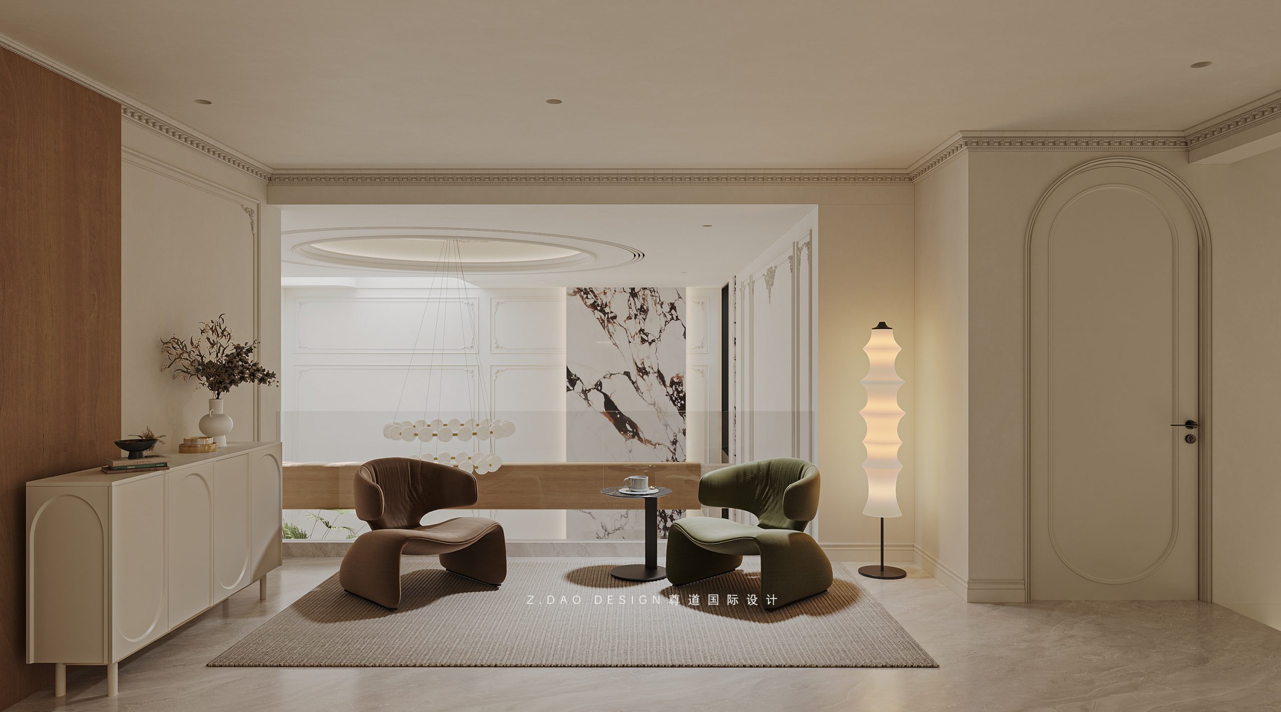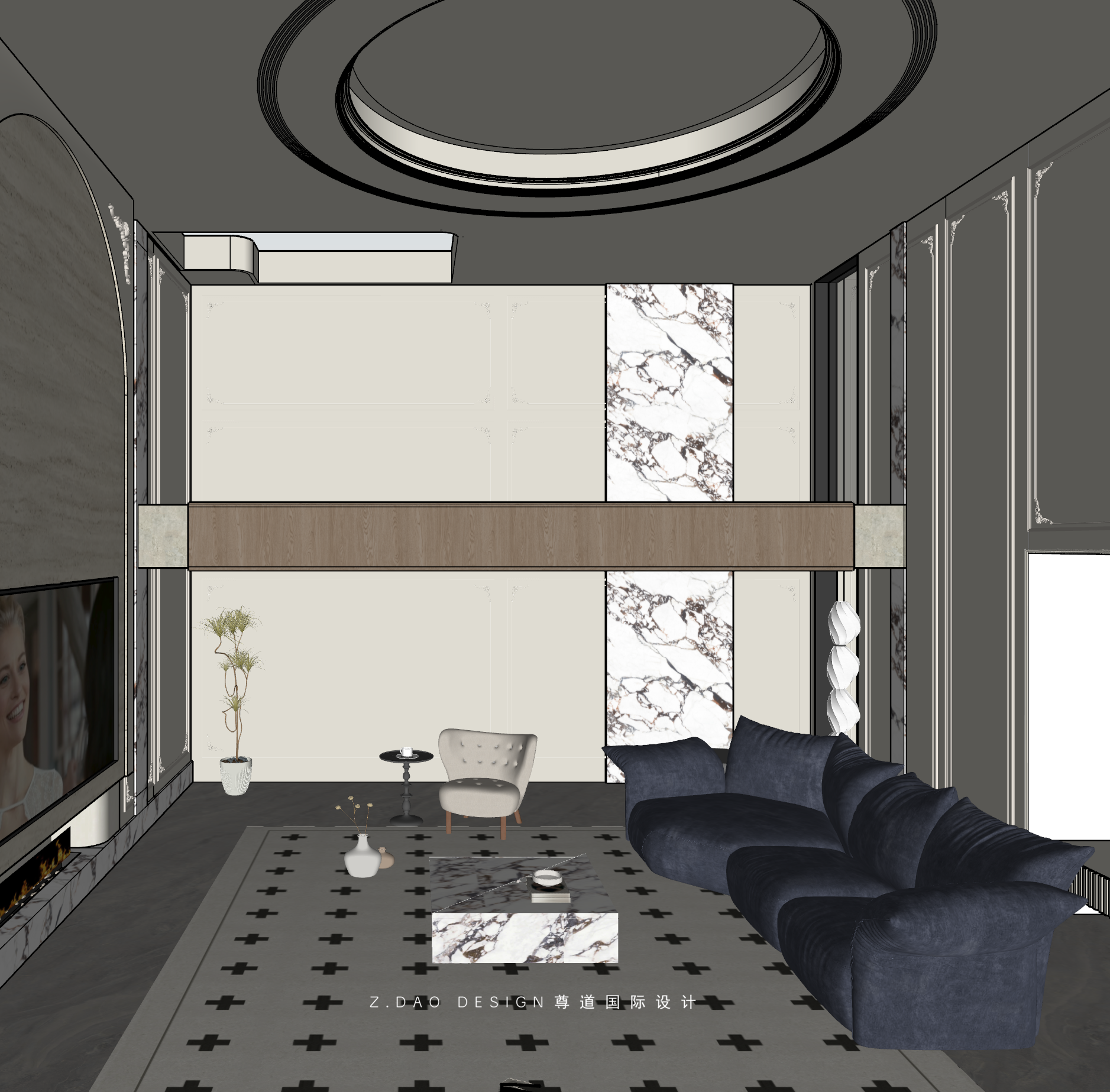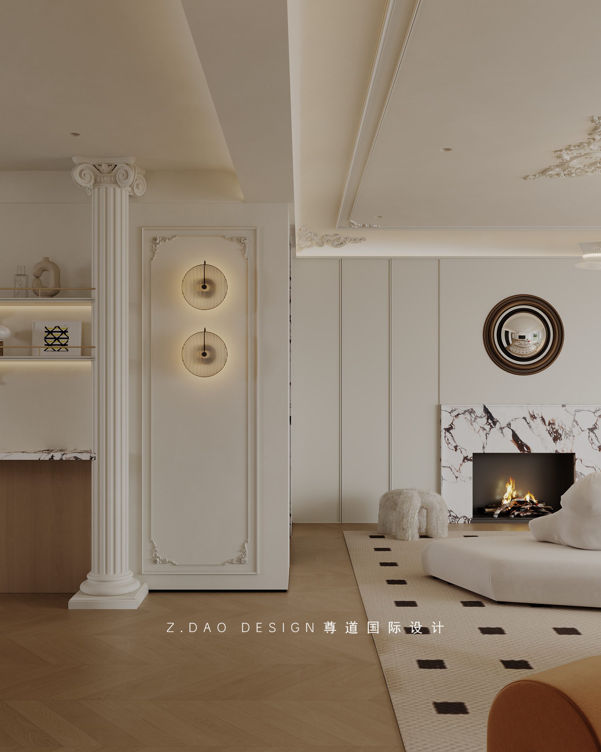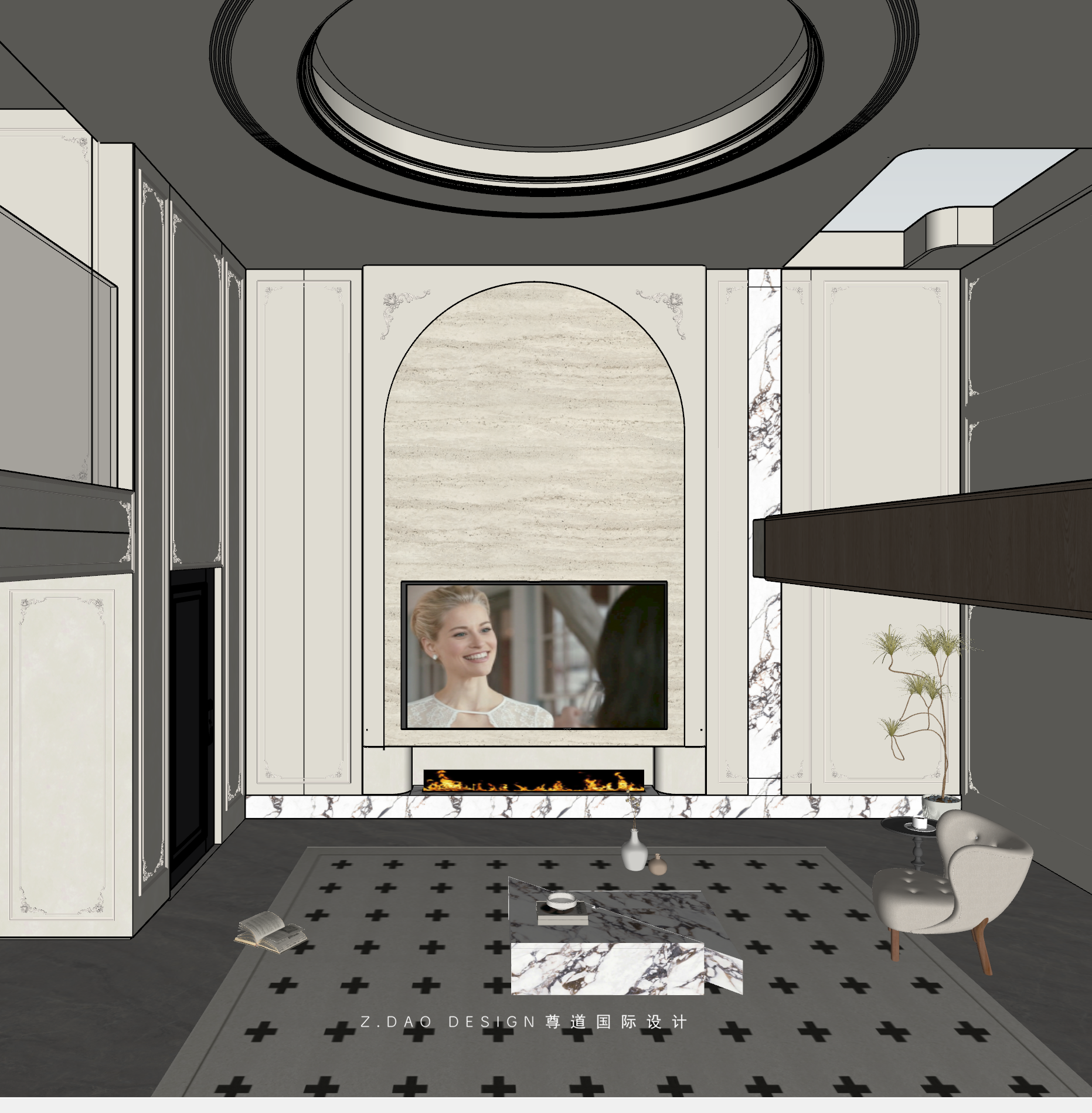挑空区选用圆形吊顶,搭配精致优雅的雕花灯盘,将法式风格的大气展现的淋漓尽致。