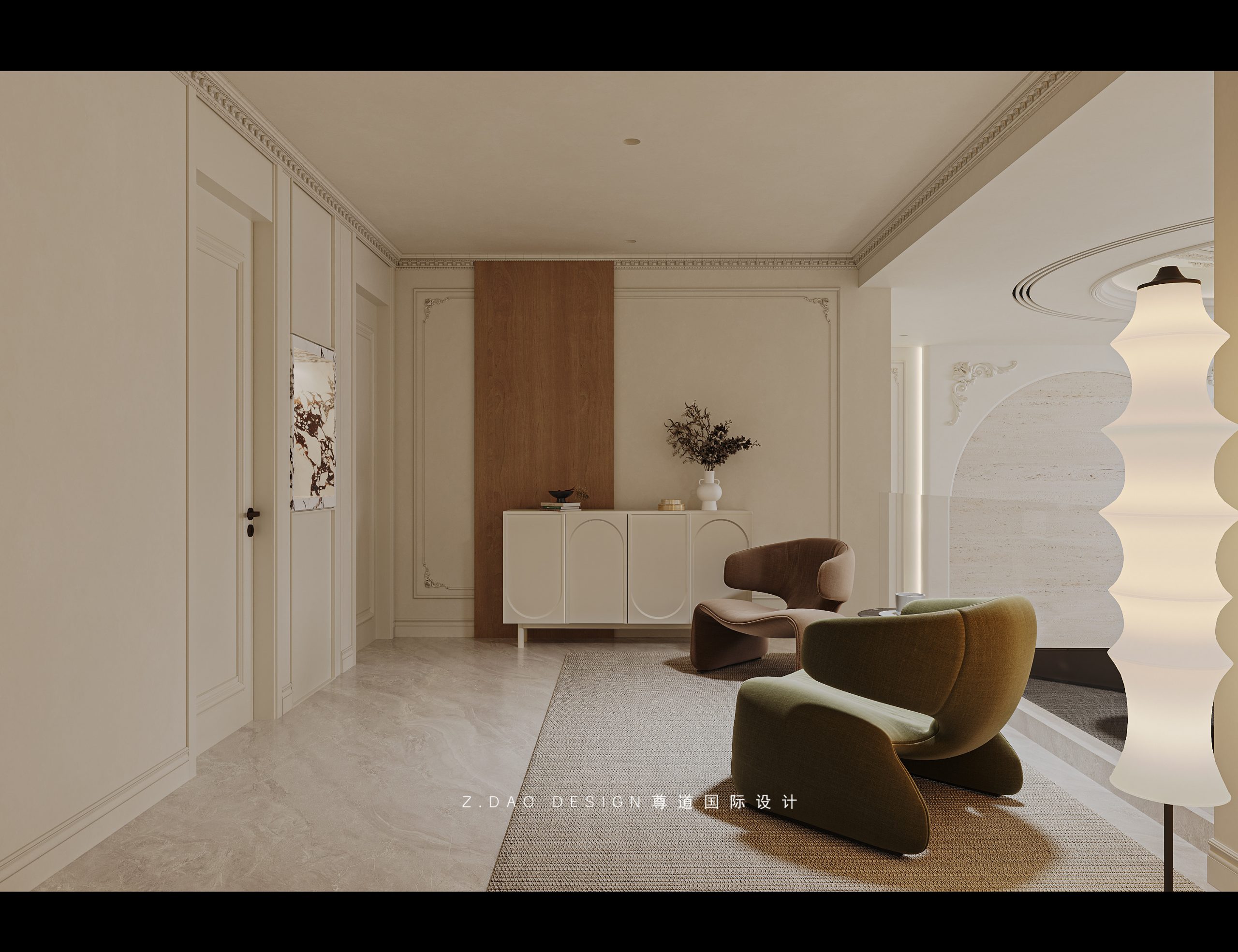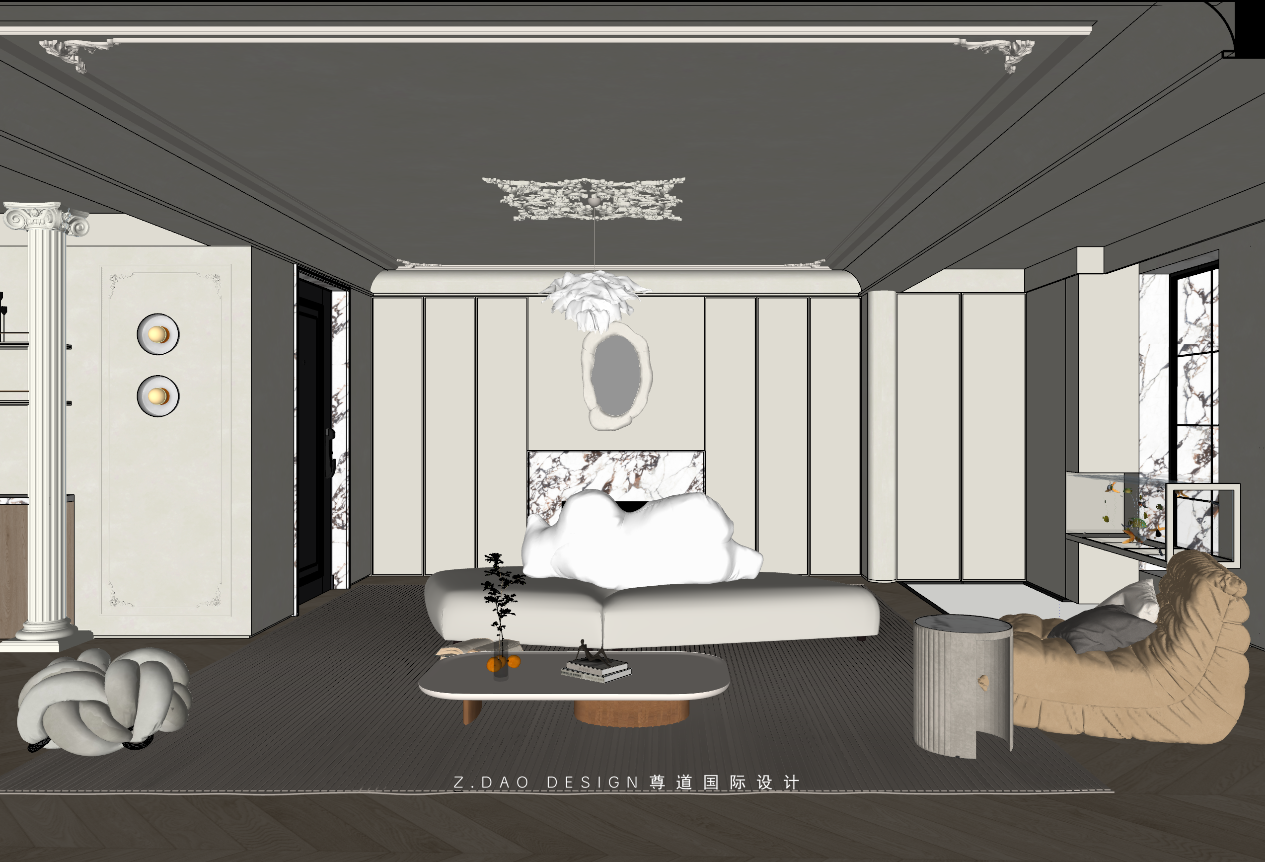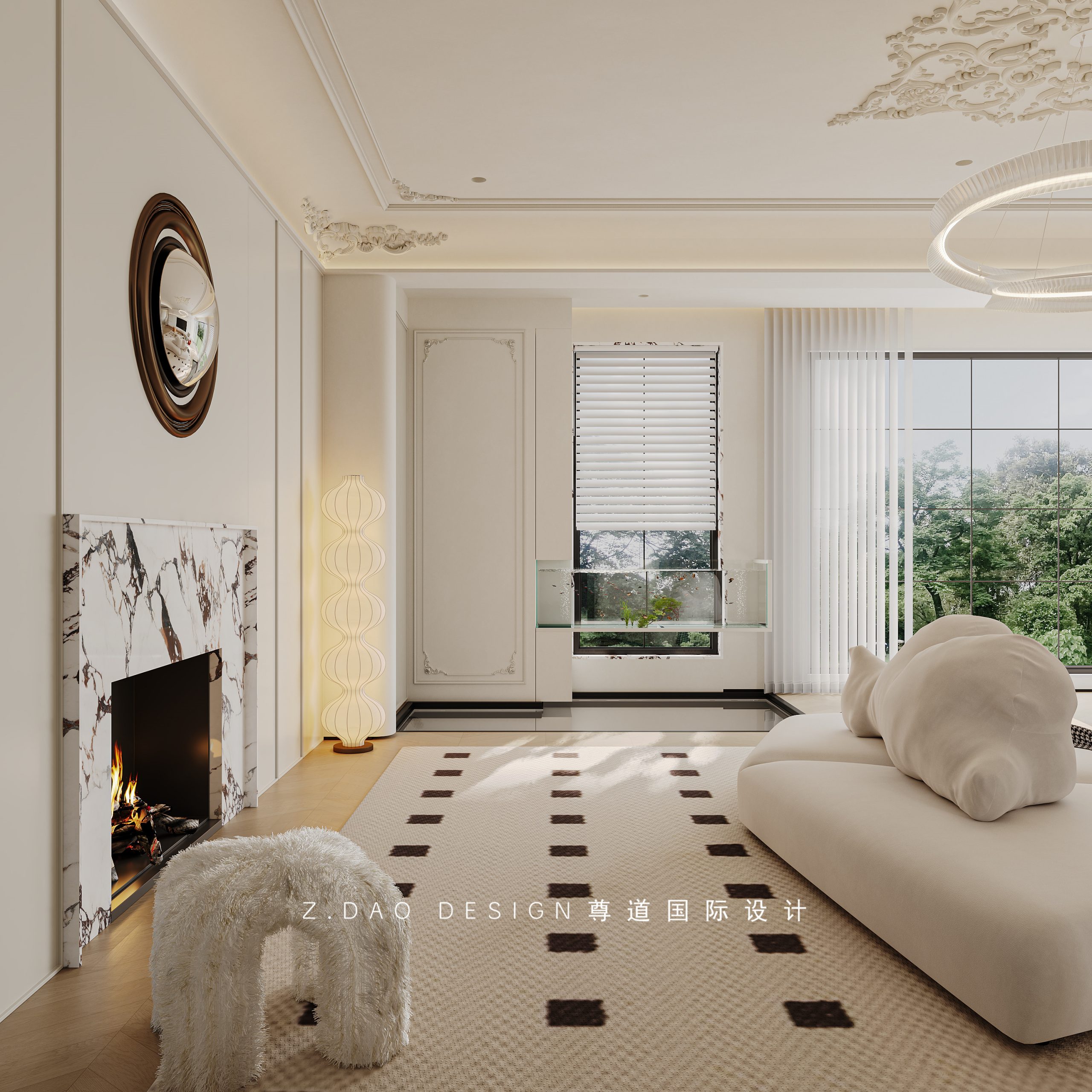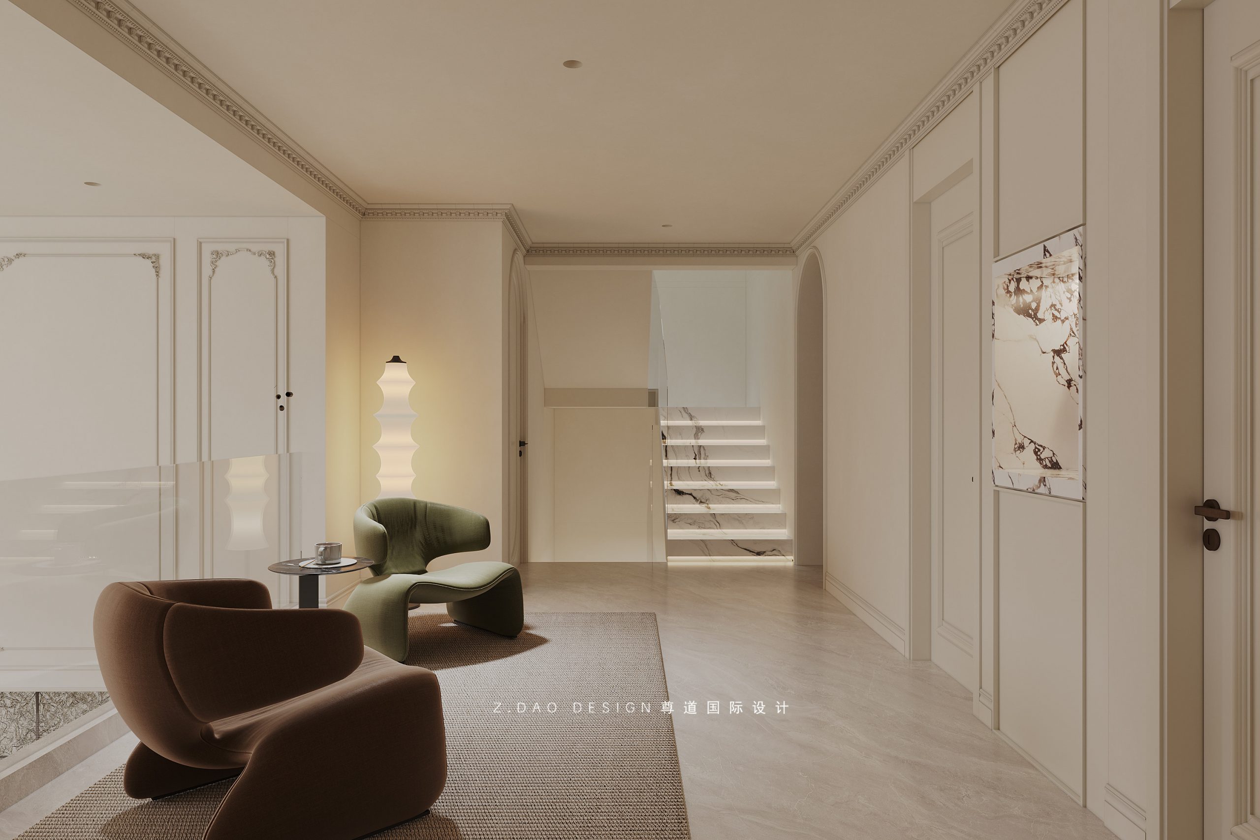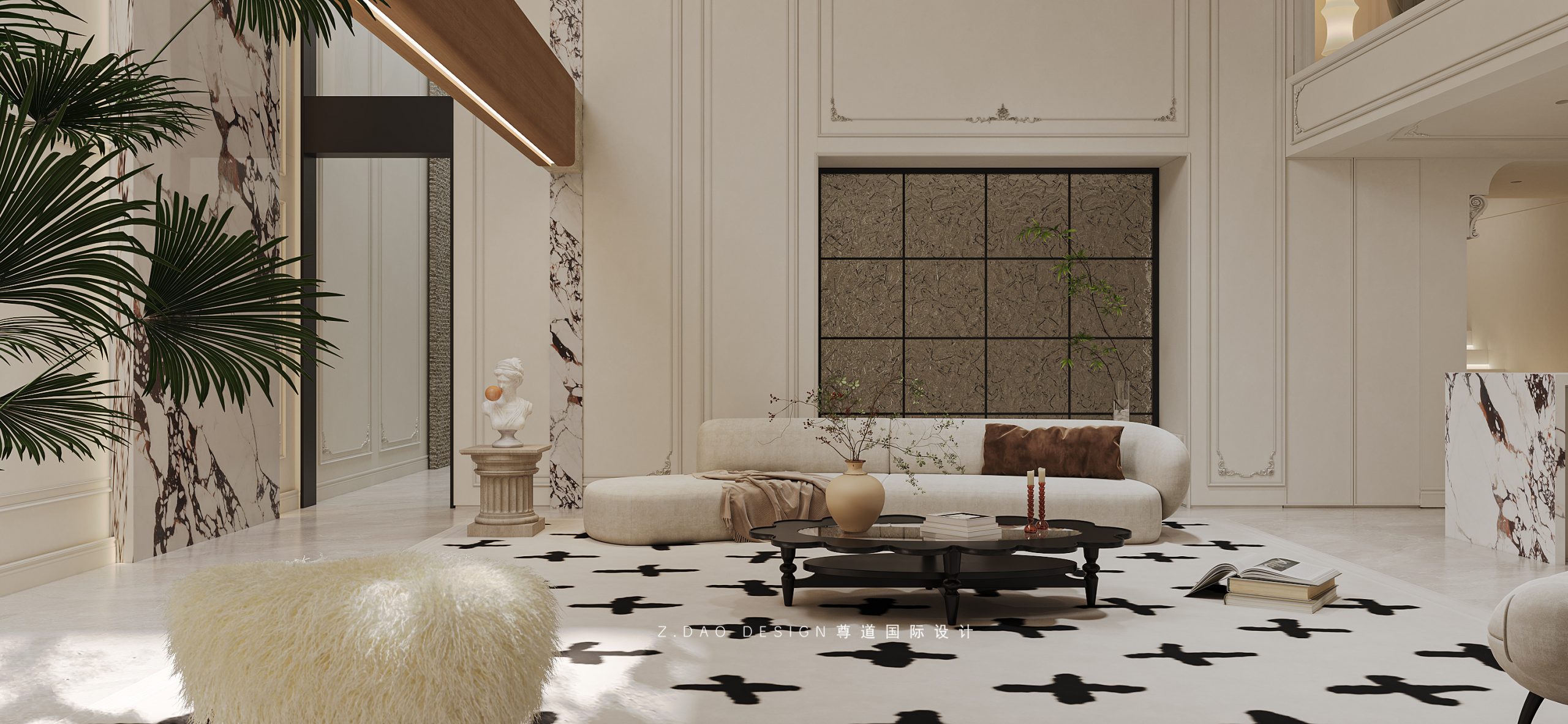 挑空区选用圆形吊顶,搭配精致优雅的雕花灯盘,将法式风格的大气展现的淋漓尽致。