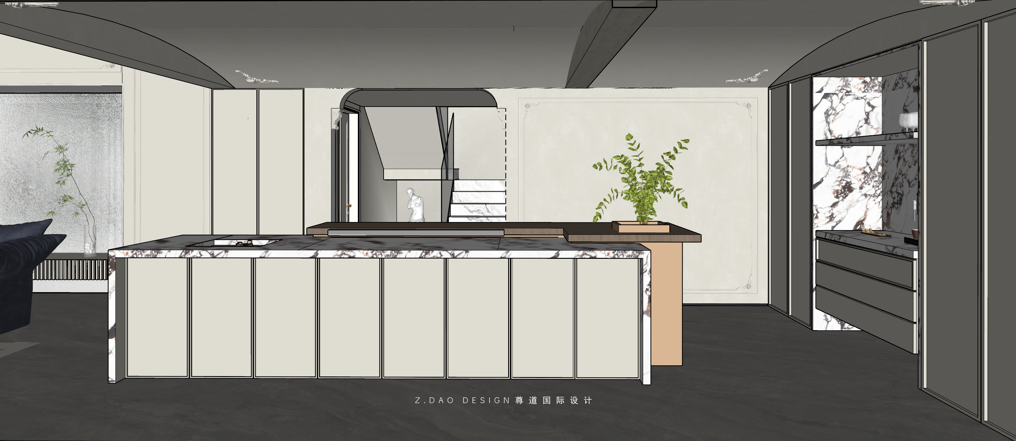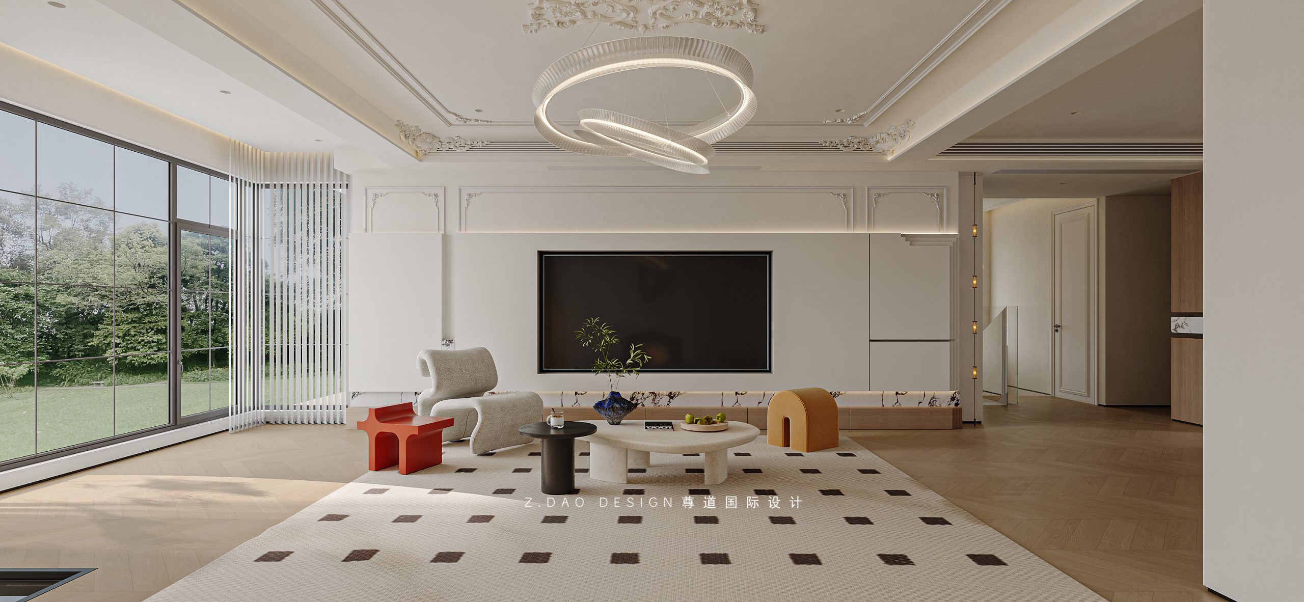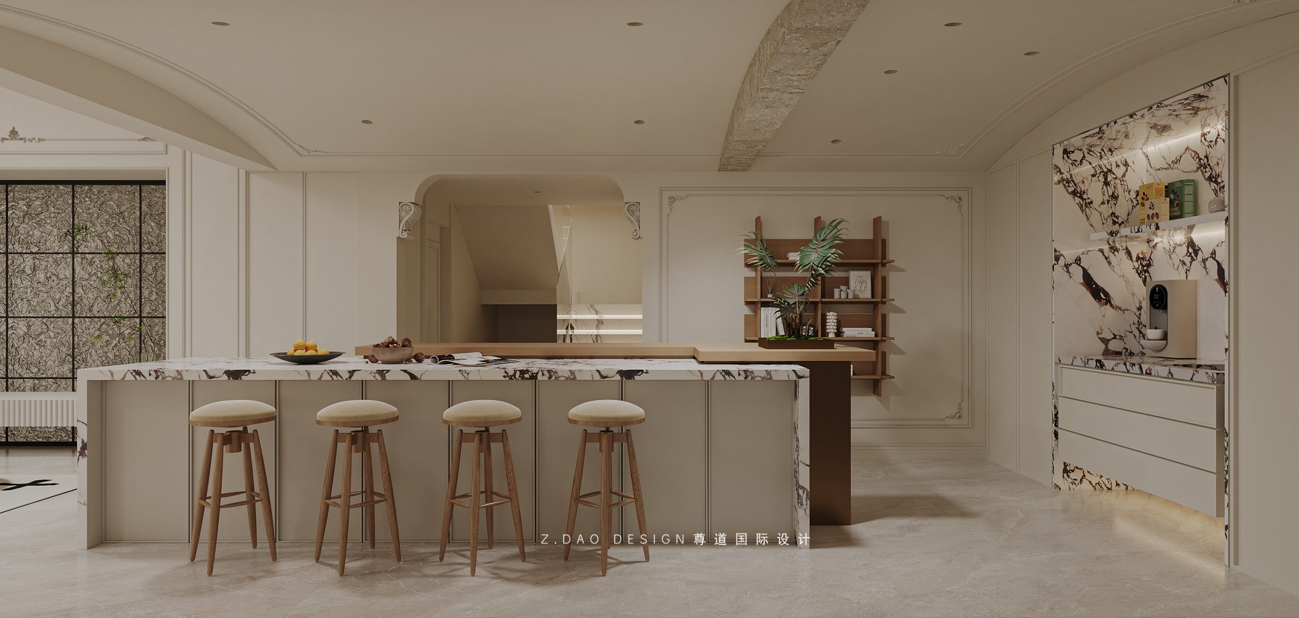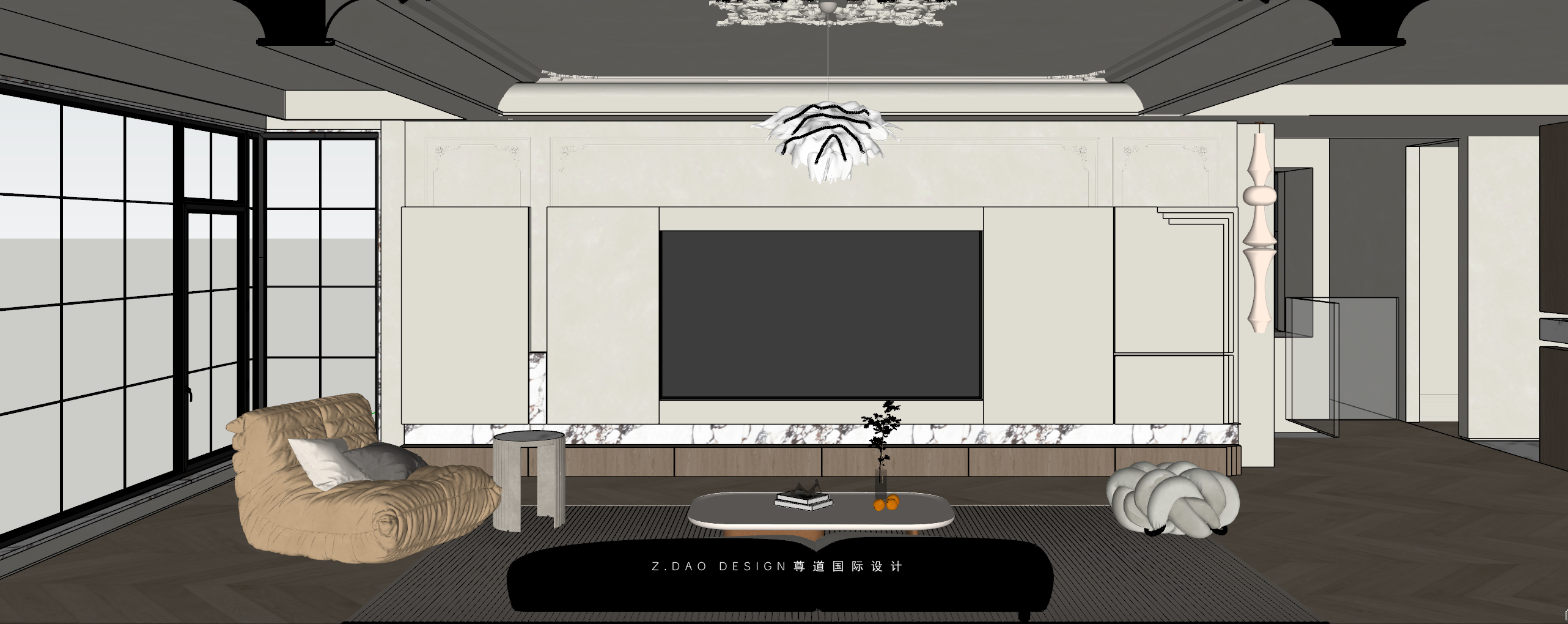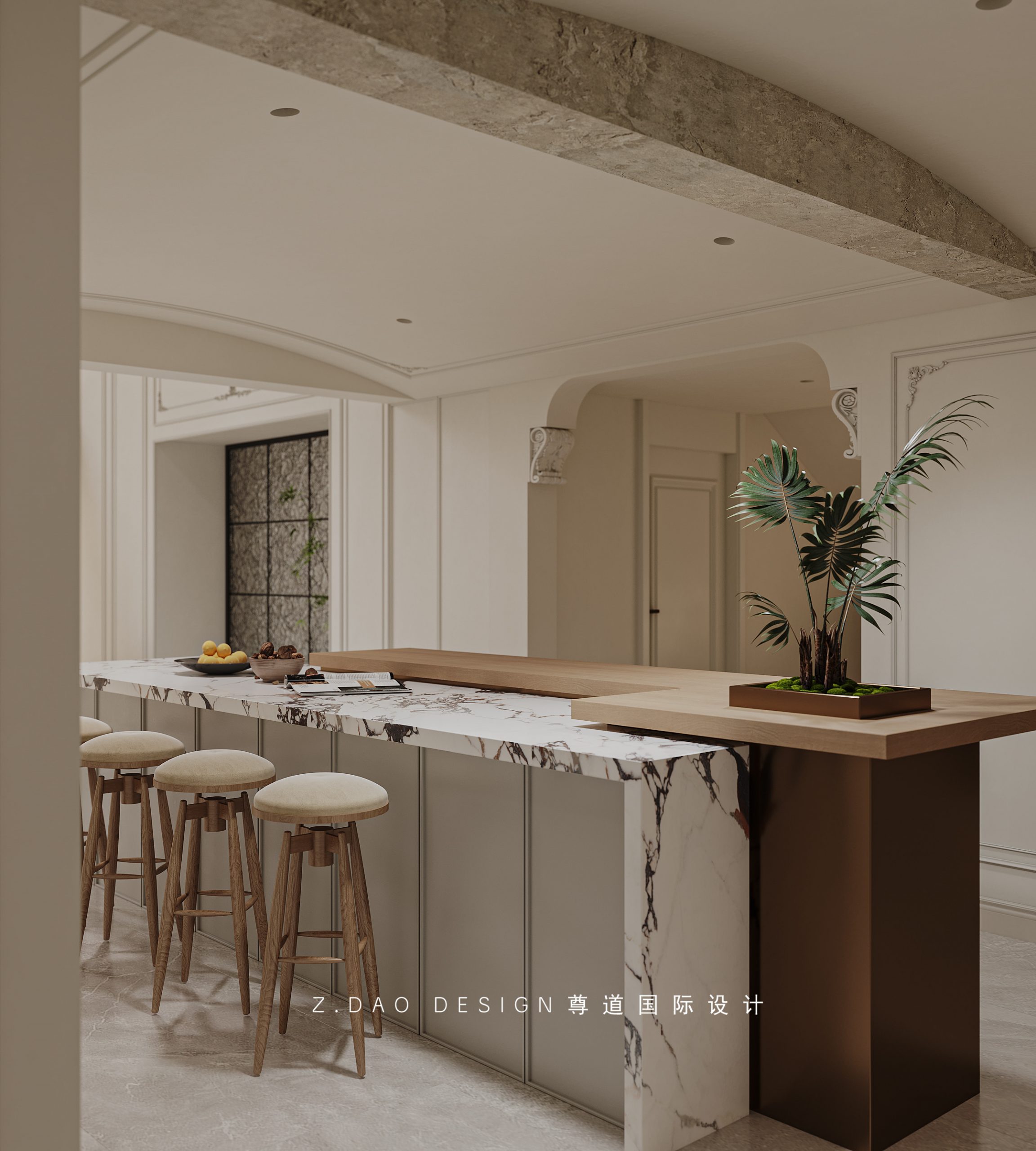 挑空区选用圆形吊顶,搭配精致优雅的雕花灯盘,将法式风格的大气展现的淋漓尽致。