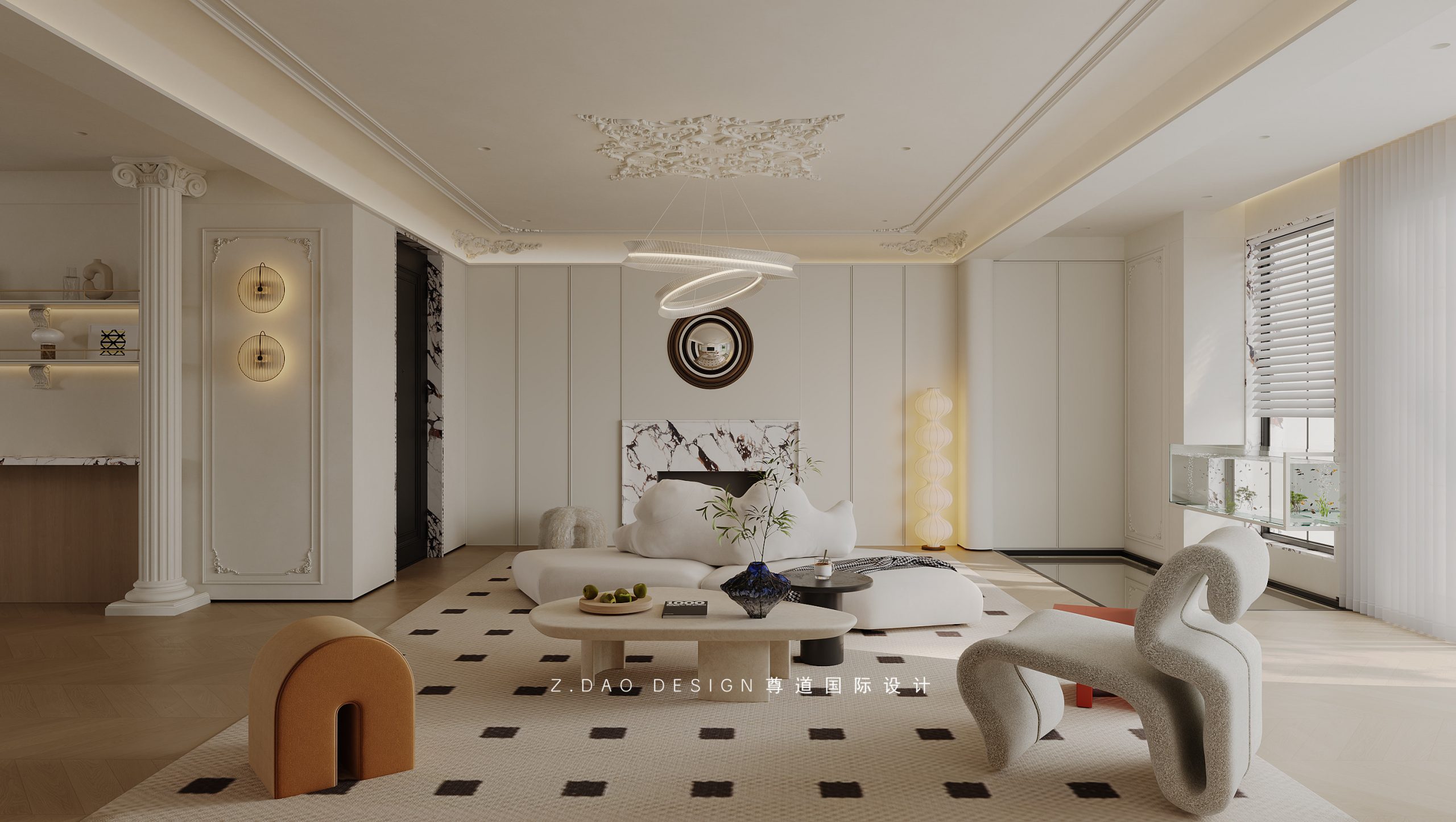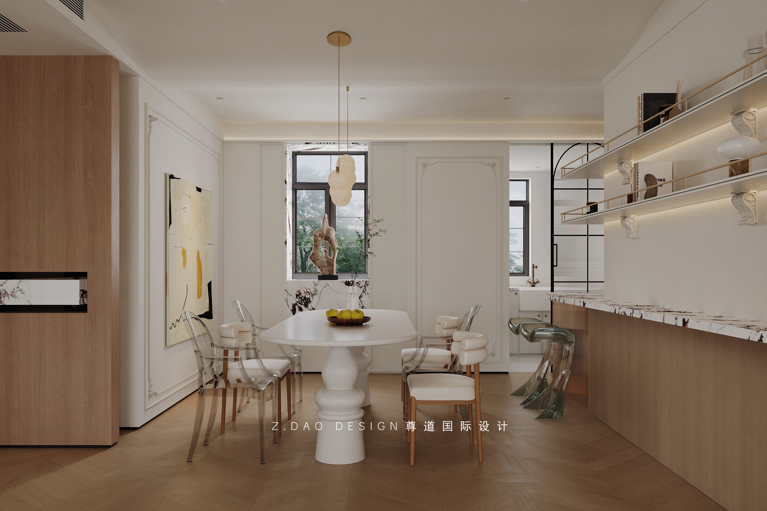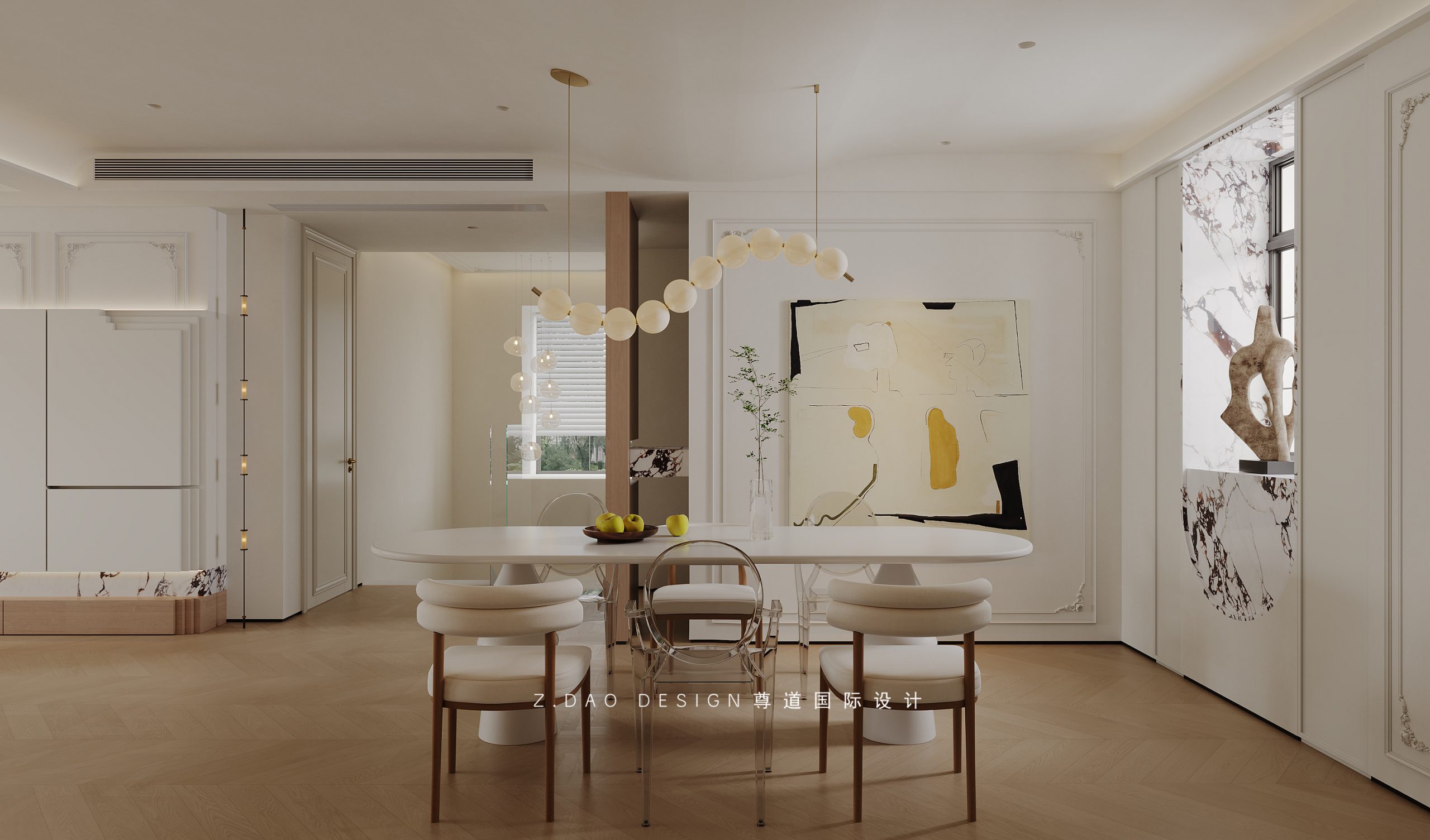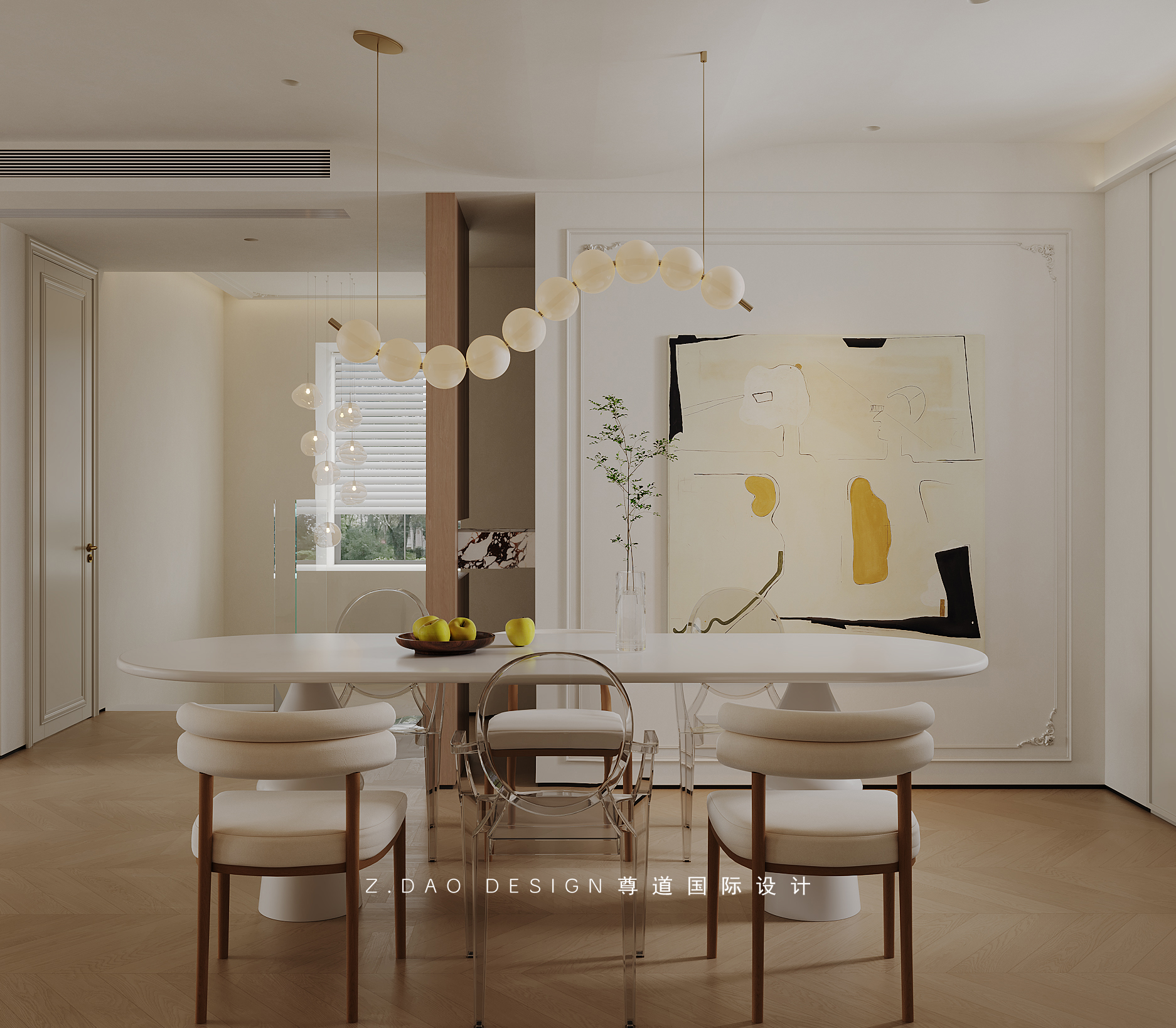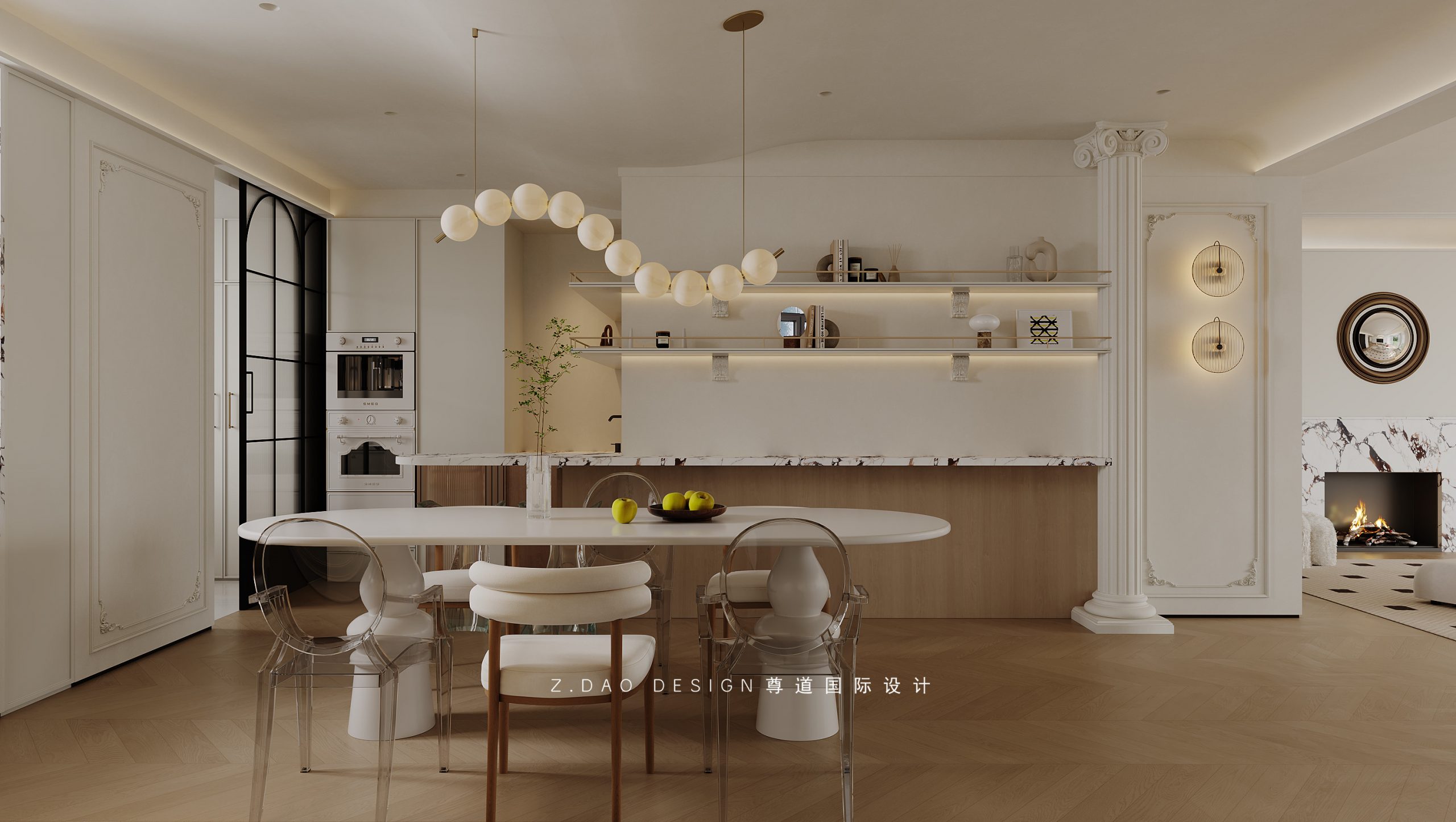 浅色椭圆餐桌、珍珠吊灯、羊羔绒与透明餐椅,不同材质的叠加,无形中为法式氛围加分添彩。