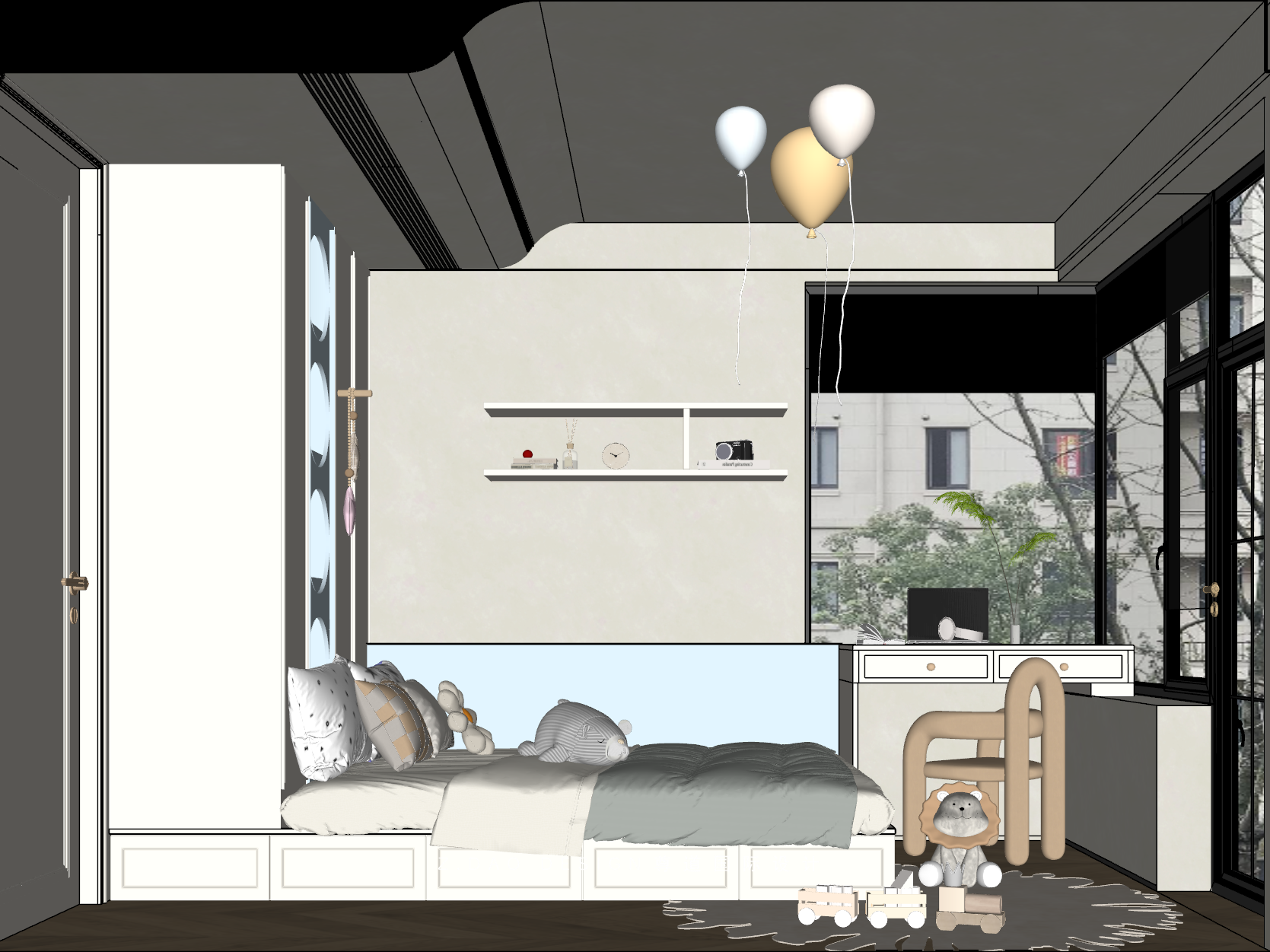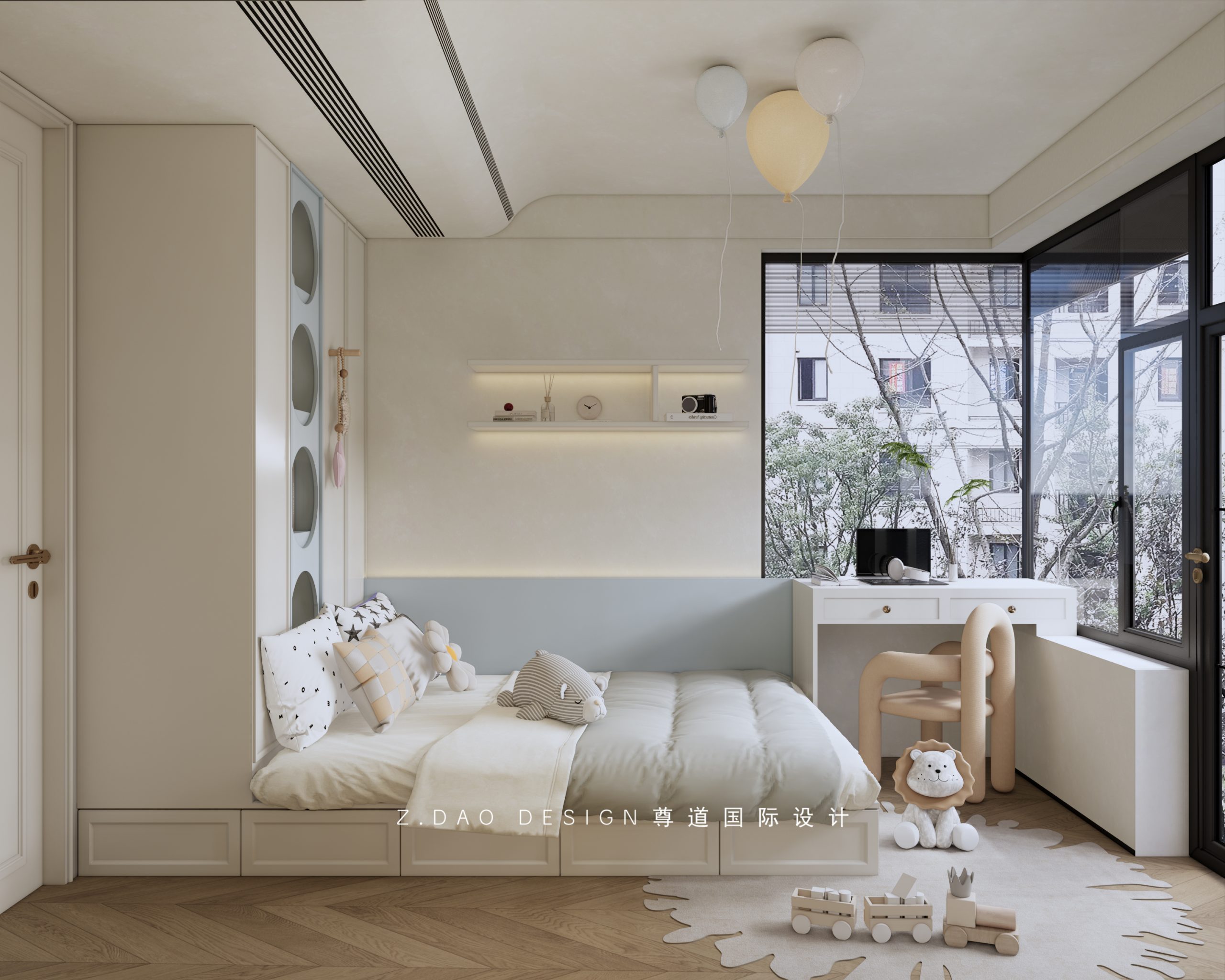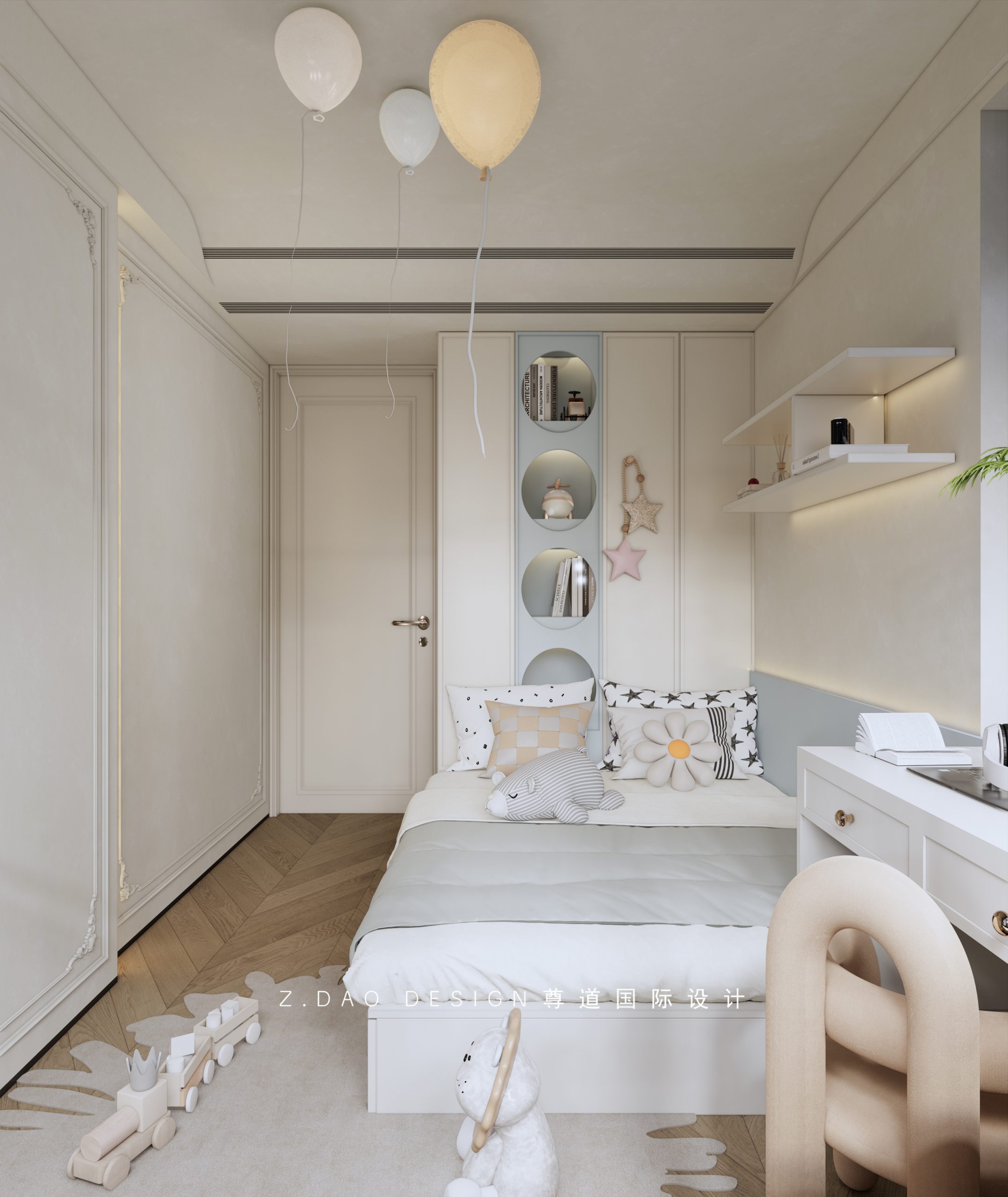 小女儿房整体使用奶油白+浅蓝的整体颜色搭配,百搭不容易出错,点缀出一间别有质感的休息空间。