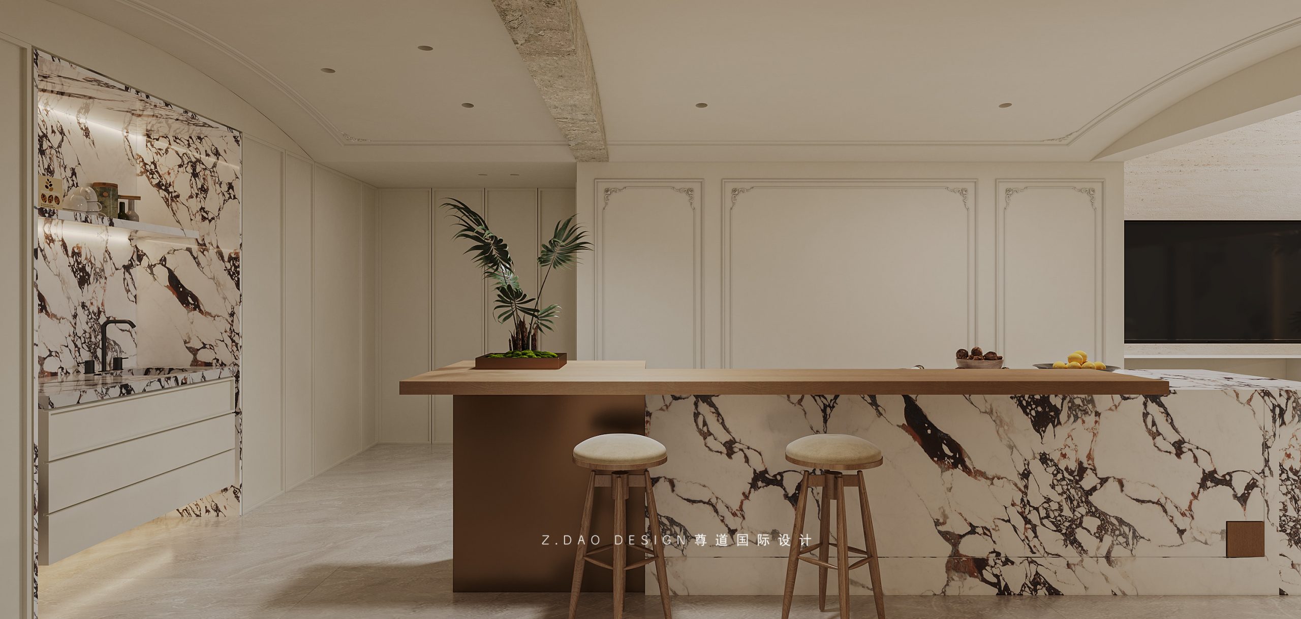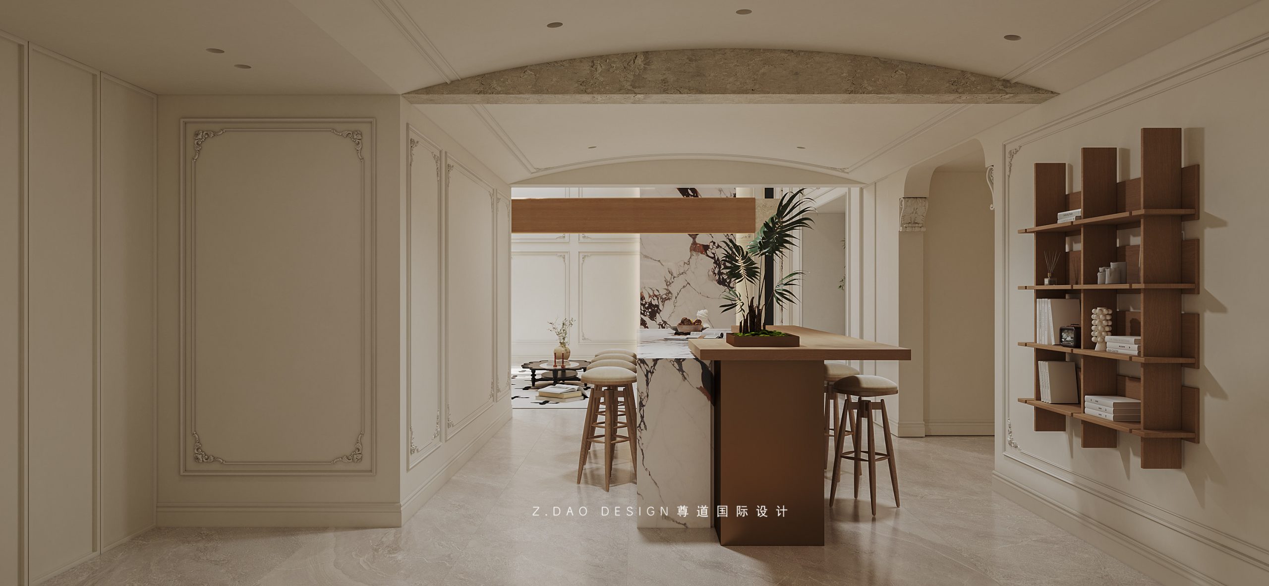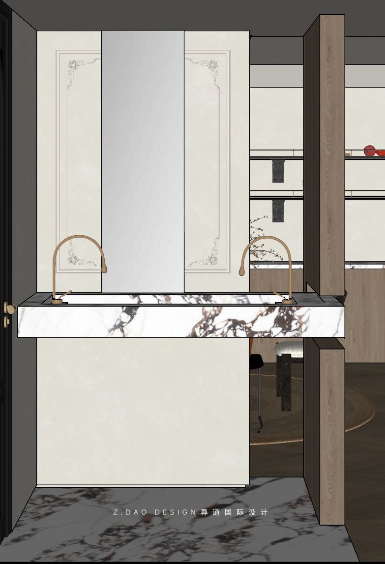 餐厅鱼骨拼木地板通铺,增加空间的延展性,背景墙用法式线条勾勒出层次;