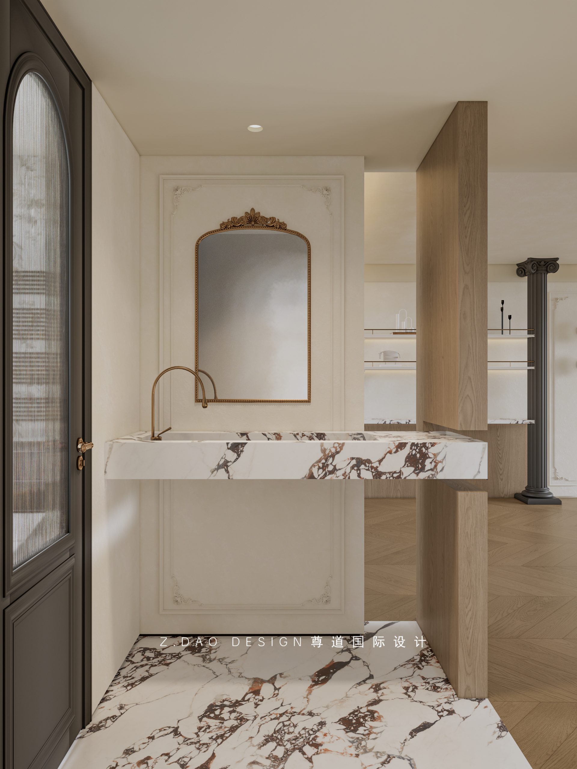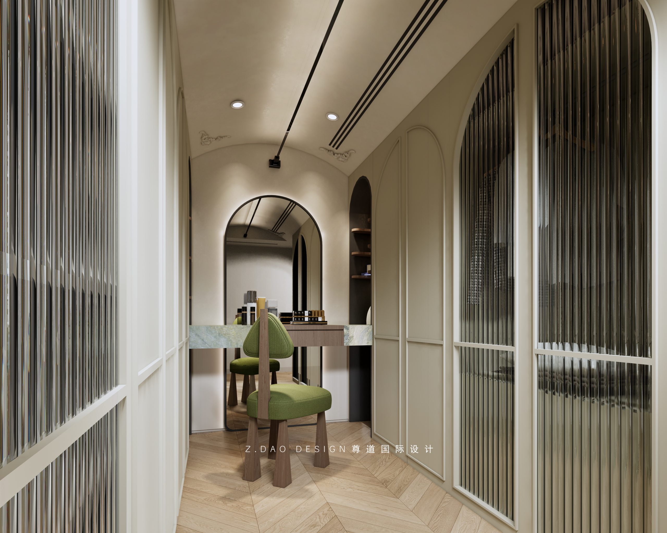 干区背景整体采用绿色马赛克大胆惊艳,深邃中又透着清新。湿区上下半墙的设计,条形砖+花砖的搭配,尽显空间的法式情调,高级感满满~