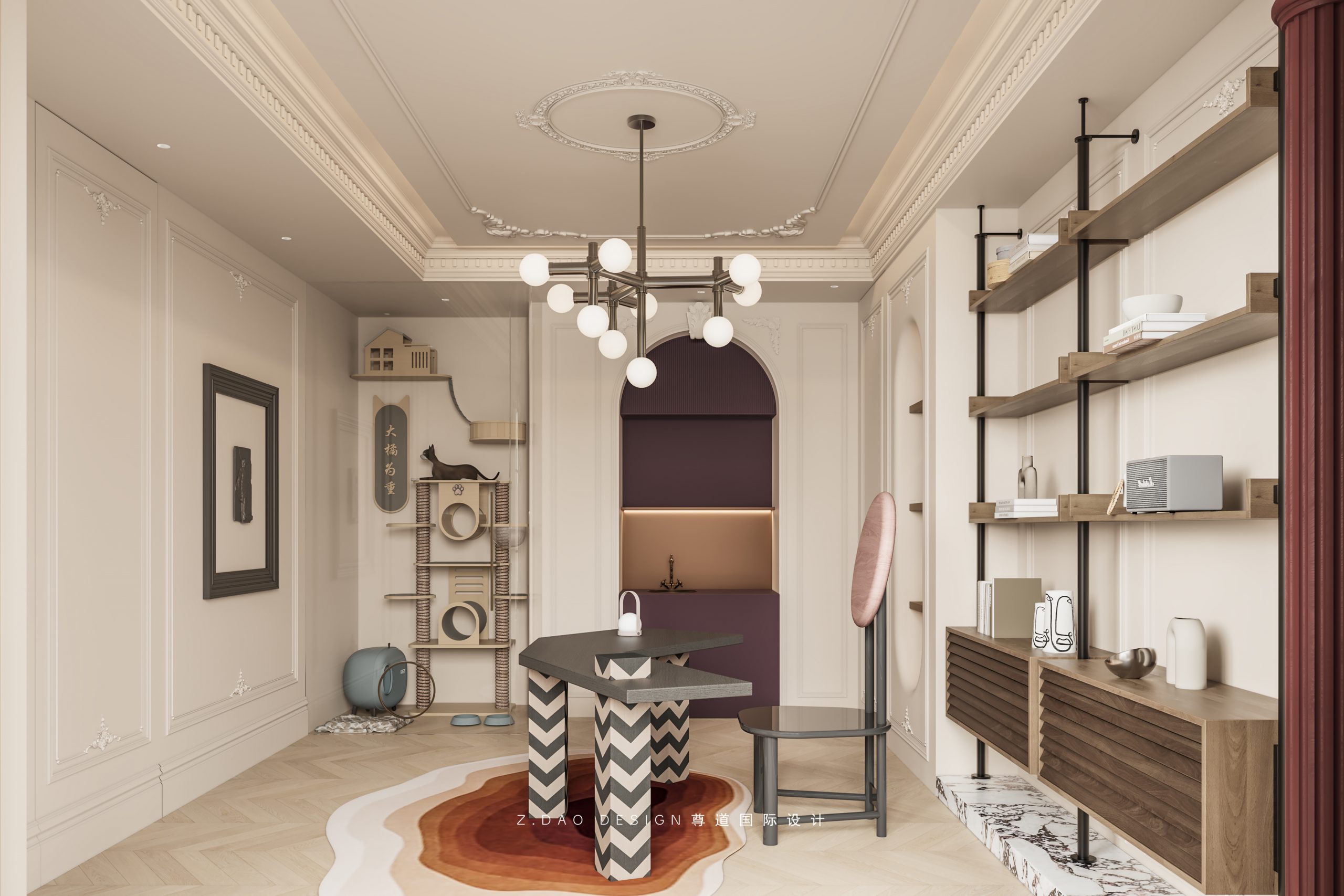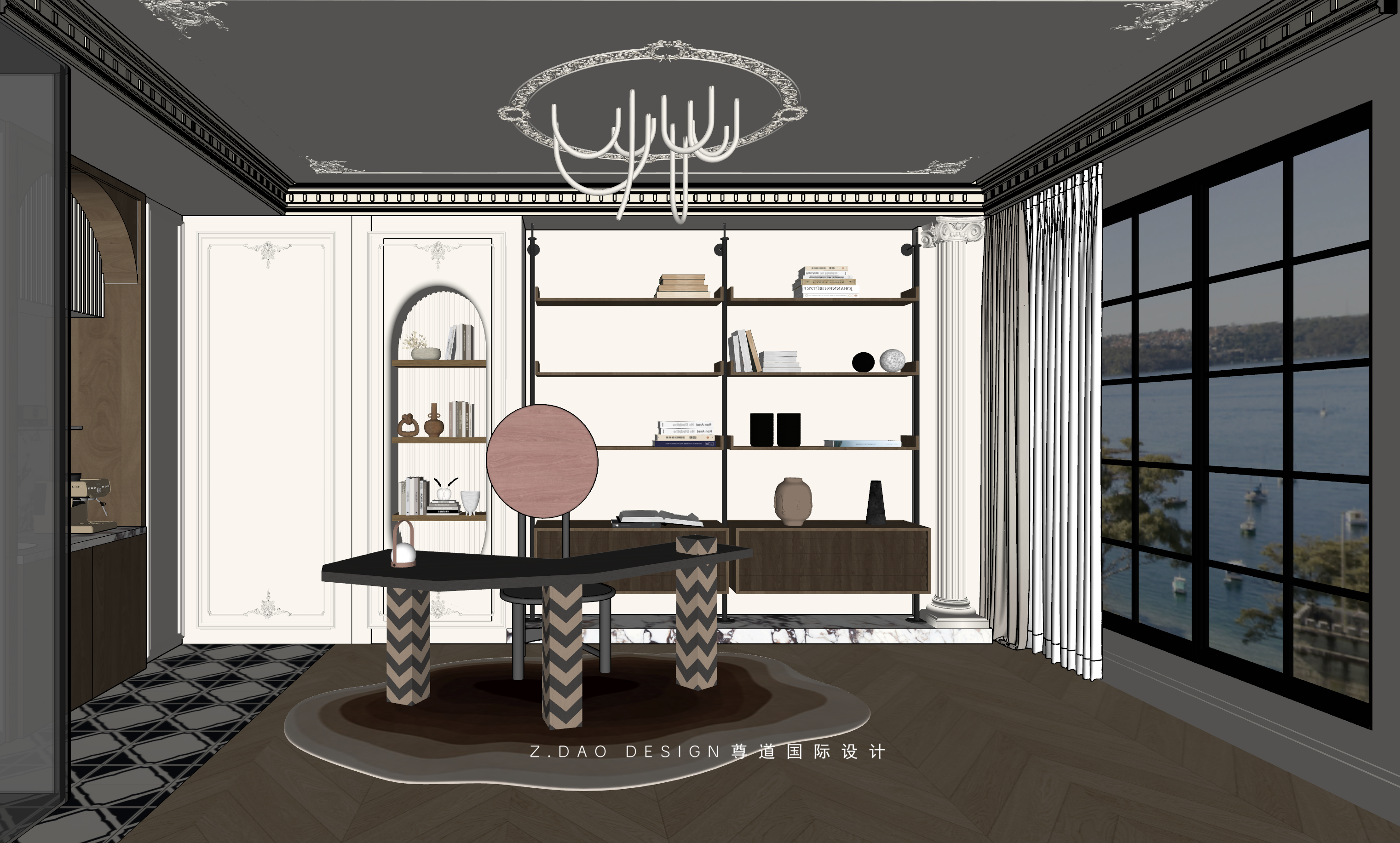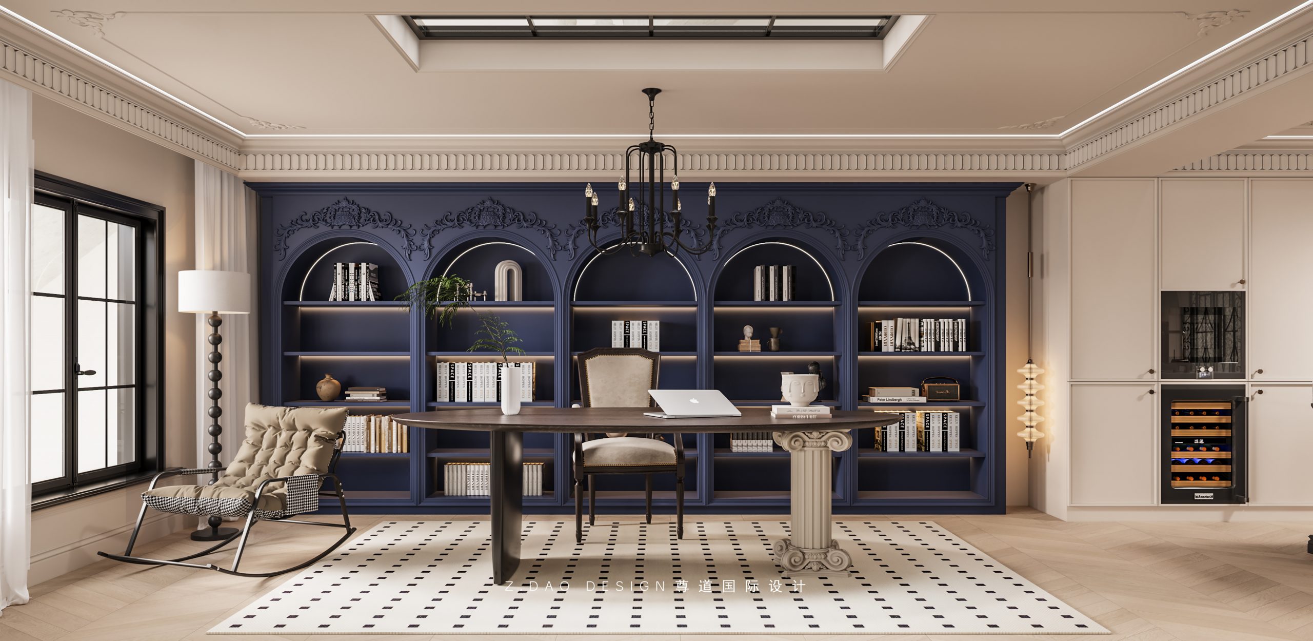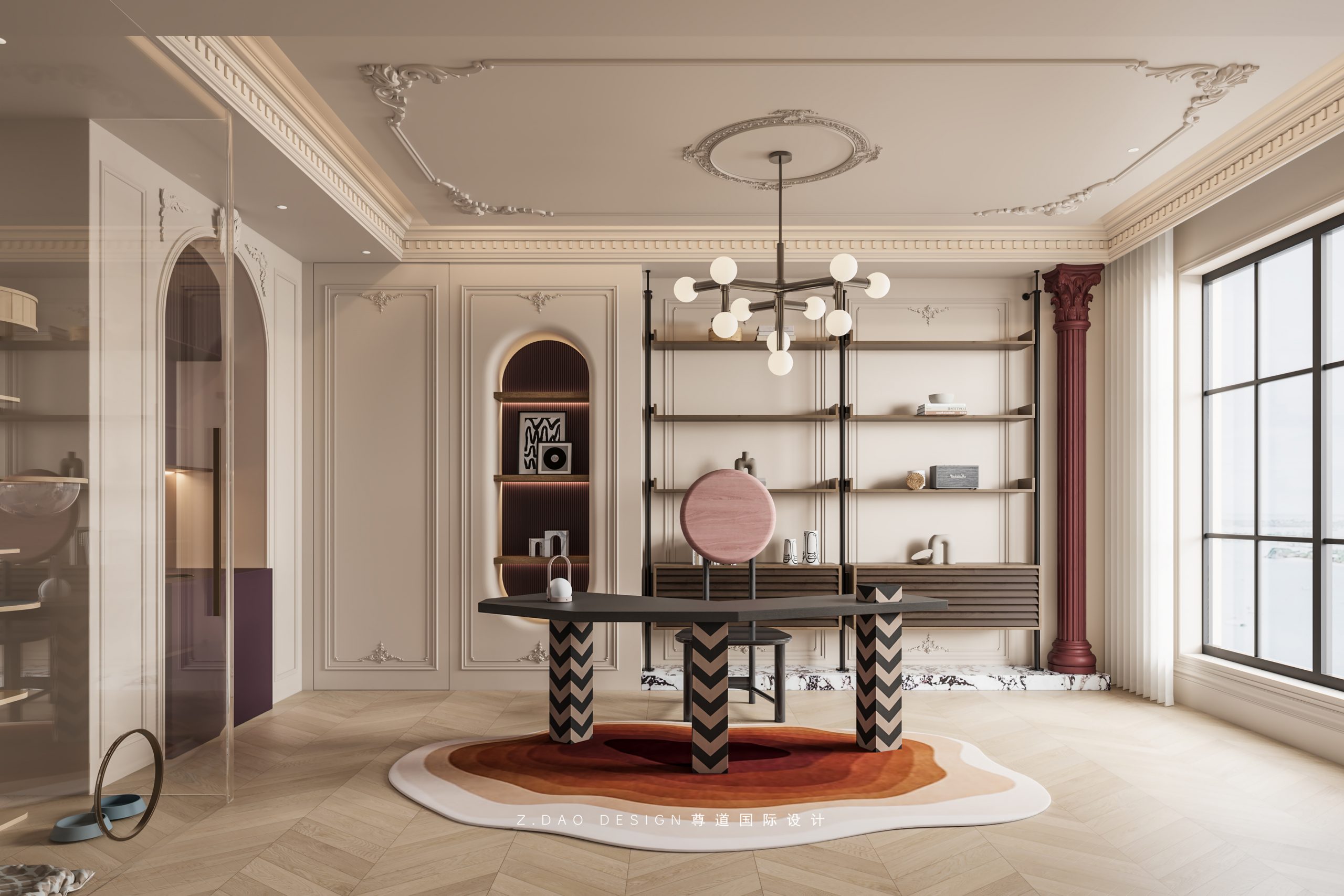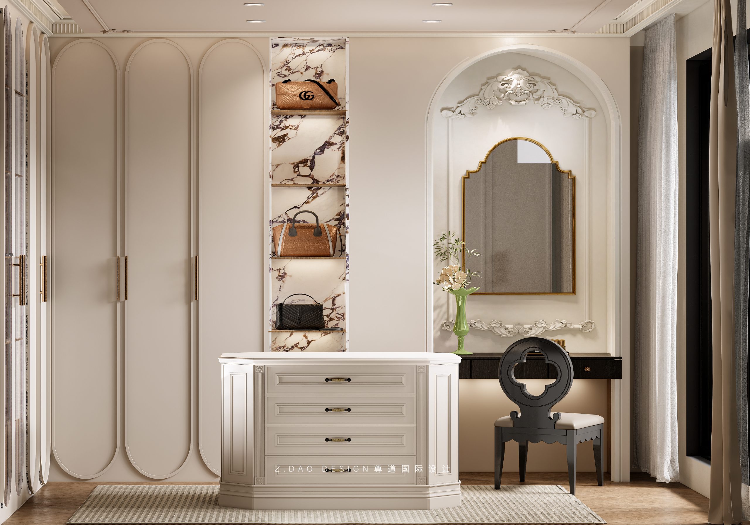 墙面精致优美法式线条、优雅曲线的办公桌和拱形水吧柜,整个空间充满了浪漫的气息。
