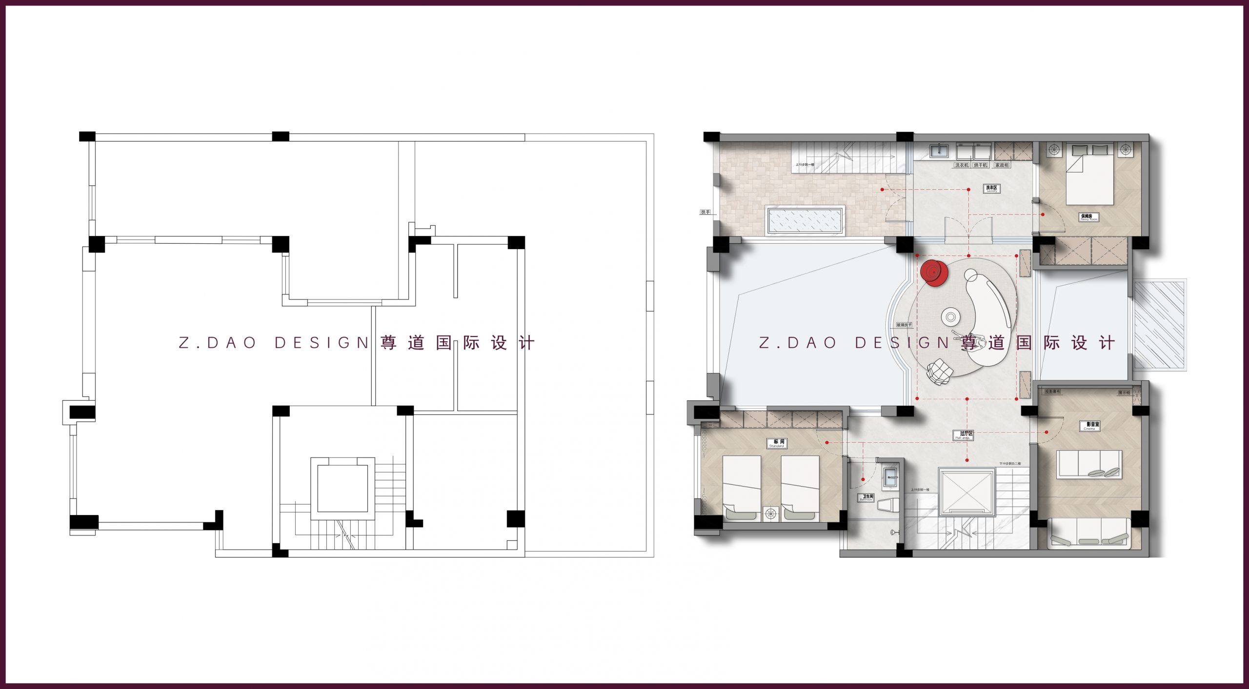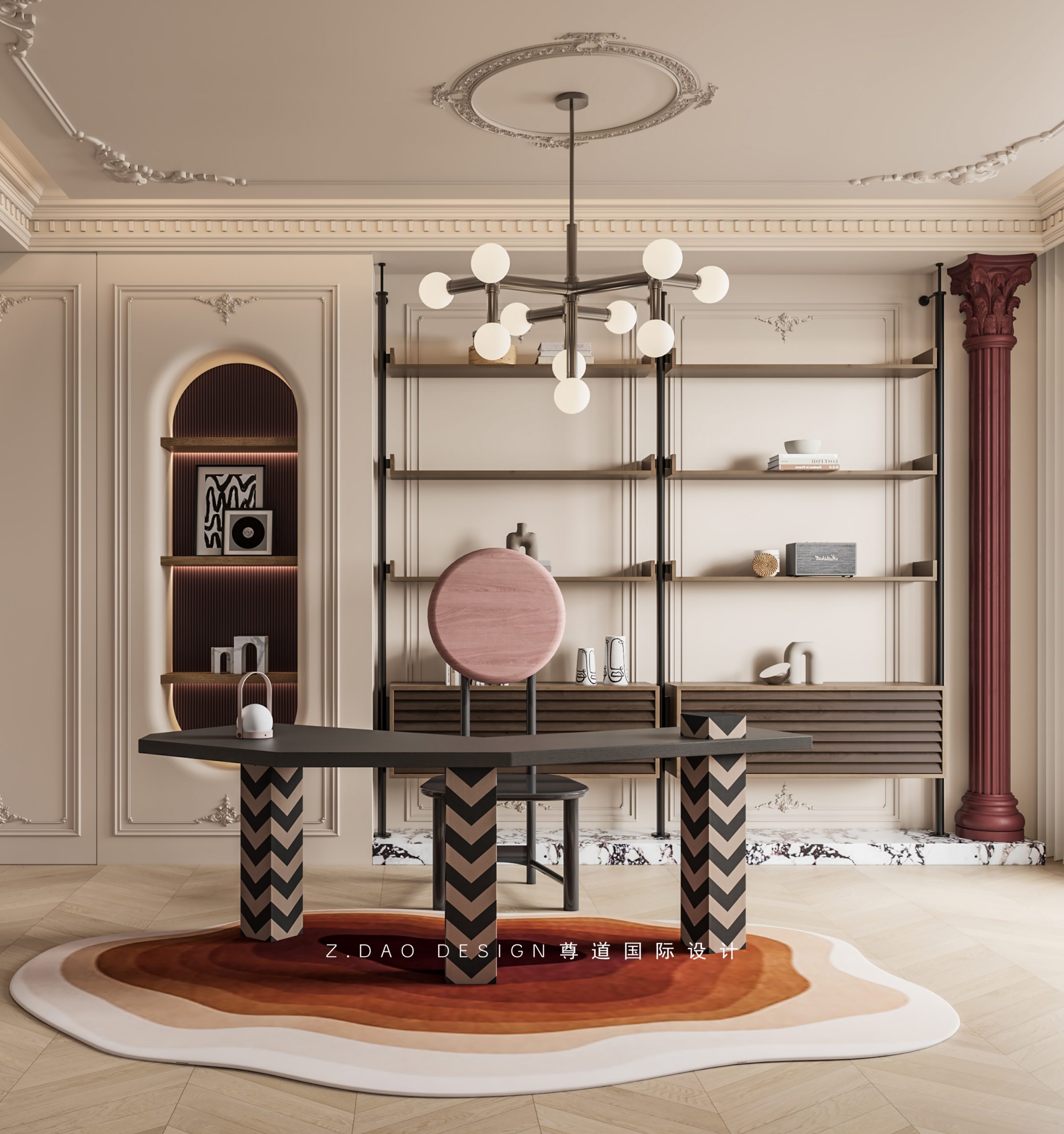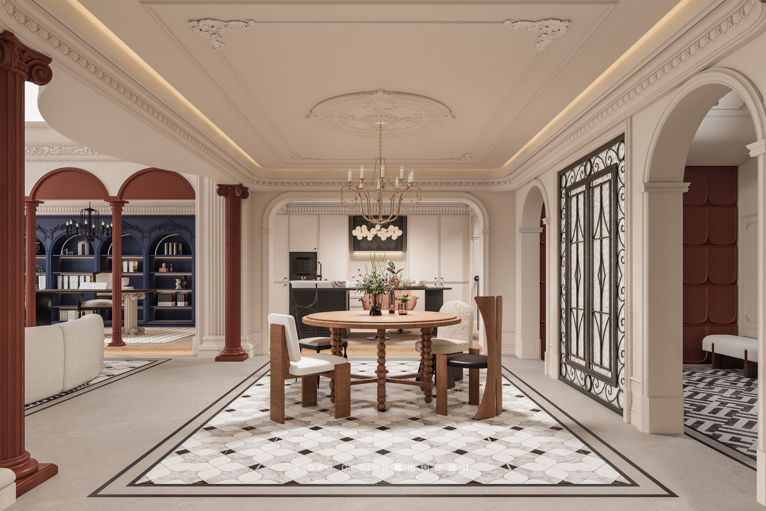 深红色罗马柱作为棋牌区、书房与休闲区之间的隔断,巧妙地融入整体设计。