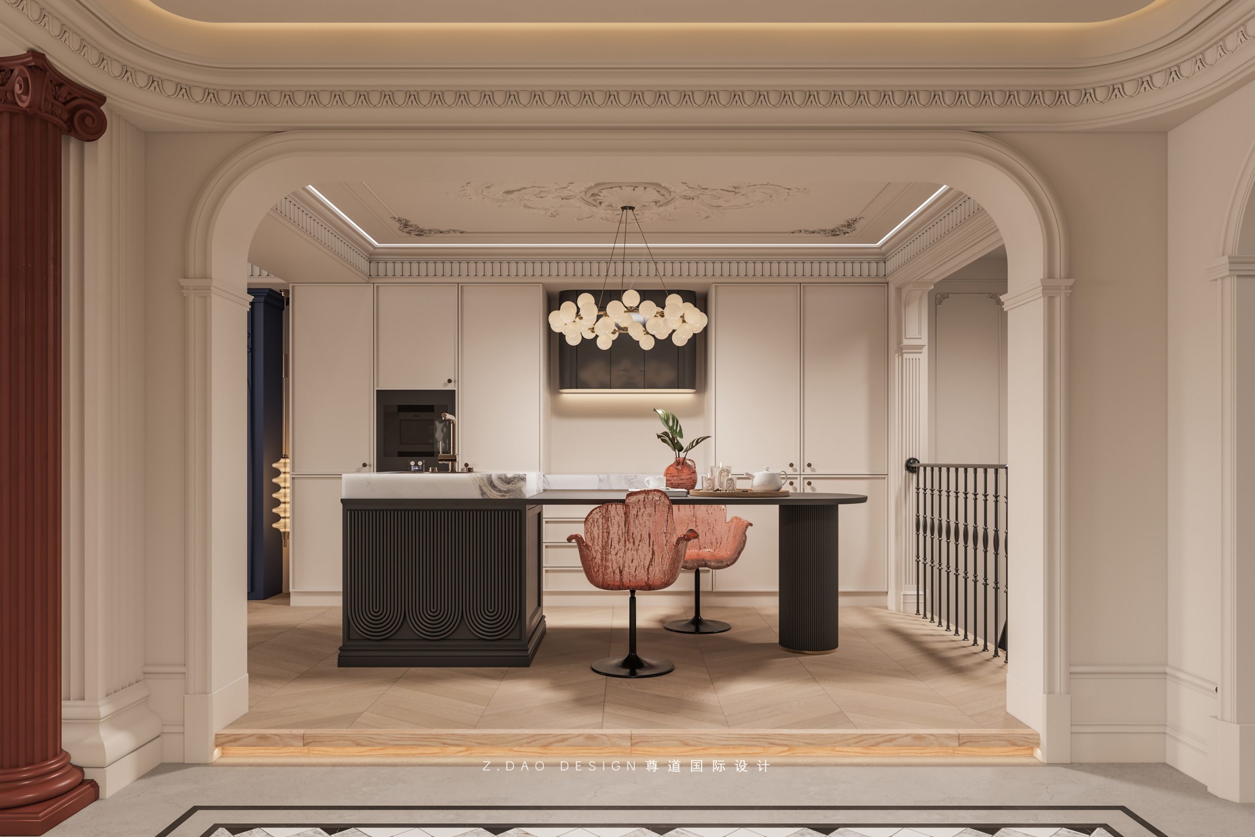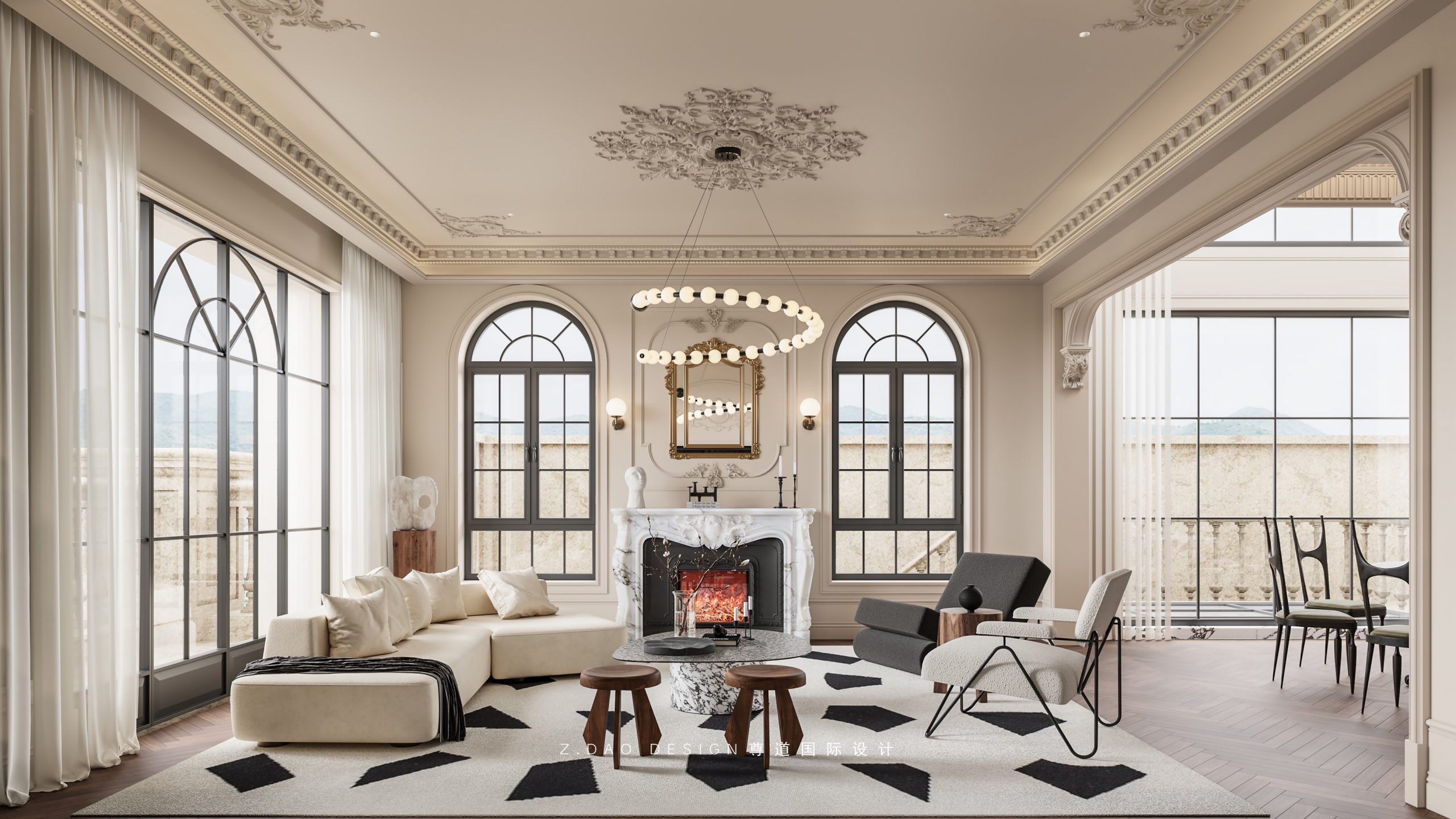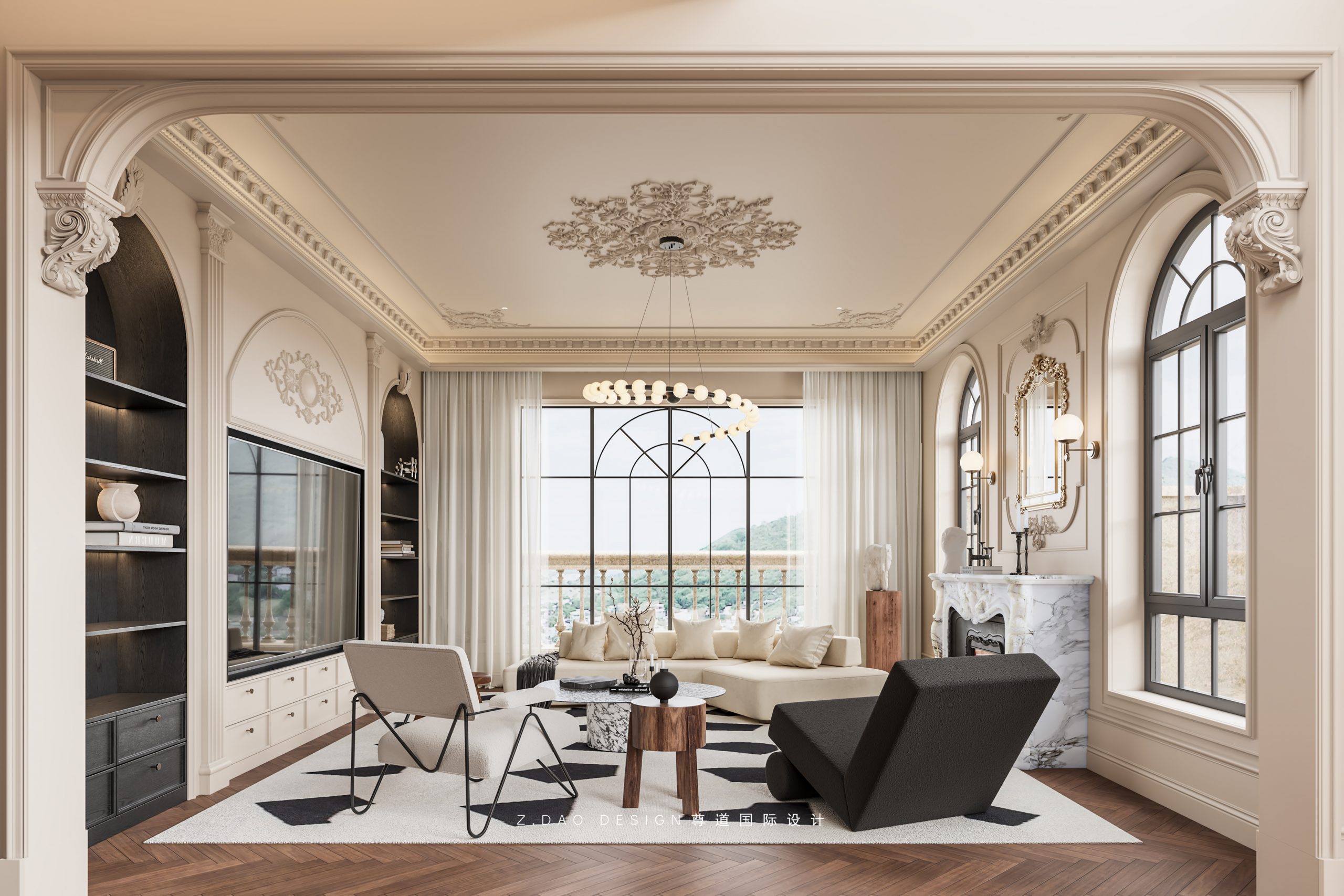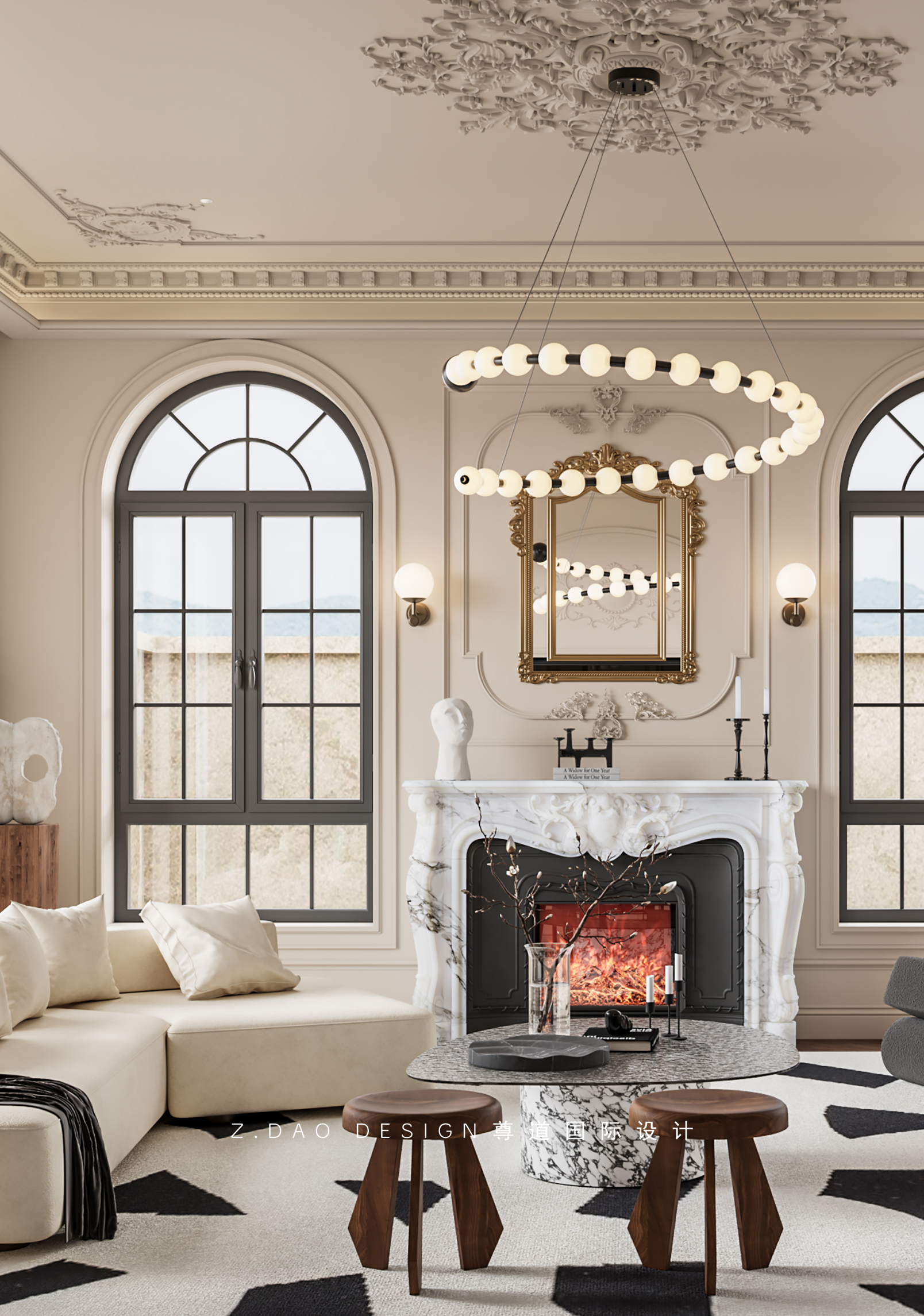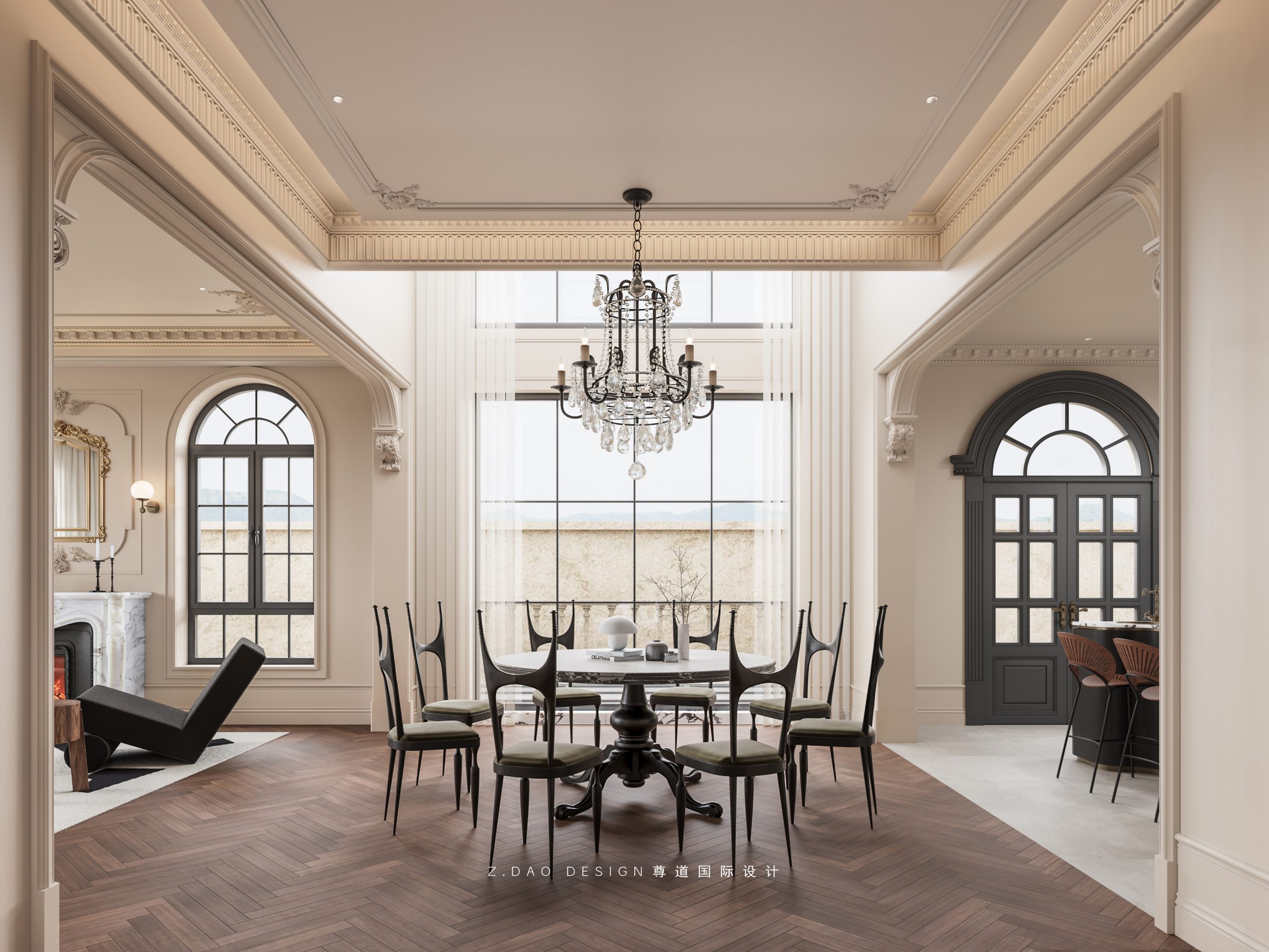 大理石壁炉、黑色曲线栏杆、复古烛台,聚焦于定制拱形天花吊顶,让整体空间既保留古典法式经久耐看的标志性元素,又融入现代的时尚趋势。