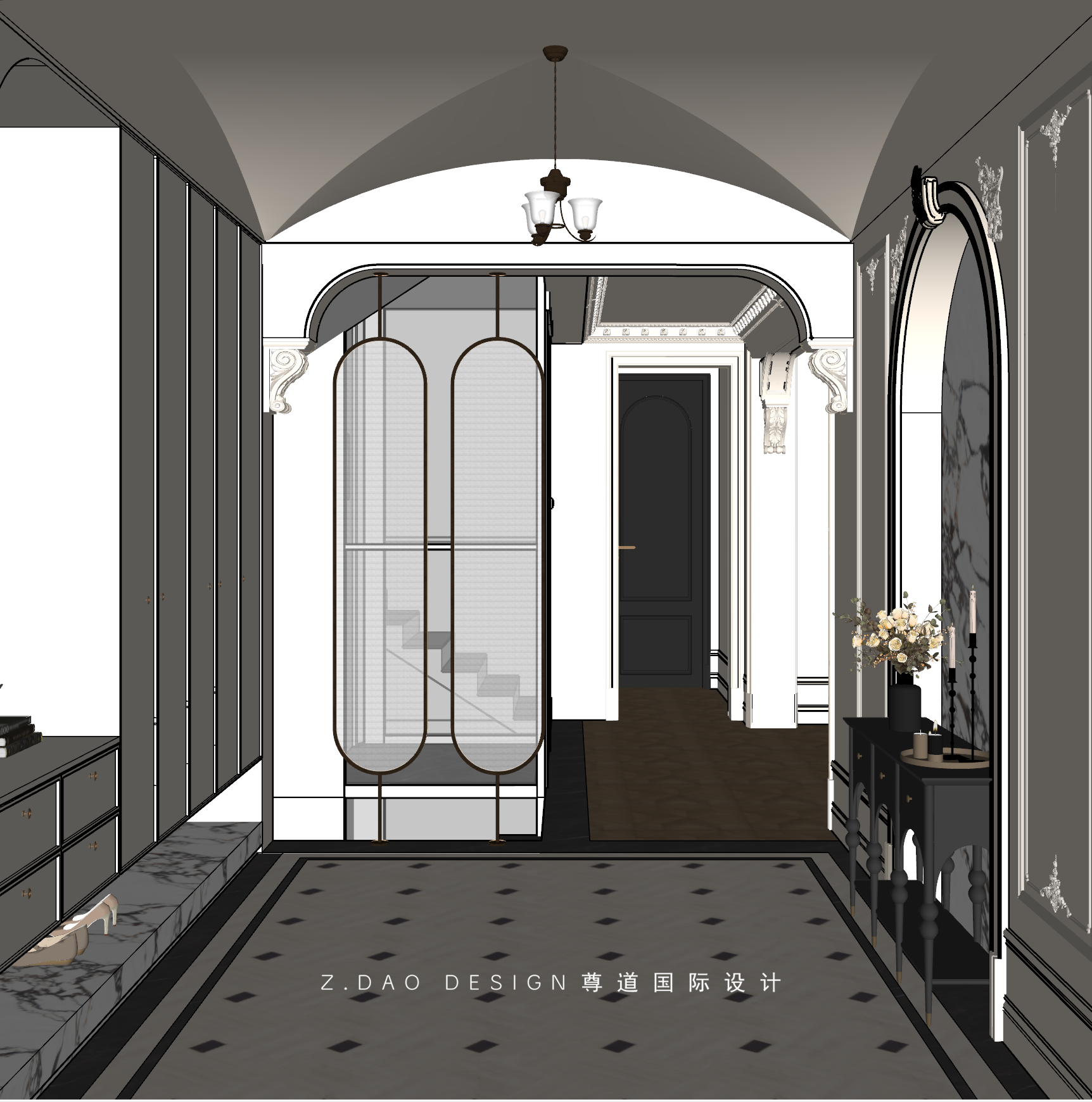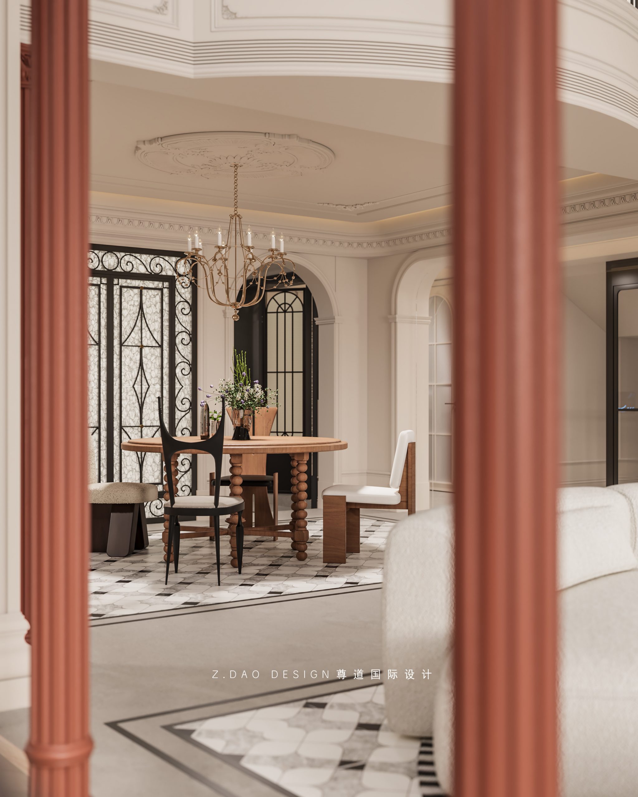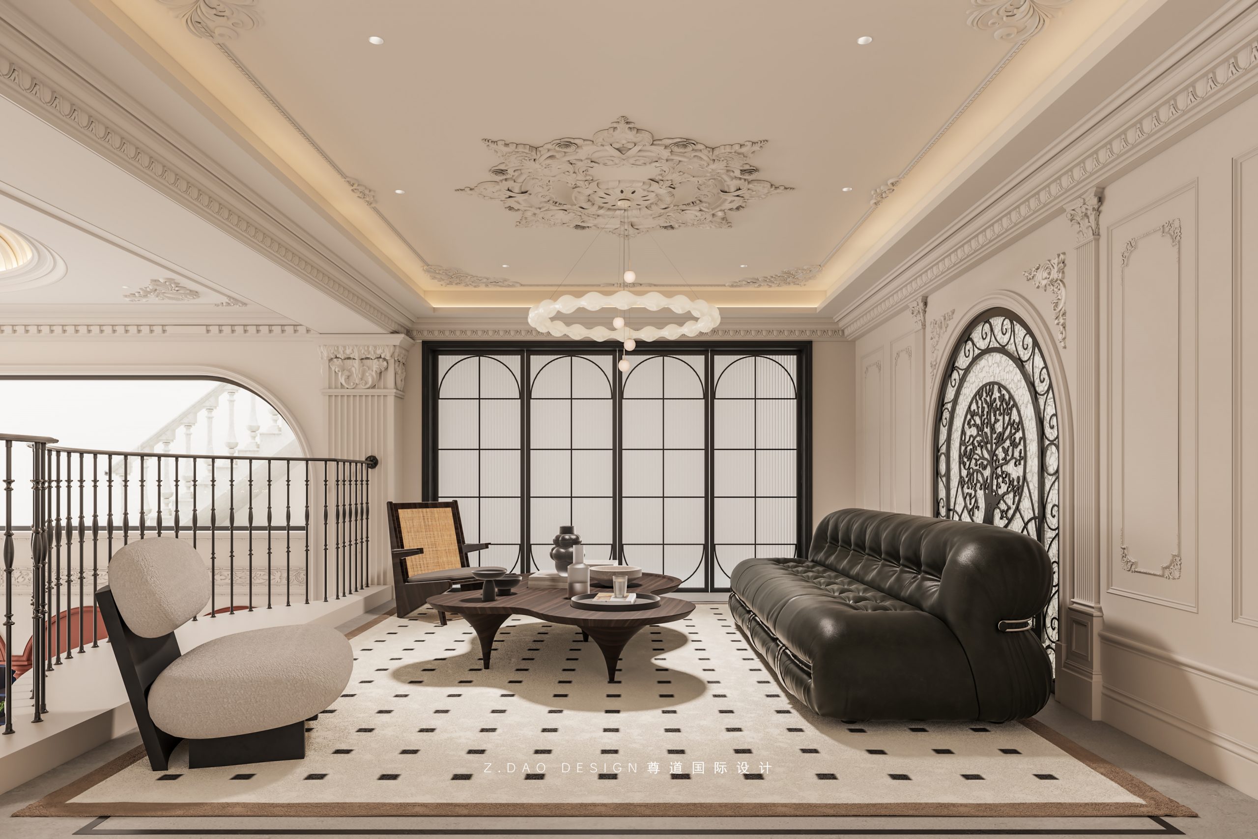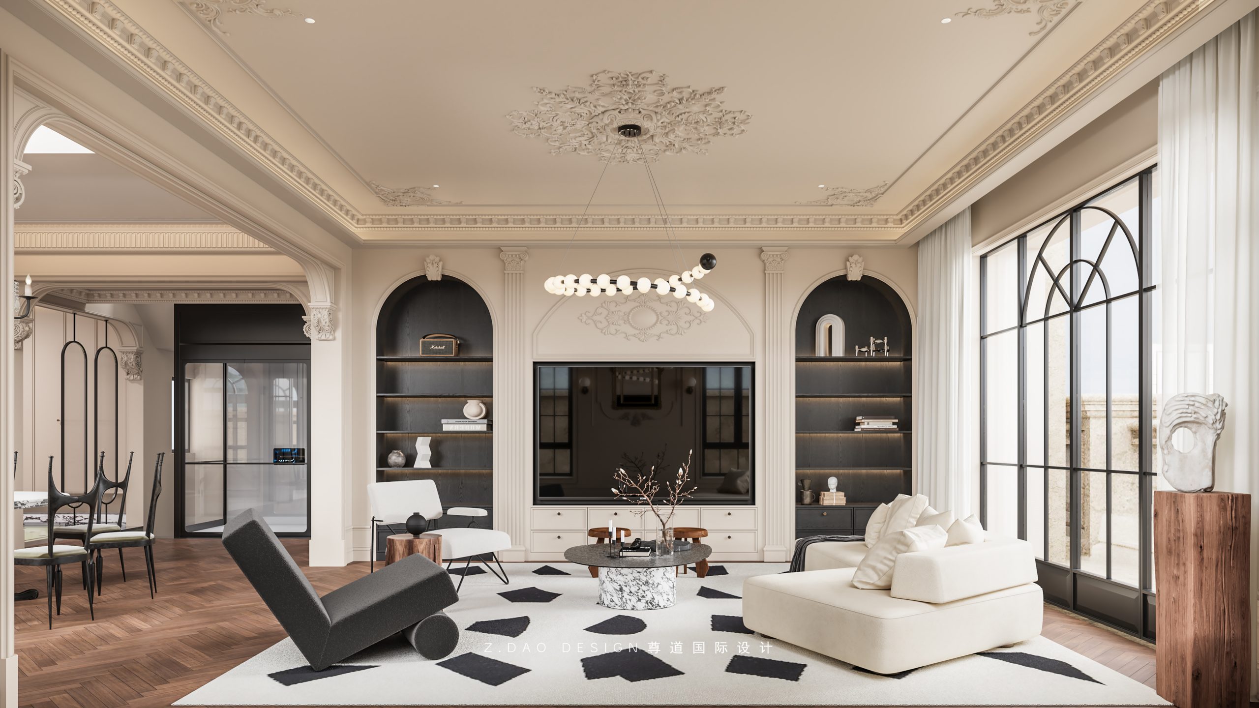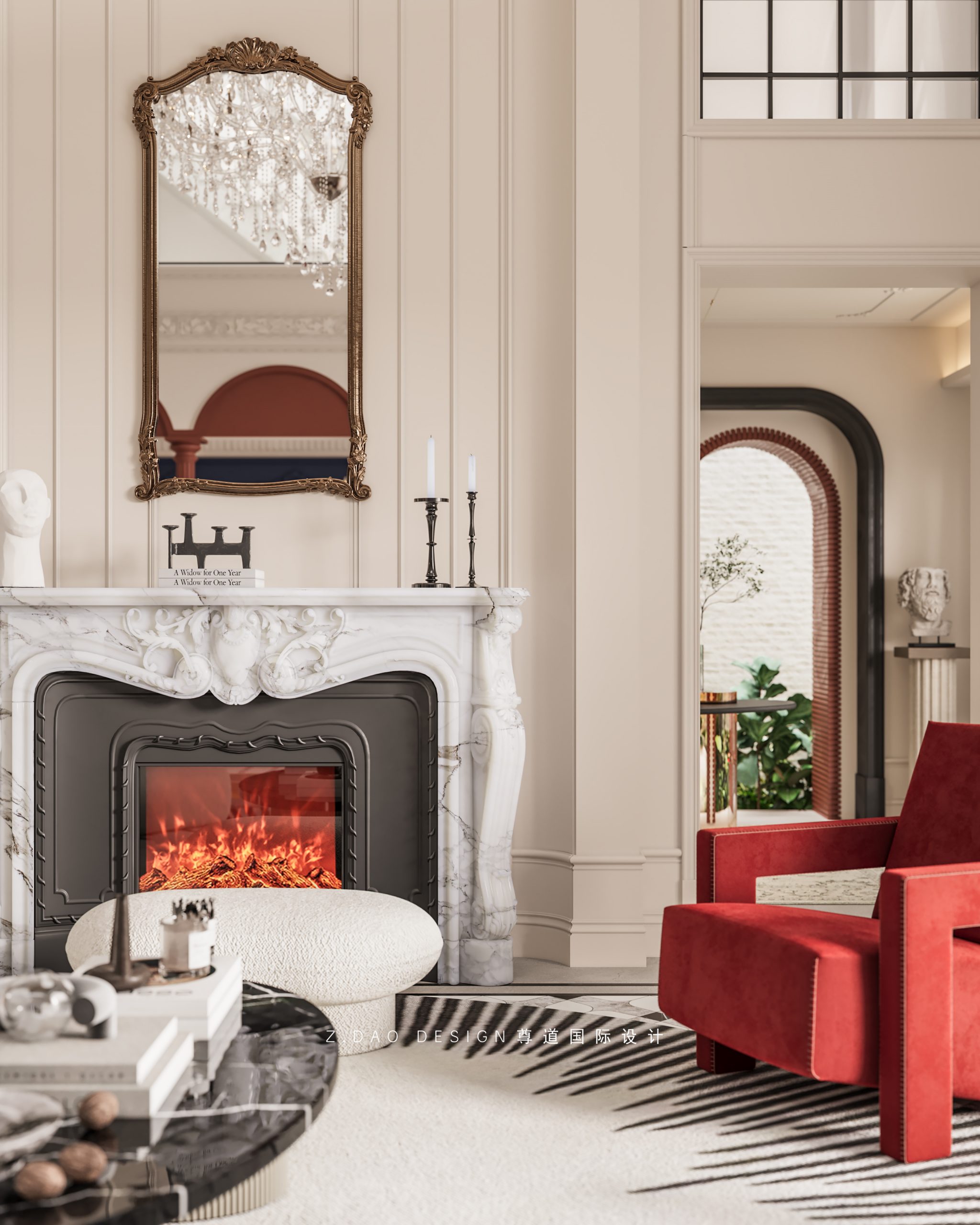 大理石壁炉、黑色曲线栏杆、复古烛台,聚焦于定制拱形天花吊顶,让整体空间既保留古典法式经久耐看的标志性元素,又融入现代的时尚趋势。