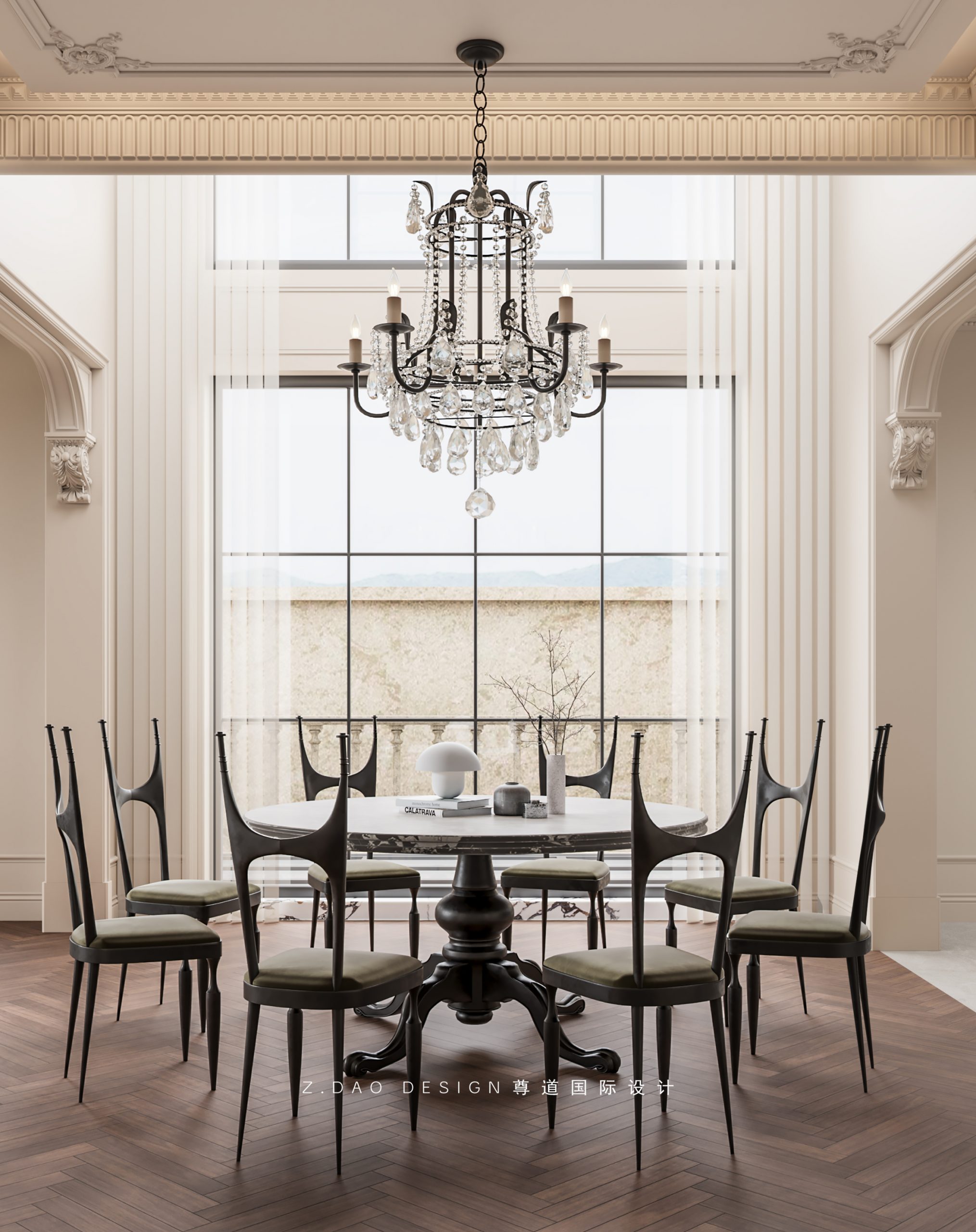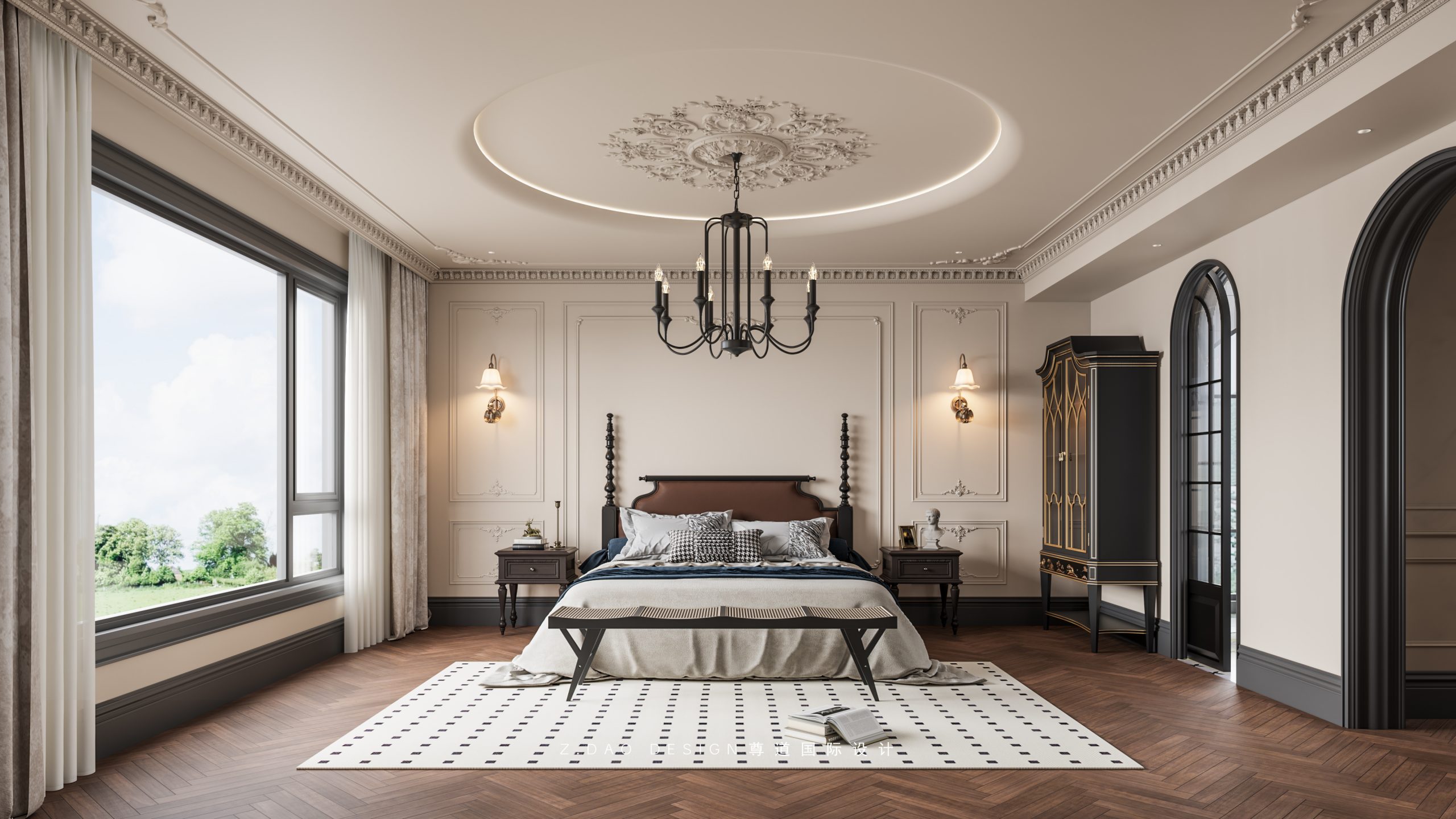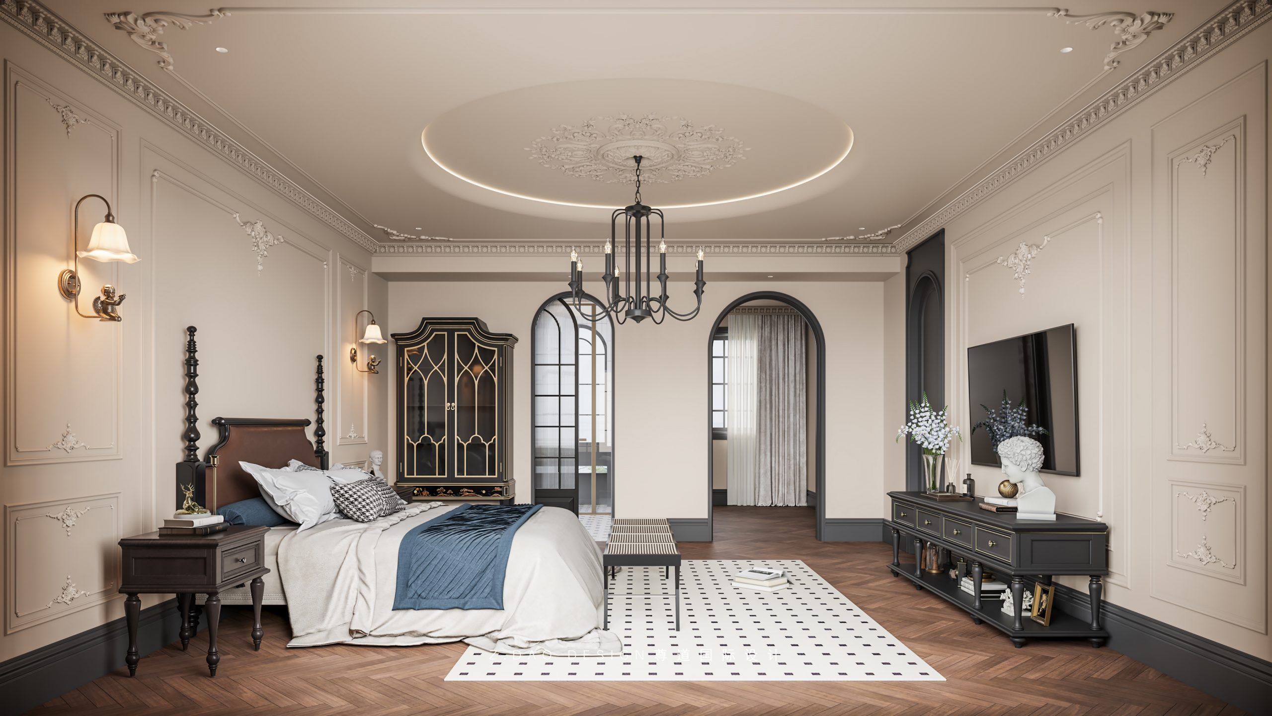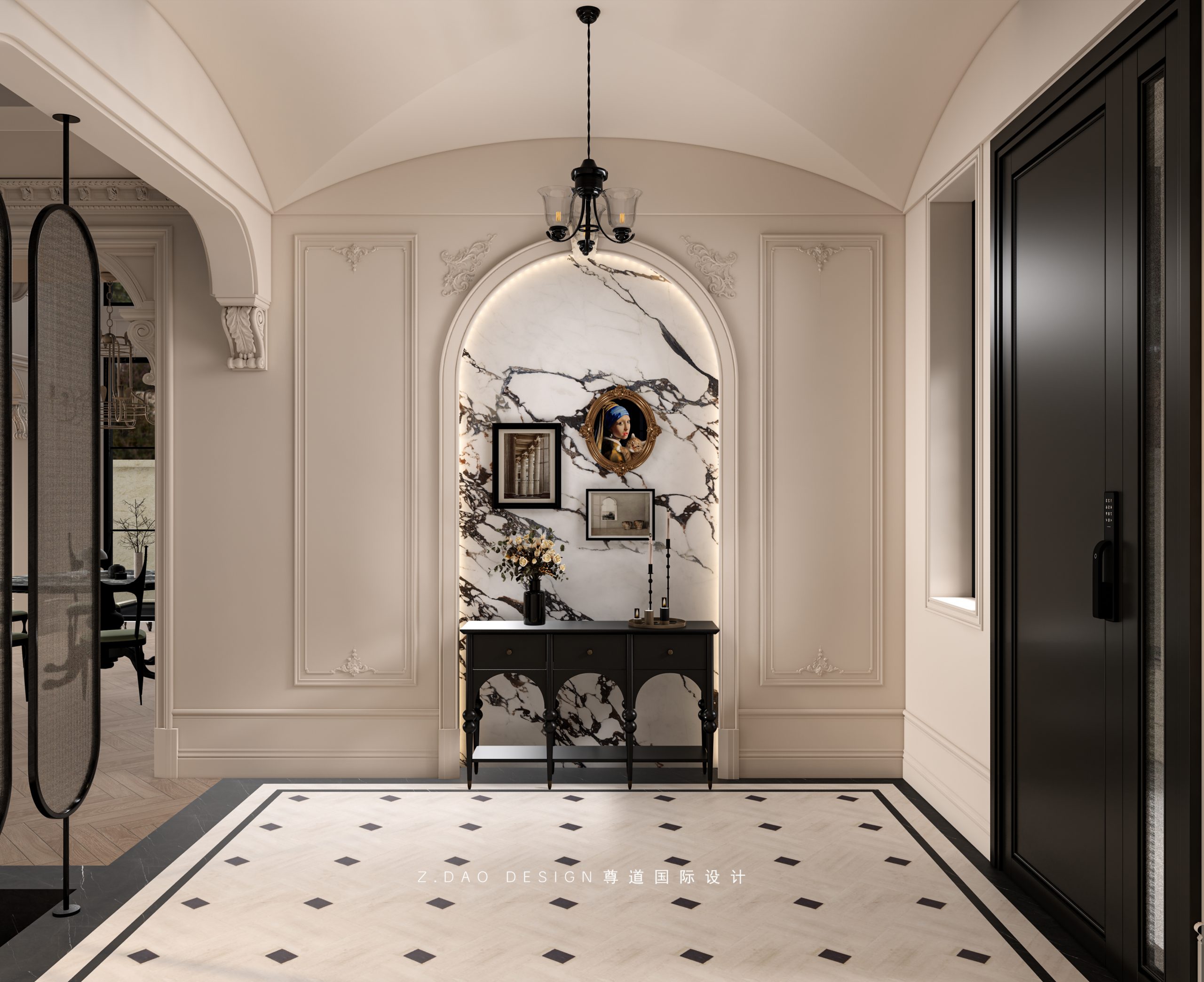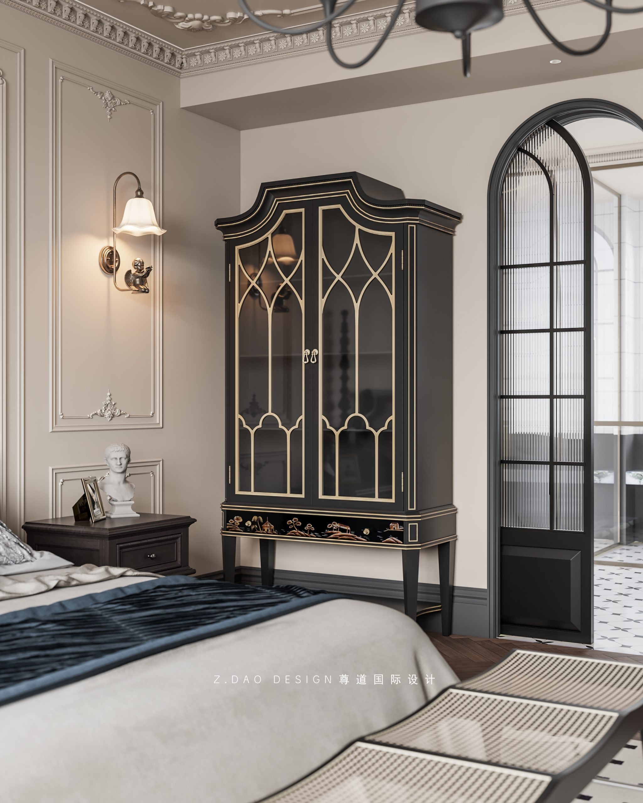 大理石壁炉、黑色曲线栏杆、复古烛台,聚焦于定制拱形天花吊顶,让整体空间既保留古典法式经久耐看的标志性元素,又融入现代的时尚趋势。
