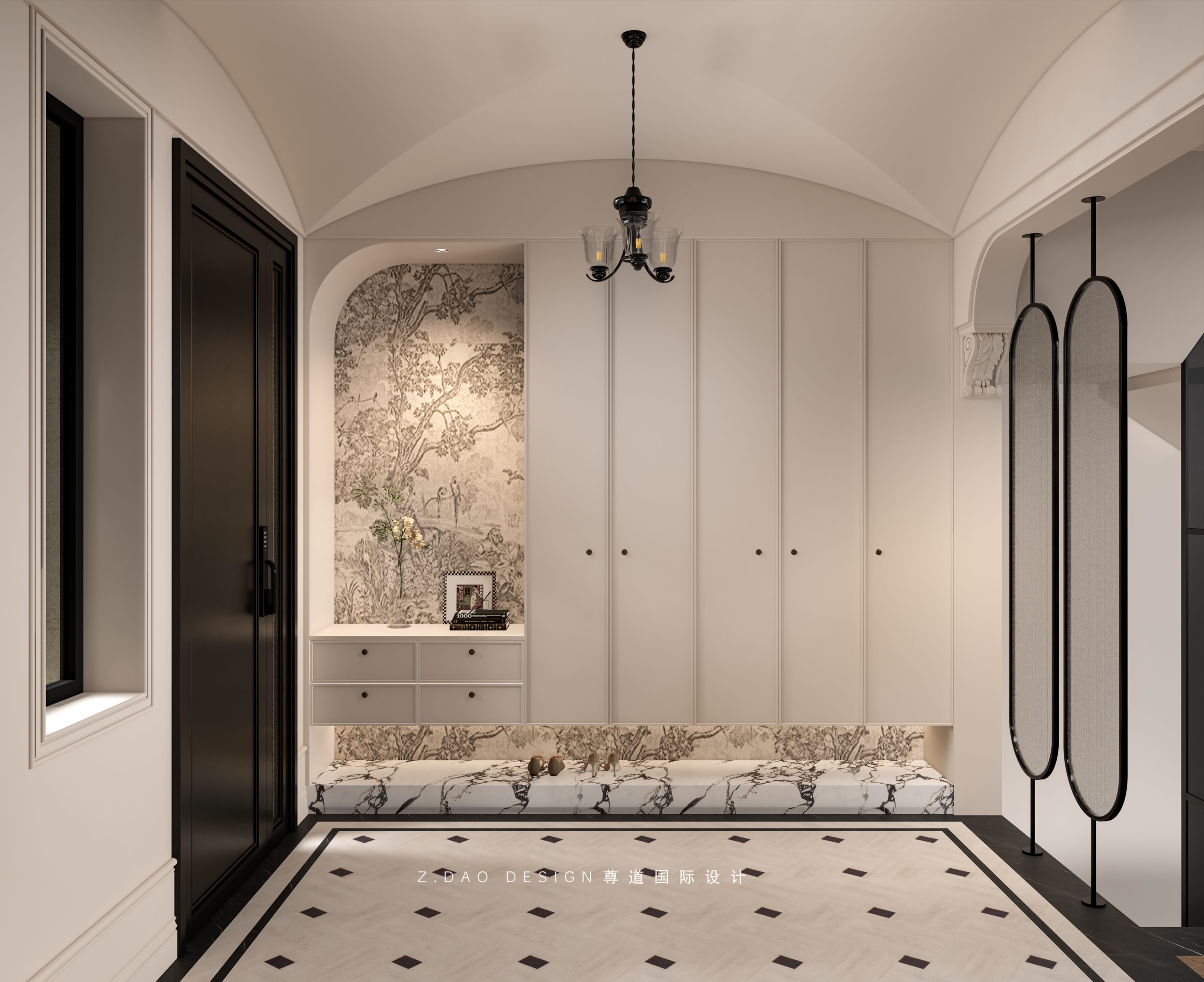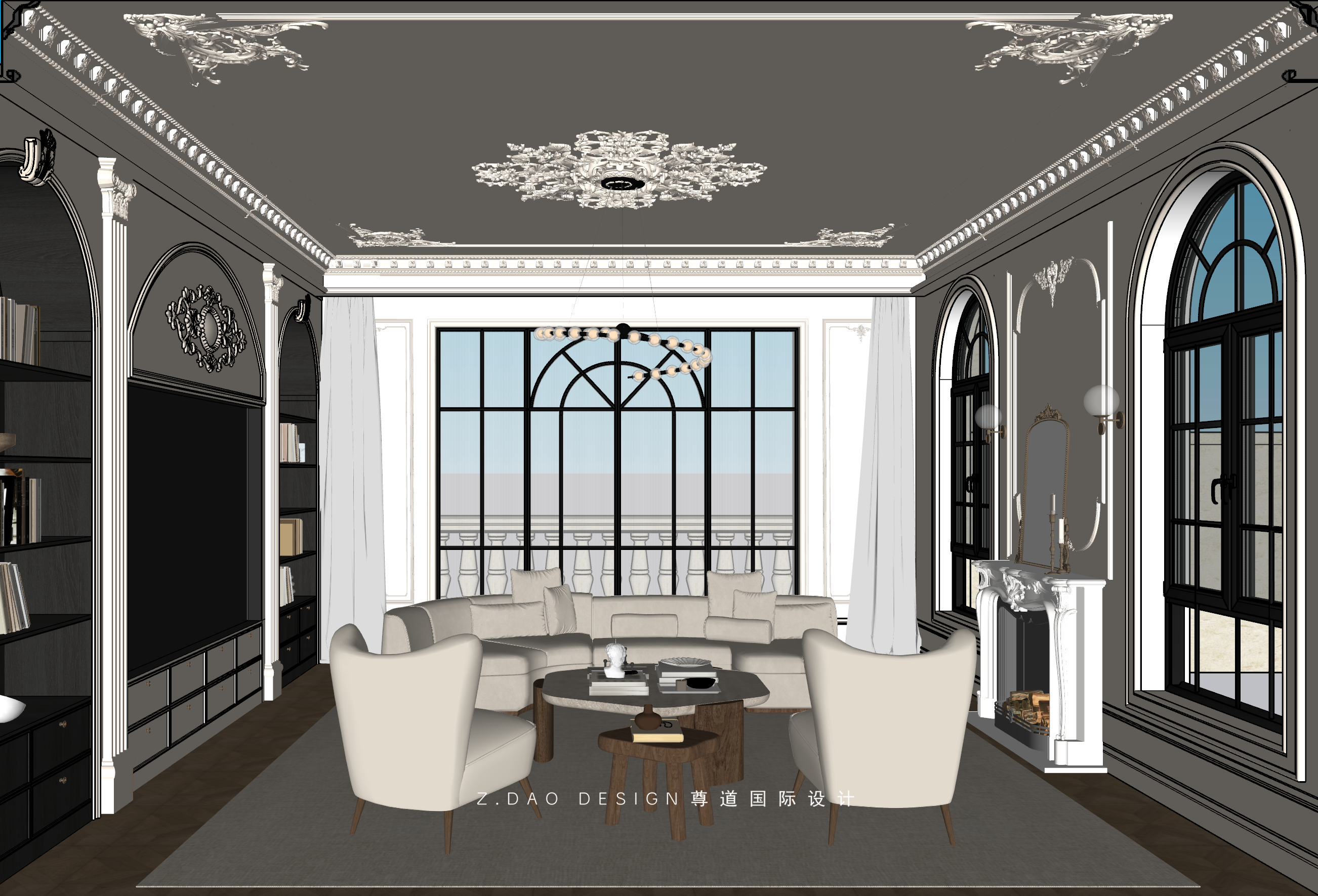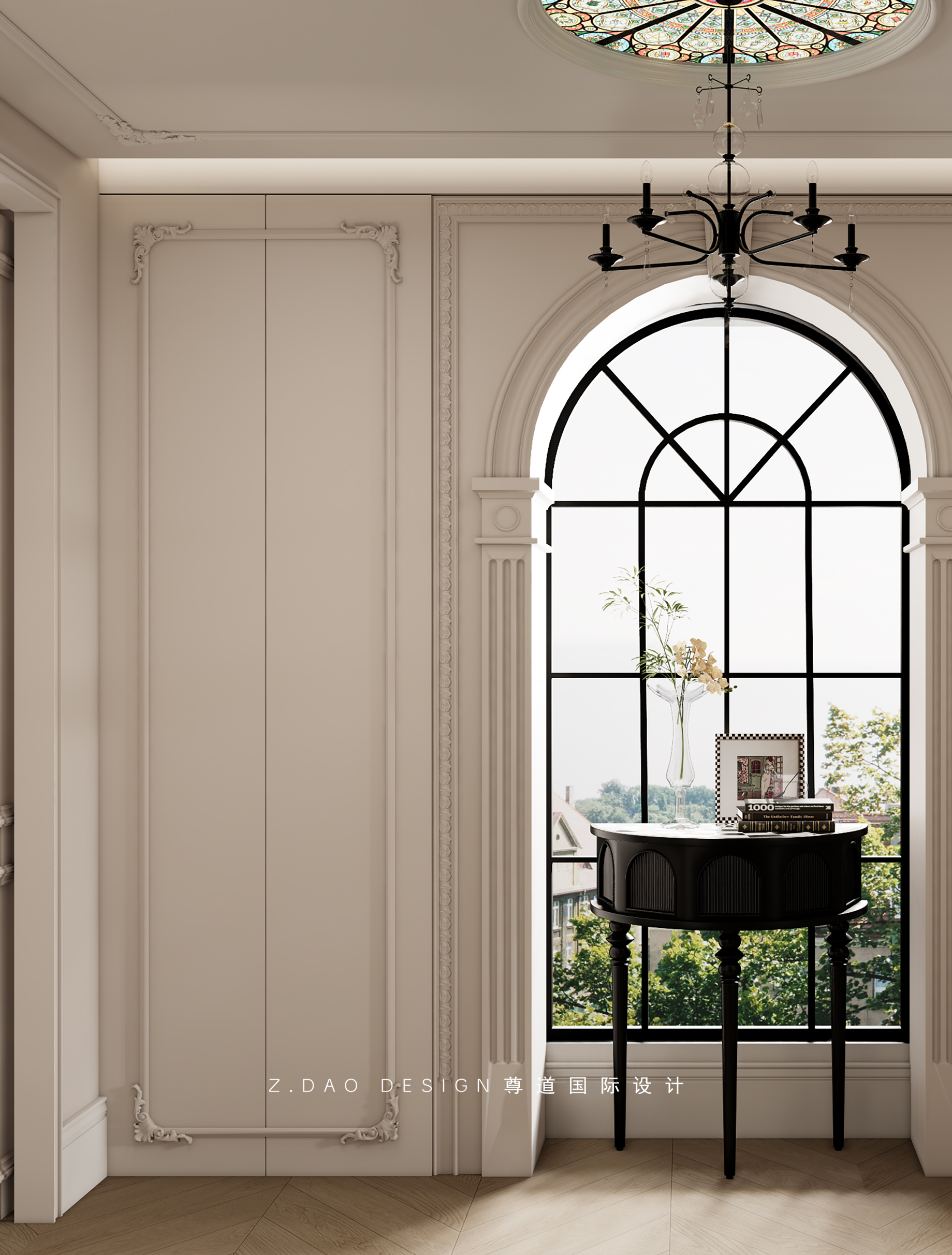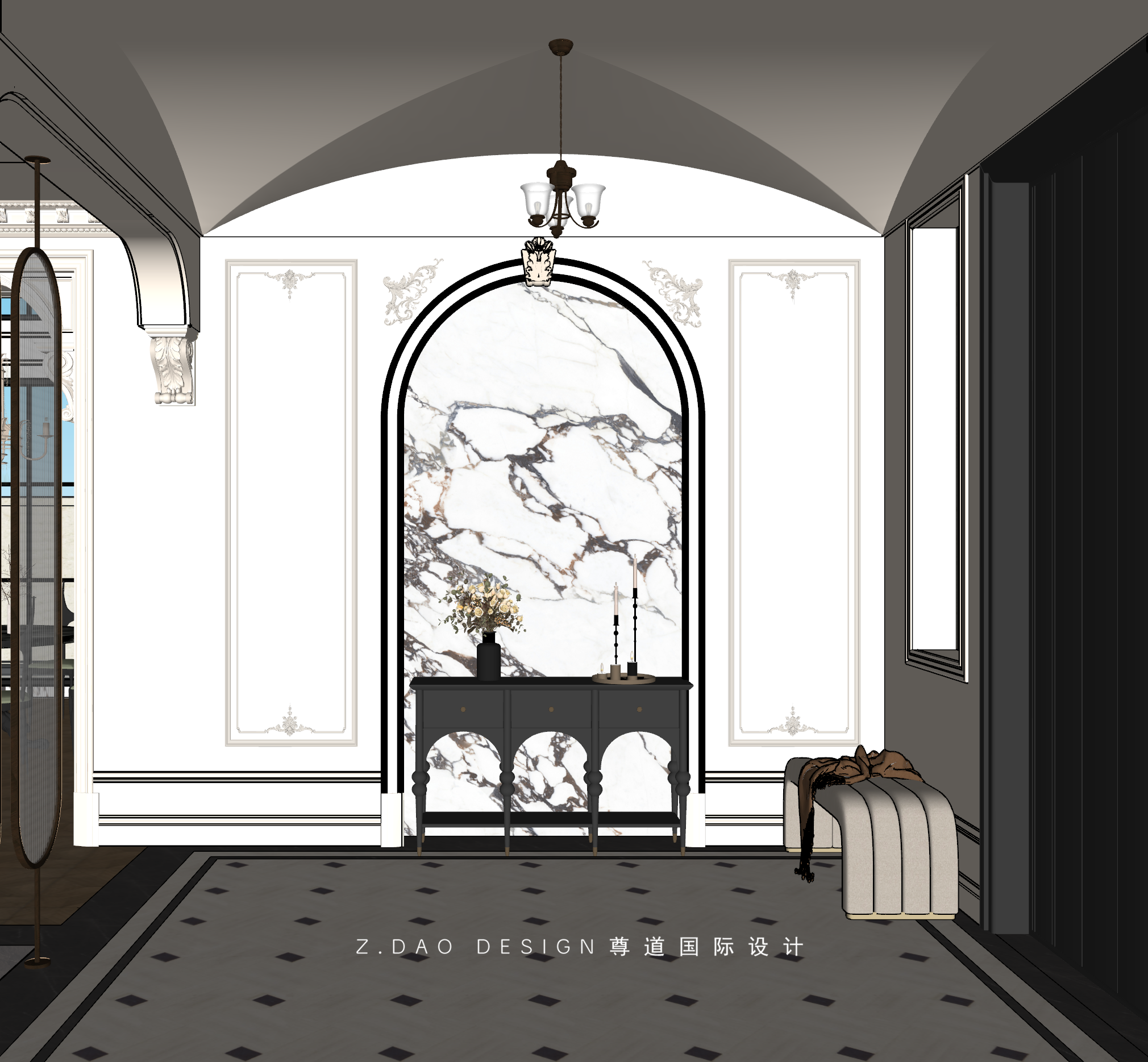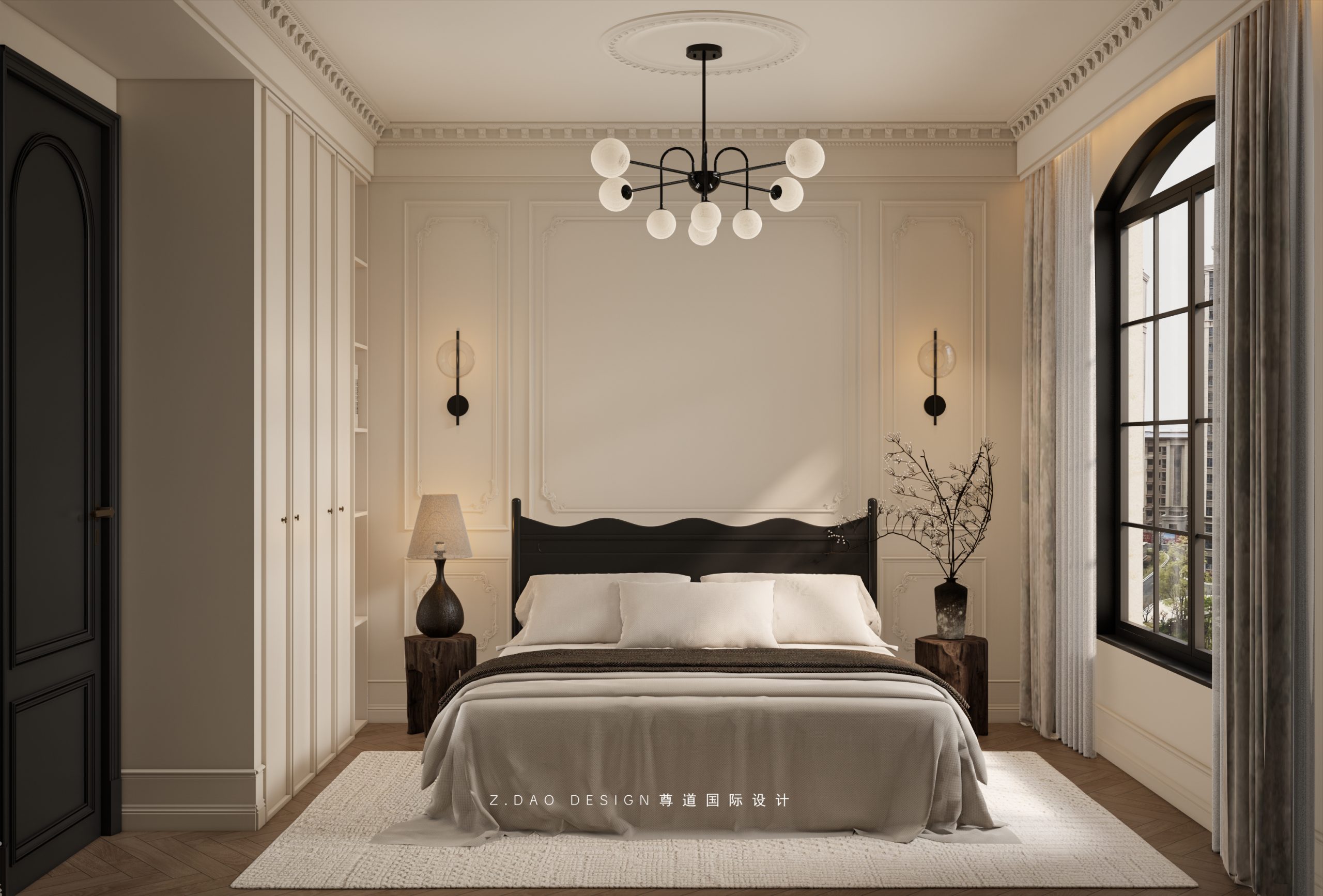 大理石壁炉、黑色曲线栏杆、复古烛台,聚焦于定制拱形天花吊顶,让整体空间既保留古典法式经久耐看的标志性元素,又融入现代的时尚趋势。
