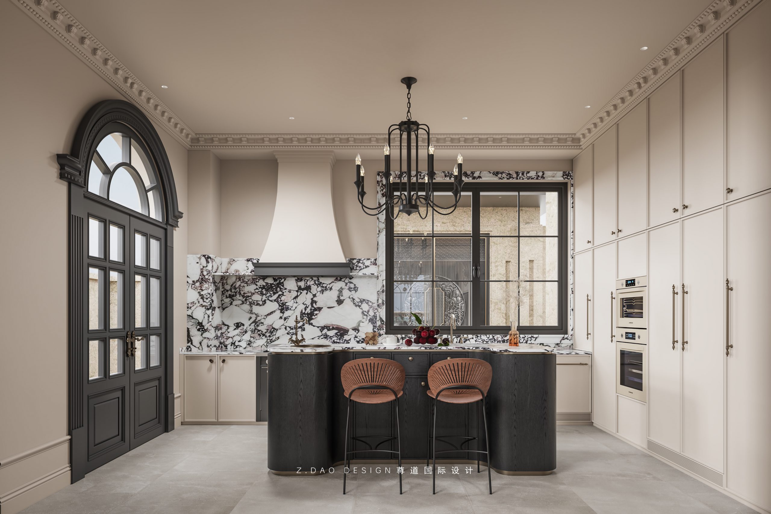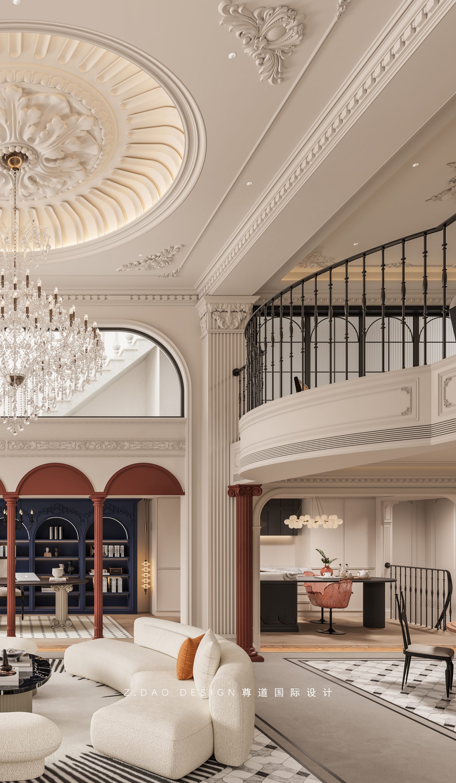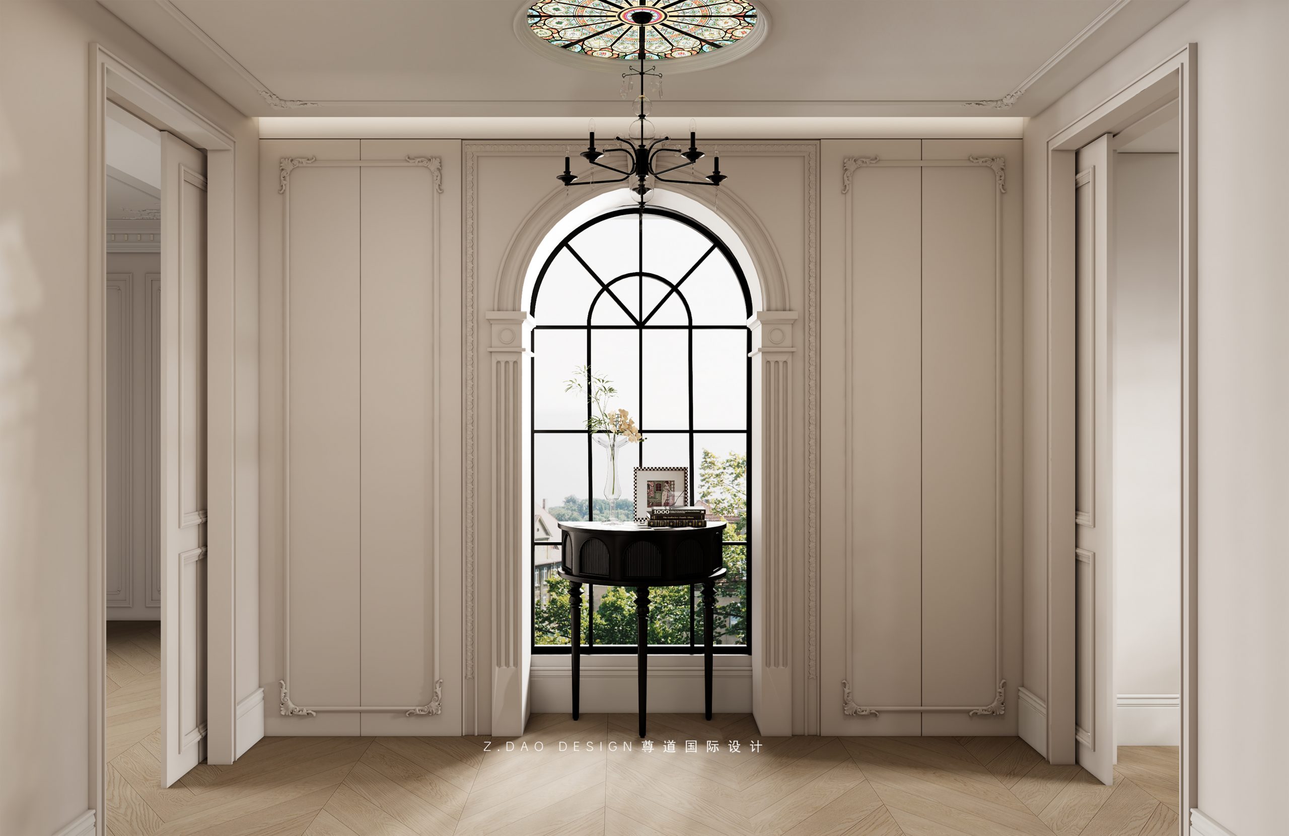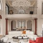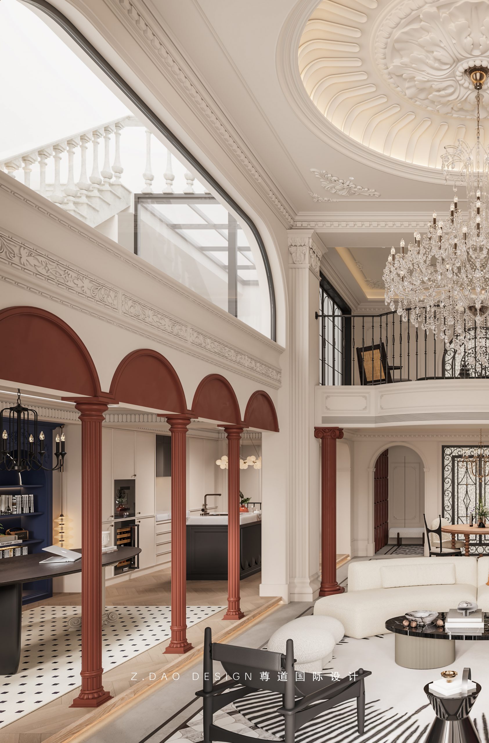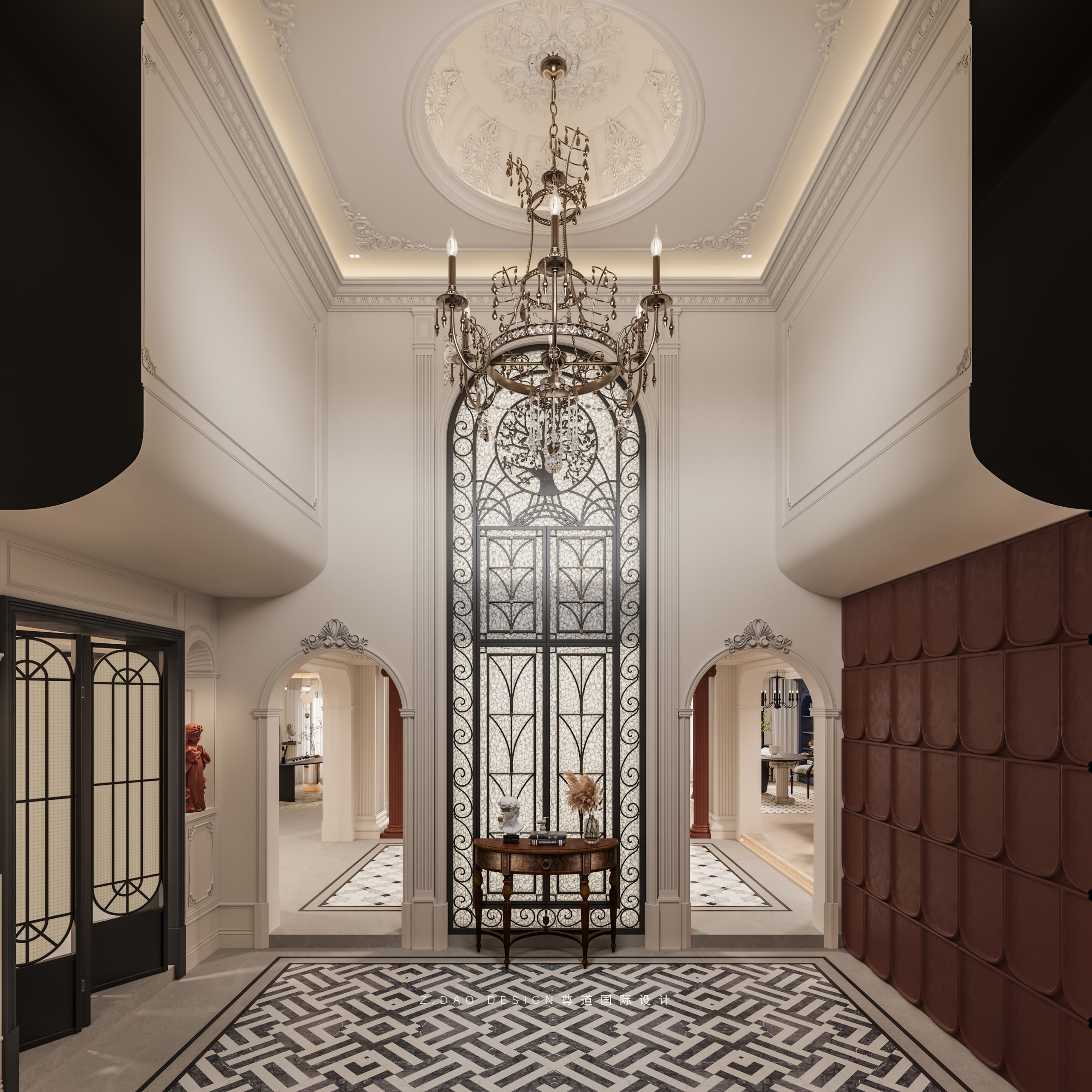 大理石壁炉、黑色曲线栏杆、复古烛台,聚焦于定制拱形天花吊顶,让整体空间既保留古典法式经久耐看的标志性元素,又融入现代的时尚趋势。