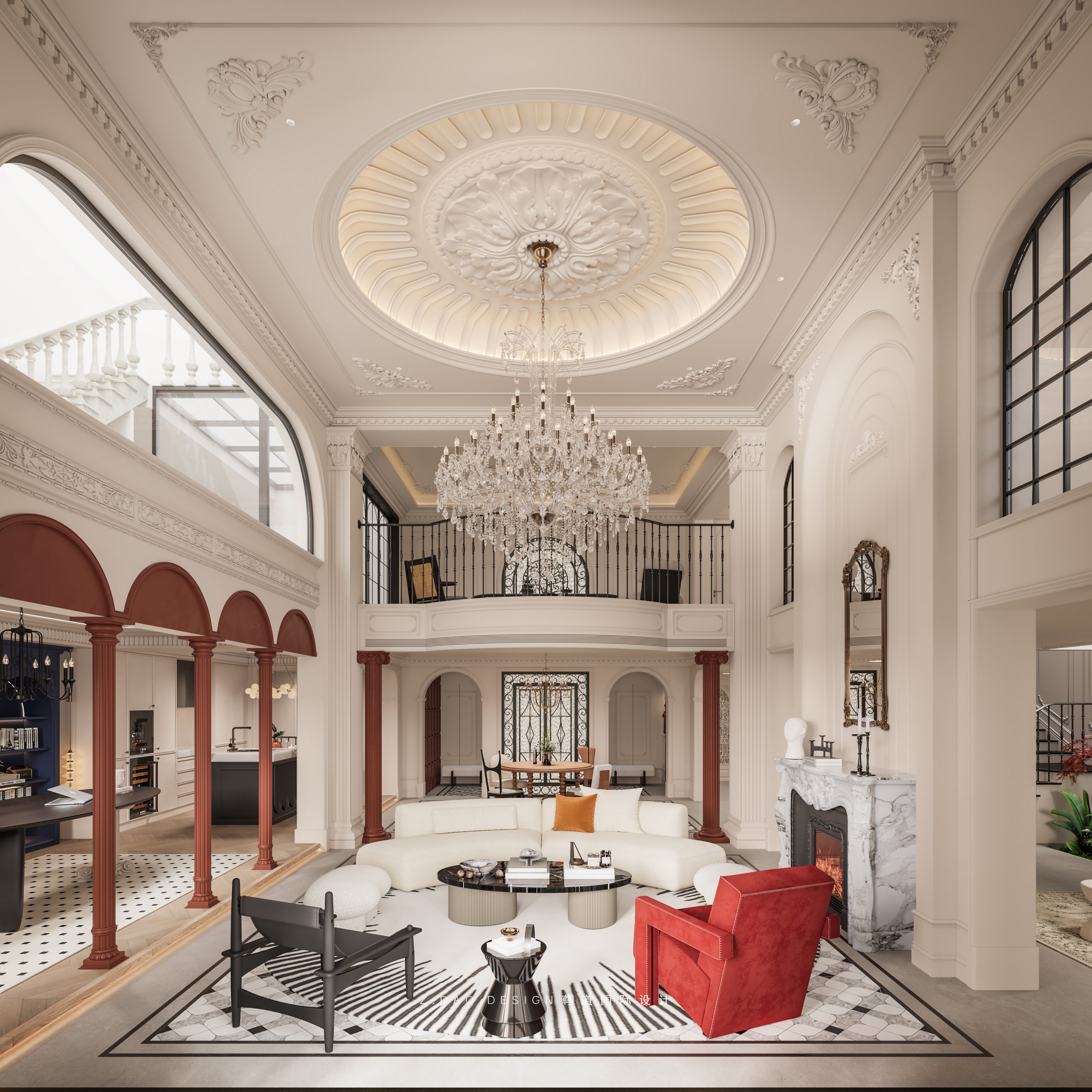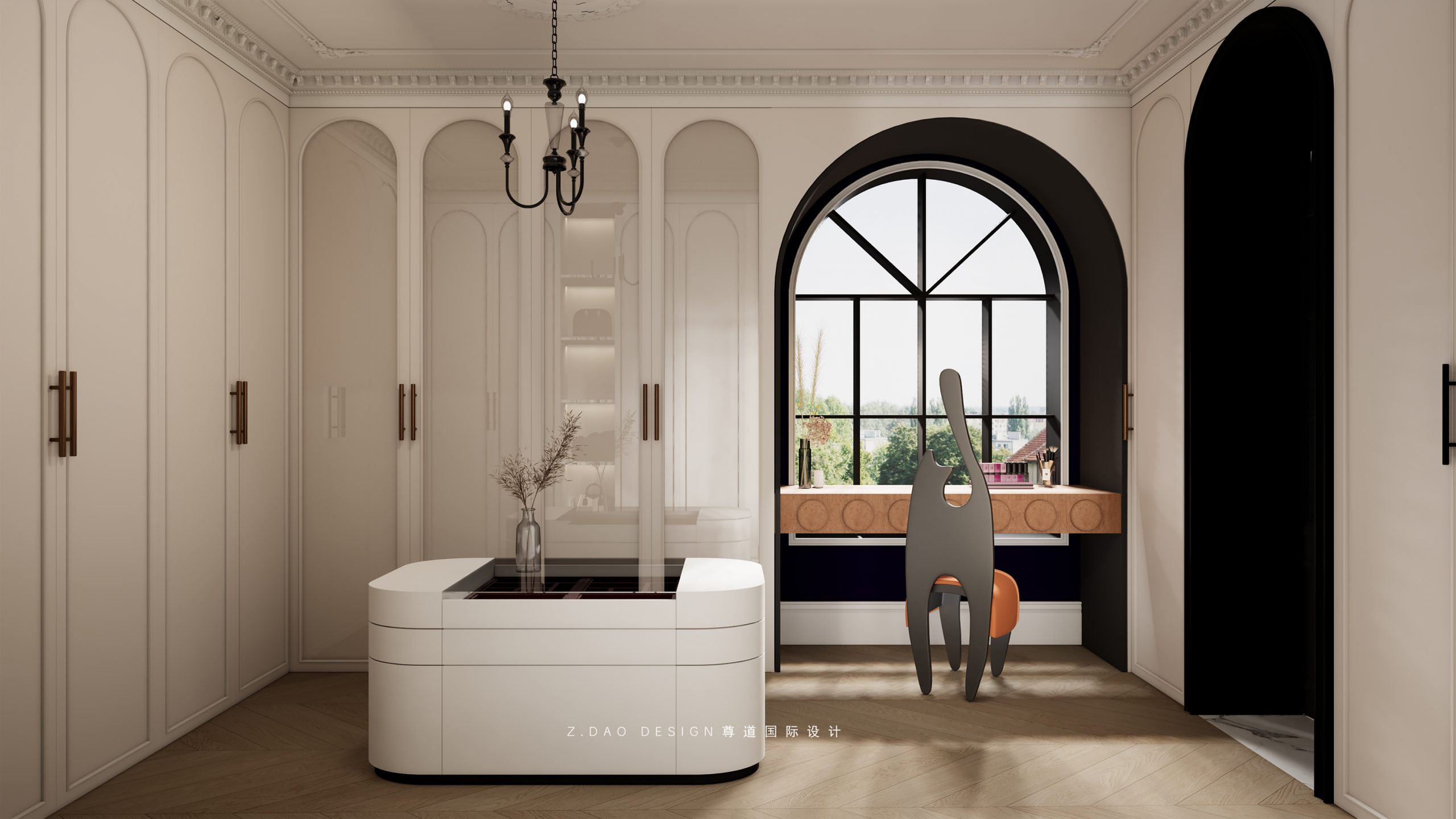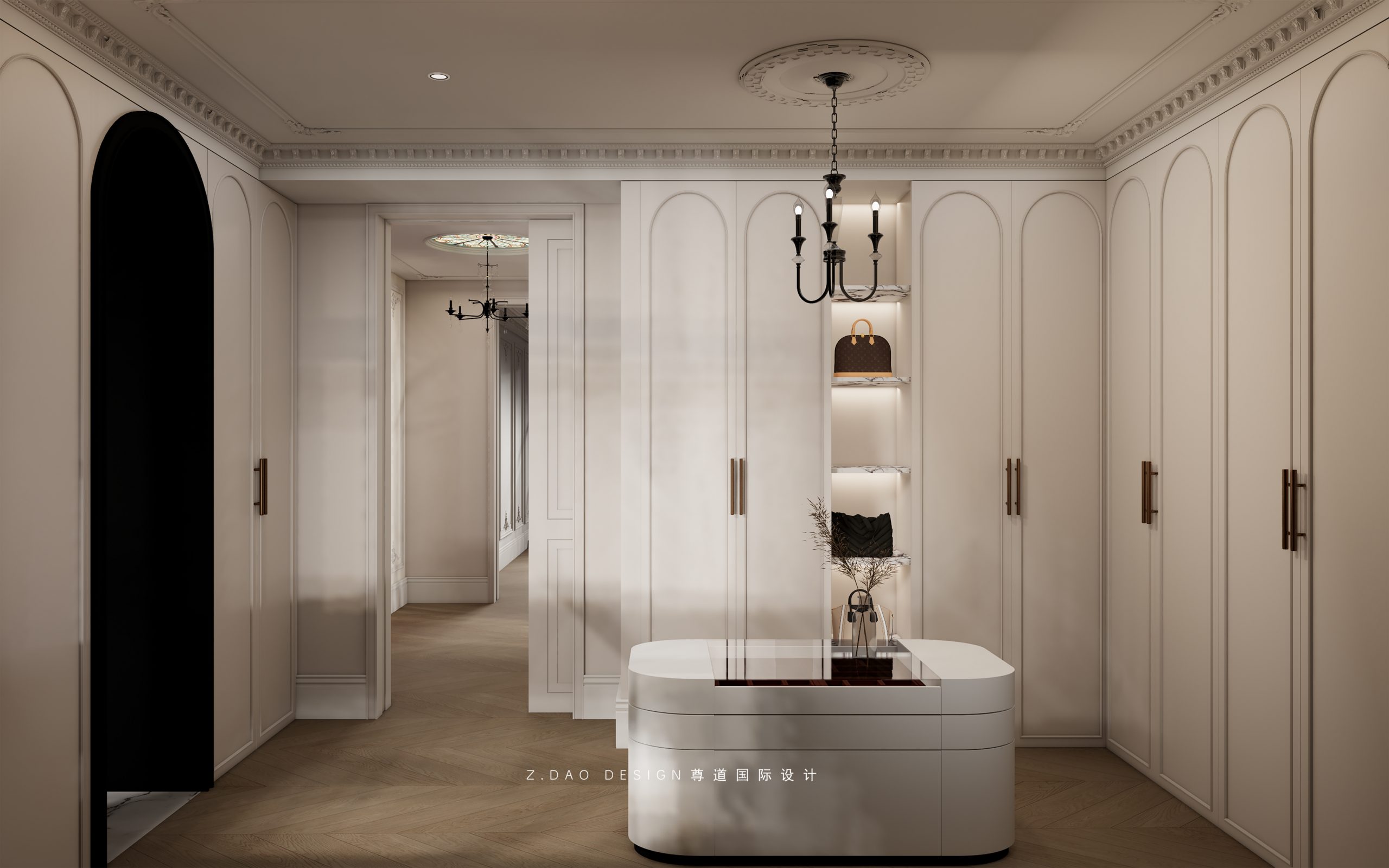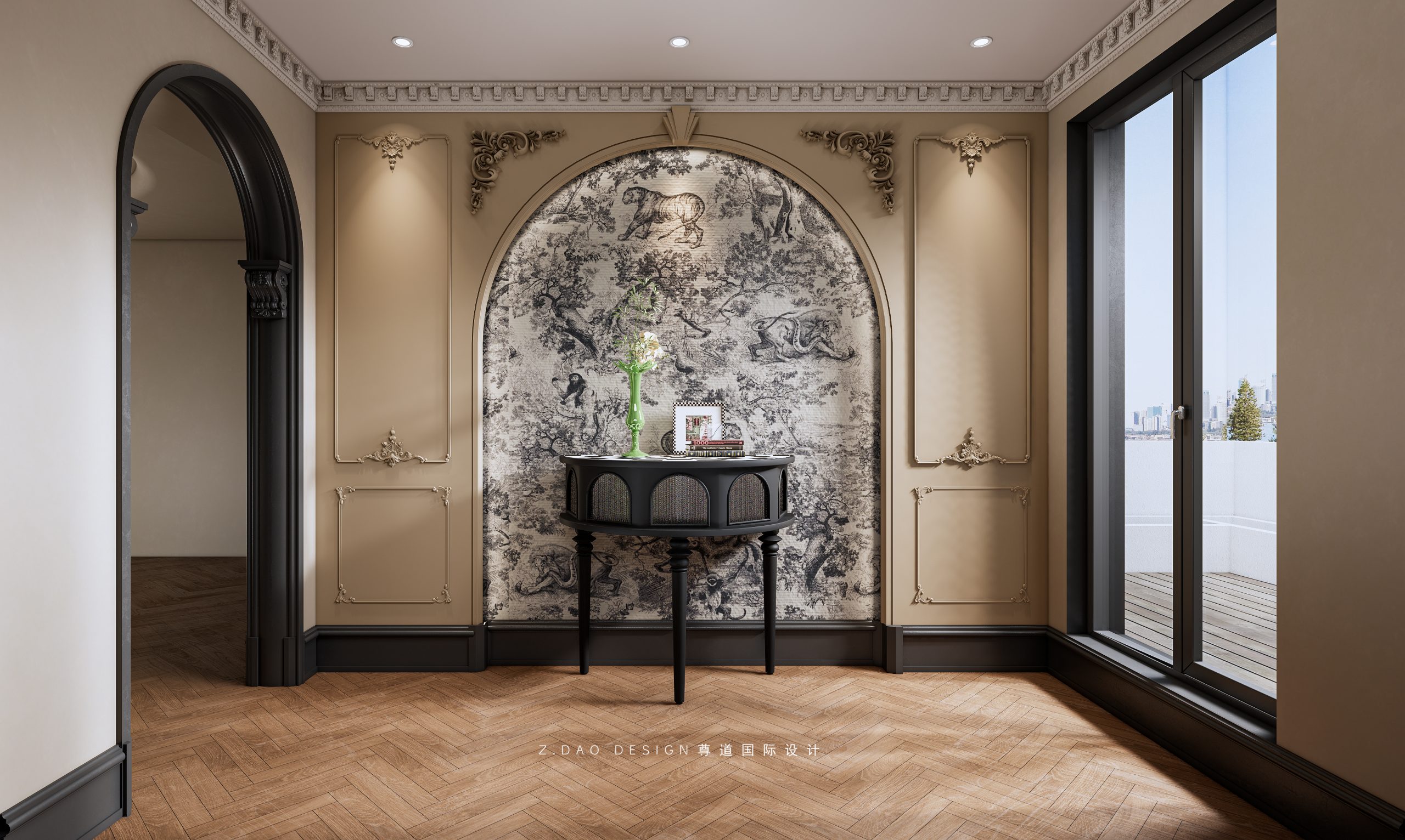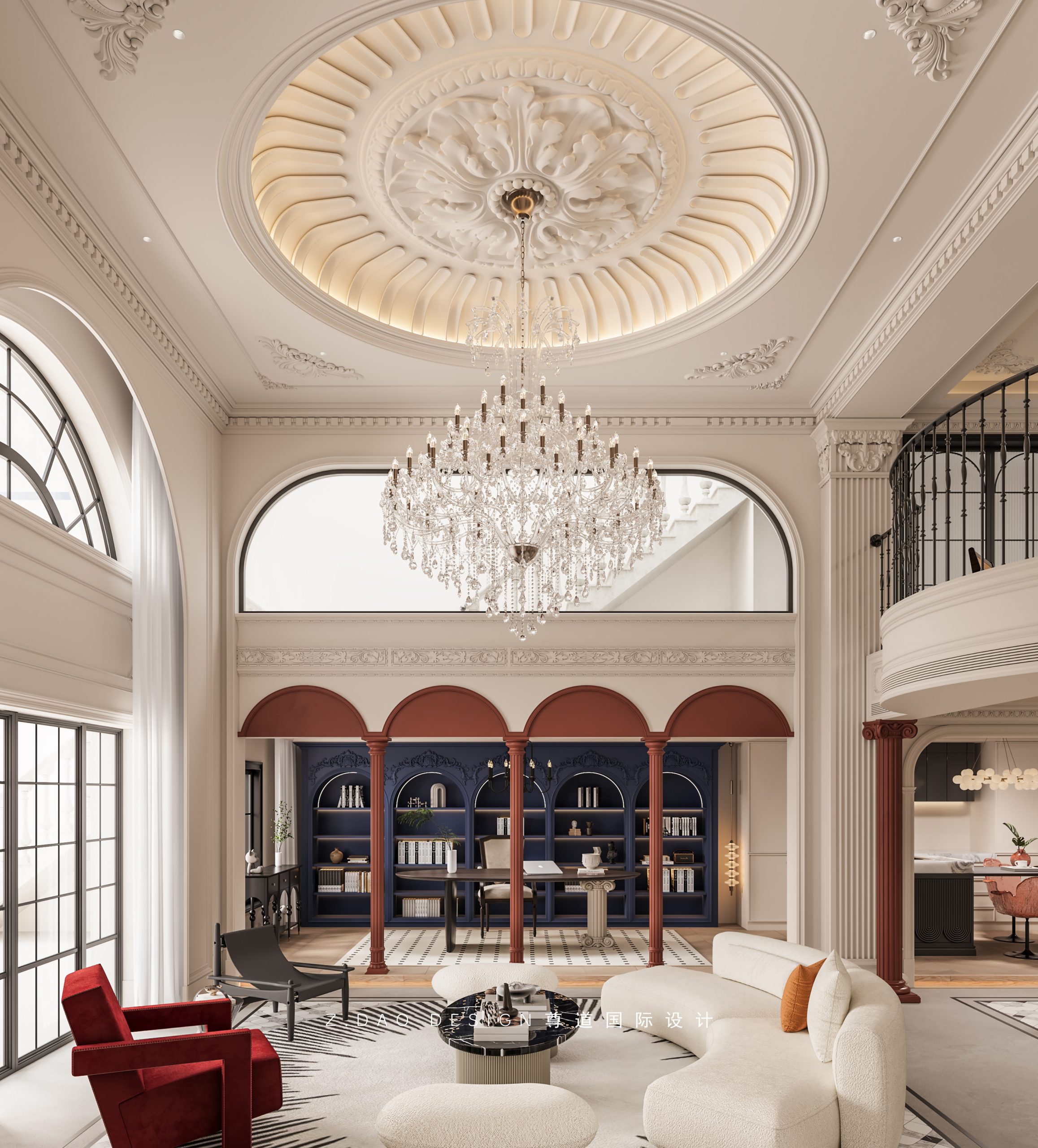 大理石壁炉、黑色曲线栏杆、复古烛台,聚焦于定制拱形天花吊顶,让整体空间既保留古典法式经久耐看的标志性元素,又融入现代的时尚趋势。