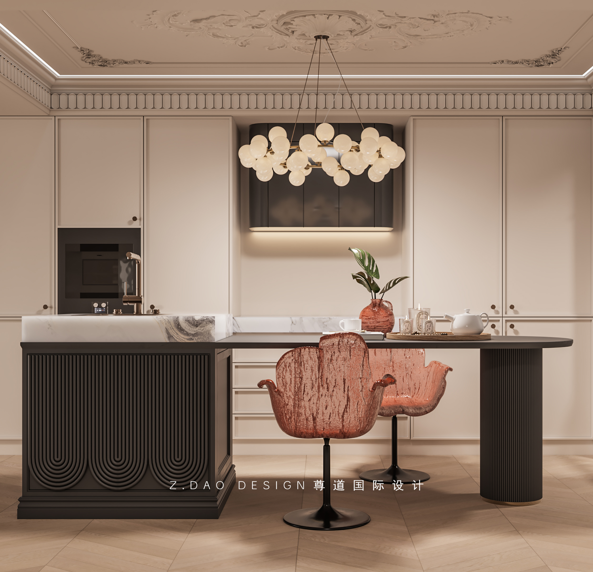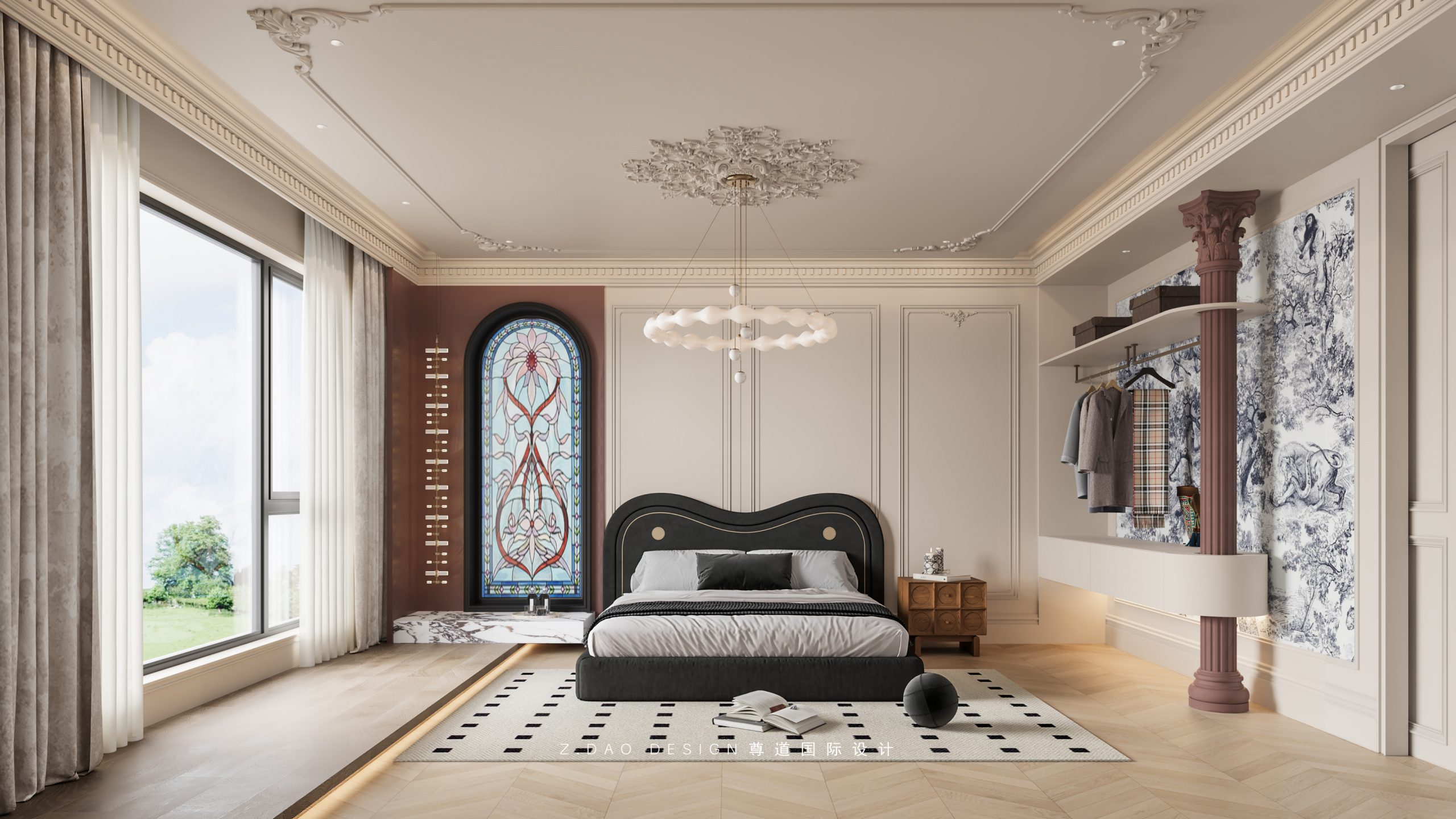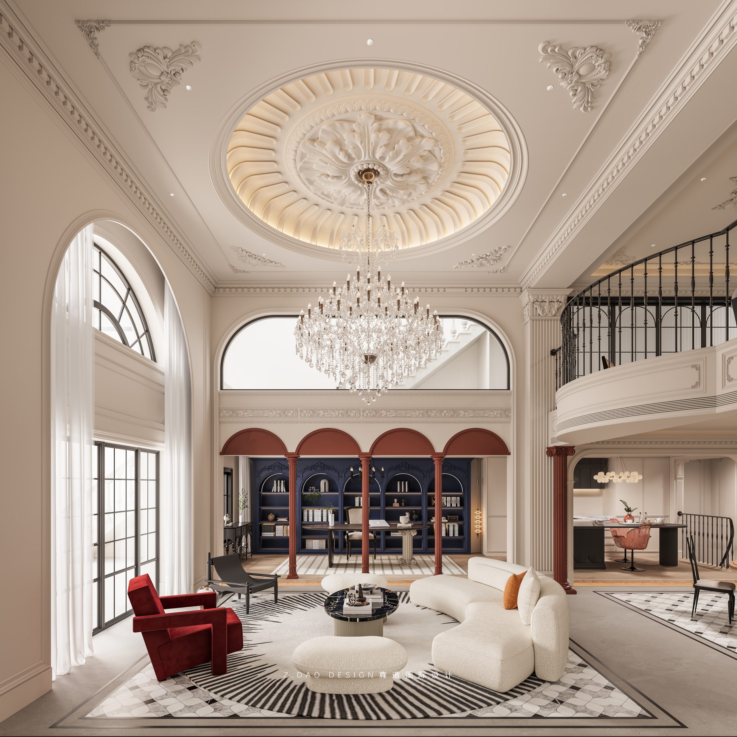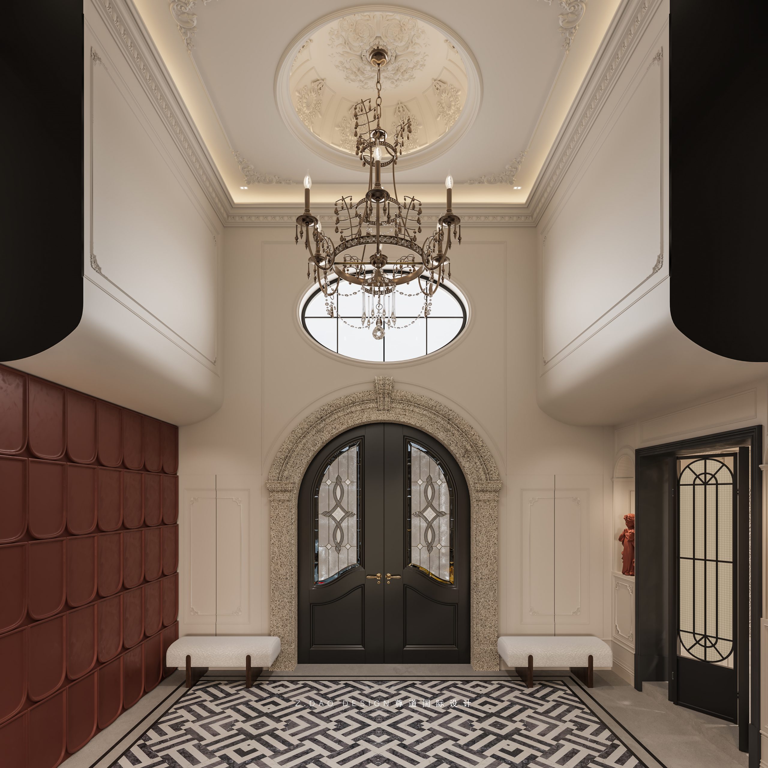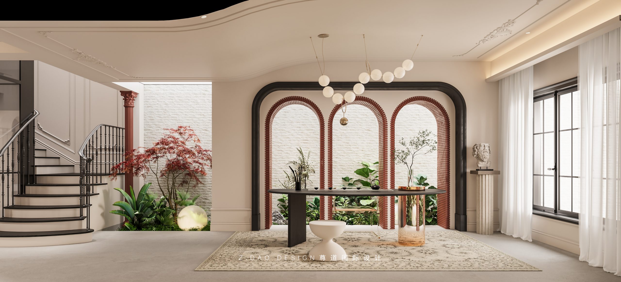 大理石壁炉、黑色曲线栏杆、复古烛台,聚焦于定制拱形天花吊顶,让整体空间既保留古典法式经久耐看的标志性元素,又融入现代的时尚趋势。