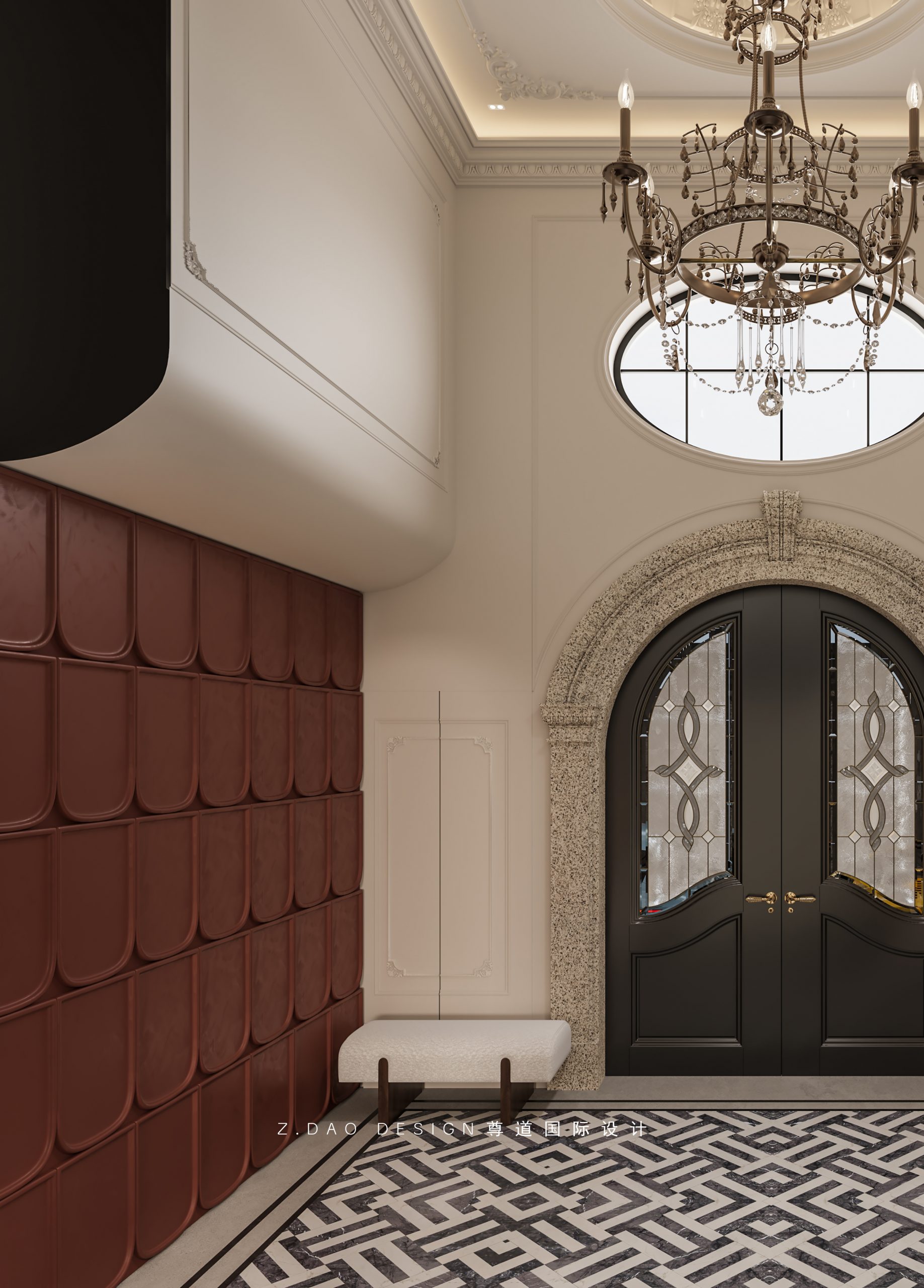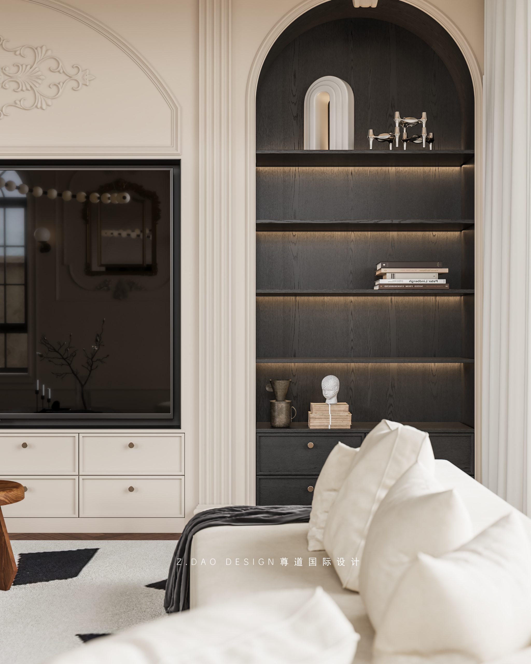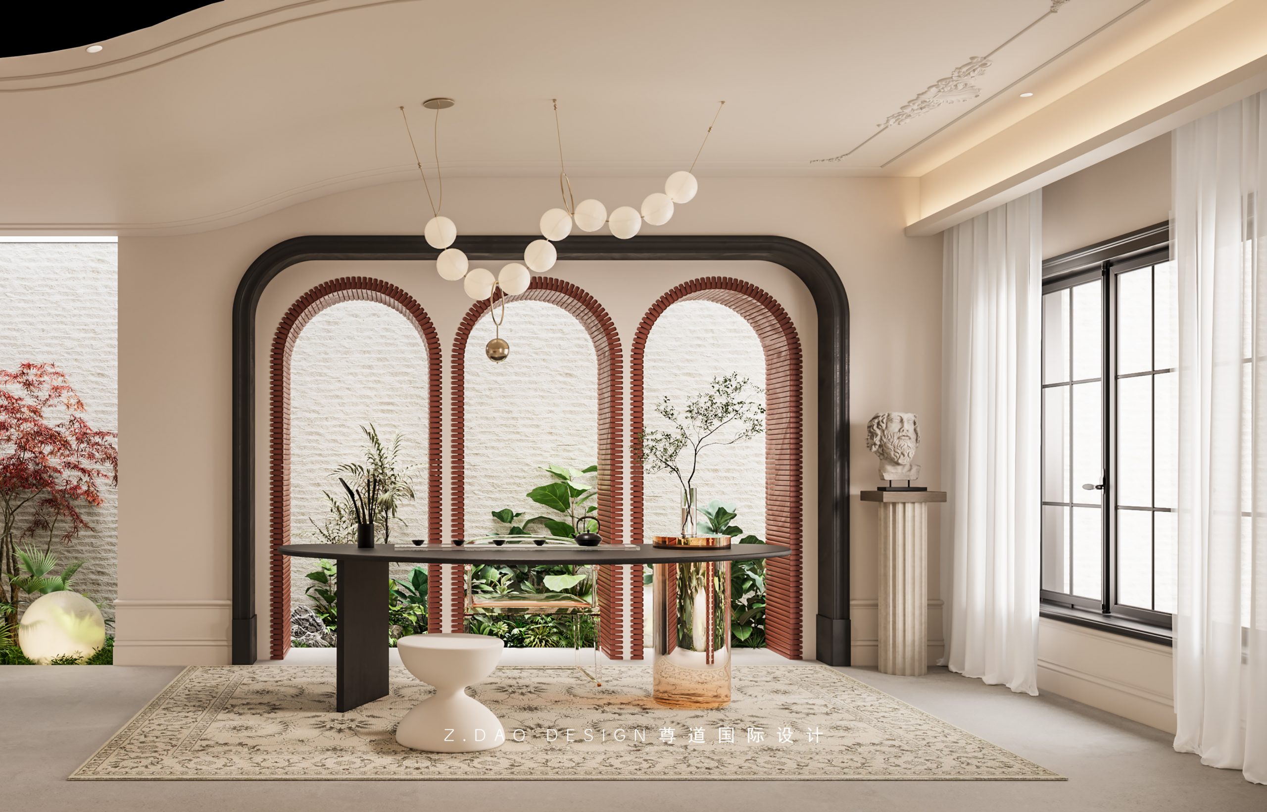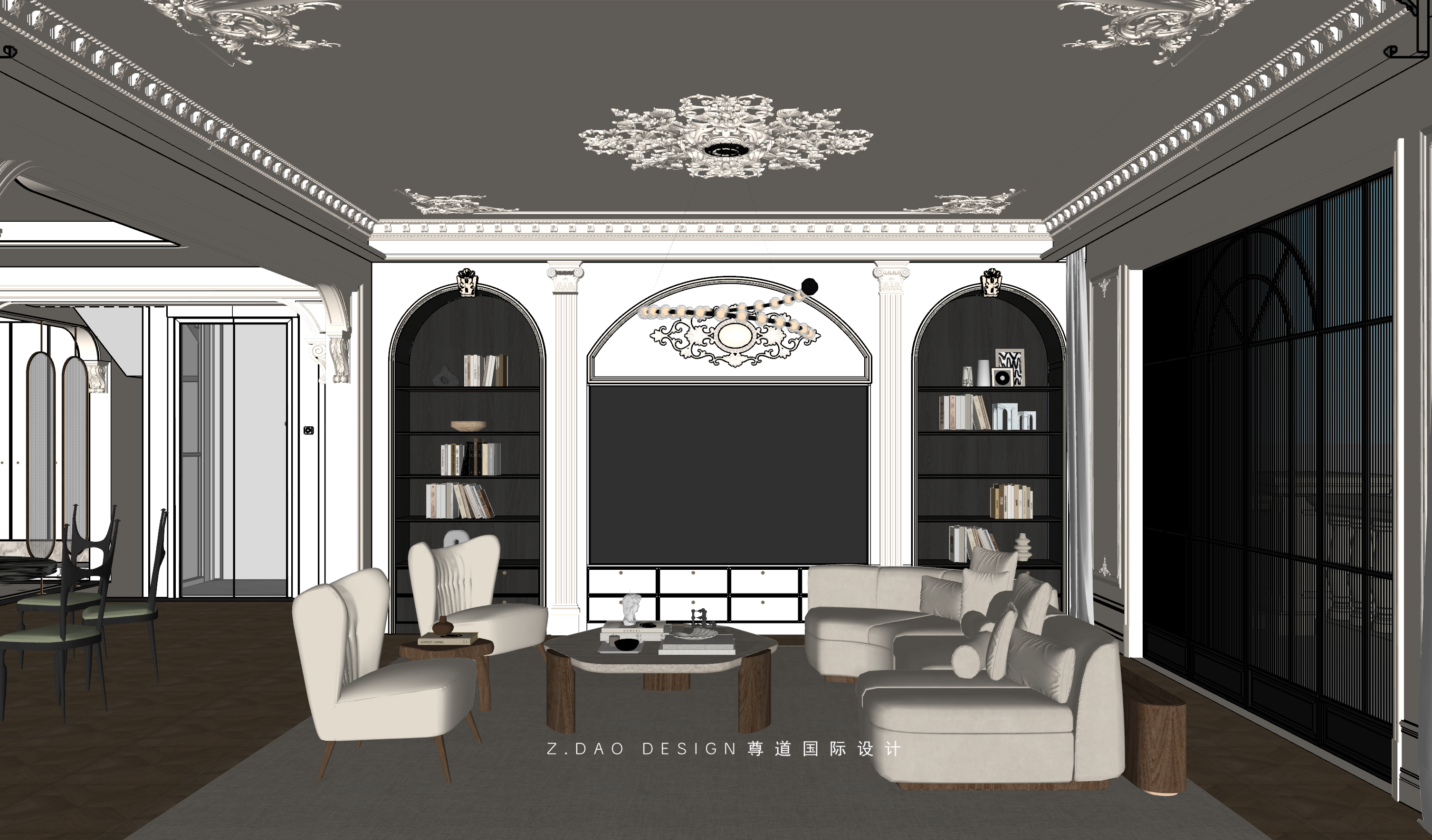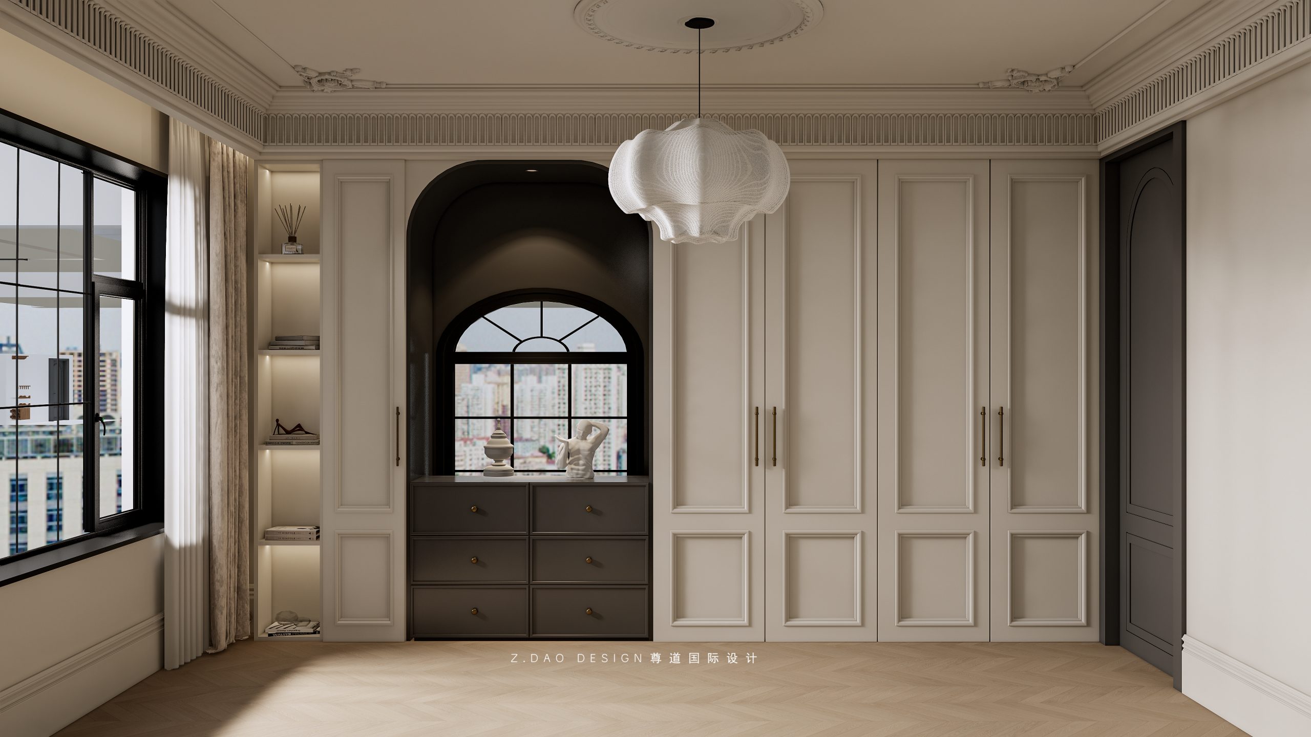 大理石壁炉、黑色曲线栏杆、复古烛台,聚焦于定制拱形天花吊顶,让整体空间既保留古典法式经久耐看的标志性元素,又融入现代的时尚趋势。