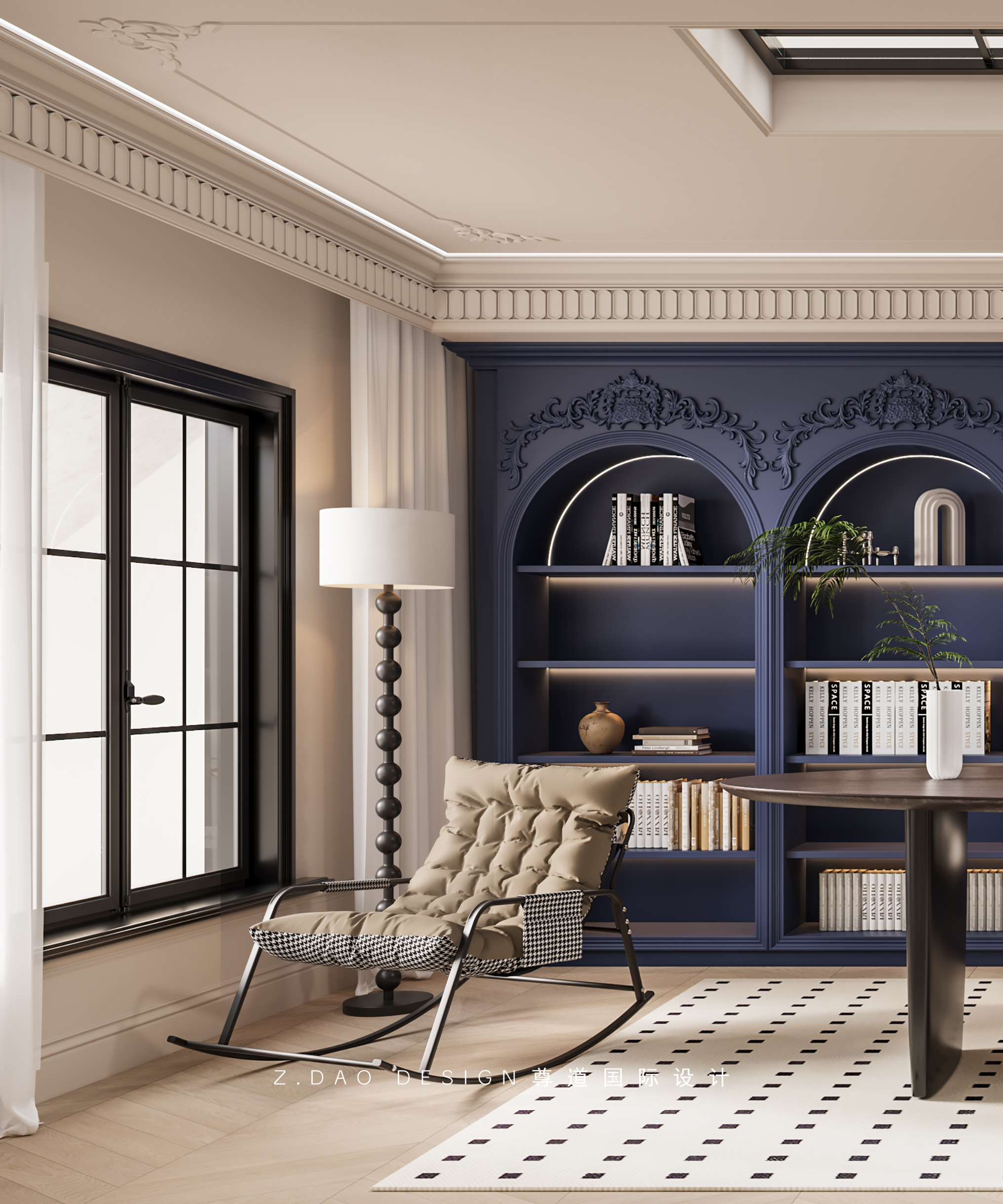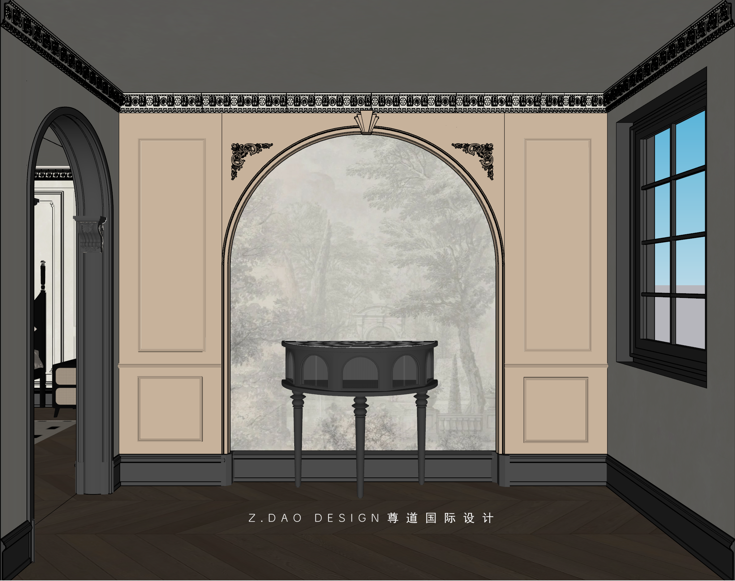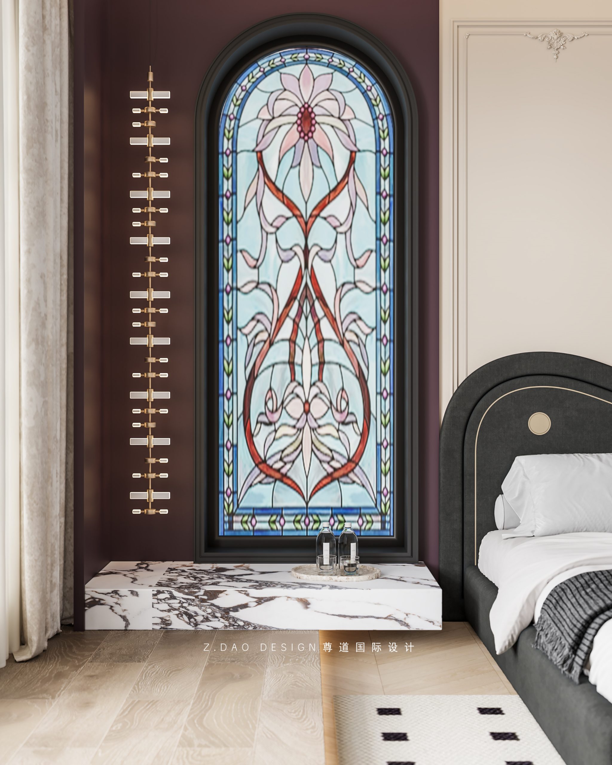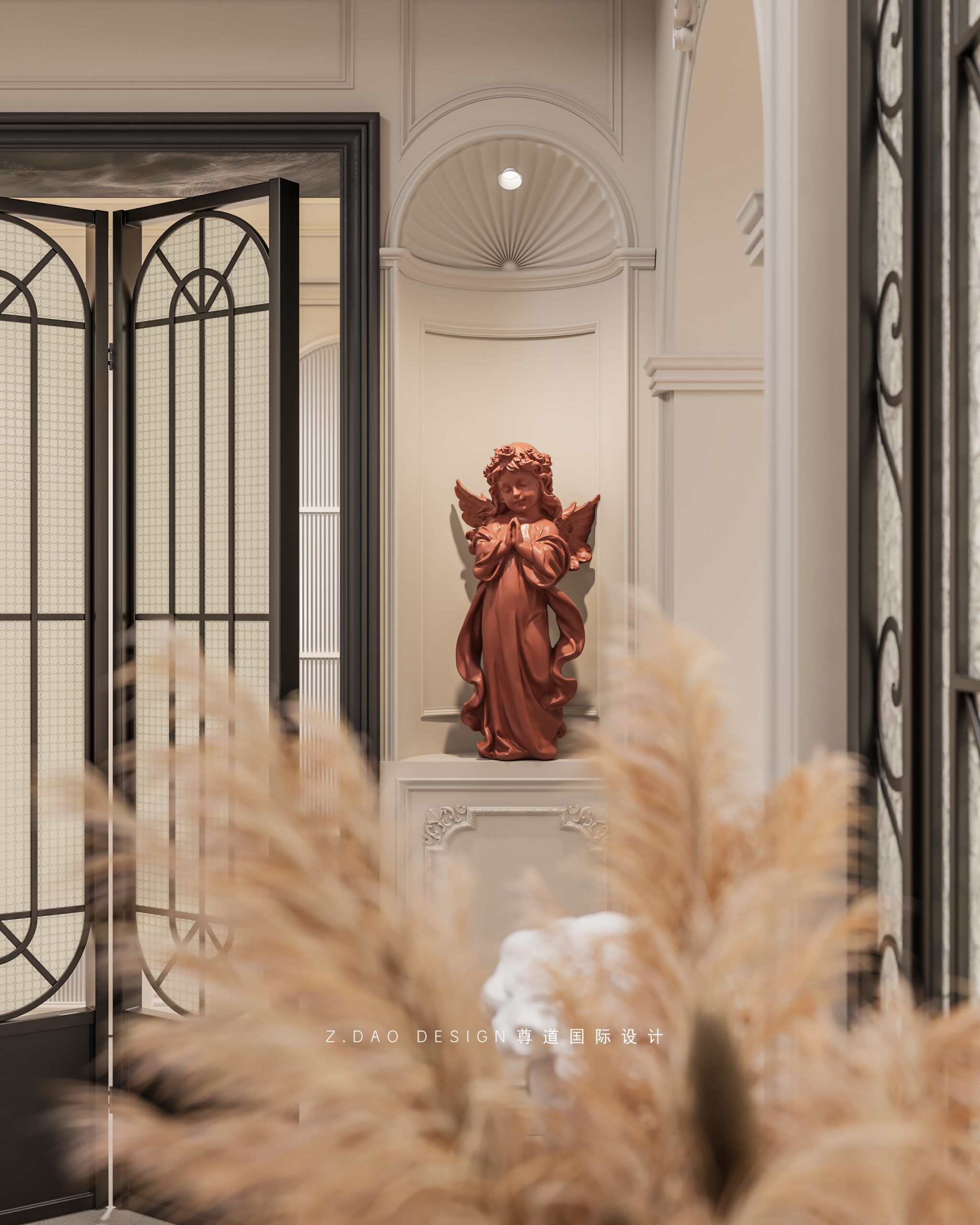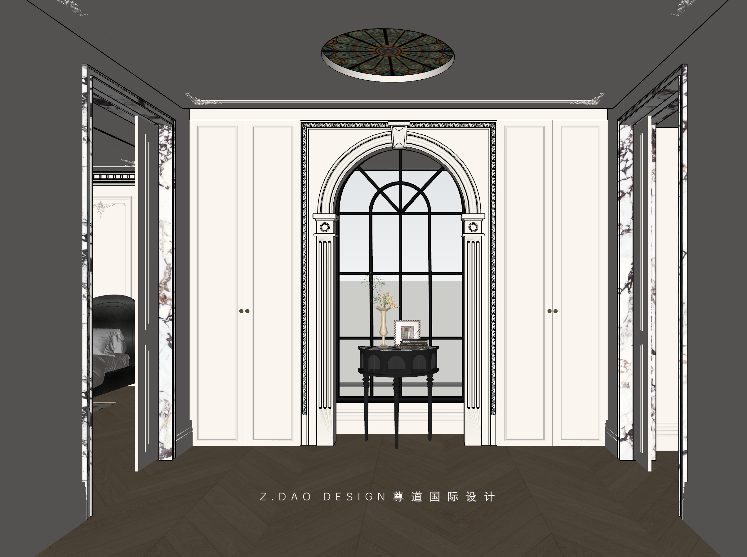 大理石壁炉、黑色曲线栏杆、复古烛台,聚焦于定制拱形天花吊顶,让整体空间既保留古典法式经久耐看的标志性元素,又融入现代的时尚趋势。