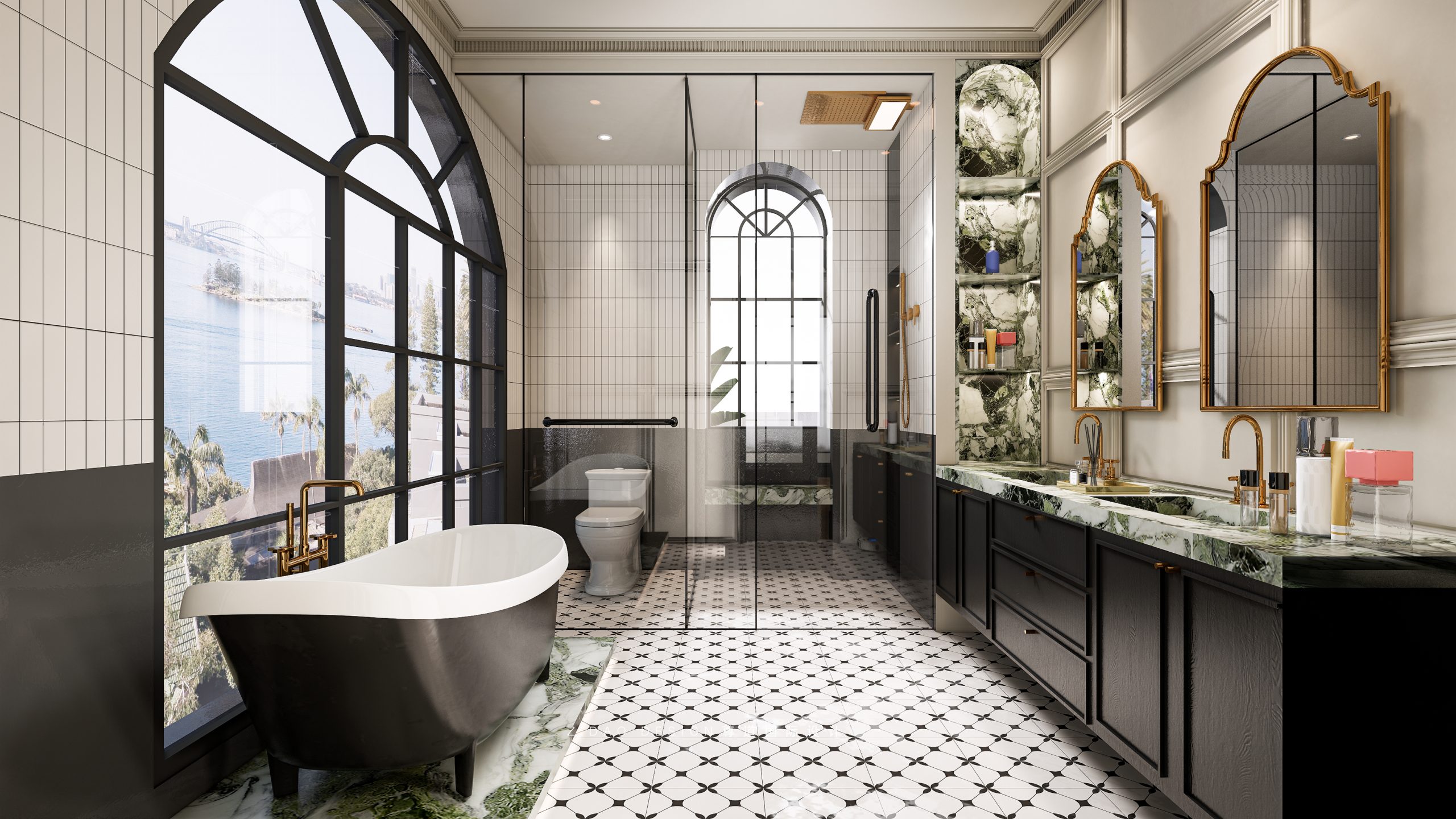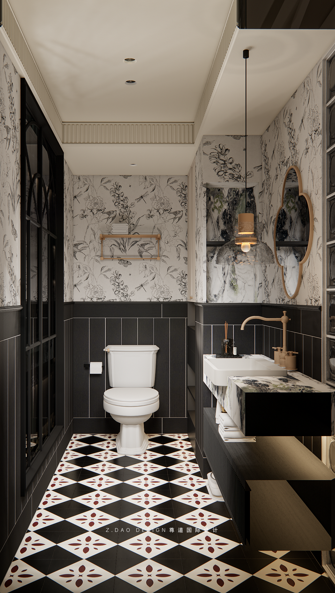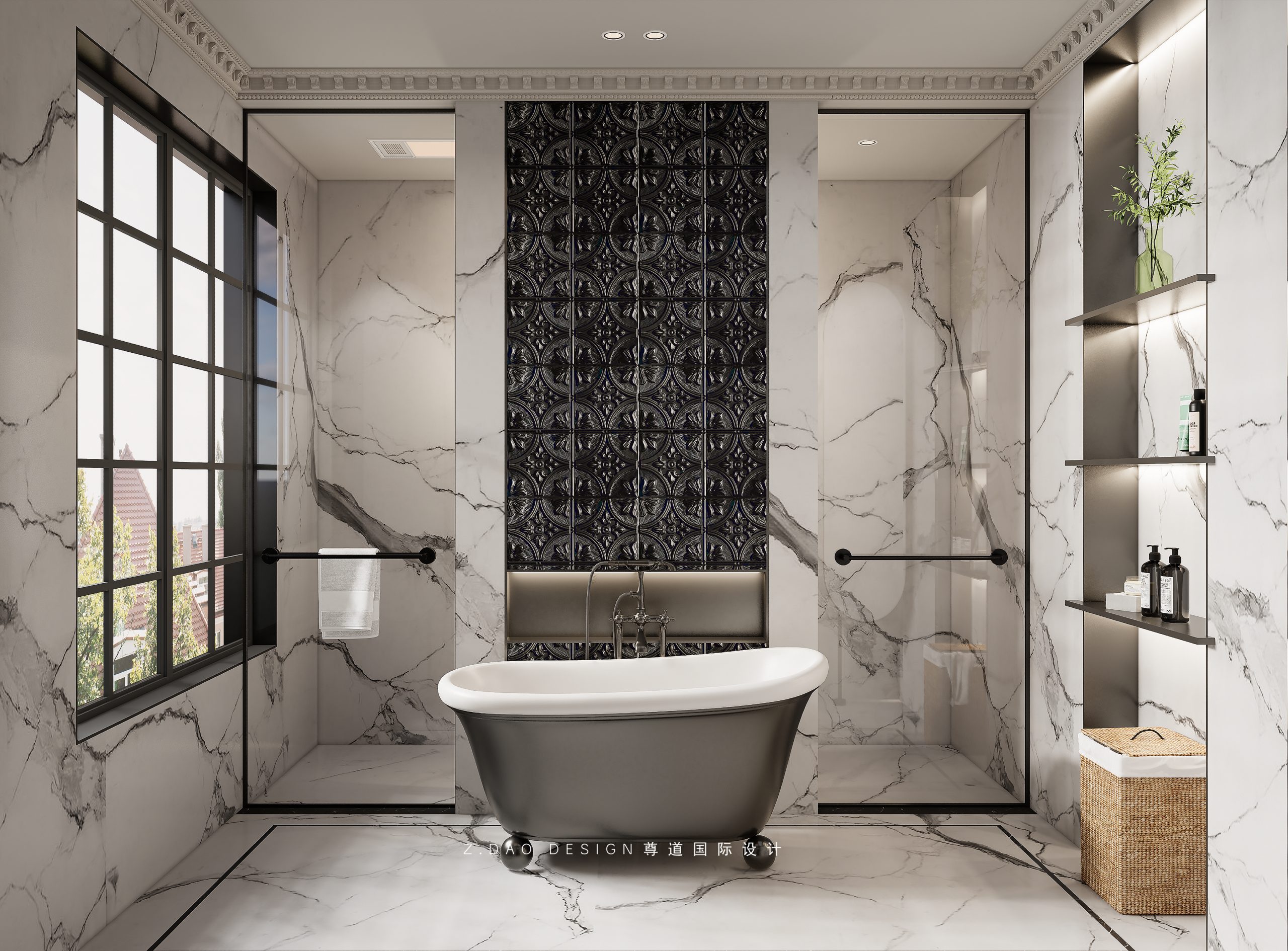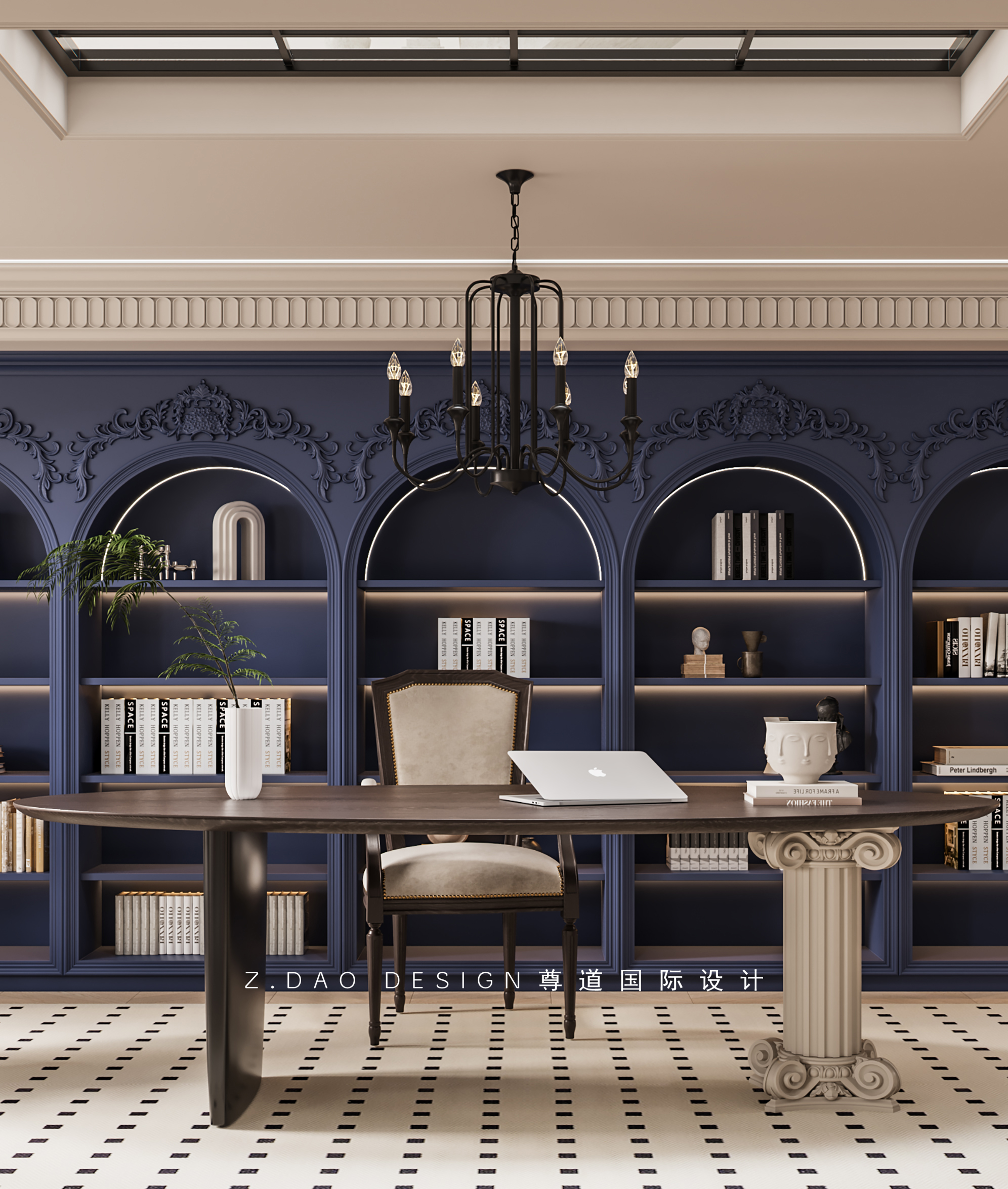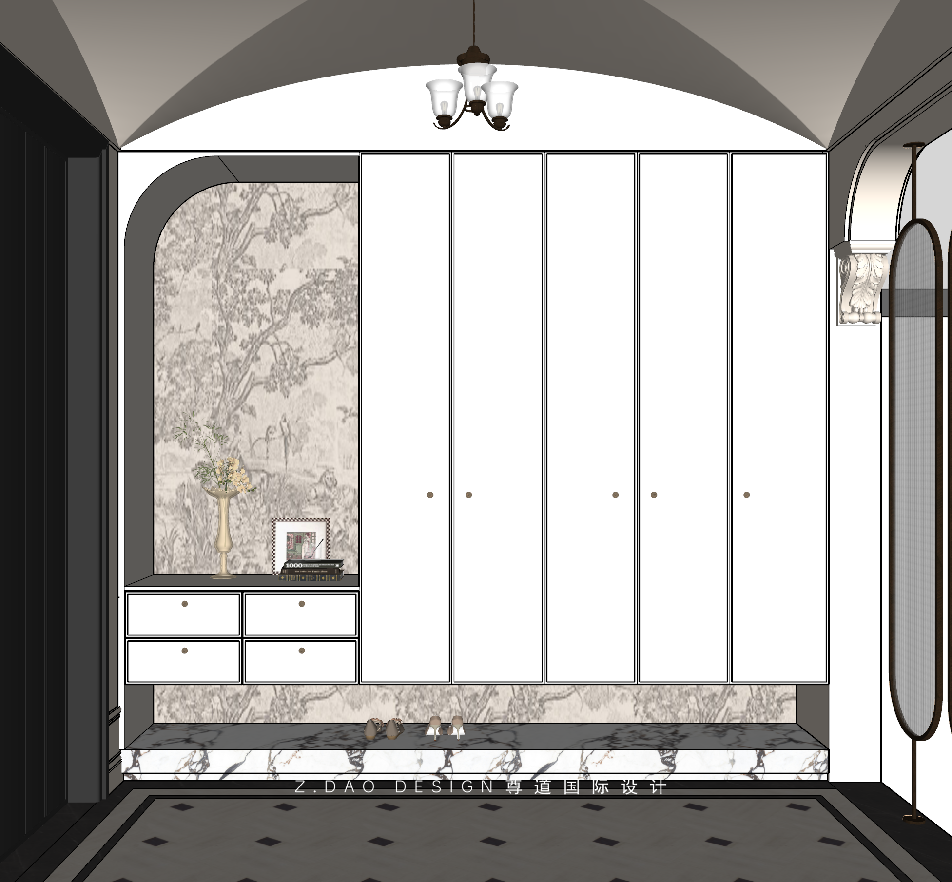 大理石壁炉、黑色曲线栏杆、复古烛台,聚焦于定制拱形天花吊顶,让整体空间既保留古典法式经久耐看的标志性元素,又融入现代的时尚趋势。