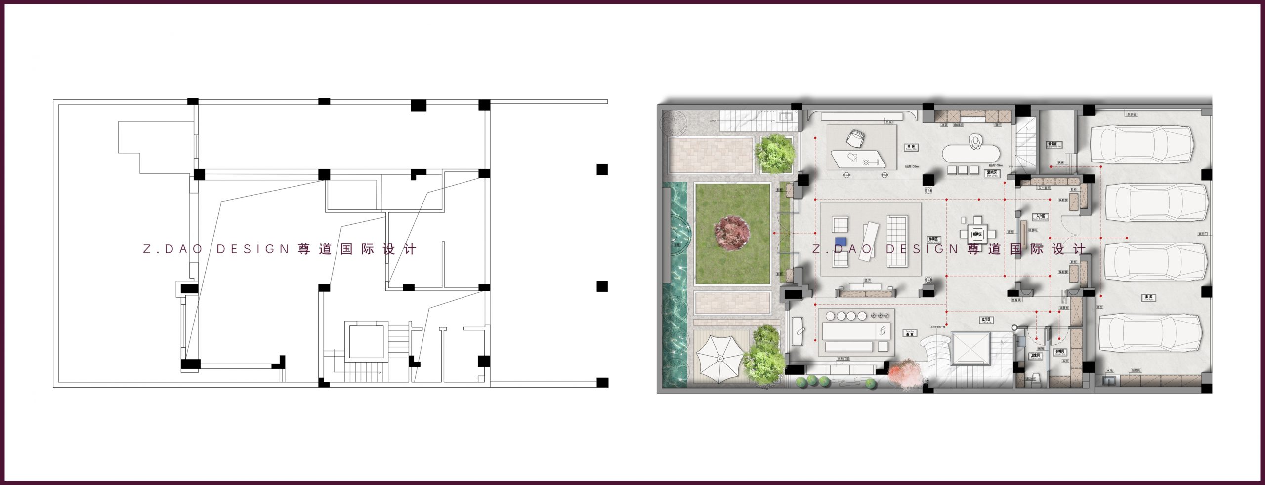 1、设计师将车库与室内相连墙体拆除,往室内内退20公分,扩大车库的纵深,保证每一辆车都能进入车库;