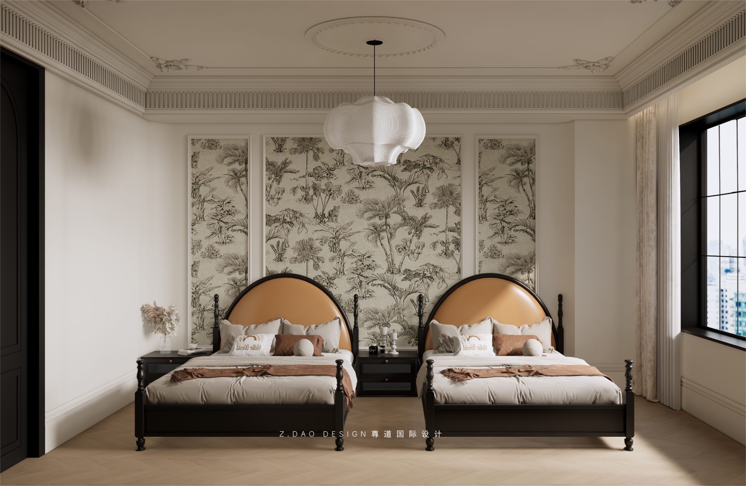 床头背景用简单的pu线对称搭配墙布设计,涂刷低饱和度的暖白色,赋予空间浪漫优雅的气质,顶面采用法式风情的浮雕线条,搭配莲花造型的吊灯,营造浪漫优雅的睡眠氛围。