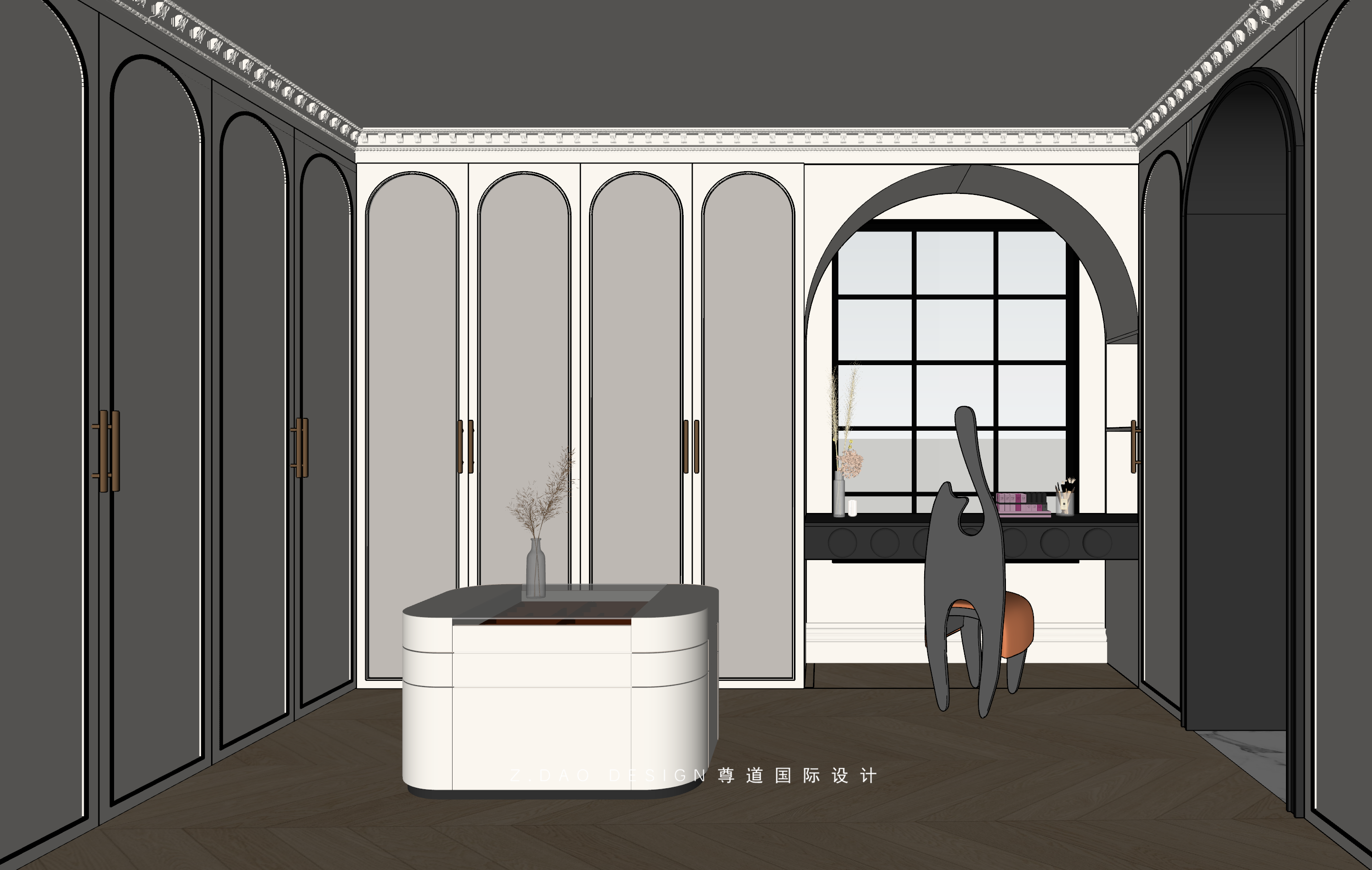 整个衣帽间空间布局成“U”型步入式,靠窗区域定做梳妆台,混油+简单拱形线条,衣帽间香香软软,温暖治愈。利用中间区域定制岛台,侧边做多层抽屉,收纳日常饰品,日常拿取方便,干净整洁节省空间,好看又实用。