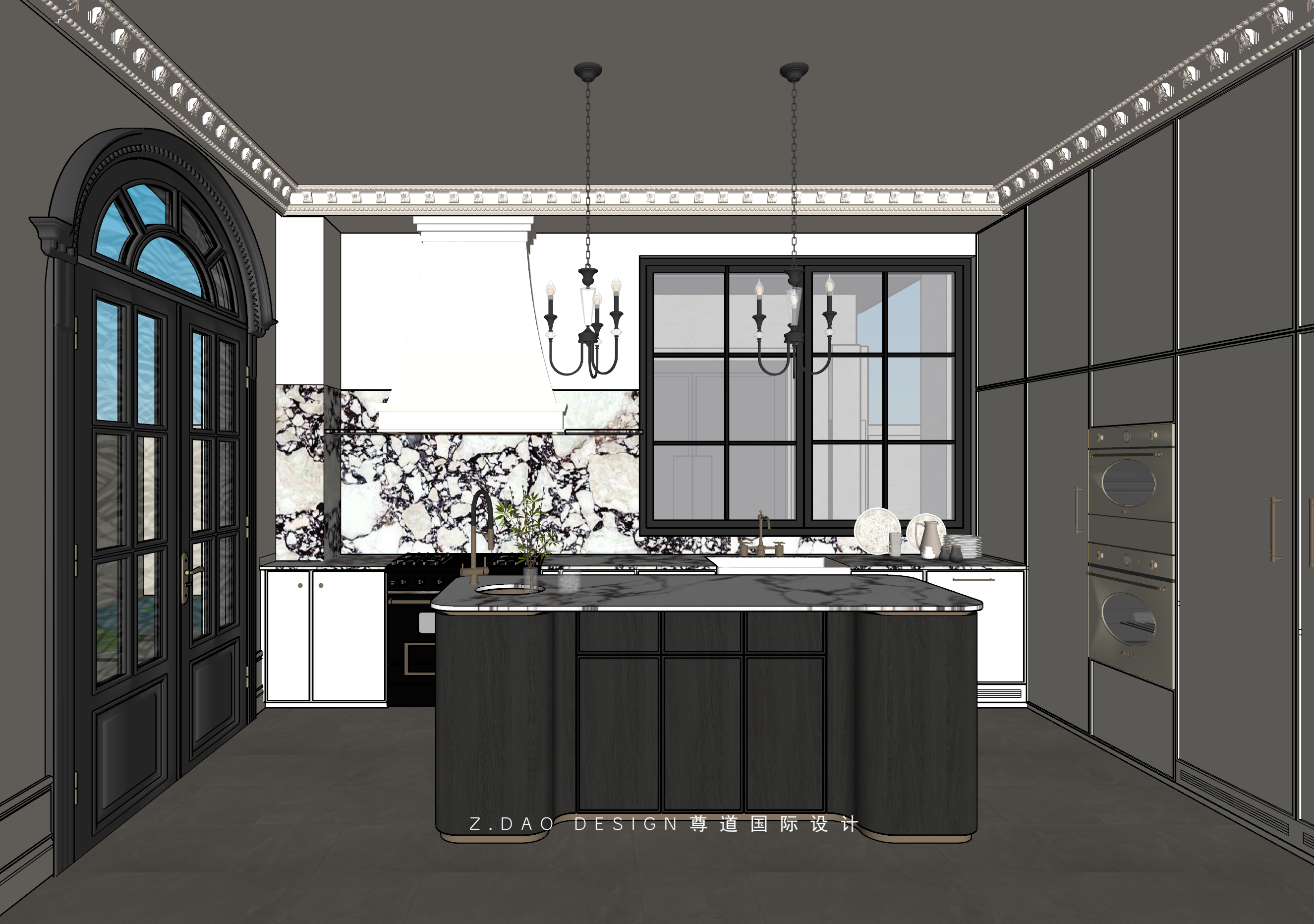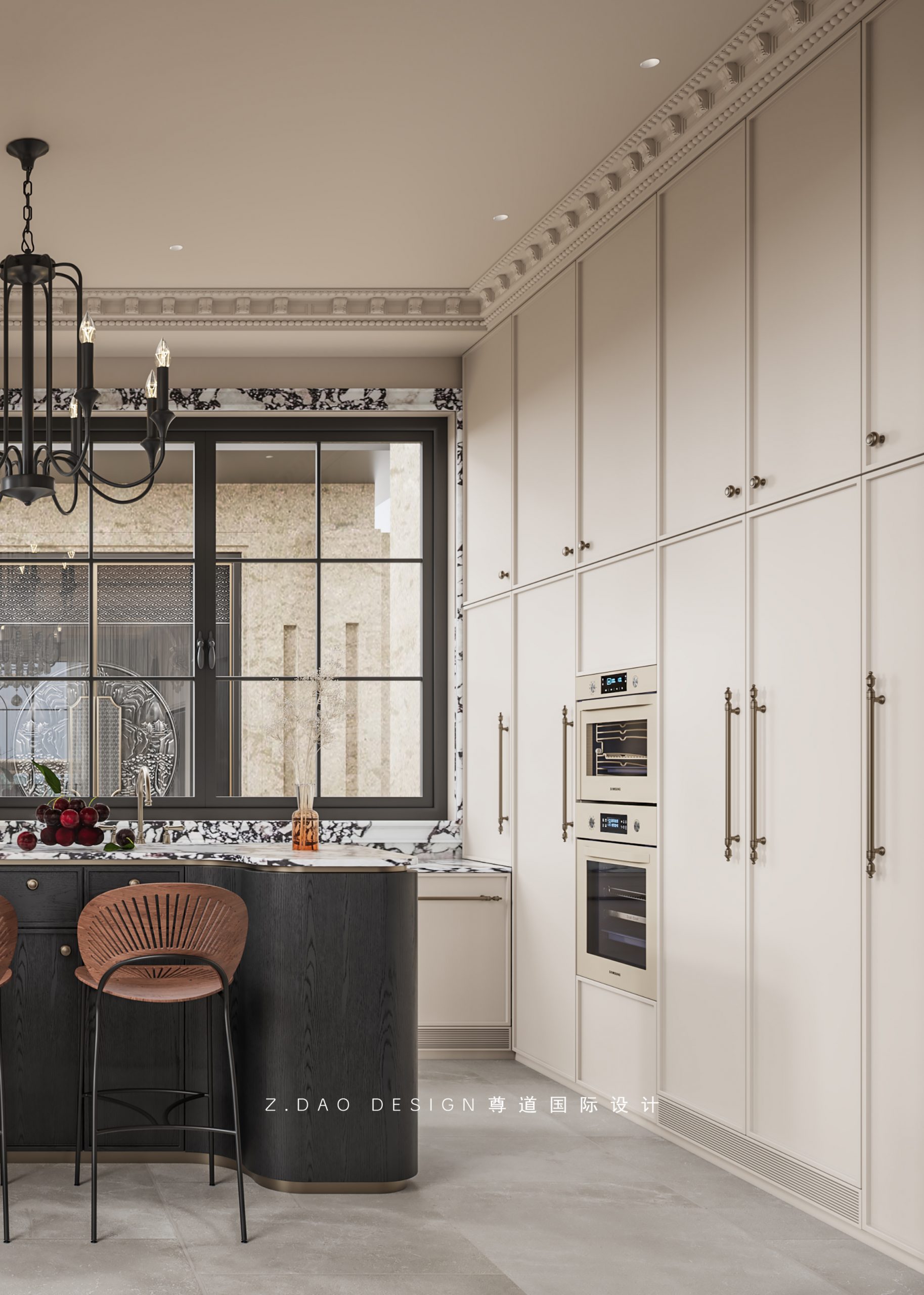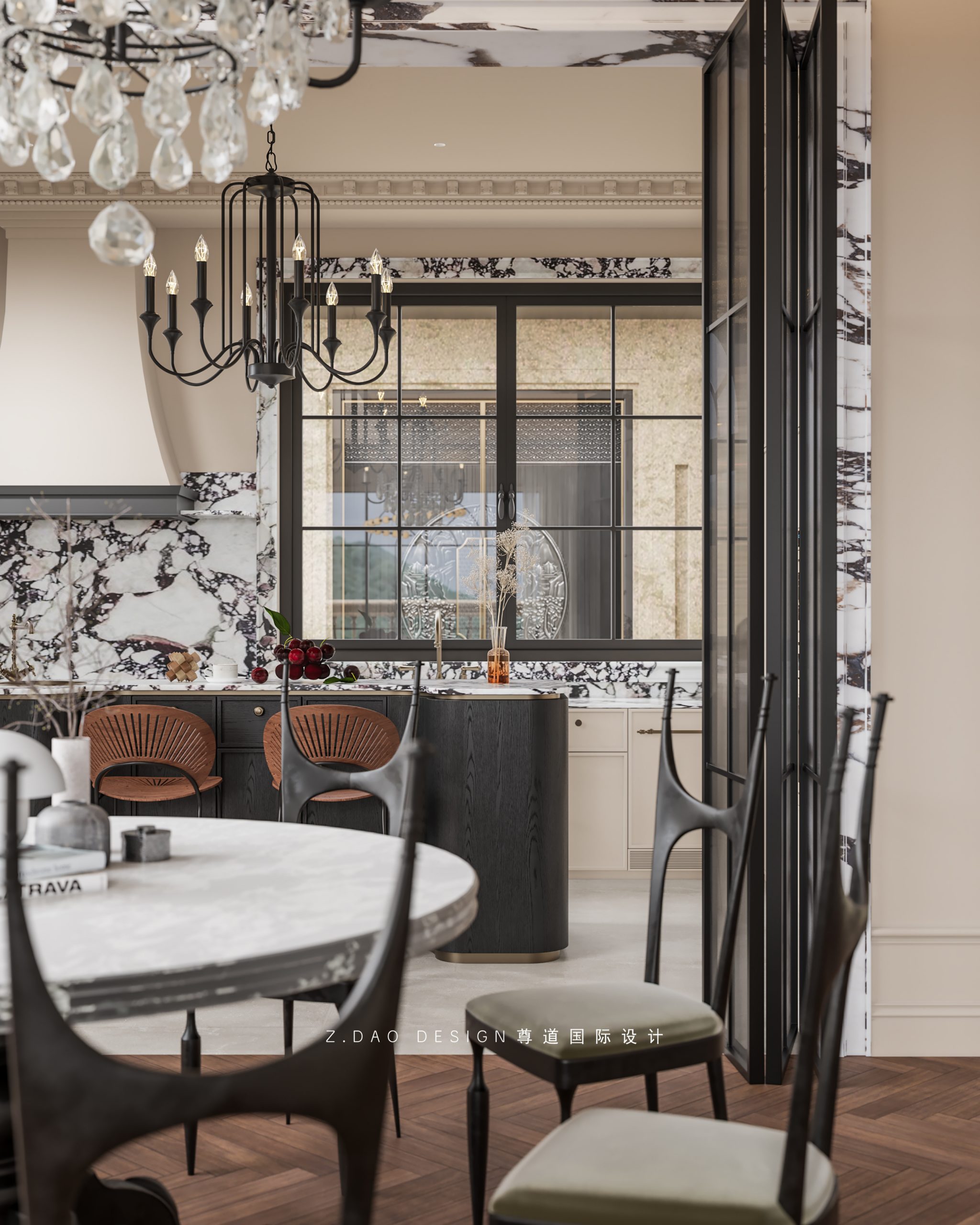 厨房空间简洁明亮,半高的宝格丽石材、格子窗、铁艺吊灯、顶面雕花凸显空间质感,营造时尚雅致的气氛。