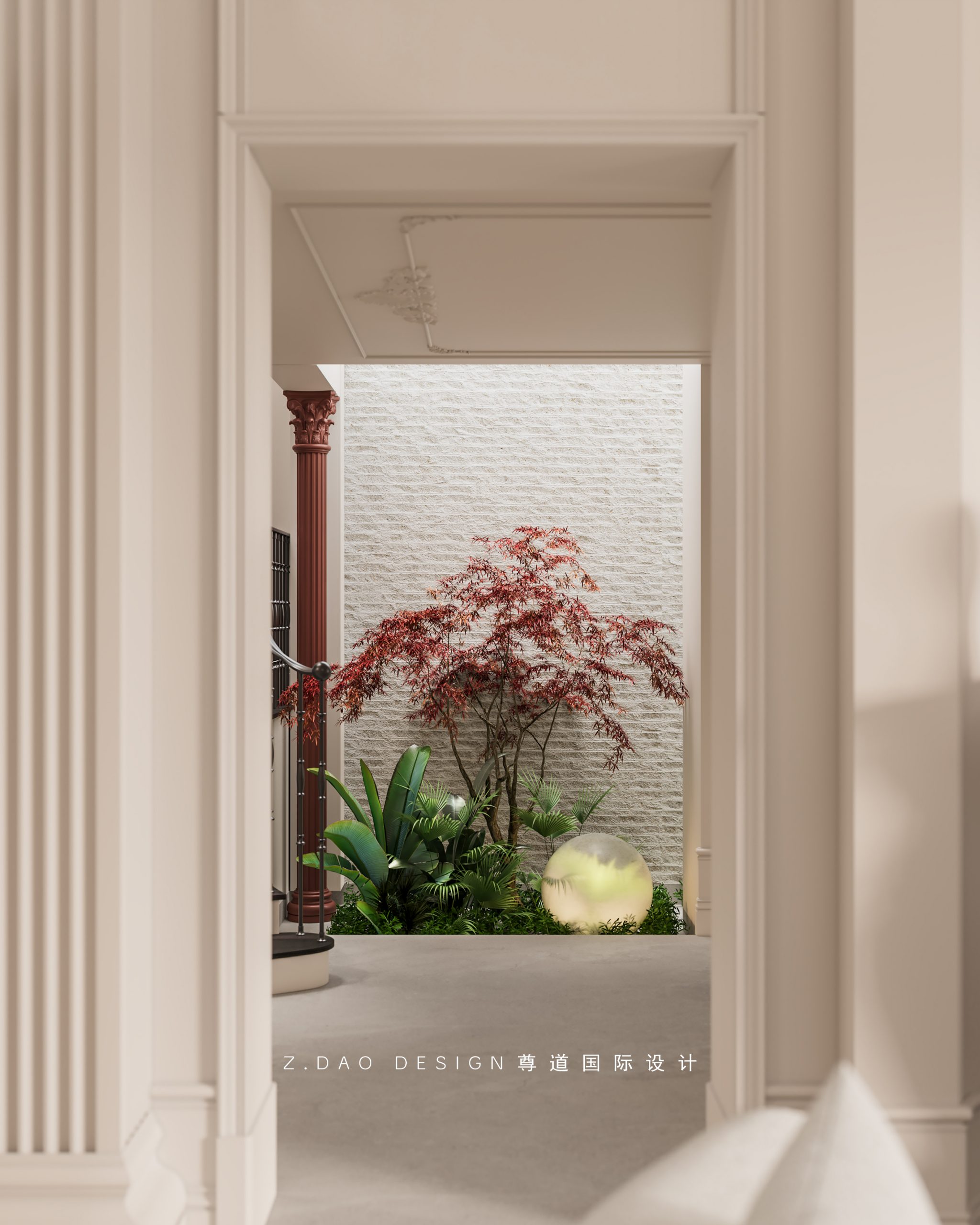 天井下的仿真造景,引入青葱绿意,将自然的活力引入室内,家人朋友在此处饮茶、聊天,在二十四小时渐变光线的晕染下给空间带来不同的情感交流。