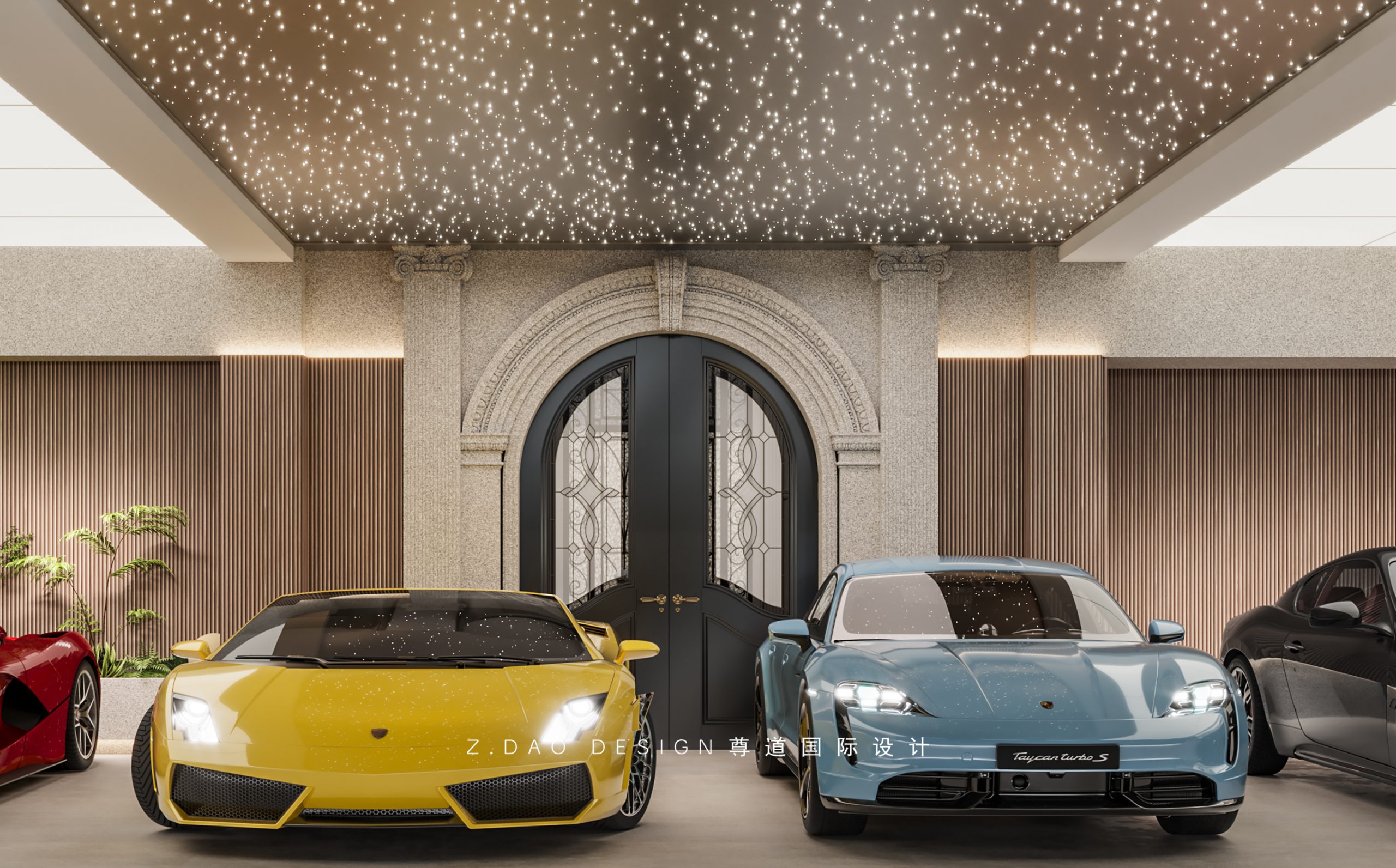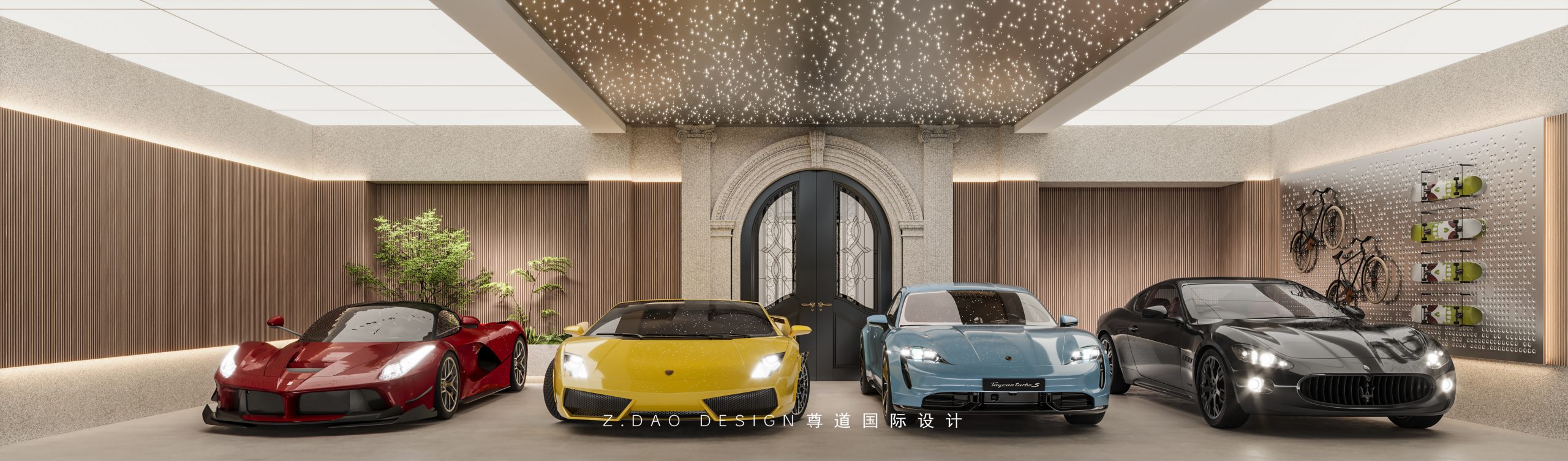 顶面发光灯膜与星空顶带来更加温馨、包容的社交氛围,右面酷雅的洞洞板展陈的是热爱与冷峻,正面掏空的龛部将“景”巧妙的嵌入在墙面中。车库拱形金属门,给归家时刻营造出一种仪式感,也让法式氛围就此渲染开来。