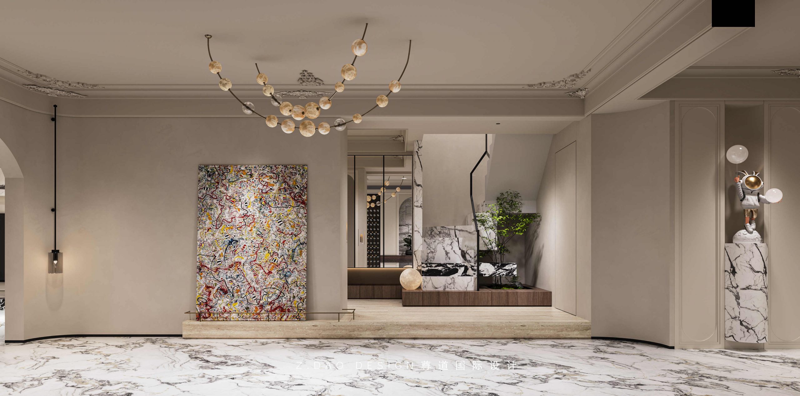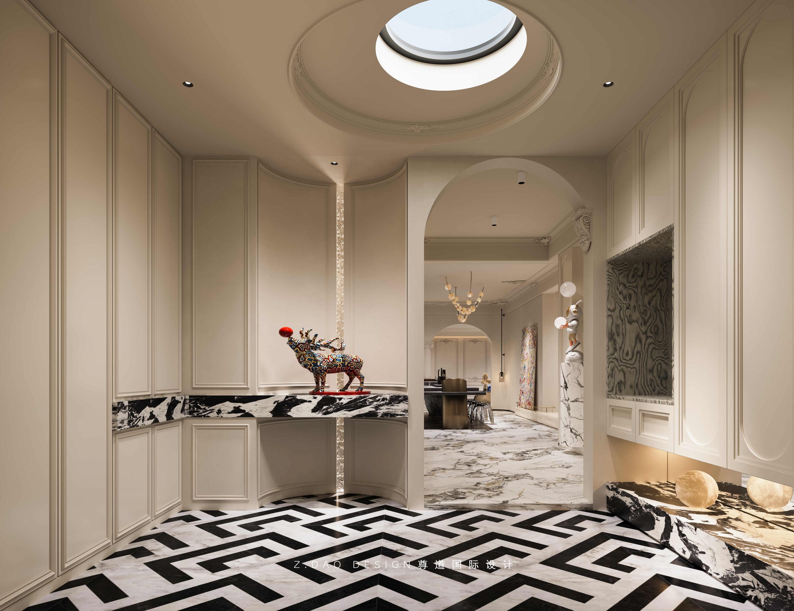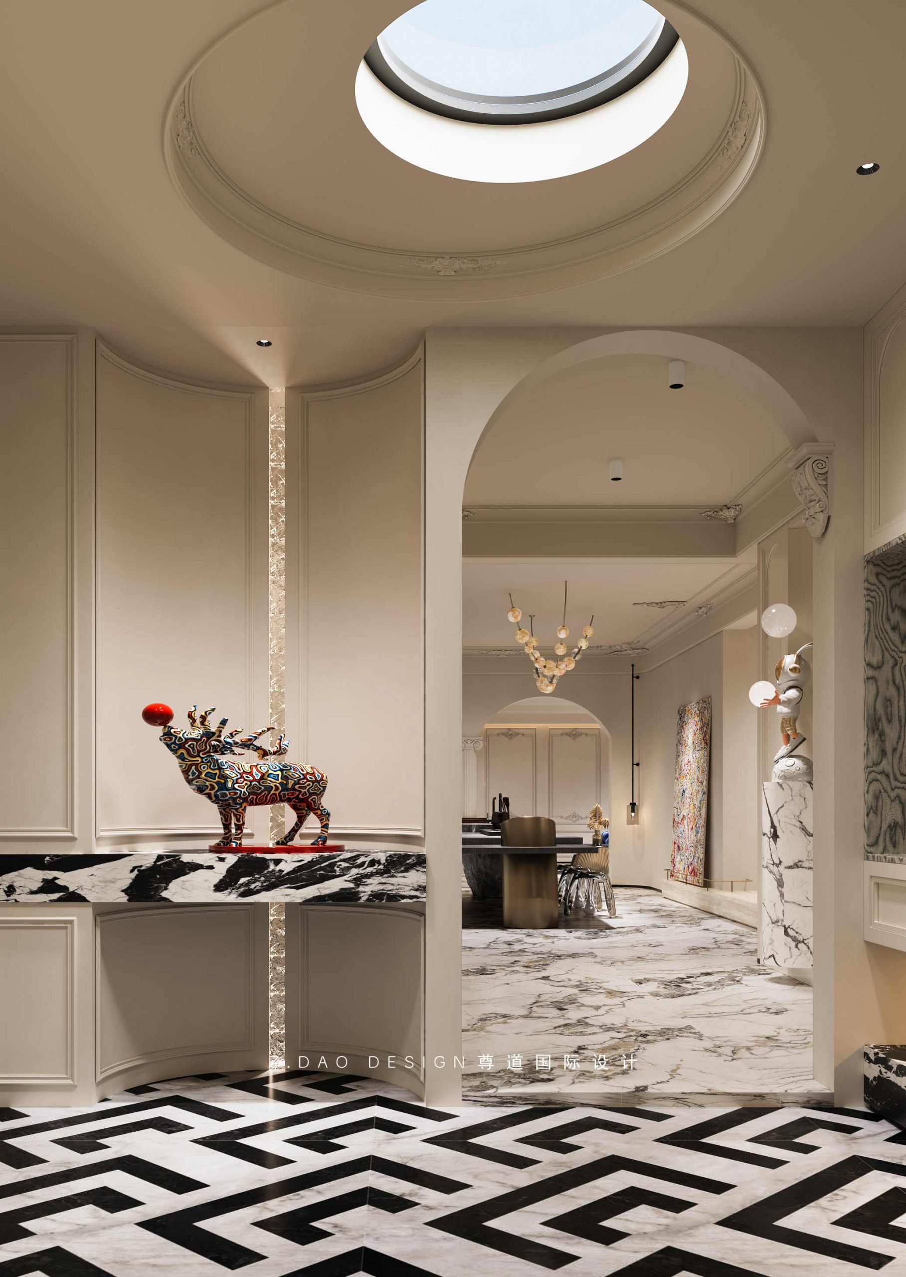 地面使用的是石材的拼花,顶面用圆的造型衬托了圆形天井,天井的自然光成了门厅的主角,玄关的环抱形,寓意了欢迎,接纳,也是聚财的一种形式,中间是玻璃砖,加上灯光的点缀,梦幻至极。