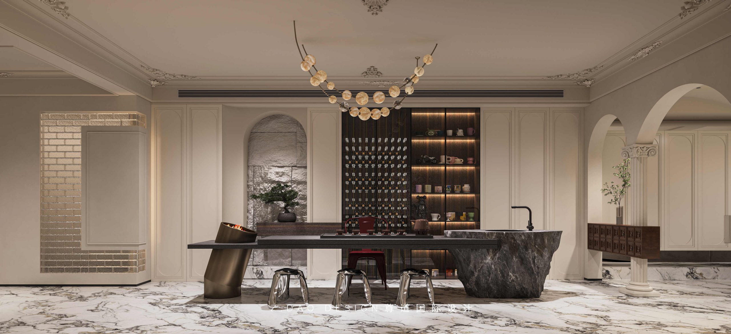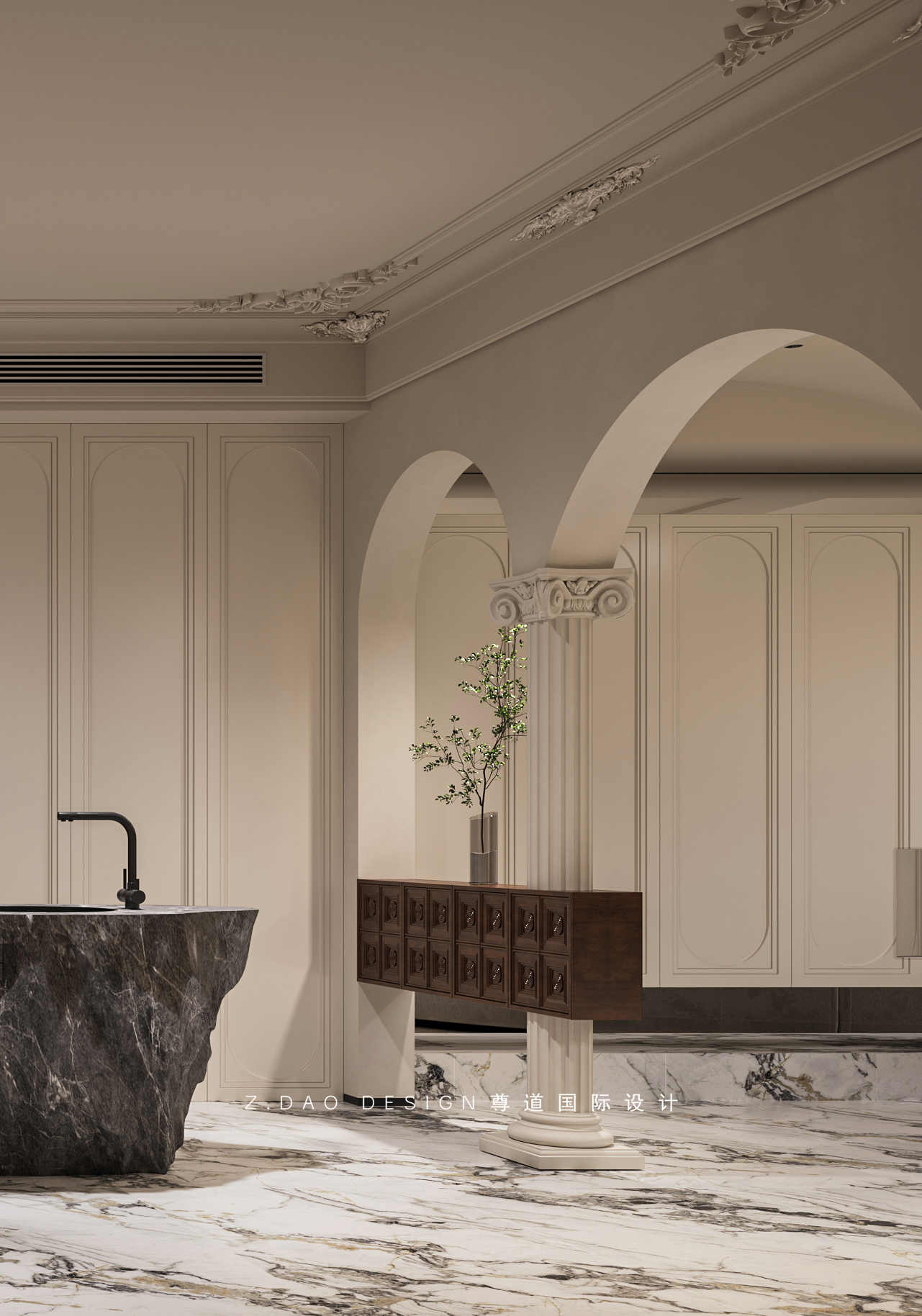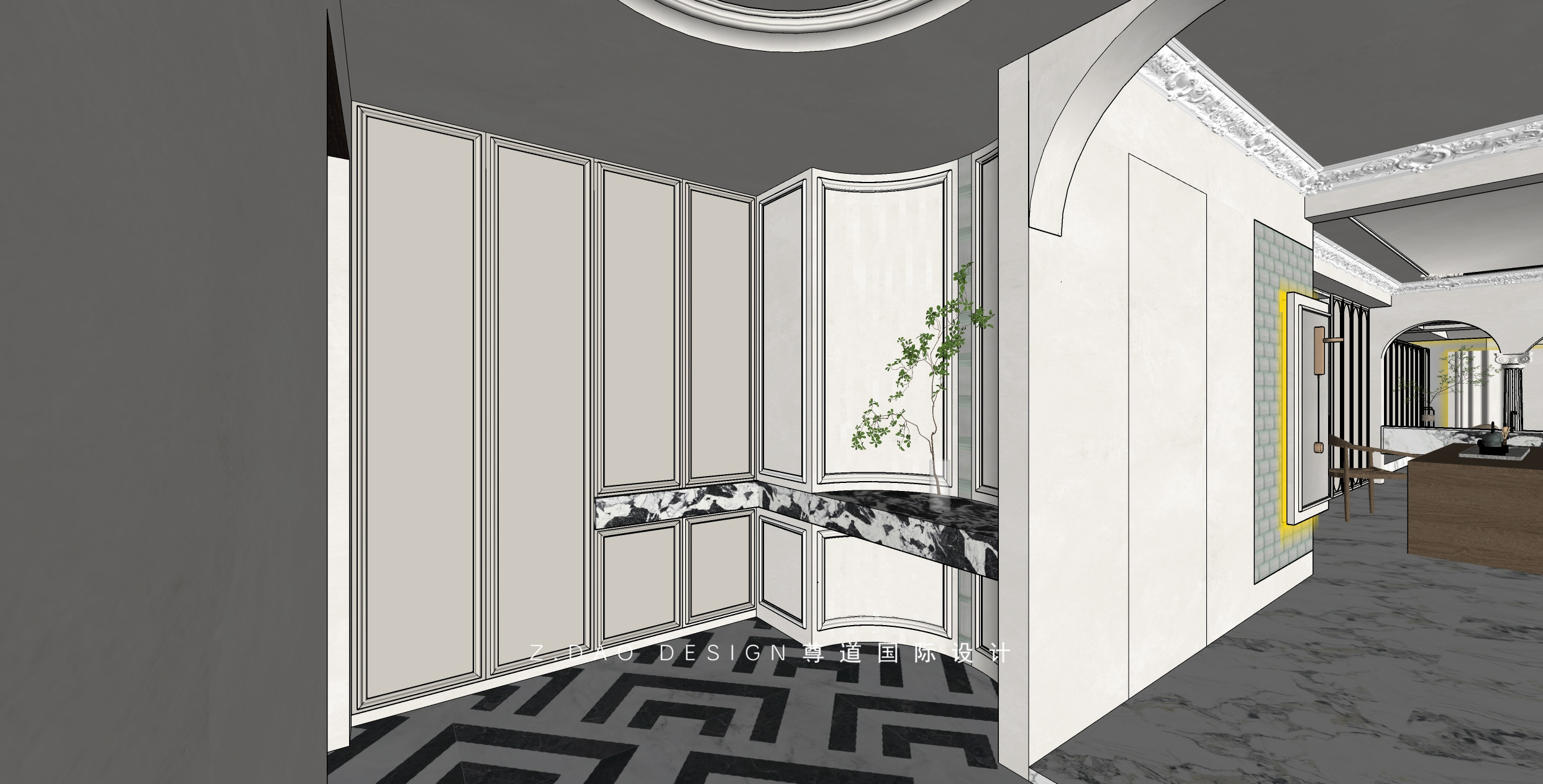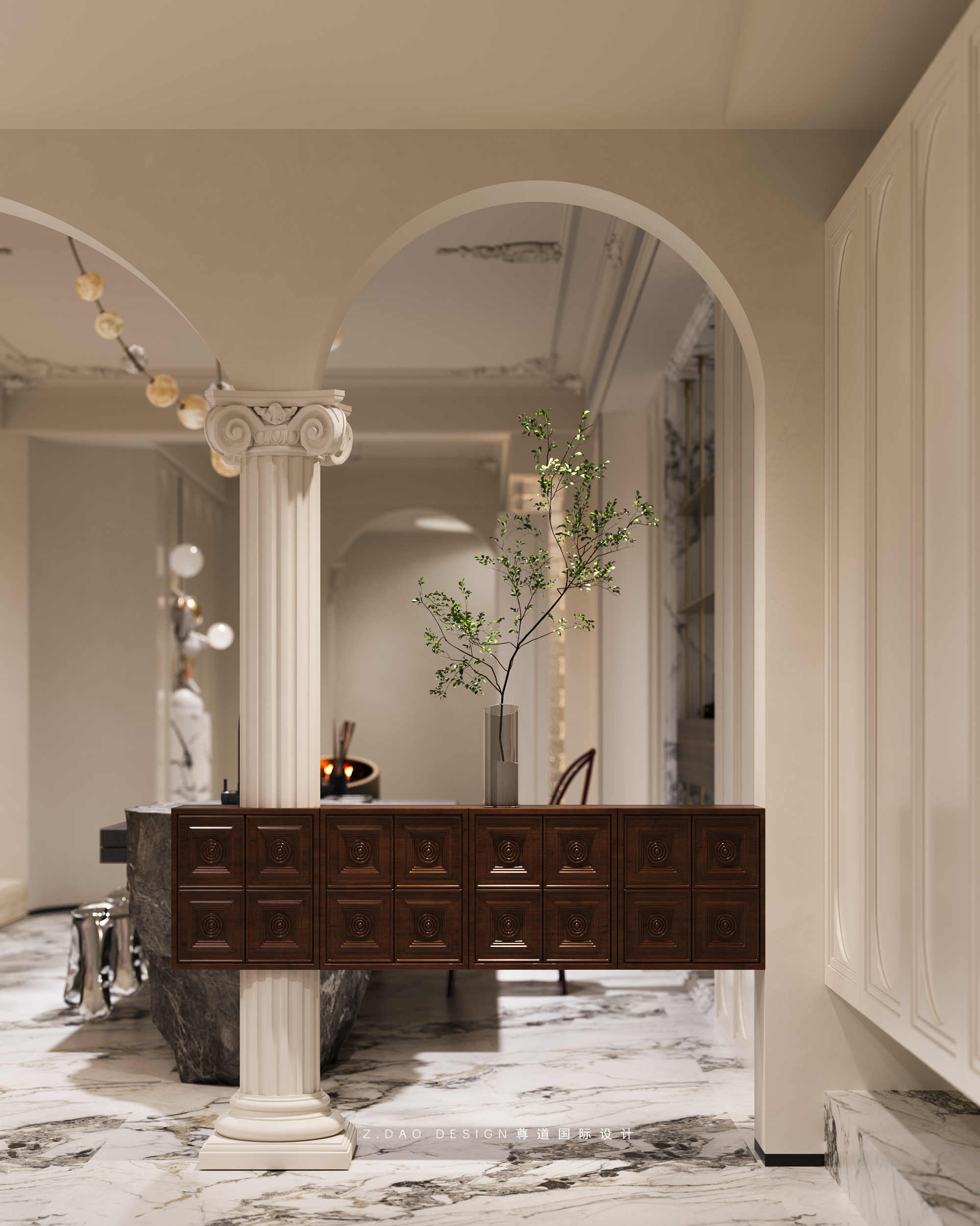 和品茗区相连的部分,做了艺术玄关,弧形的造型加上罗马柱的形式,悬空的柜子在这里展示他的力量感。