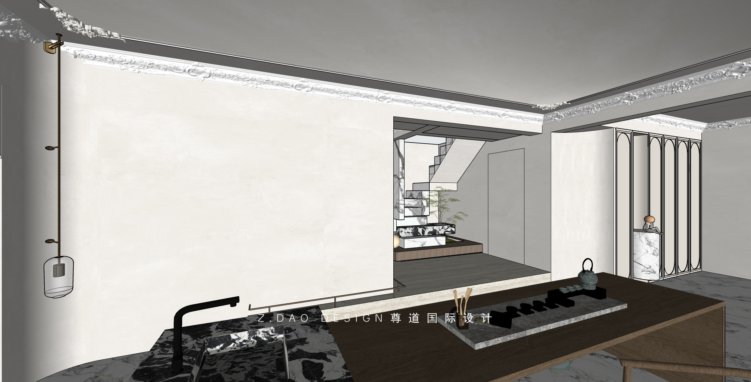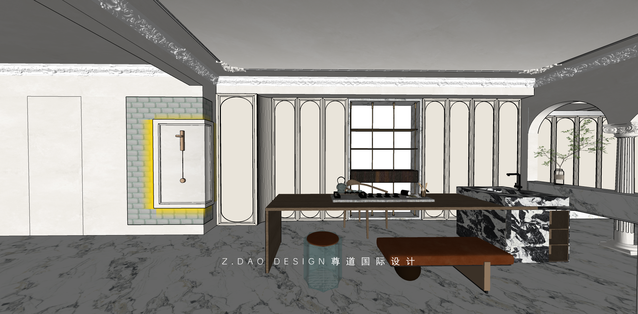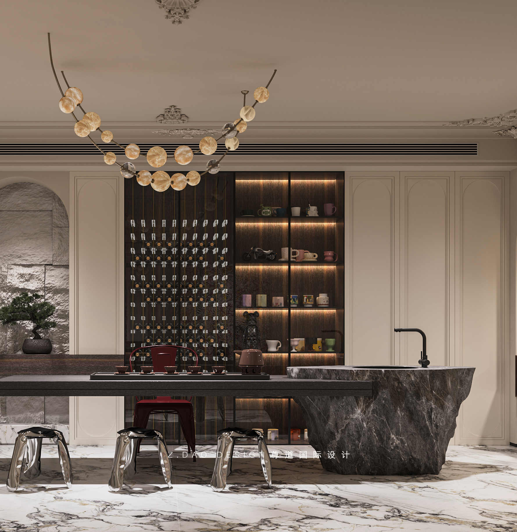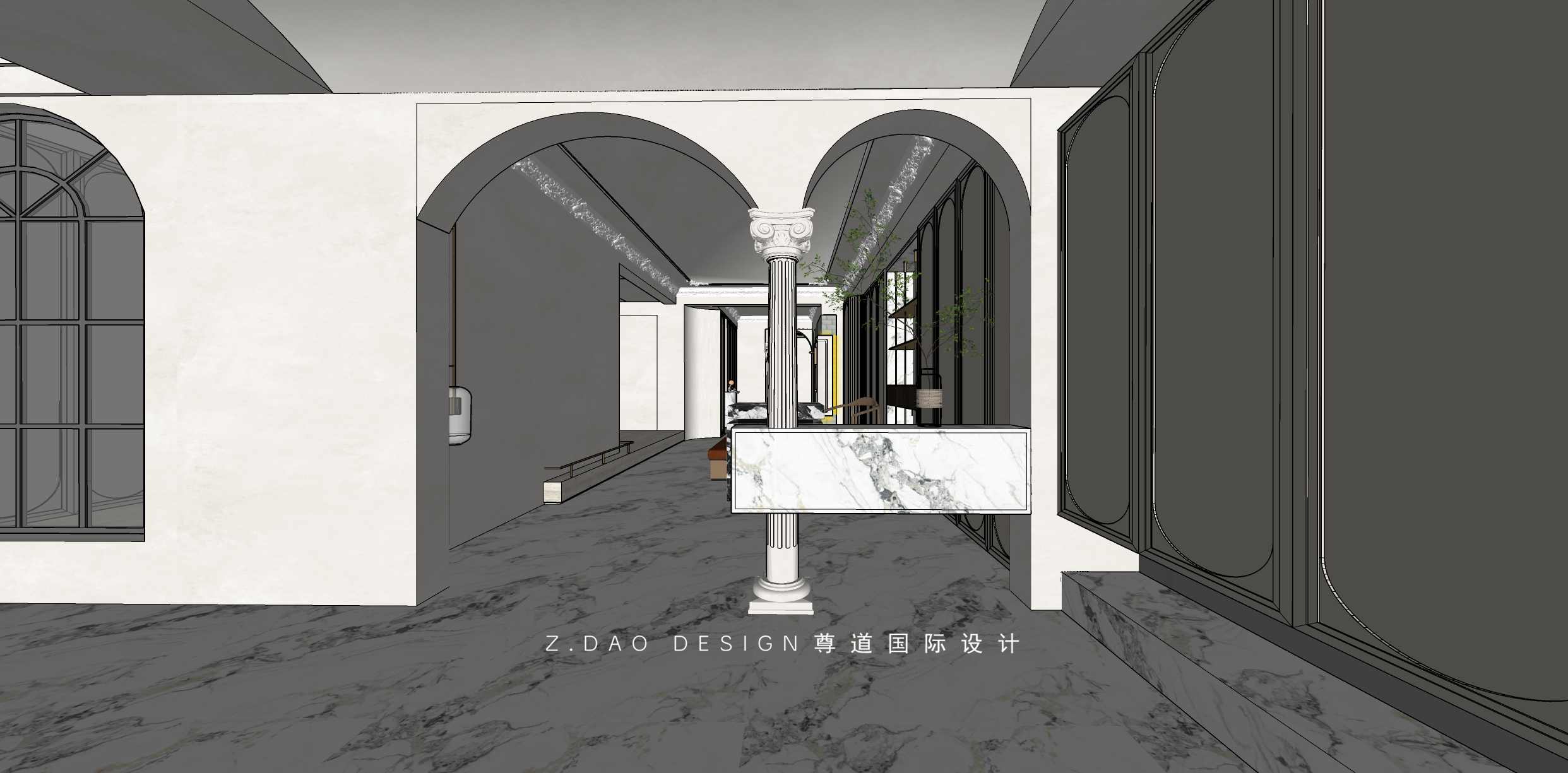 和品茗区相连的部分,做了艺术玄关,弧形的造型加上罗马柱的形式,悬空的柜子在这里展示他的力量感。