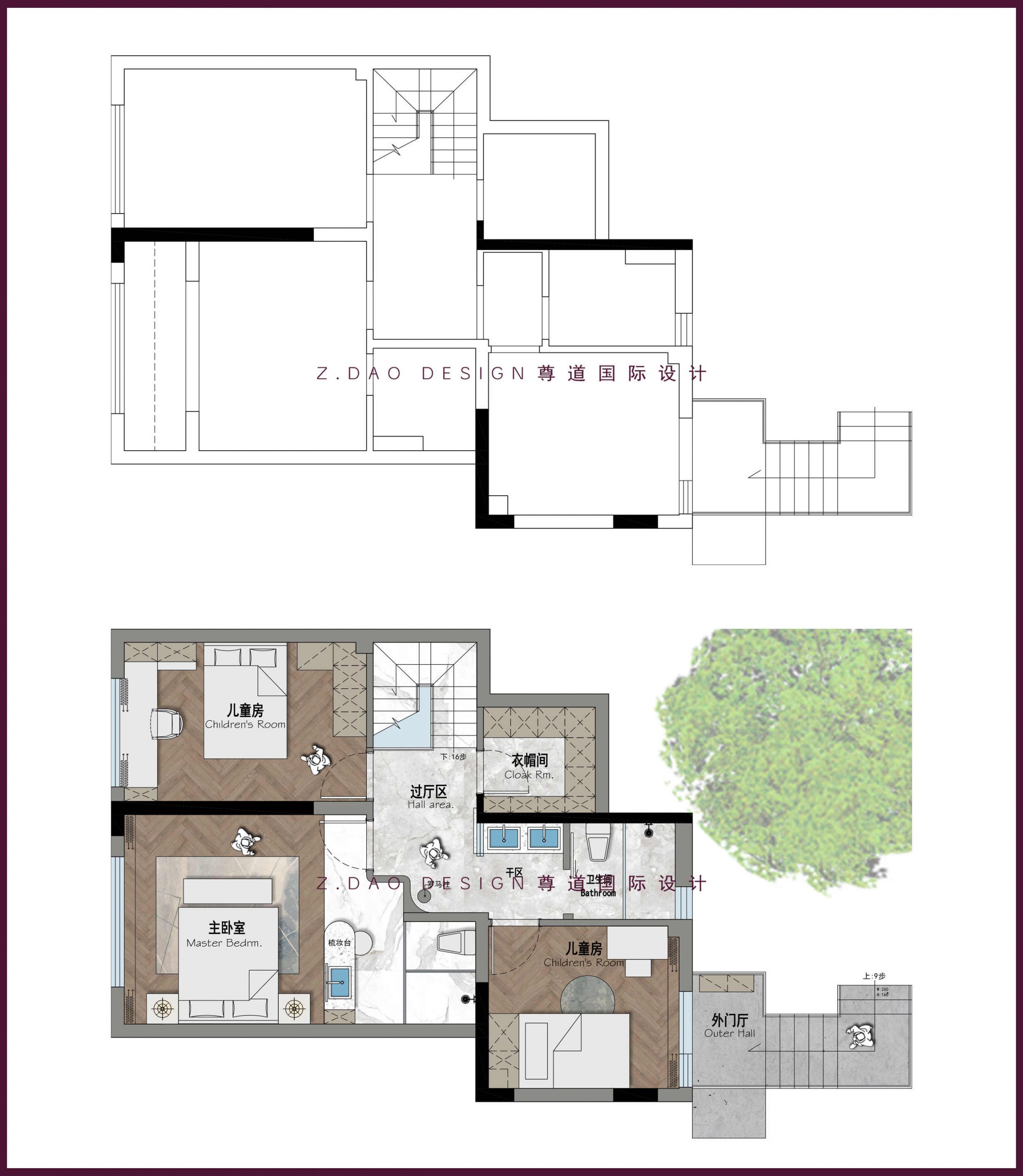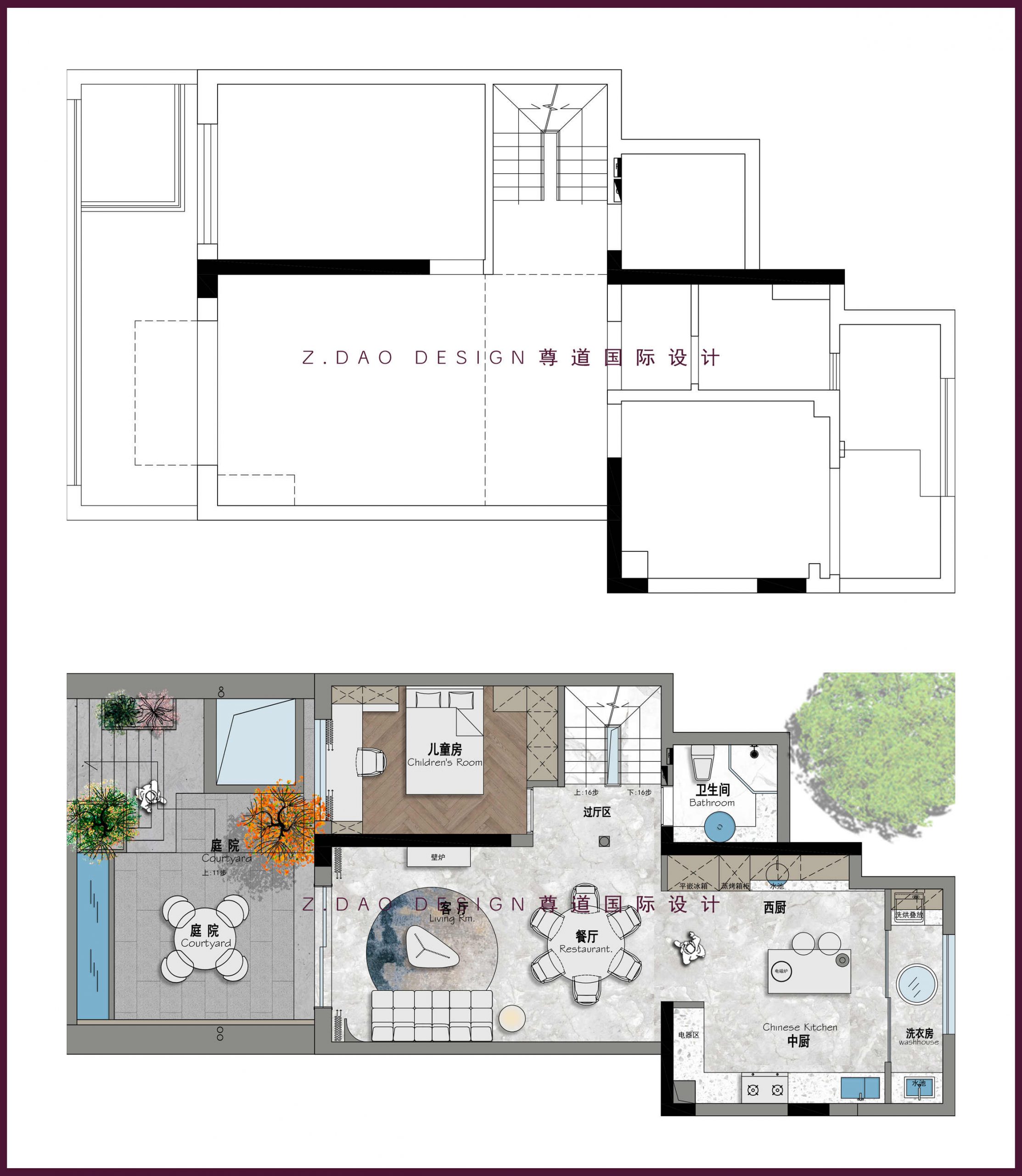 1、划分门厅,打通负一顶面和一层北阳台的地面,做一个圆形采光井,引光入室;