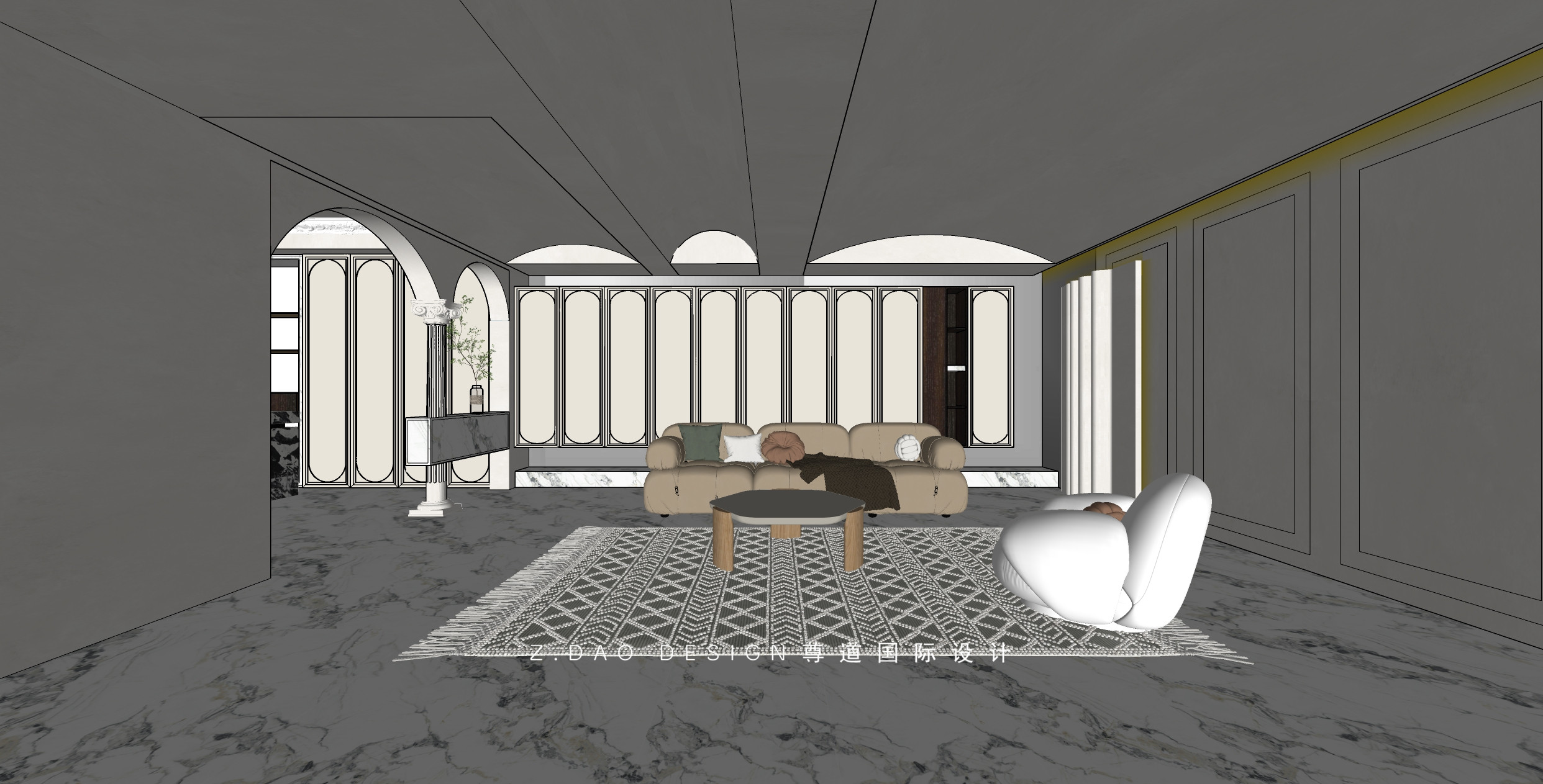 入户区,做了拱形门洞及玄关柜,不仅增加了仪式感,也加强了门厅和过厅的联动性。