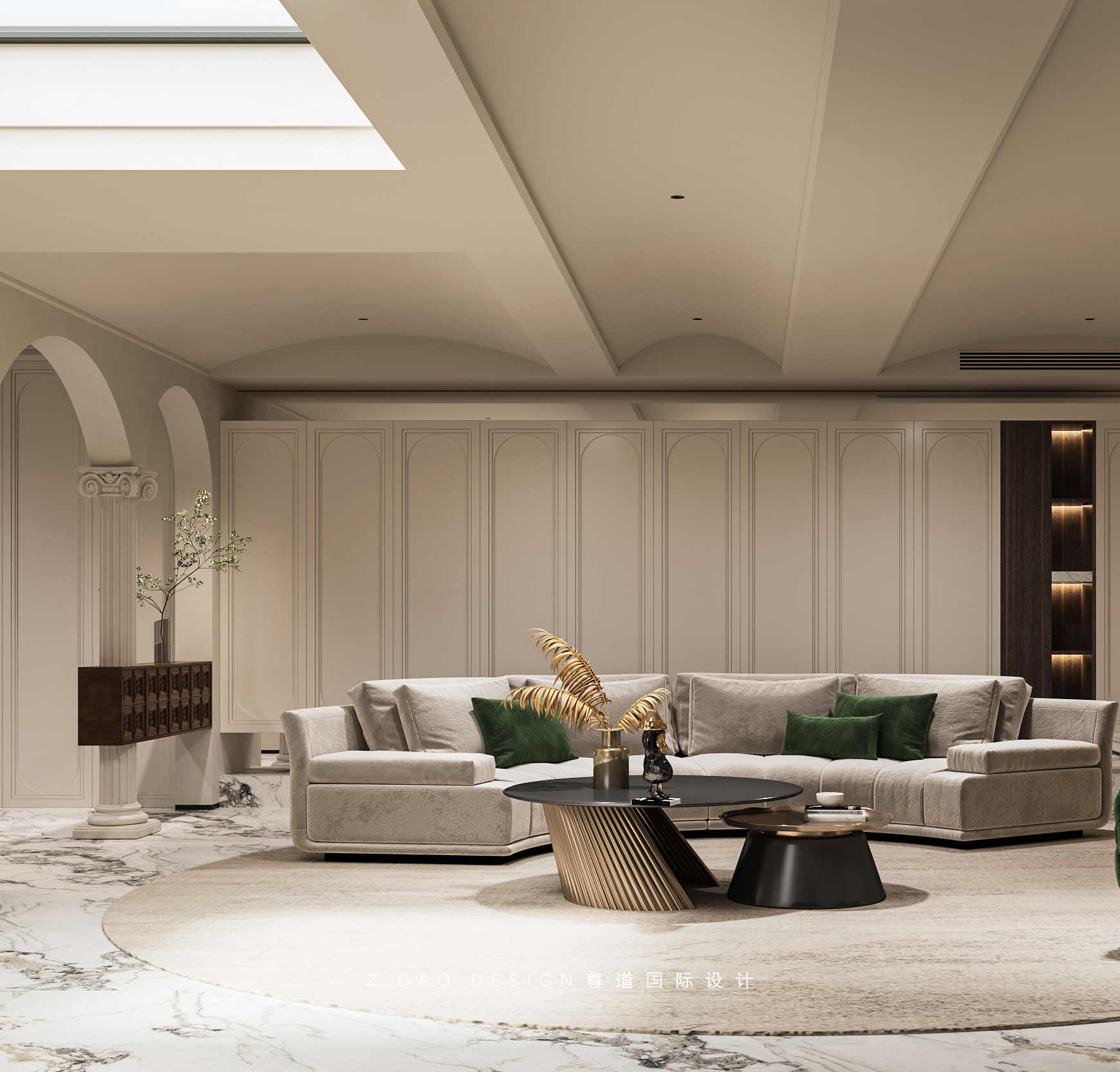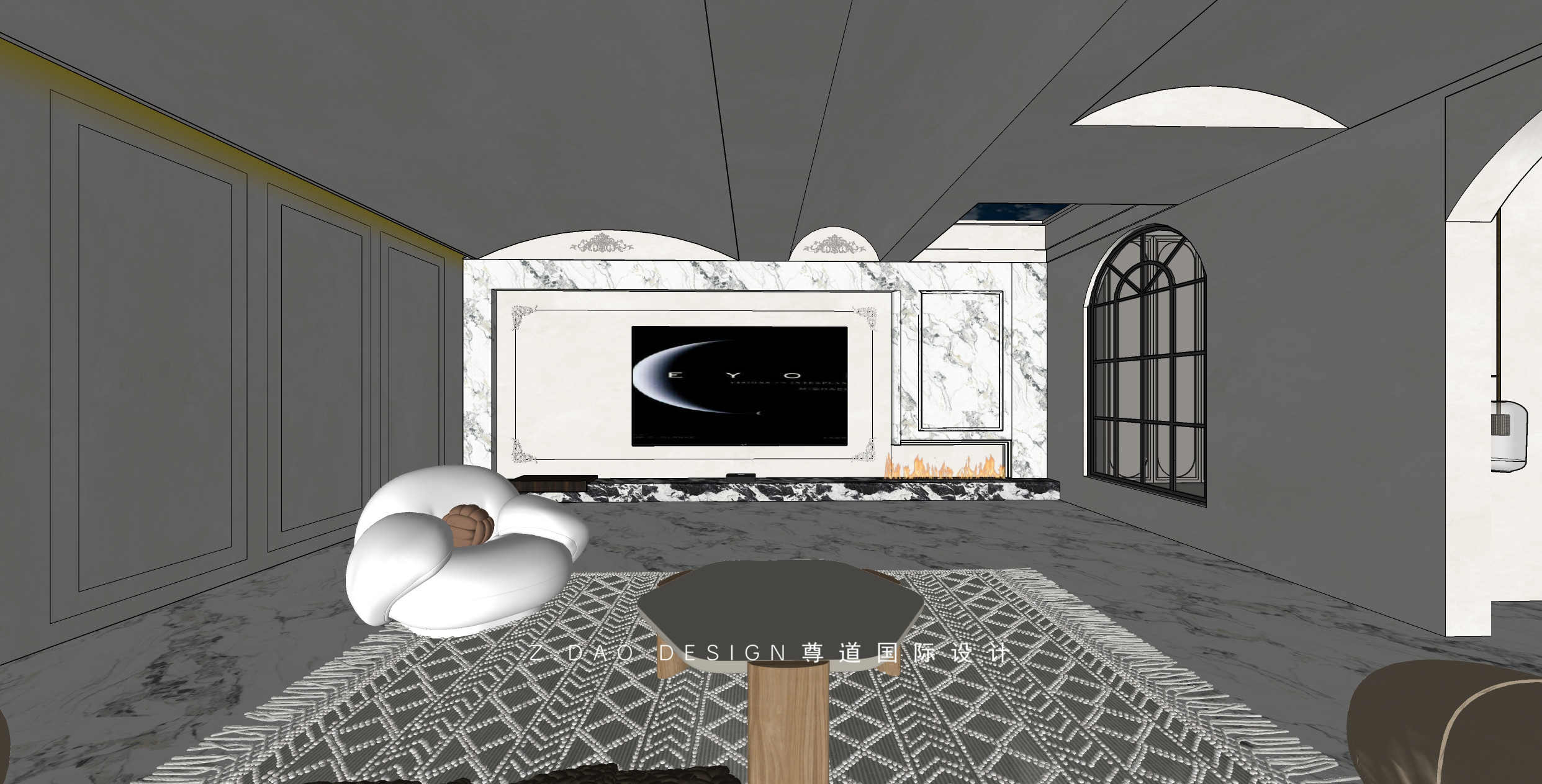 空间顶面的梁体较多而且较宽,设计了弧形的吊顶,不影响层高,体现空间美感,观影墙利用现场造型的叠及,设计了墙面的层次。