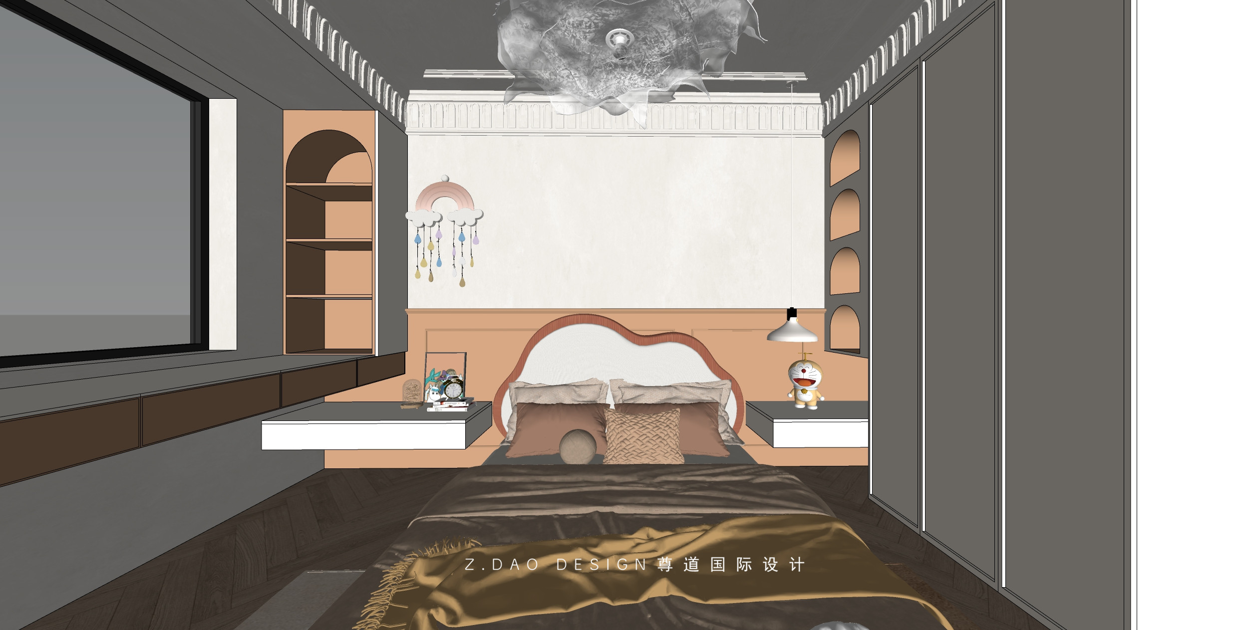 一楼女孩房集聚功能与形式的经典表现,在这个空间中,收纳是第一考虑点,还有孩子看书学习的空间;